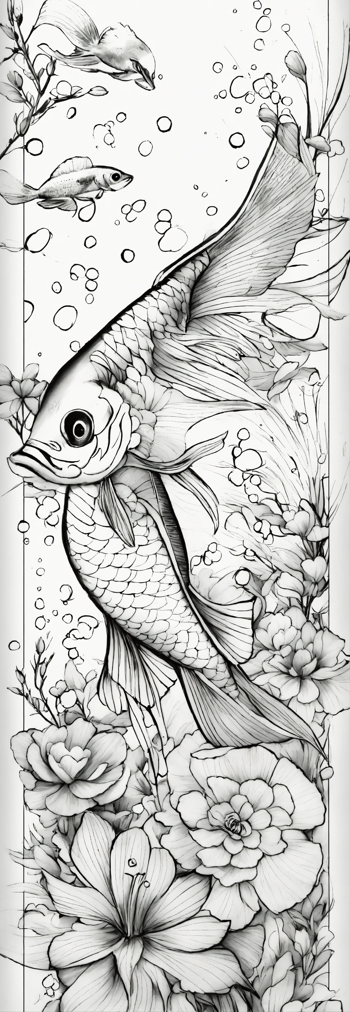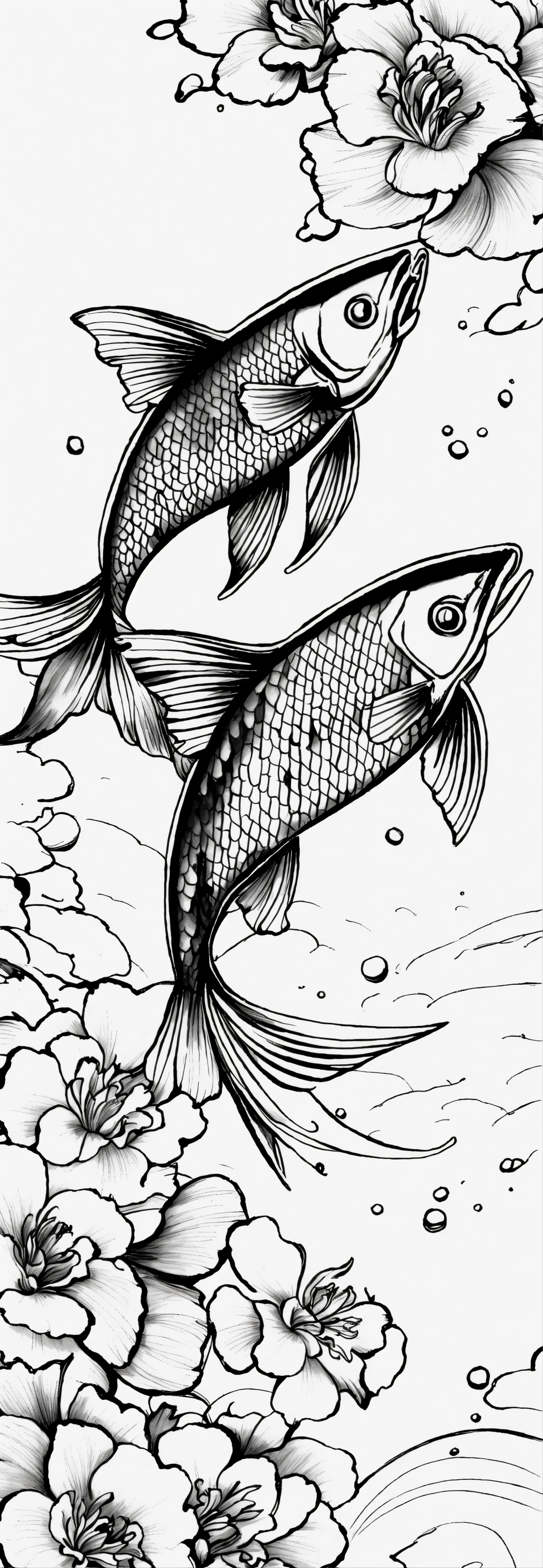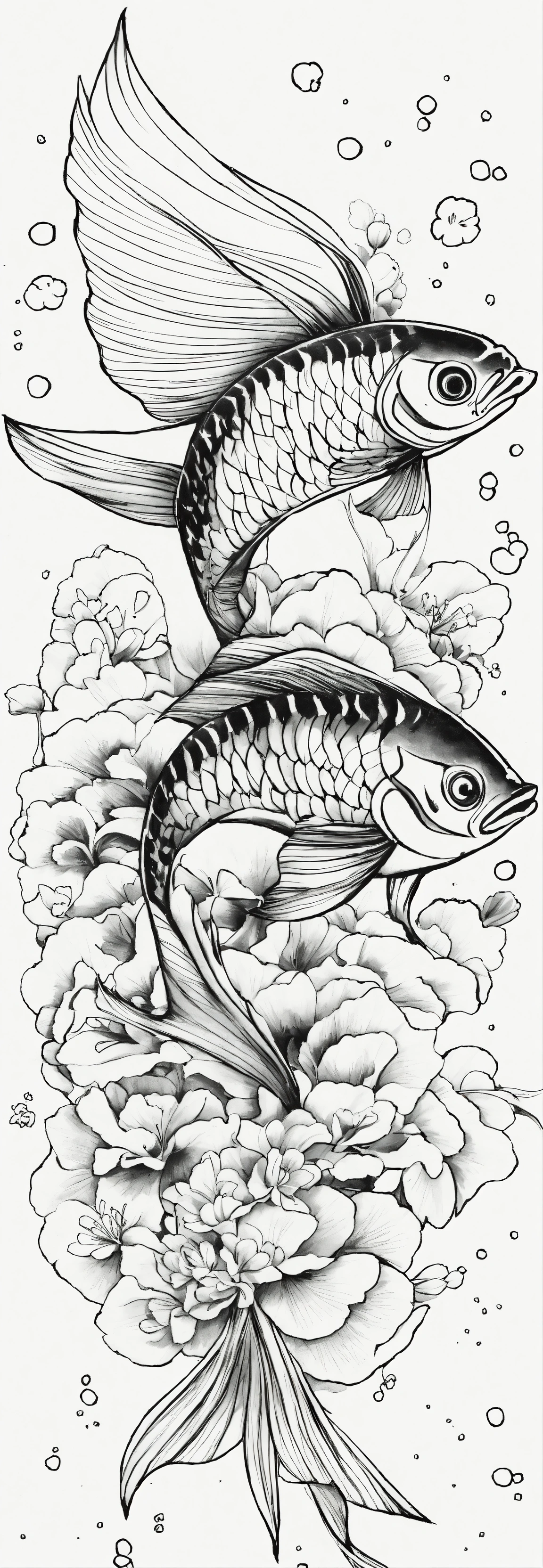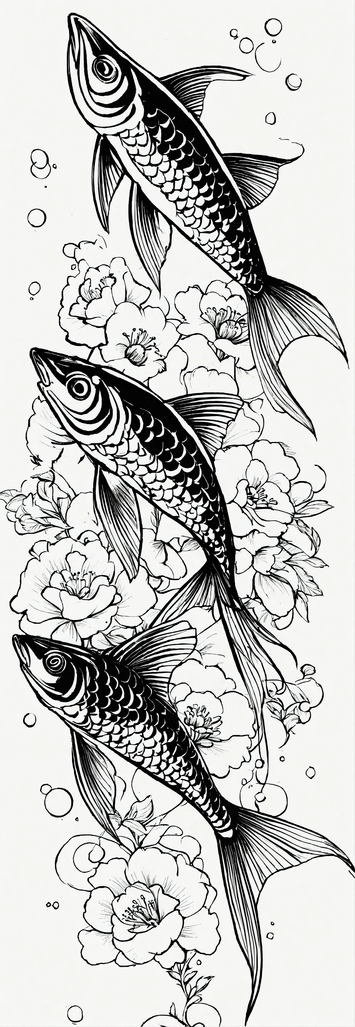 Croquis dessins simple petit japonais flying fishes avec beaucoup de fleurs exotic, white background, tattoo style, noir et blanc
