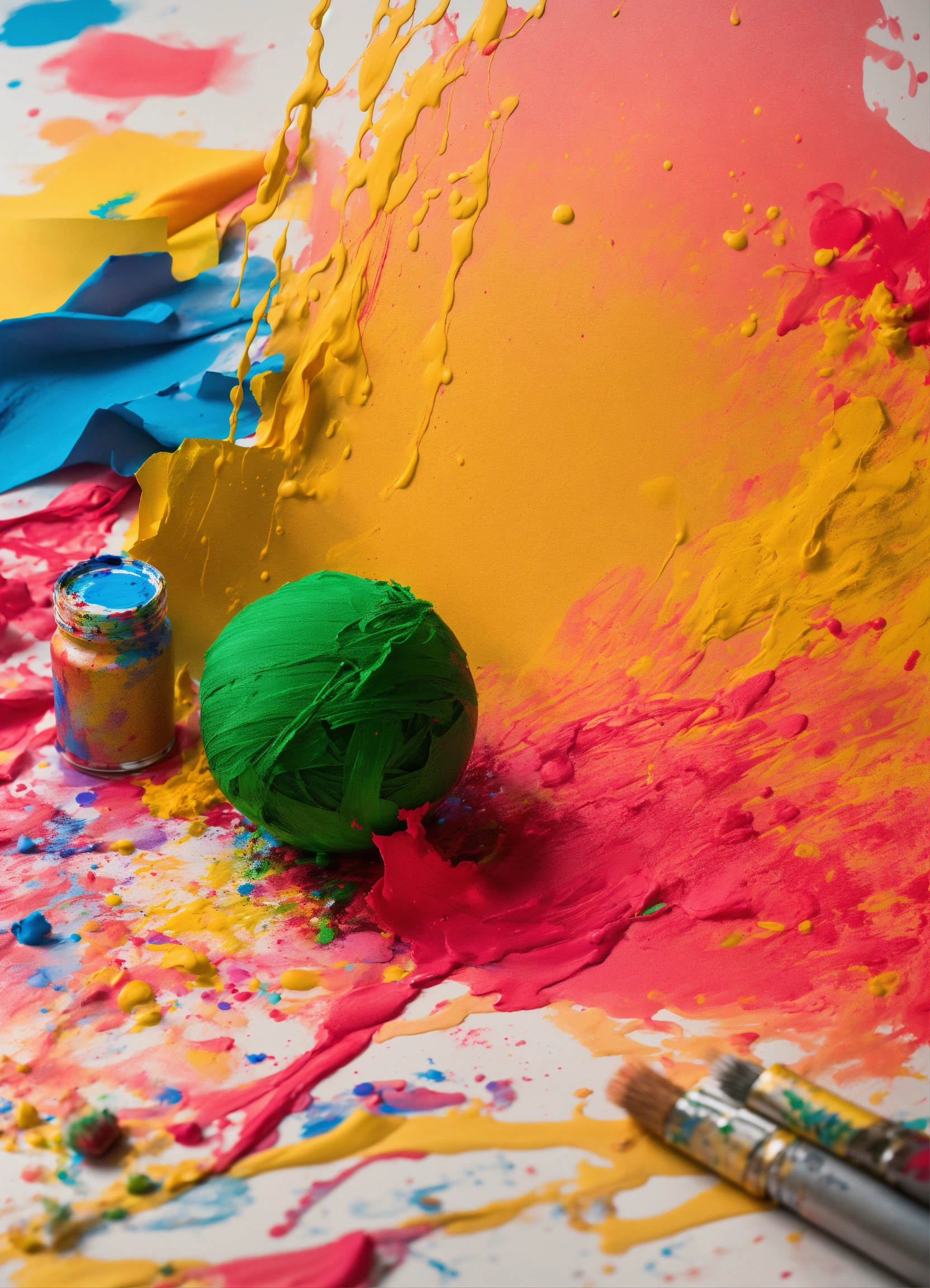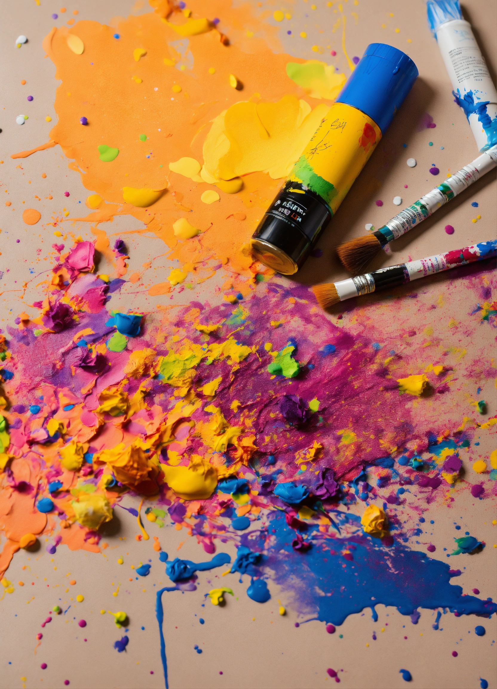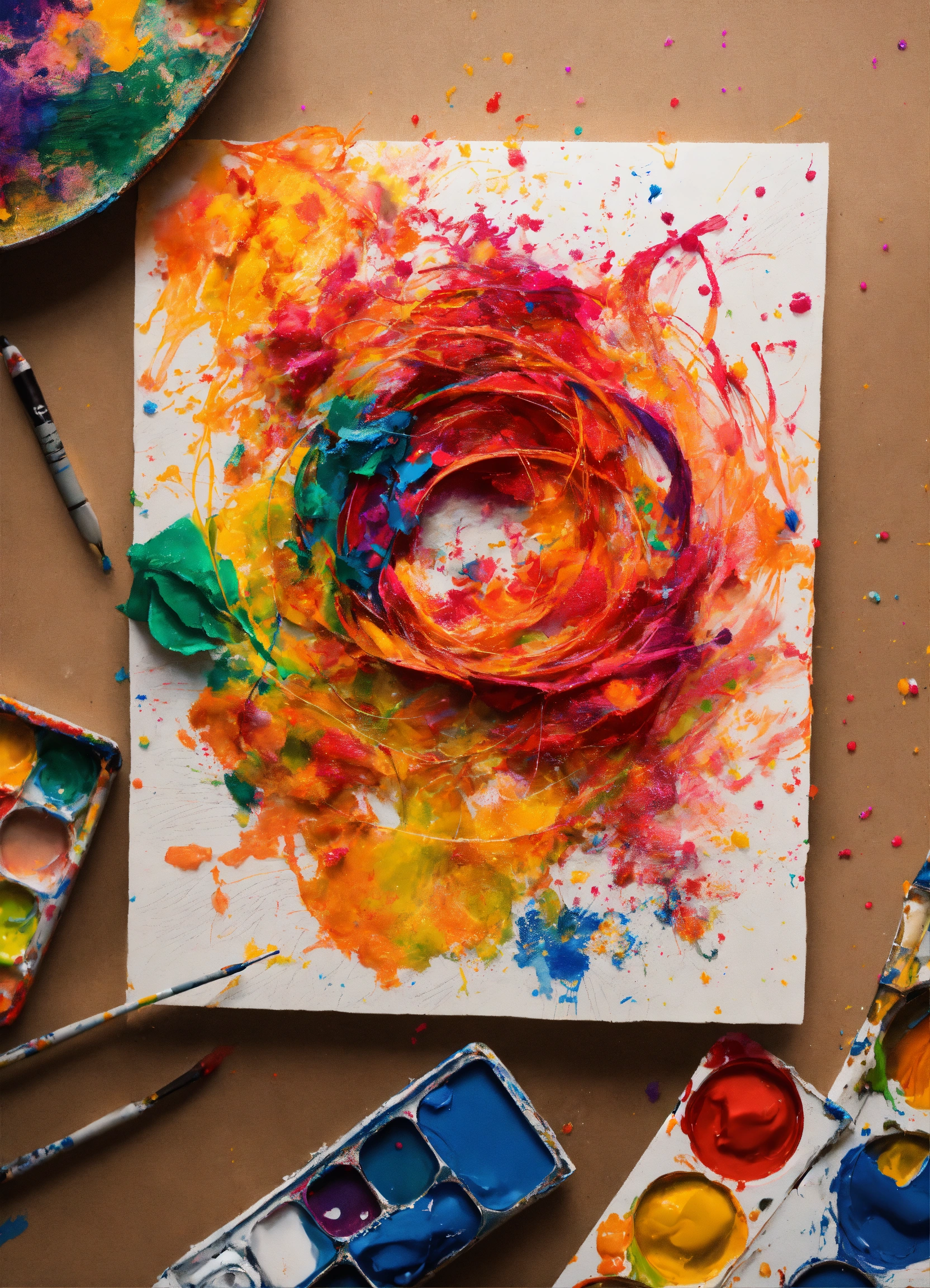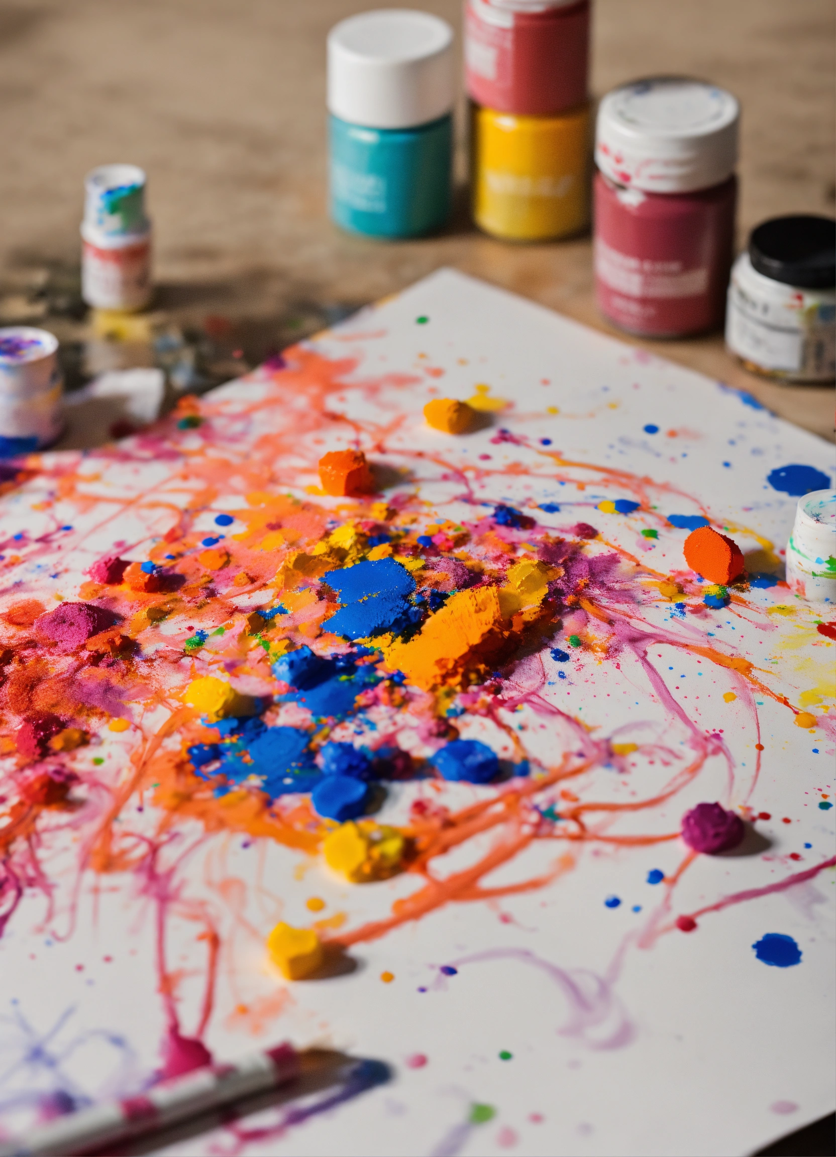 scribble art next to the paper and paints splashing on the paper
