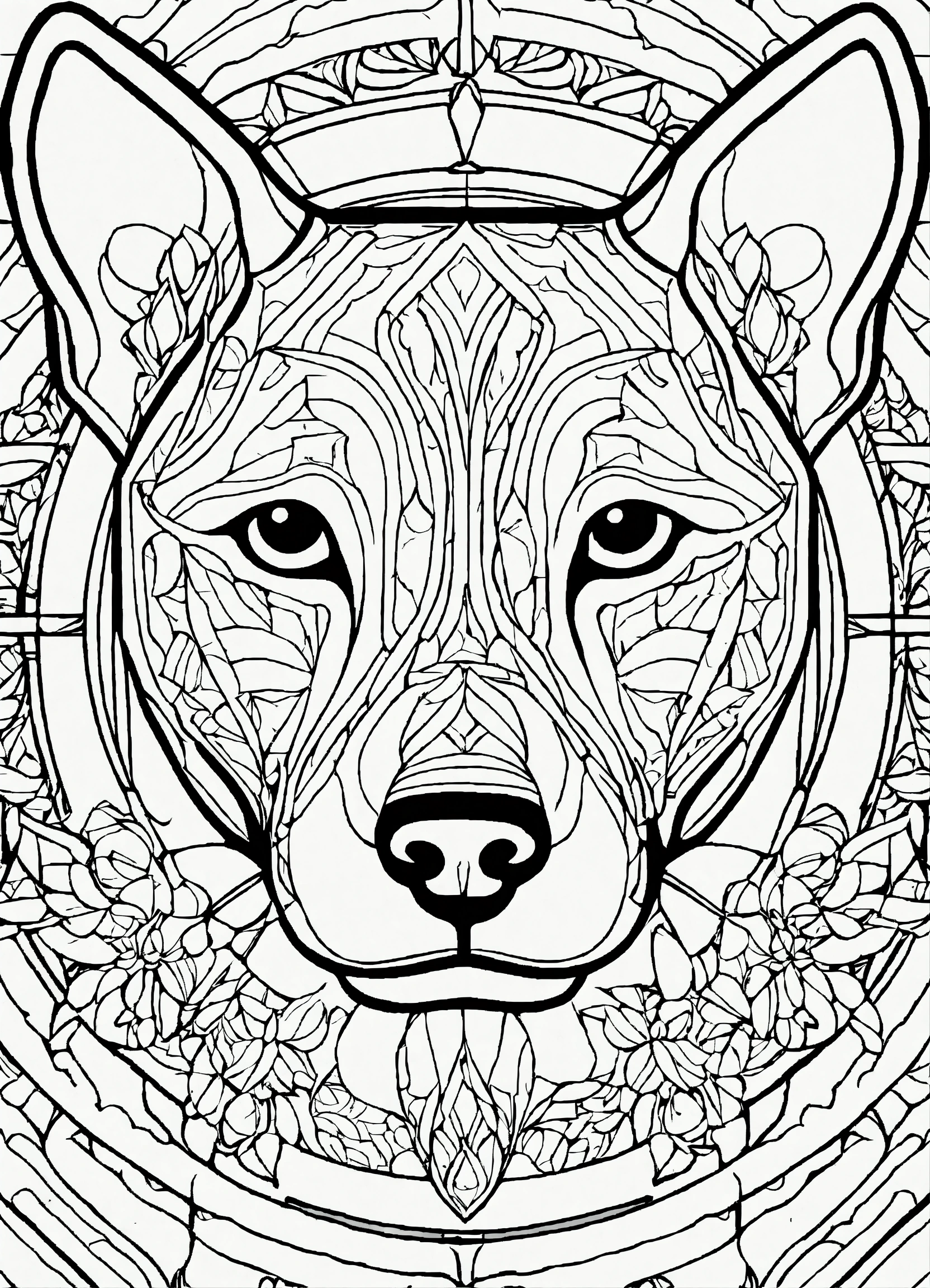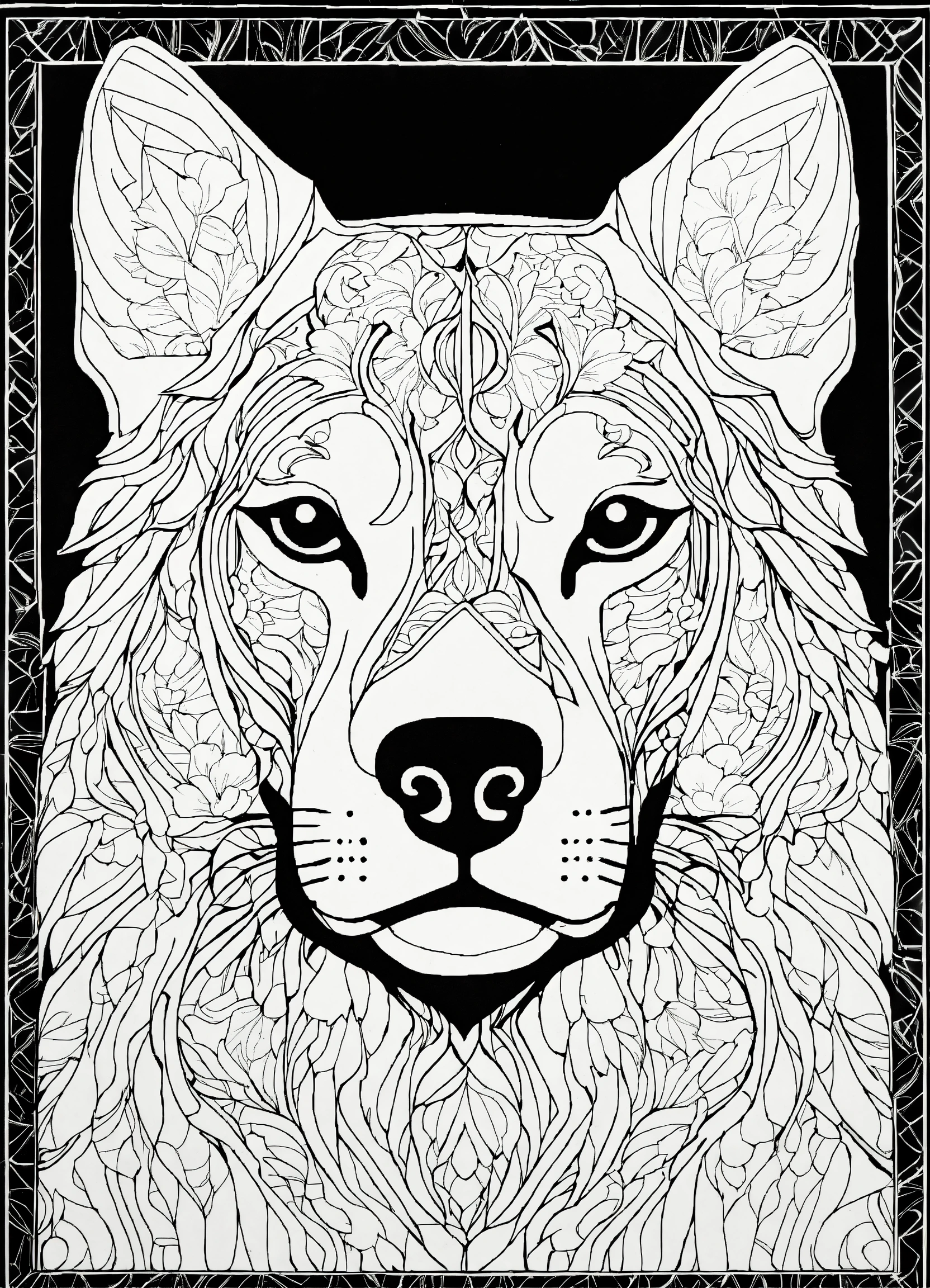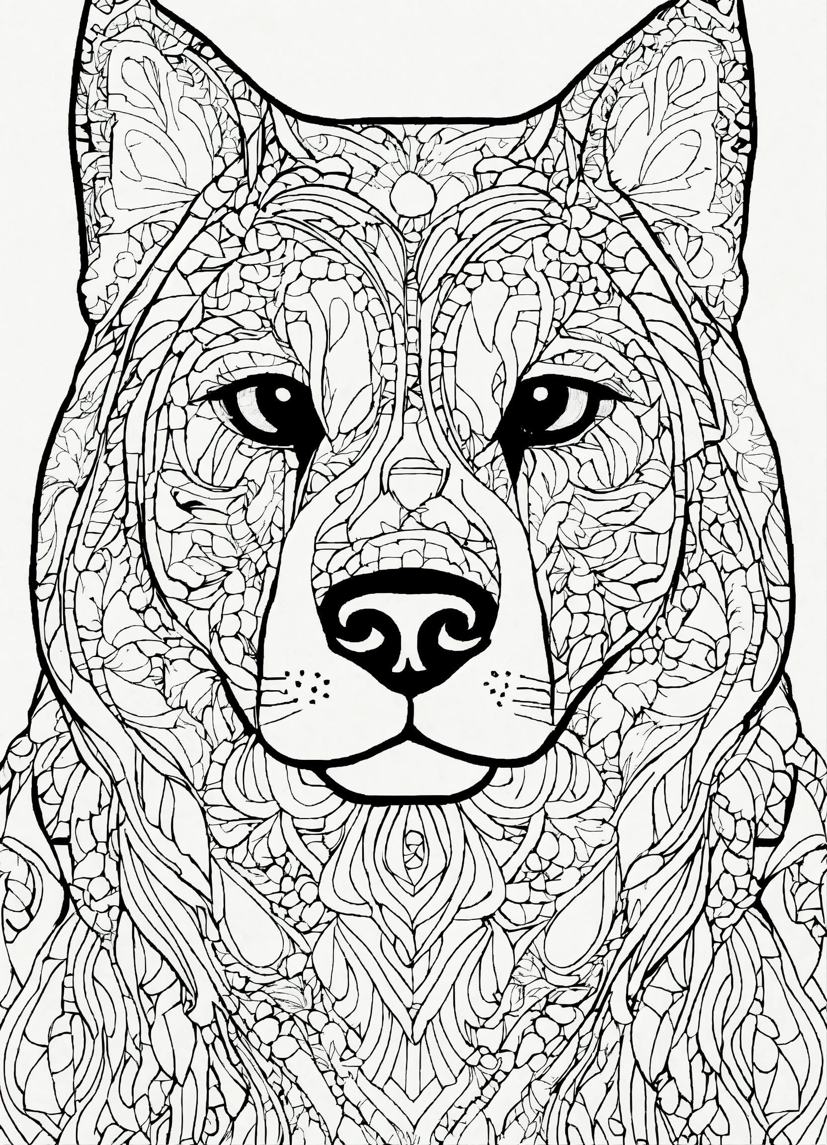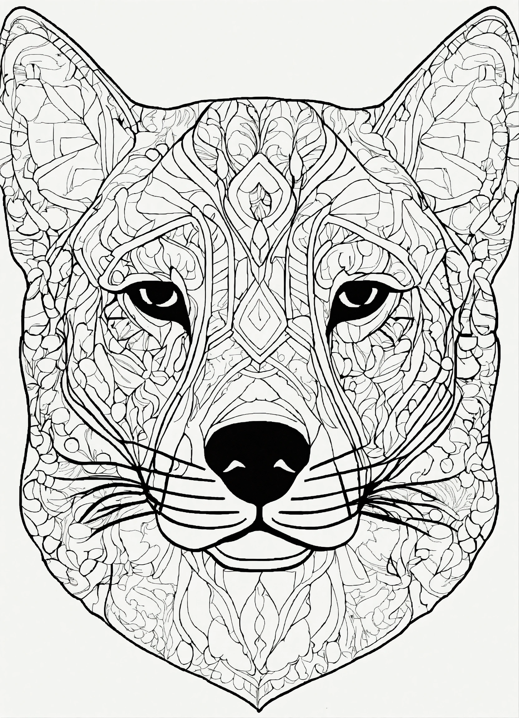 Coloring page for adults, bold lines, dark lines, mandala labrador retriever, mandala cat face, mandala face, symmetrical, white background, clean line art, fine line art