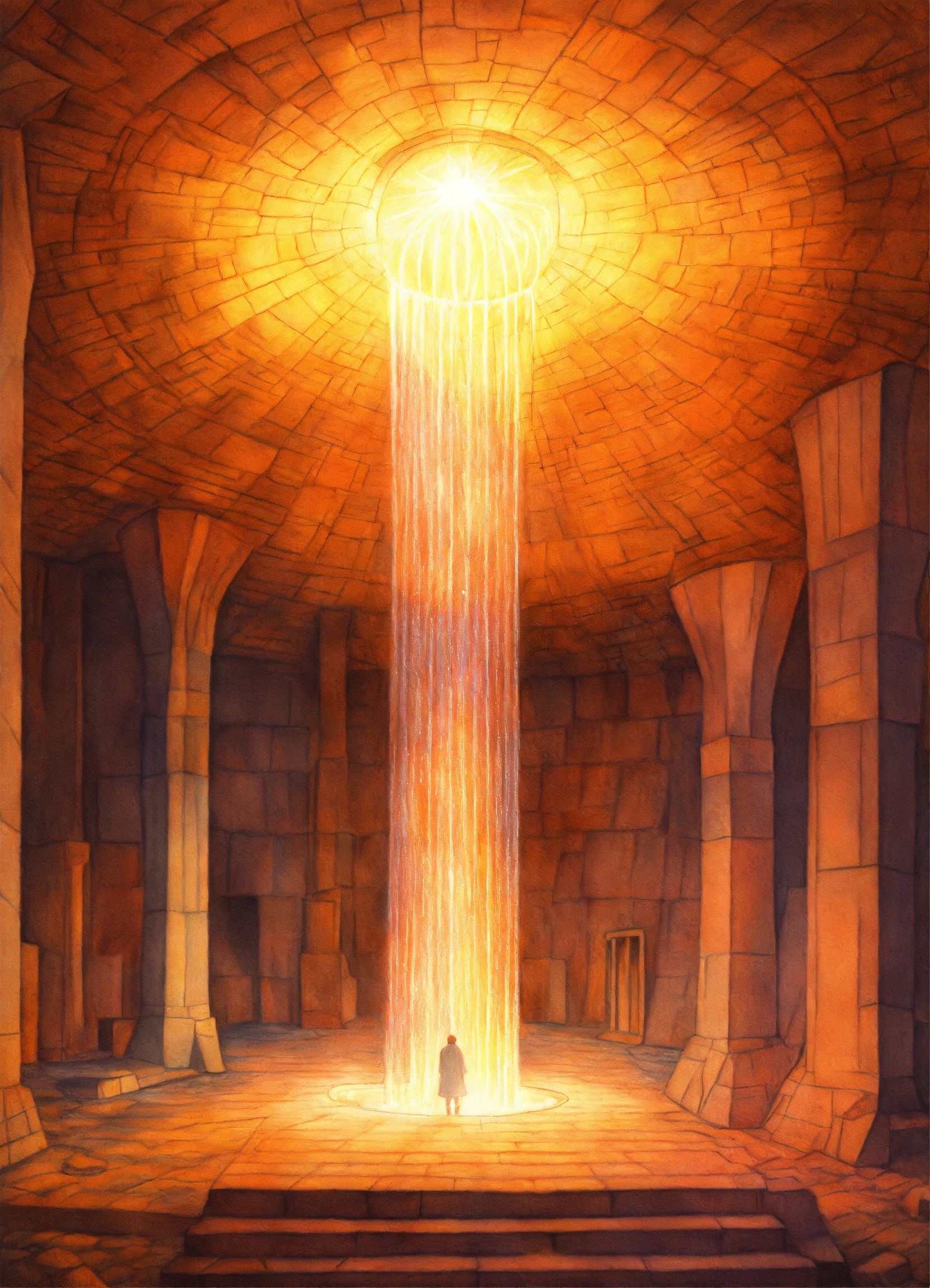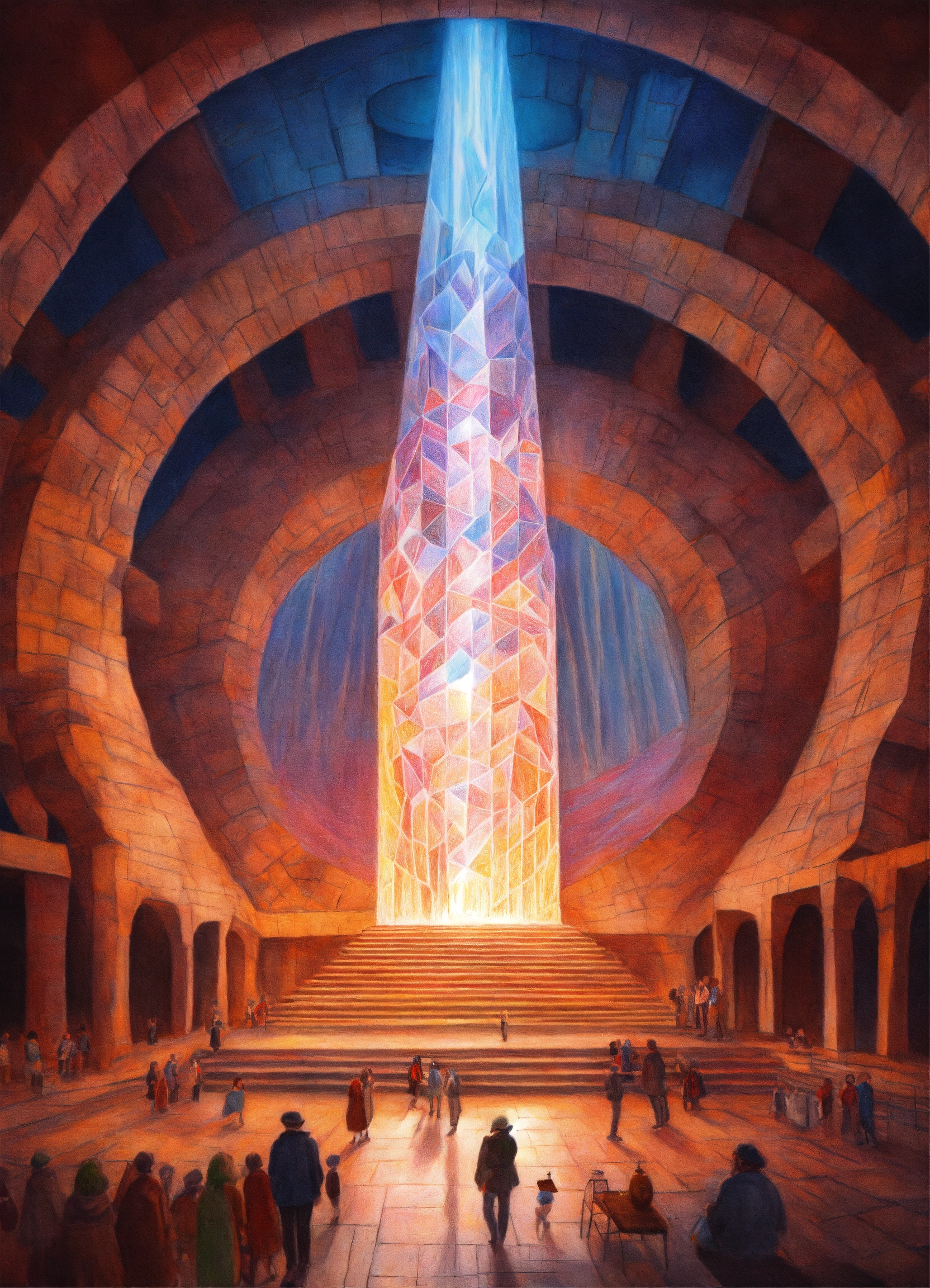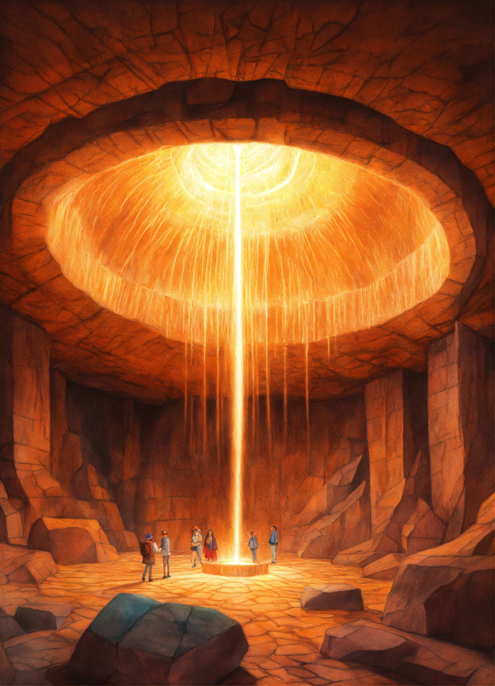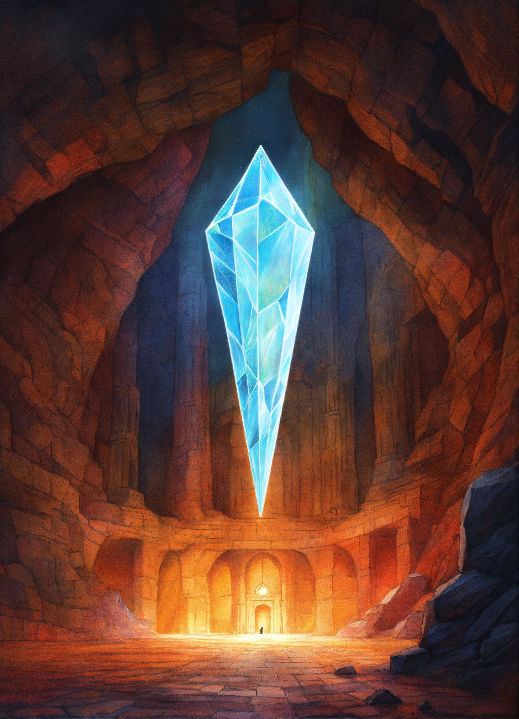 Realistic colored pencil illustration of a large underground chamber with an immense crystal in the center reaching above the ceiling, emanating a lot of light.