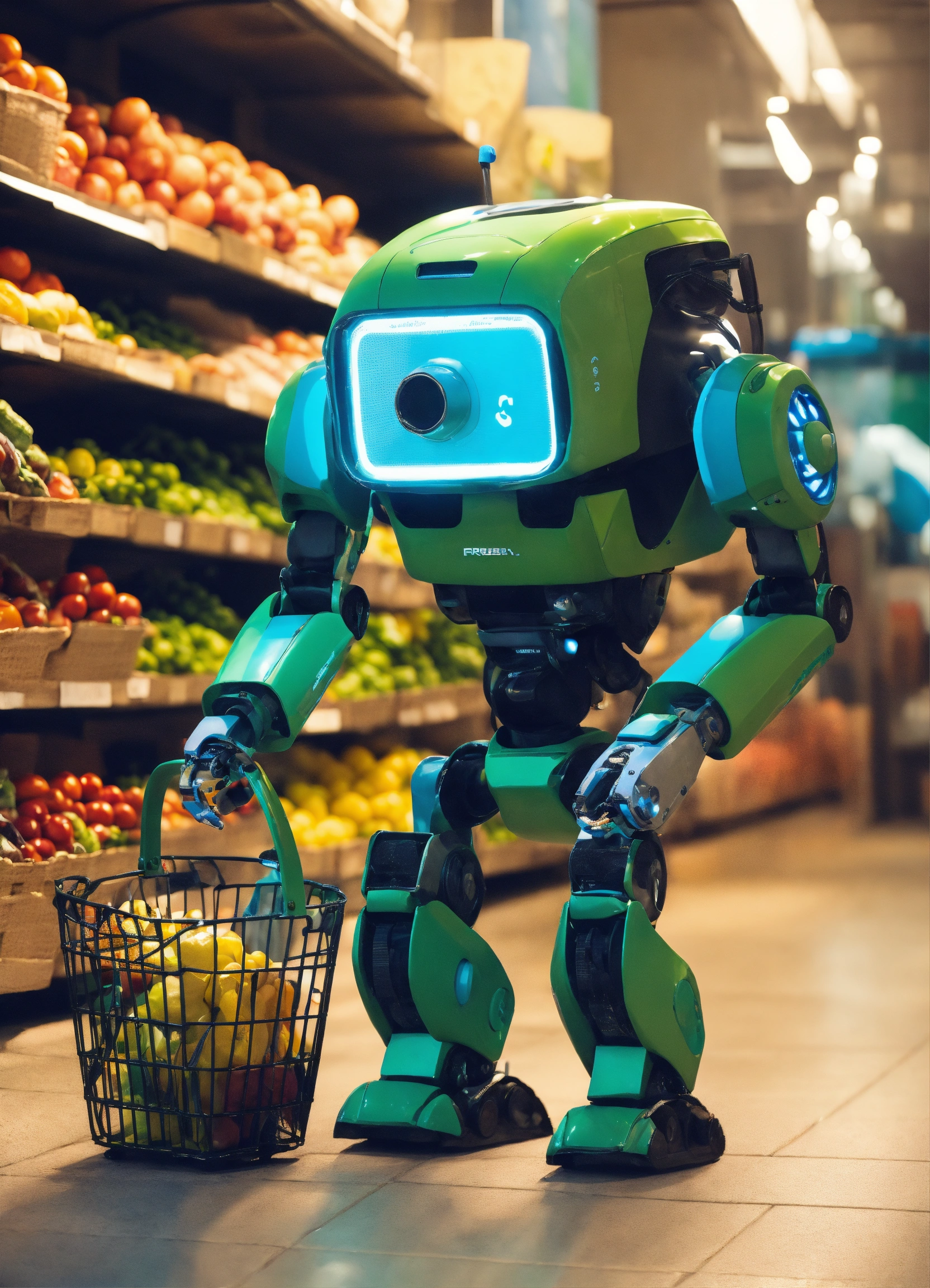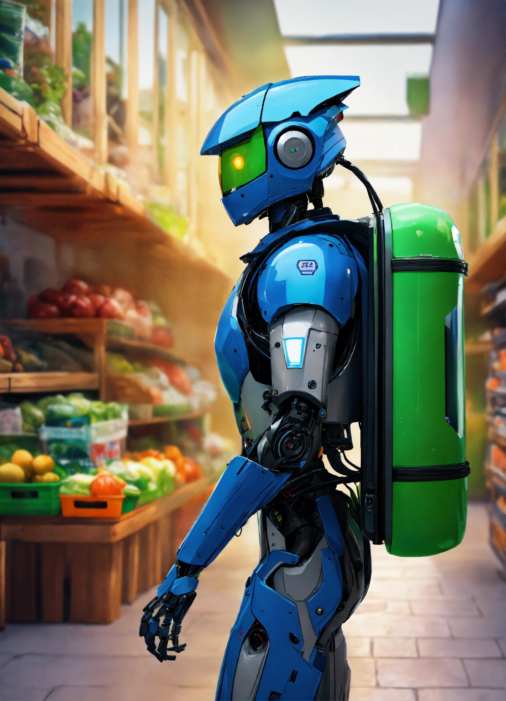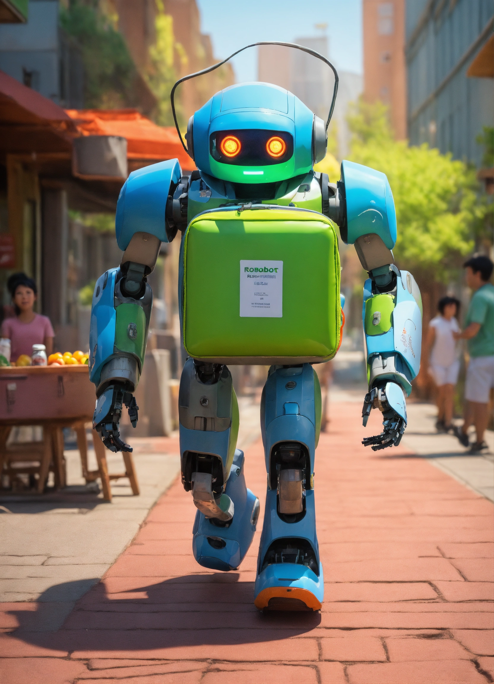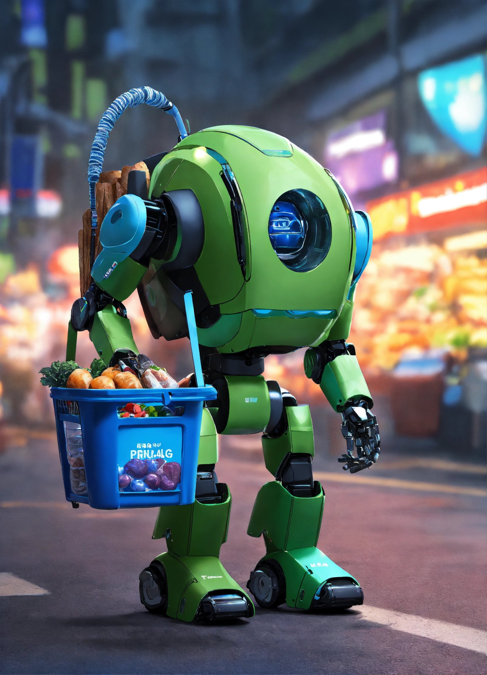A passionate male robot with a realistic man face, clear eyes, black hair, and a sports backpack runs to deliver groceries in a basket on his hands. the basket contains assorted vegetables, milk bottles, packed bread, and soft drinks. the robot's face should be clearly visible, even though he is running. the predominant design colors are gradients of blue and green. the background is transparent. here are some additional details that you may want to include in your description the robot's facial expression should be one of determination and excitement. he should look like he is really enjoying his job. the robot's clothes should be clean and neat, even though he is running. he should look professional and trustworthy. the groceries in the basket should be arranged neatly and securely. the robot's sports backpack should be brightly colored and eye-catching.