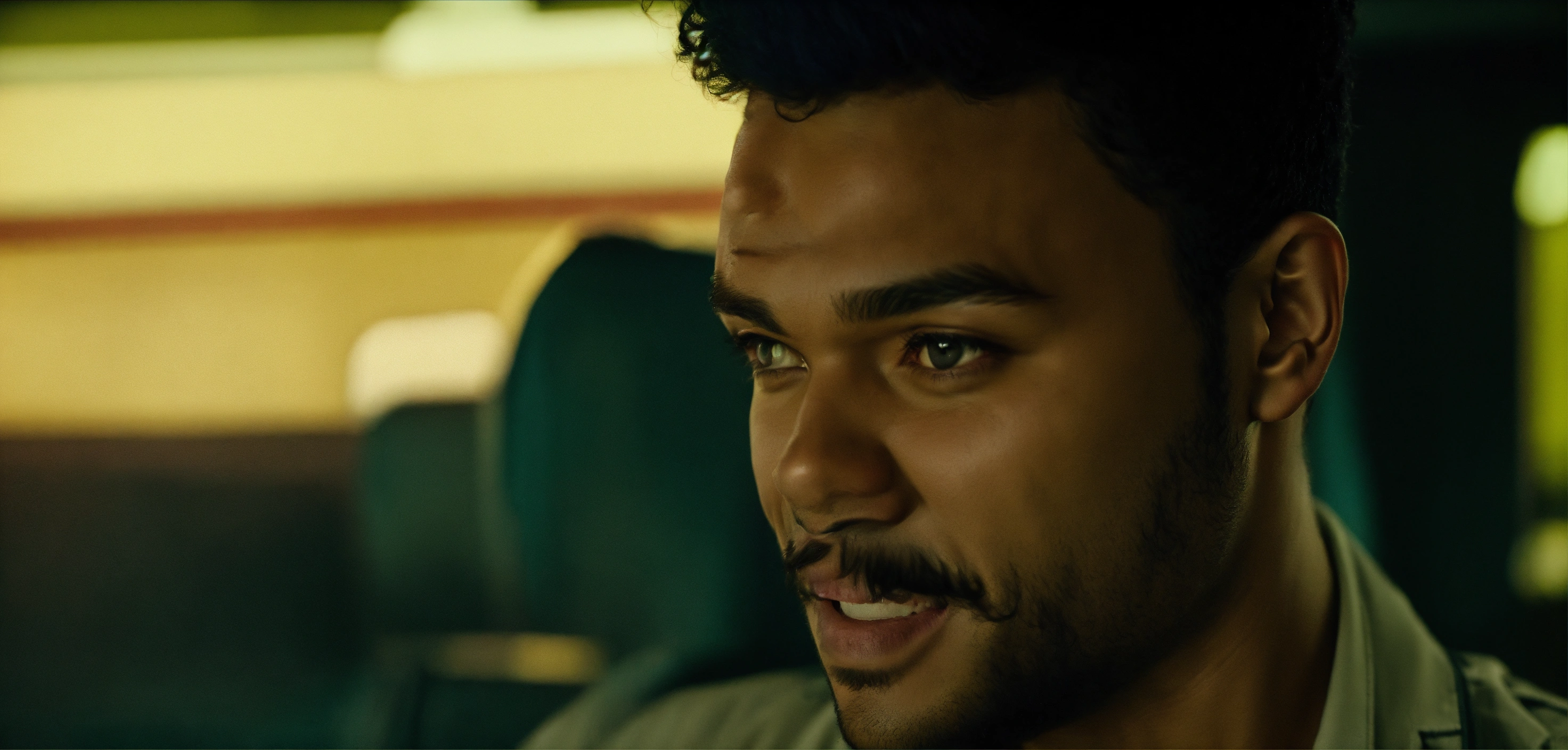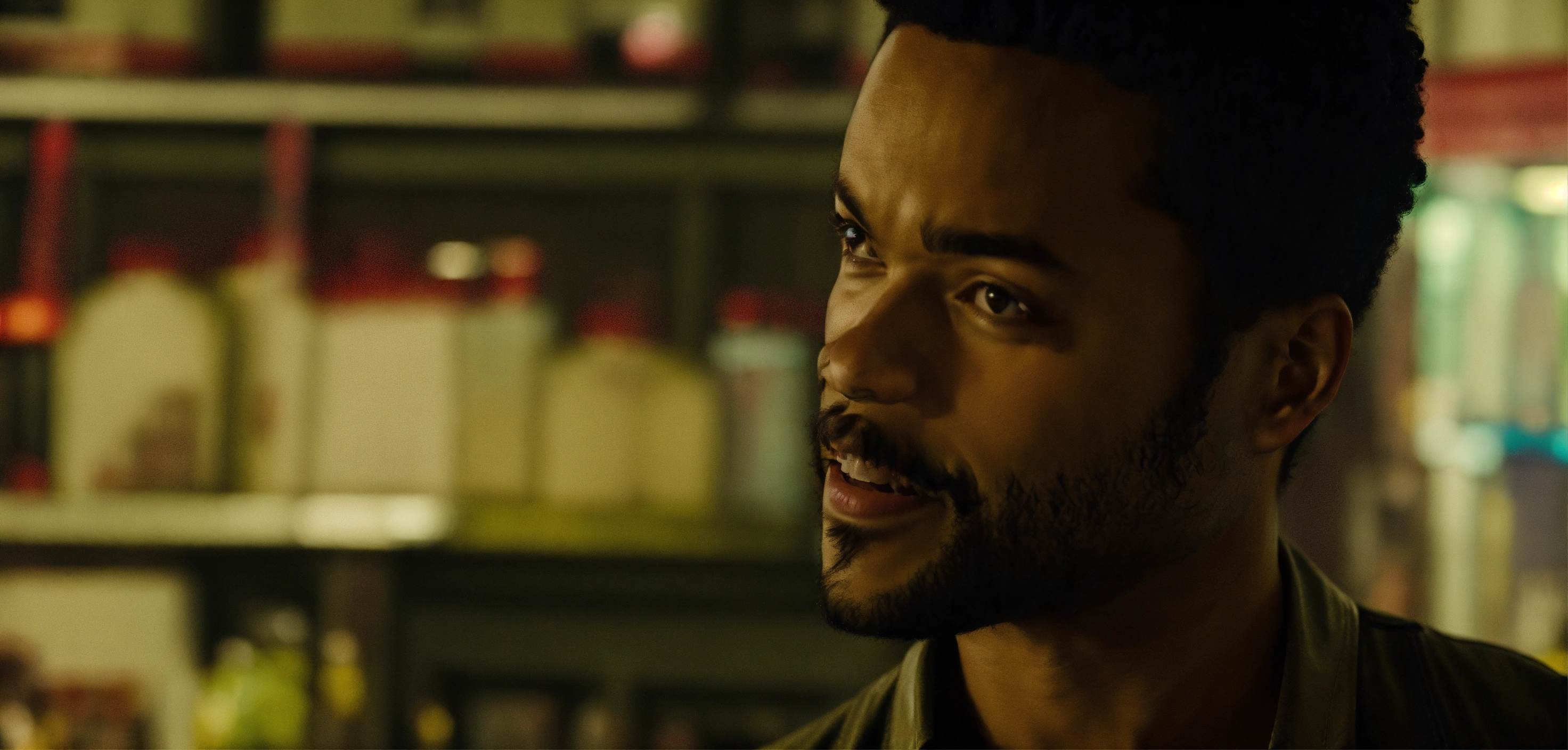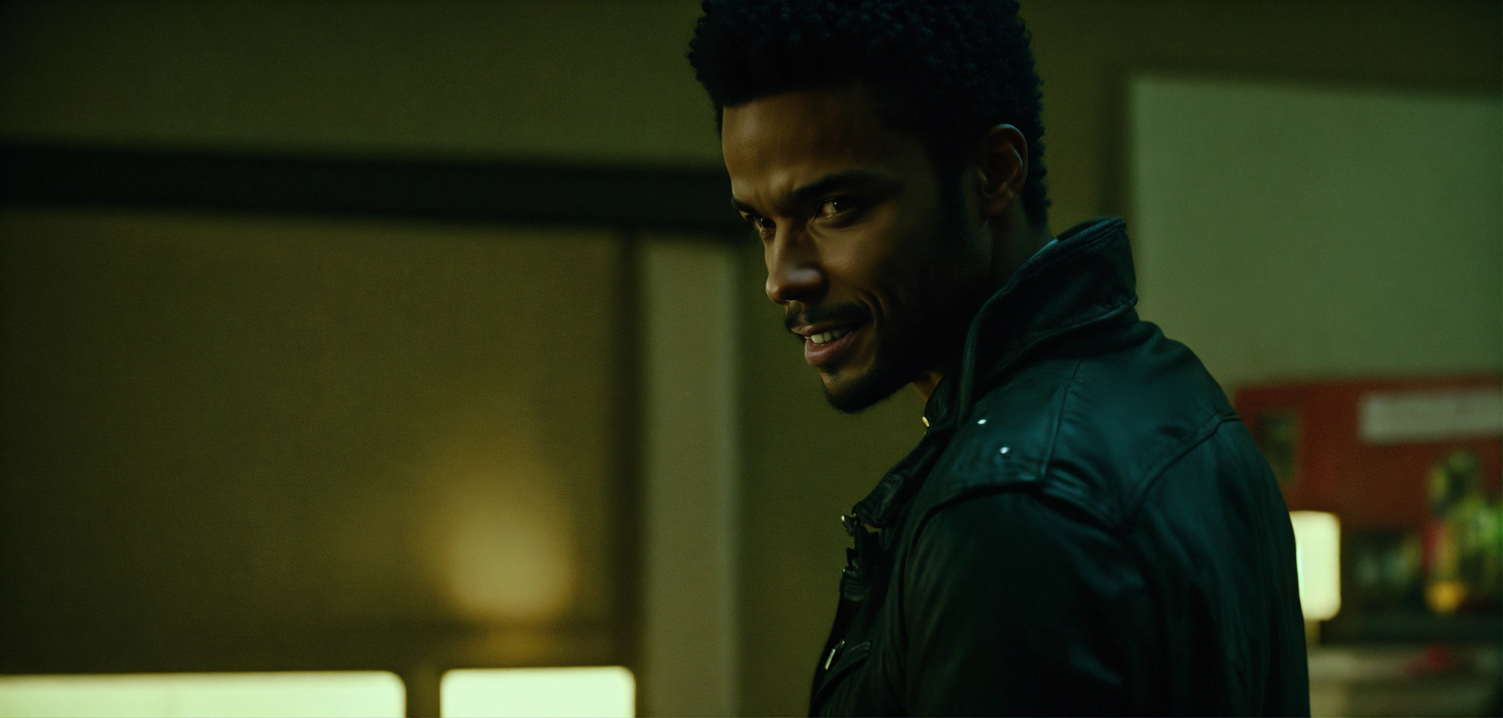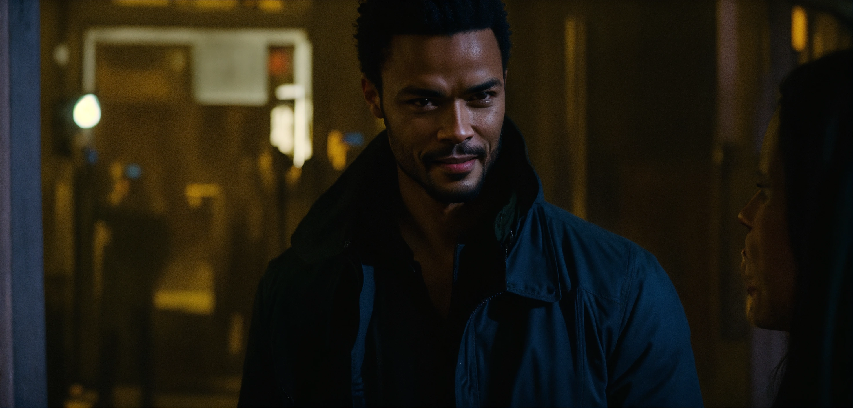 Handsome nice eka darville, zombie-infested city, dark, cinematic, jessica jones style, short hair, short temples, flirt smile