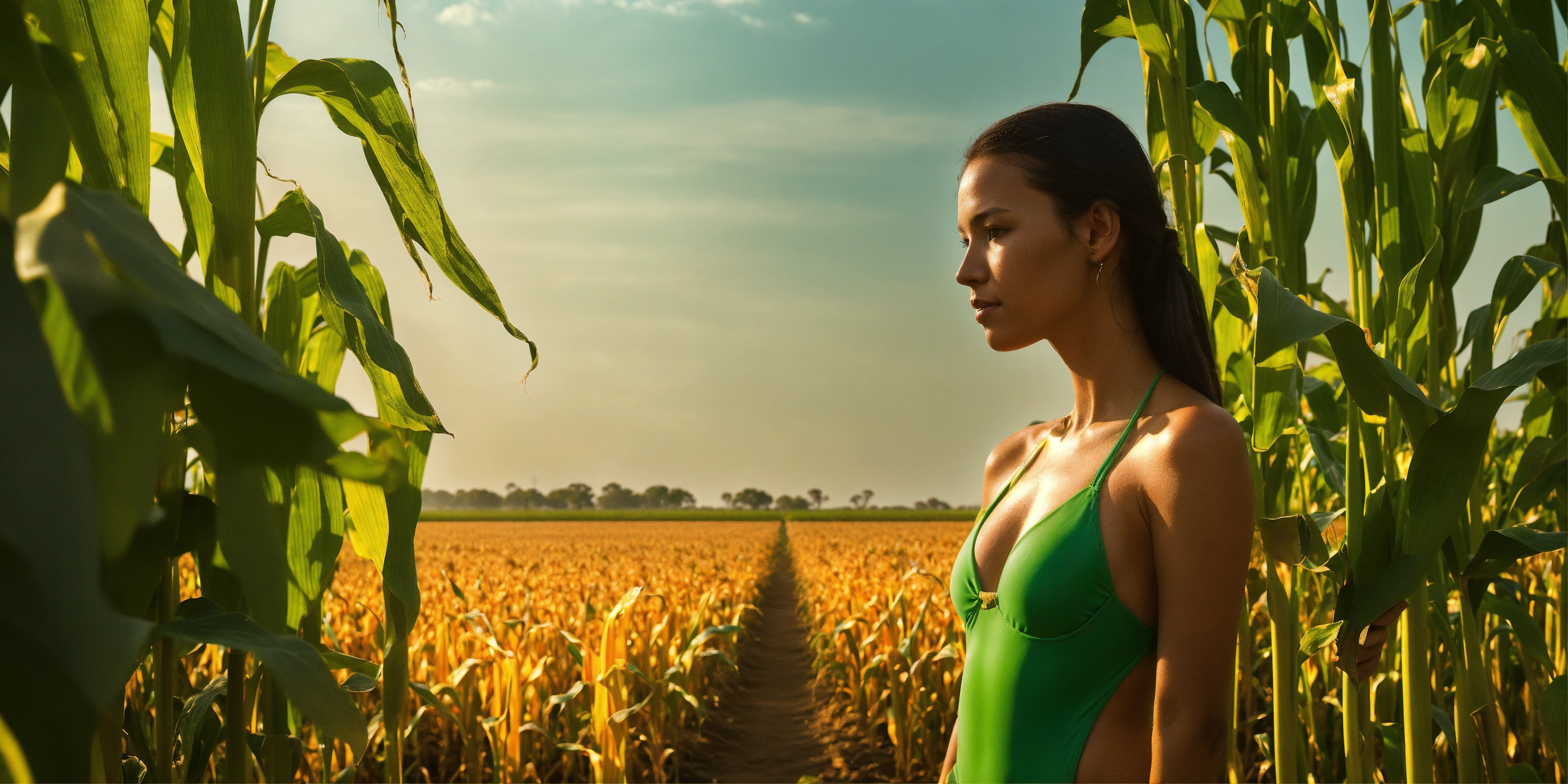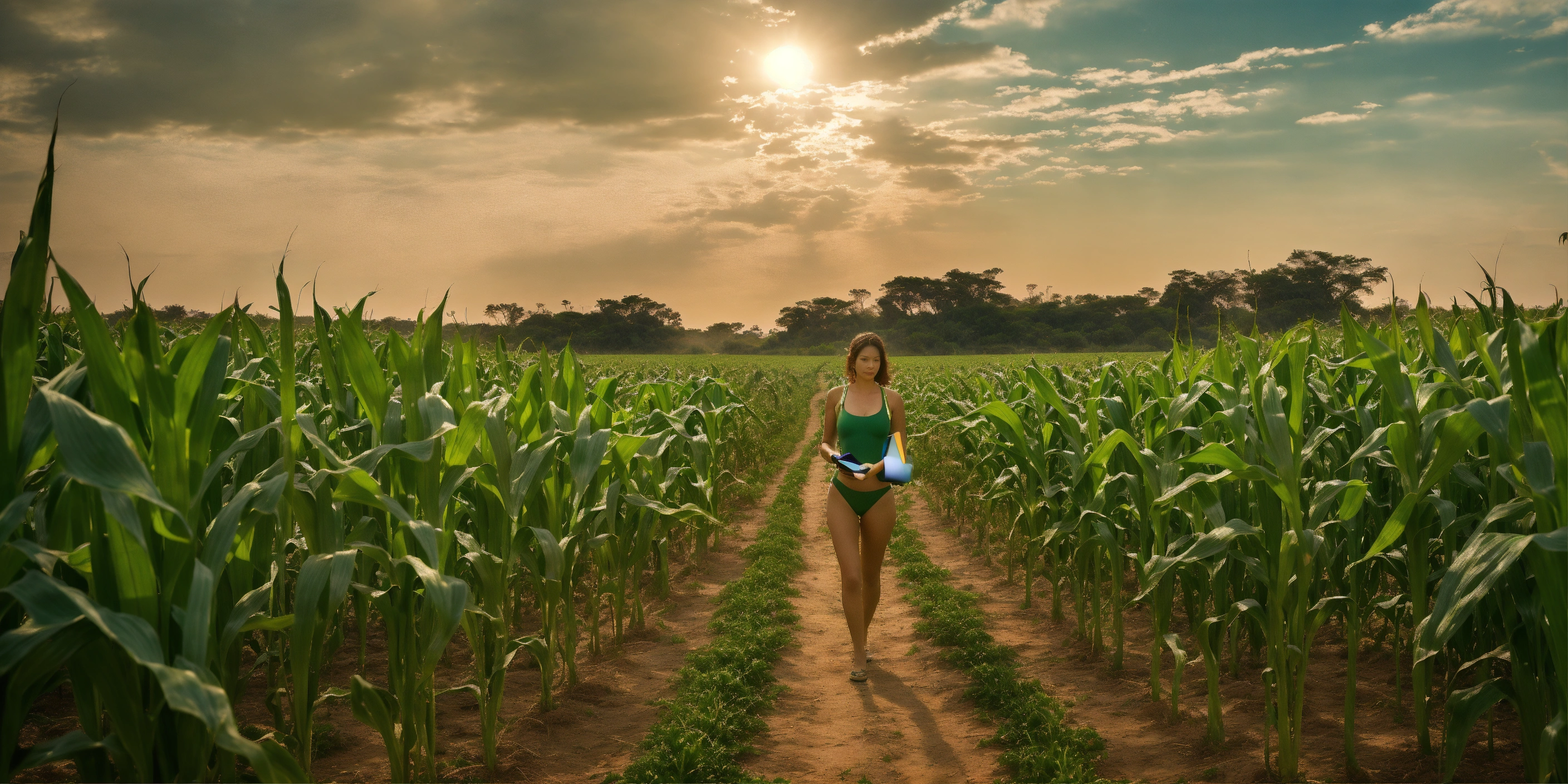 A tall woman gracefully stands in the midst of a maize field, her striking green swimsuit contrasting vividly with the surrounding environment. the maize plants around her are sparse and stunted, indicating a zone with poor vegetation. the sun casts a soft glow, highlighting the lady’s silhouette against the backdrop of the struggling crops. she hold a tablet pc in her hand