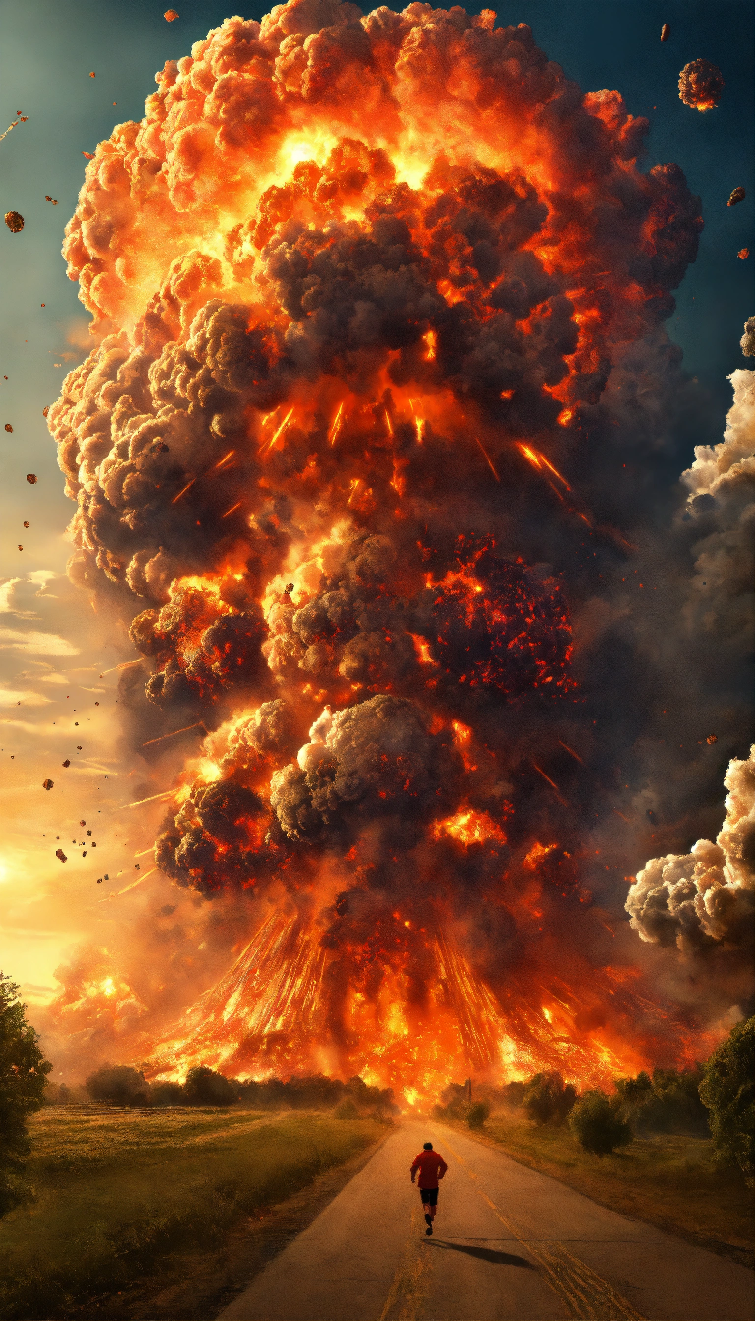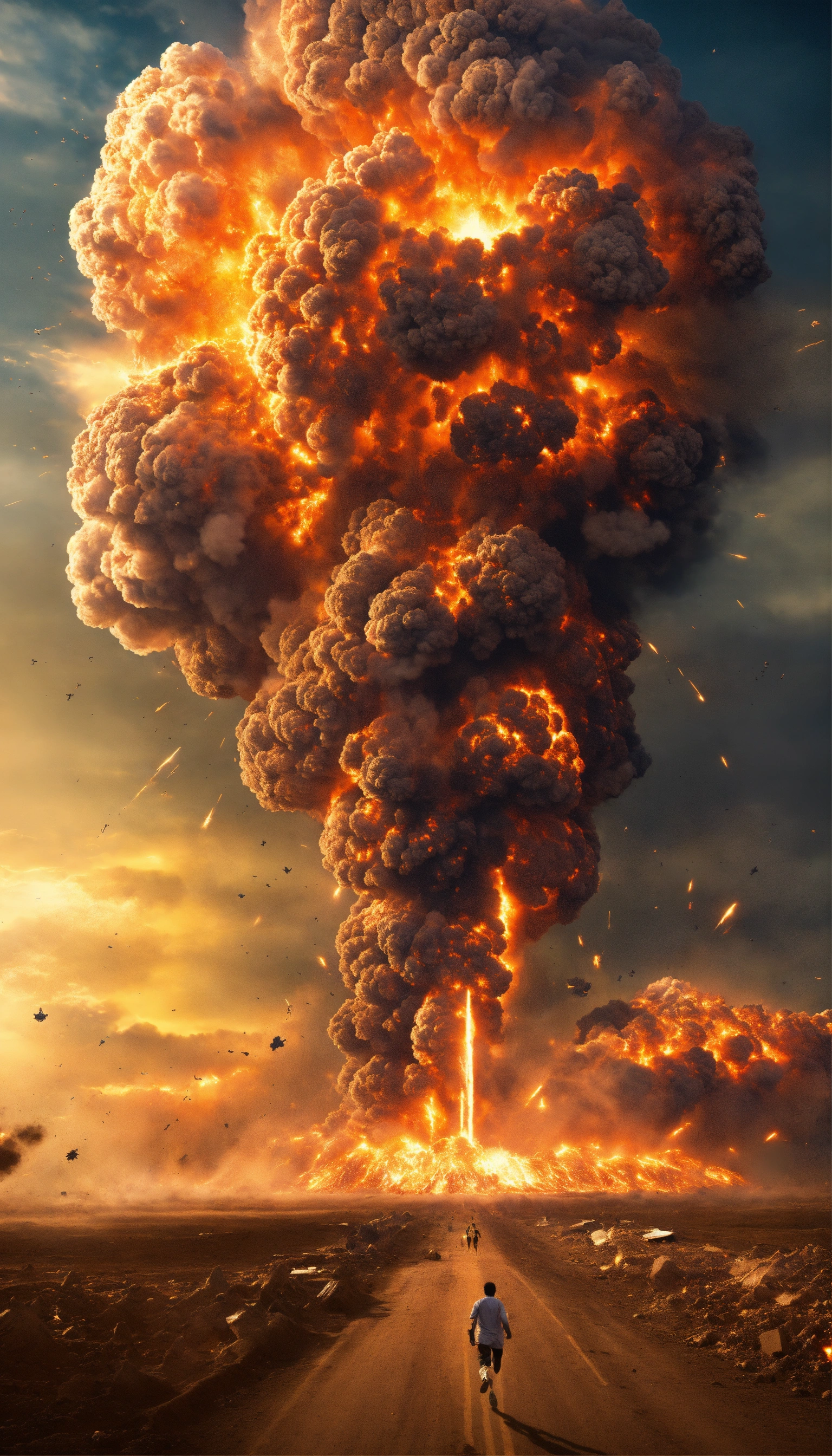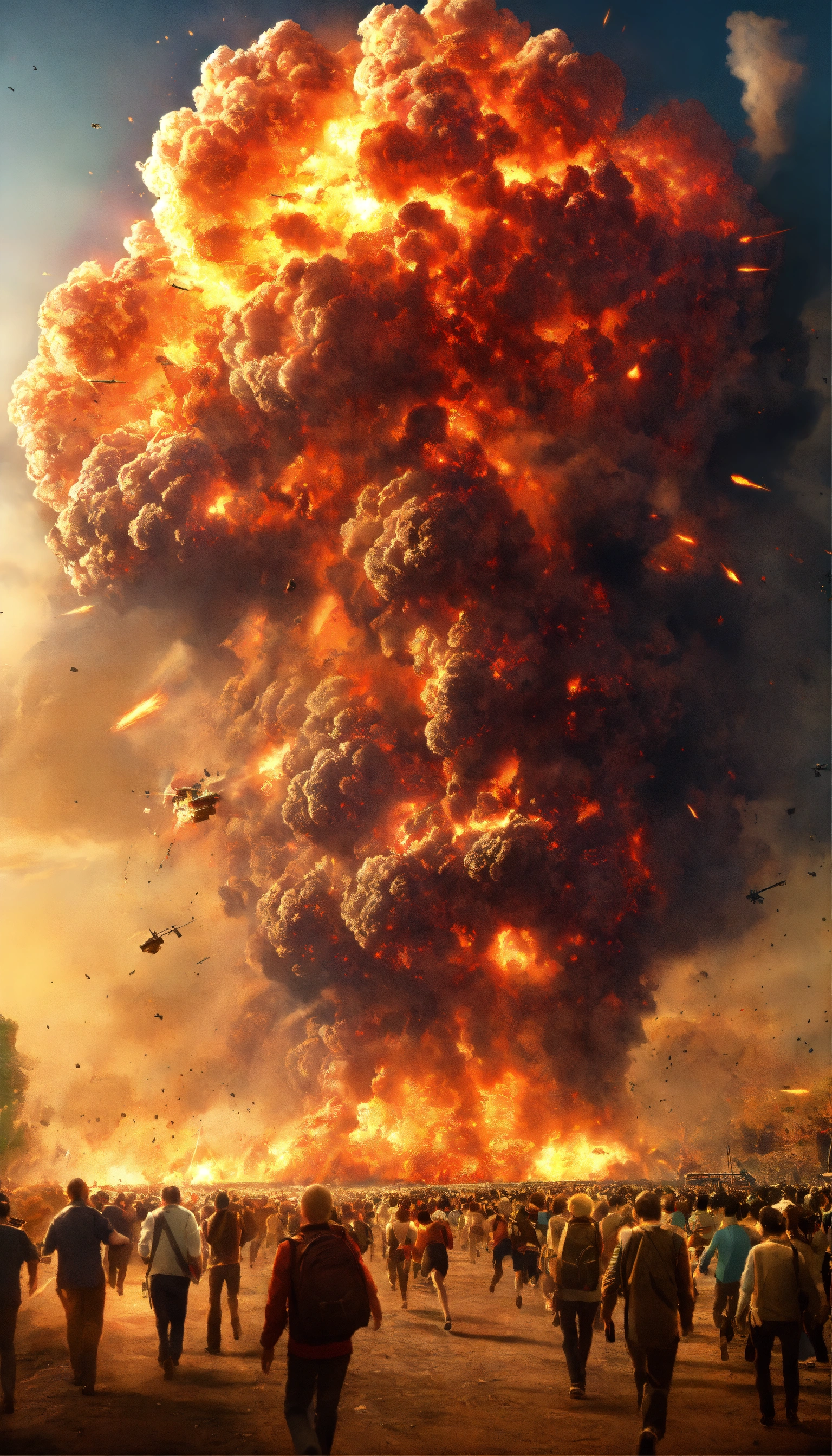 A mass explosion on earth that destroys all of humanity, scary, massive explosion, humans running away from it