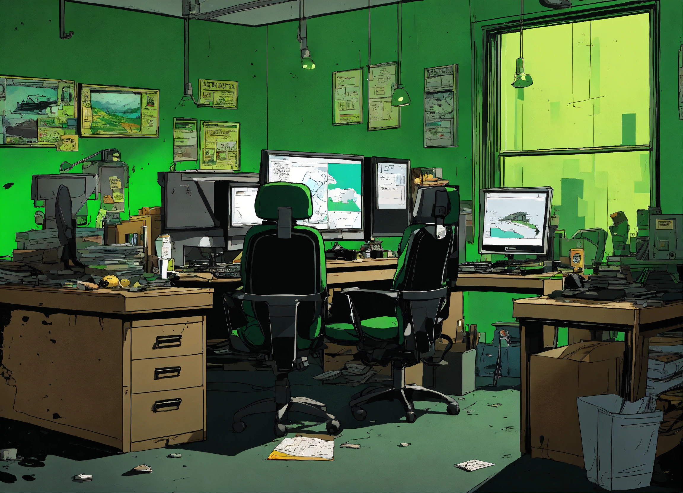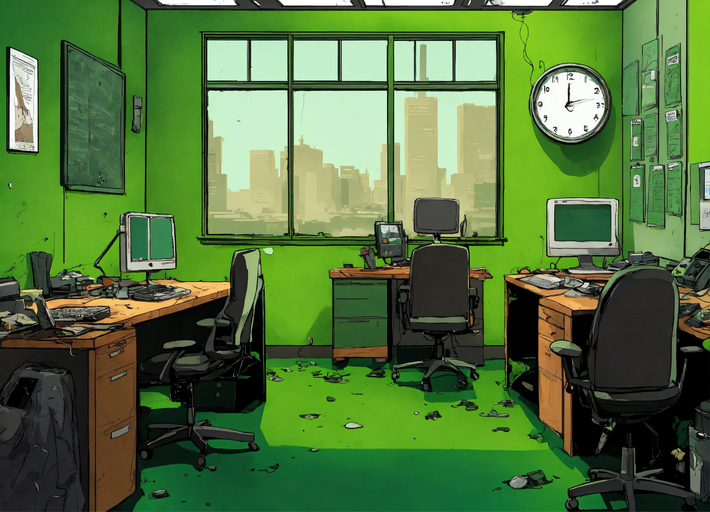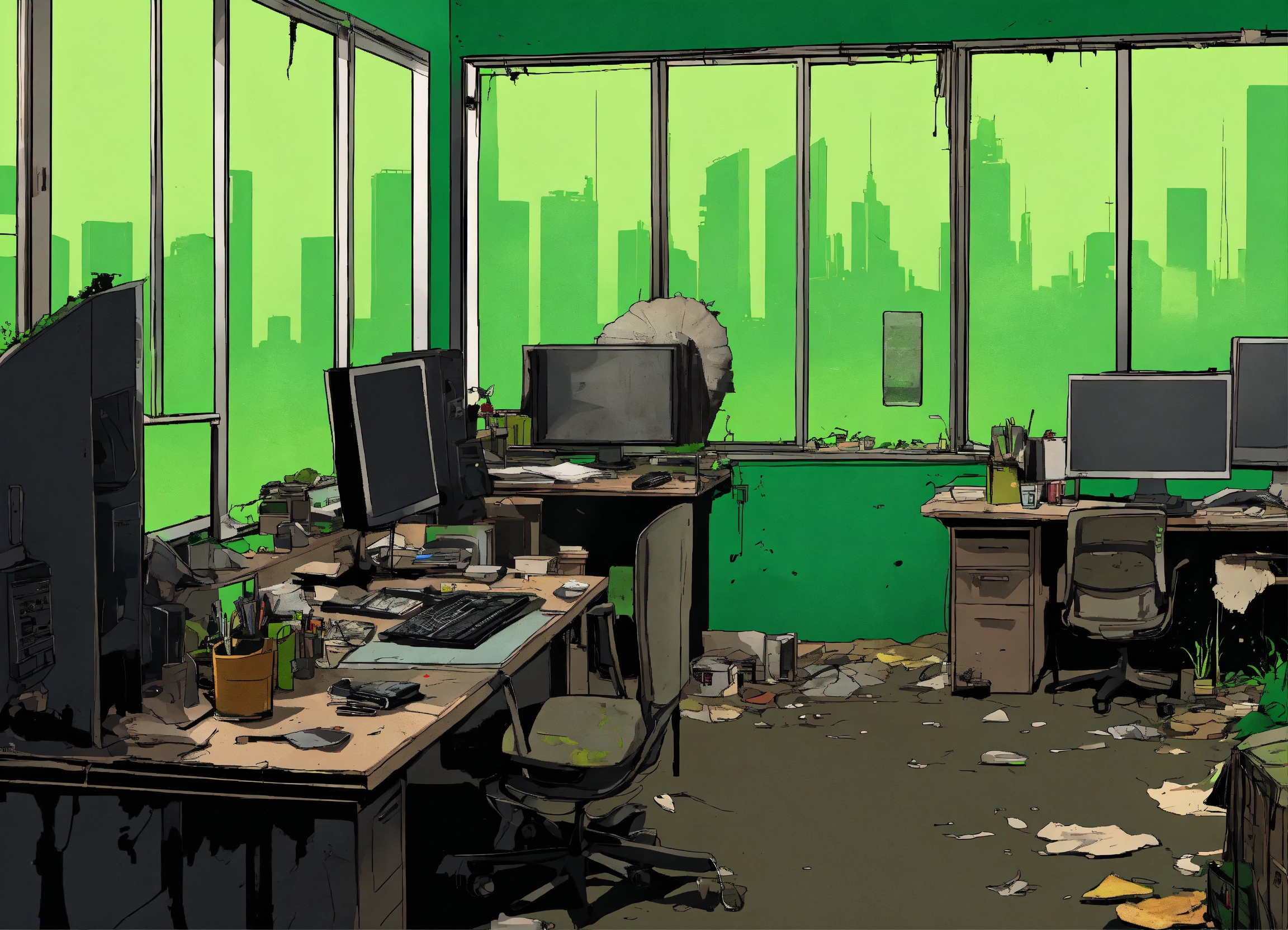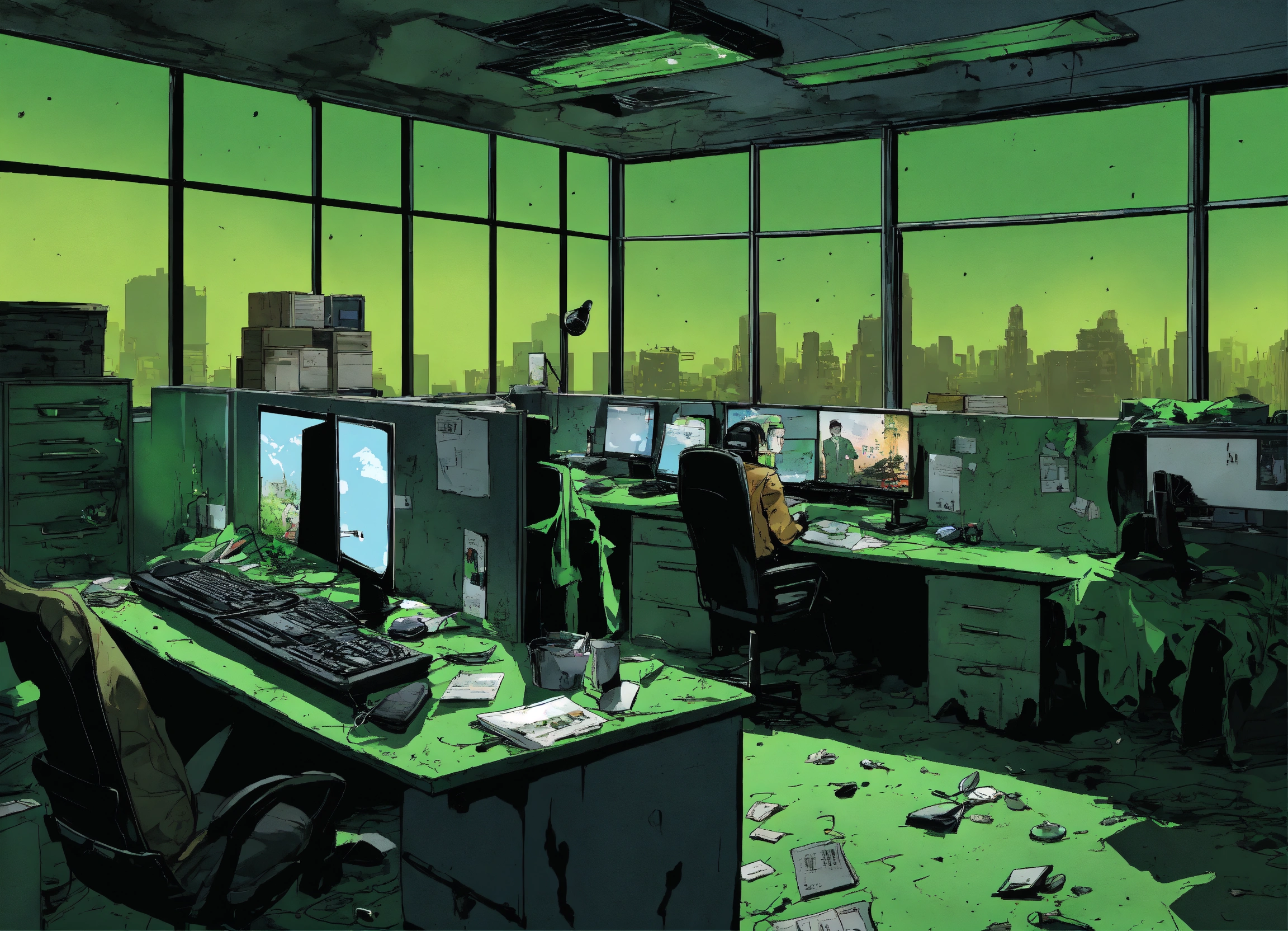 Create a comic cartoon poster for a post-apocalyptic office setting, where the workers, looking drained and lifeless, are mere silhouettes against the bright green backdrop of their desk monitors. the office itself is a shell, with peeling black paint and abandoned workstations