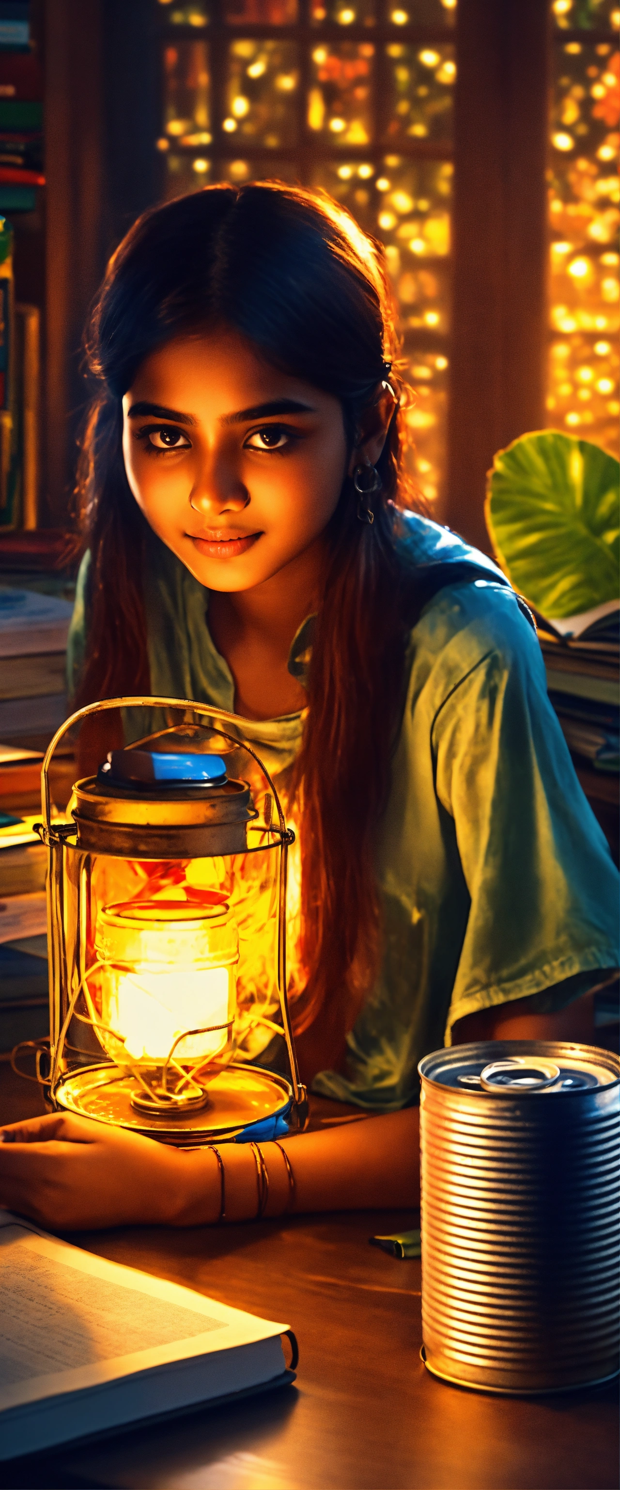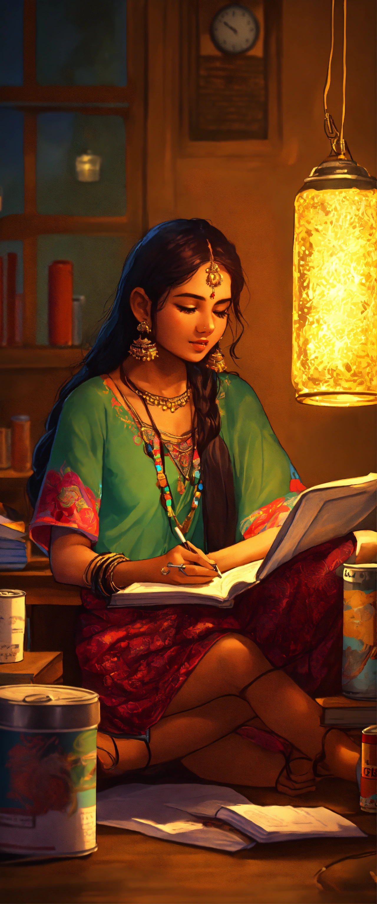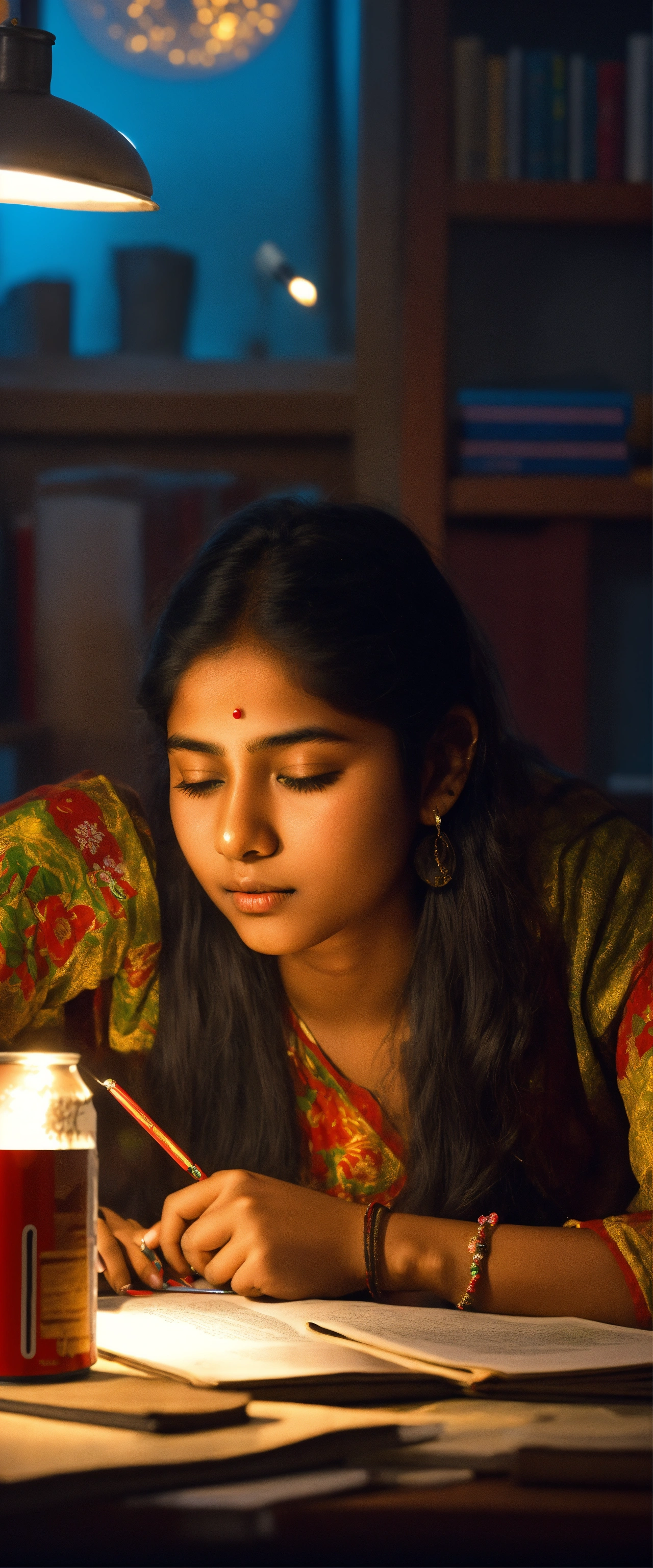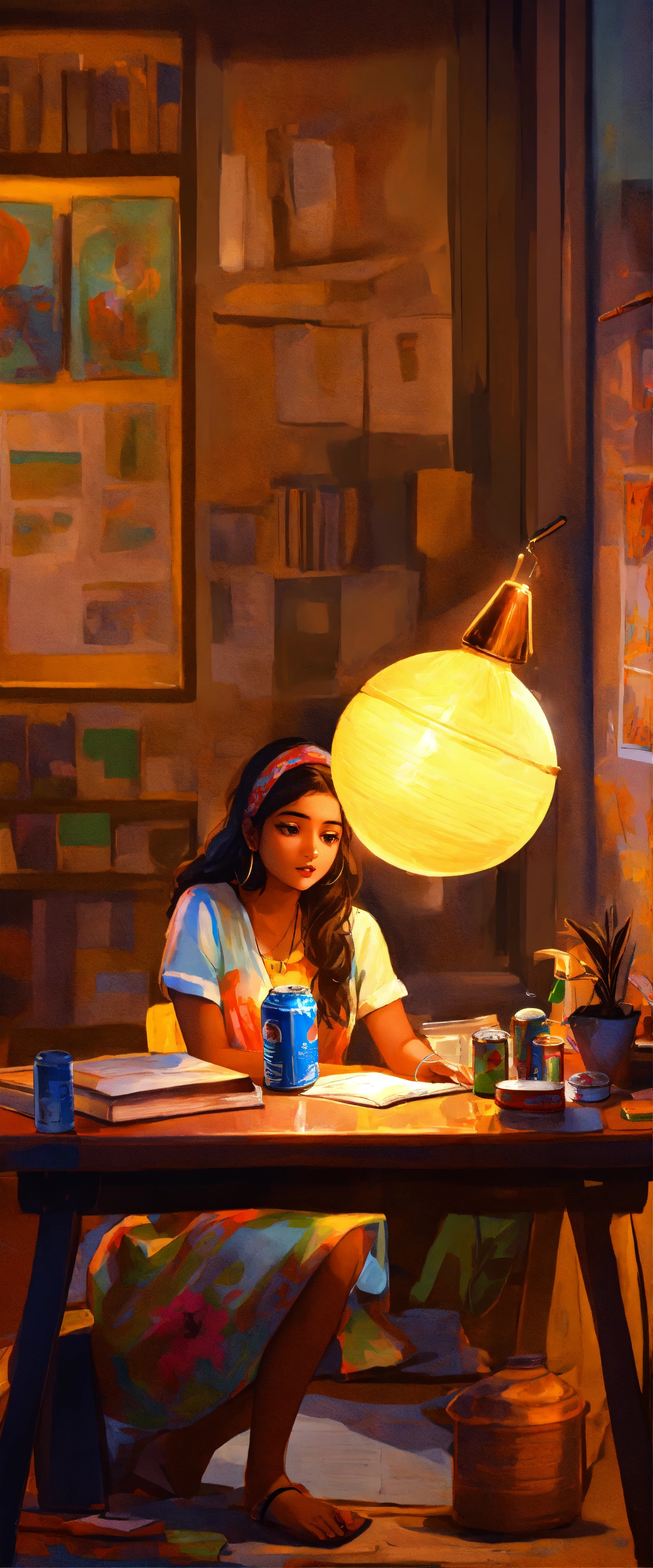 Bengali girl is 16 year old having a canned bevarage while studying, make the girl with a hippie look sitting on a study table with a can, make it look like she is working late night