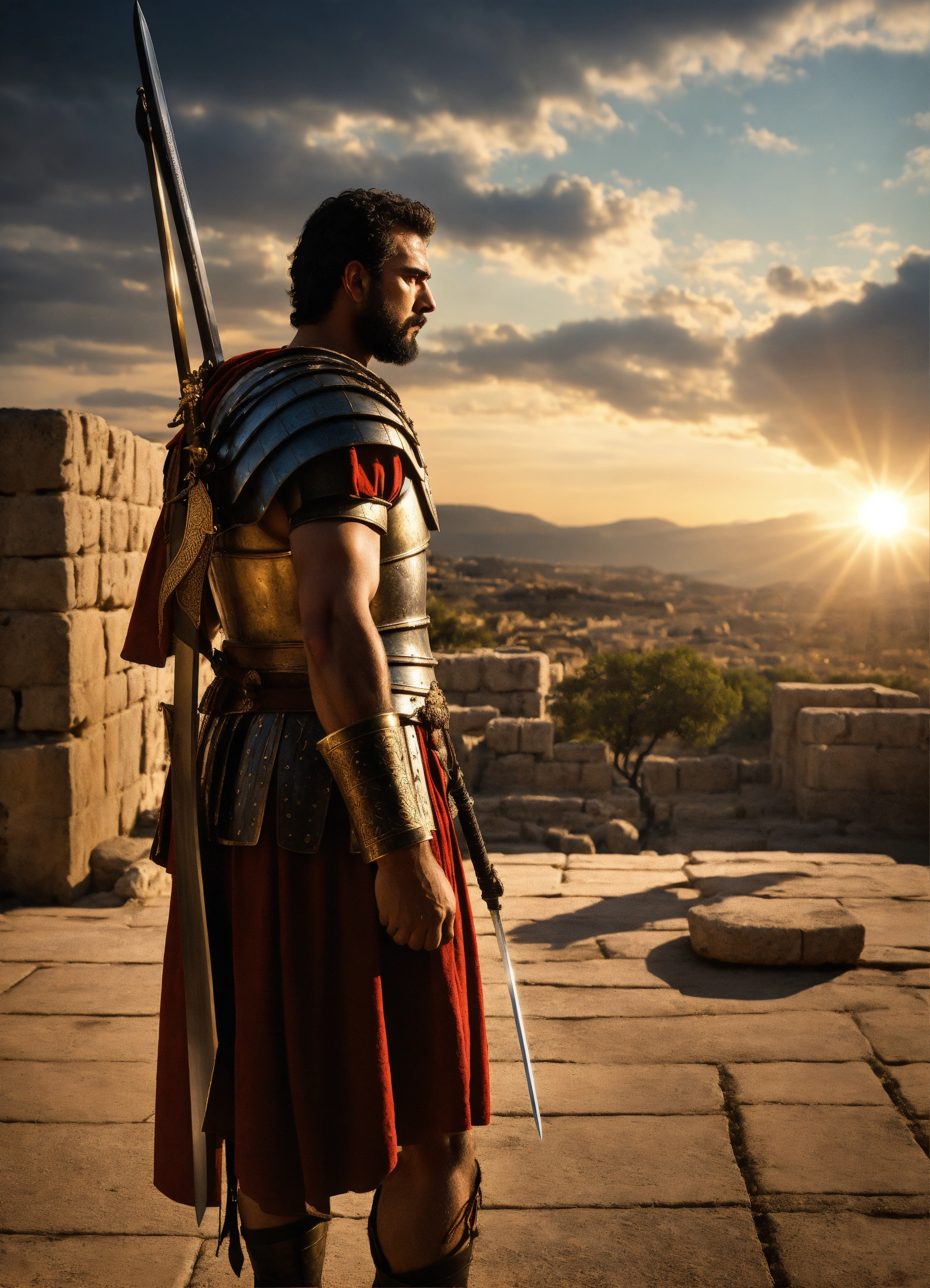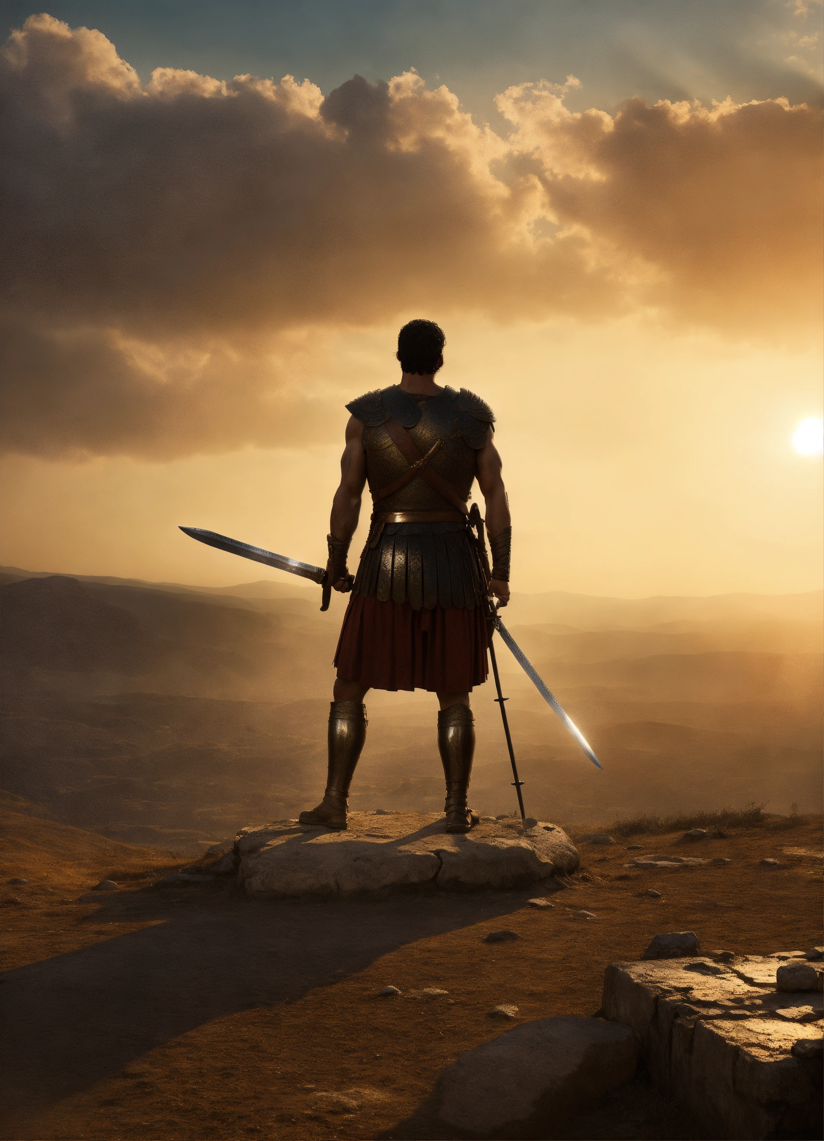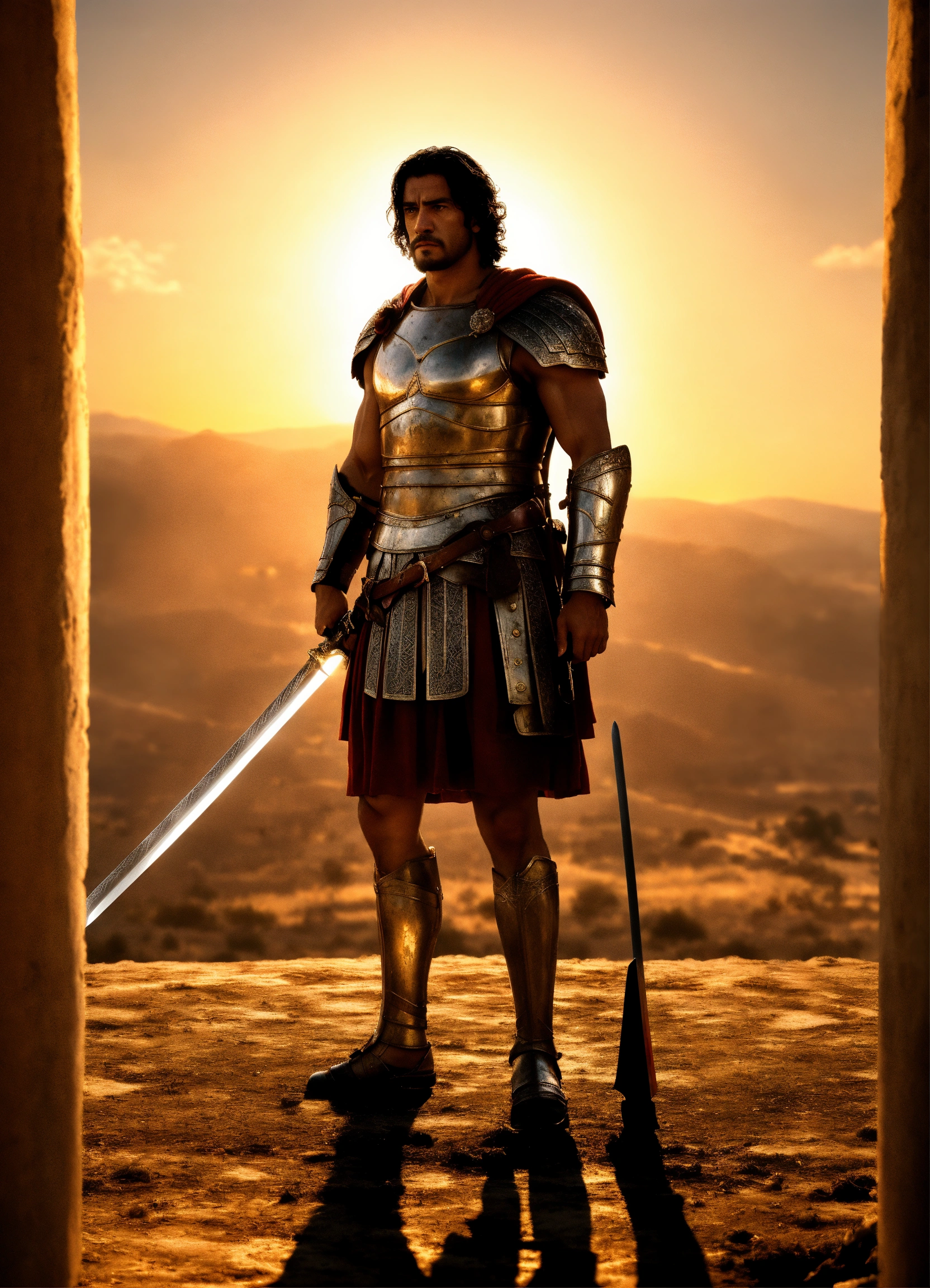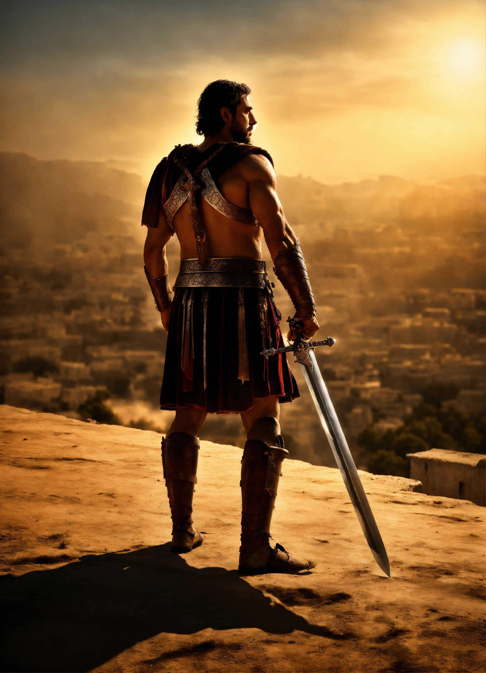 Aquiles, héctor, heavy-hearted victor amidst the tragedy, ancient greece, sword gleaming with the setting sun, center of the battlefield, aquiles looking down at héctor with respect and sorrow, the shadows of the two warriors stretching long, low angle shot, hyper-realistic, photo realism, cinematography, --ar 916"