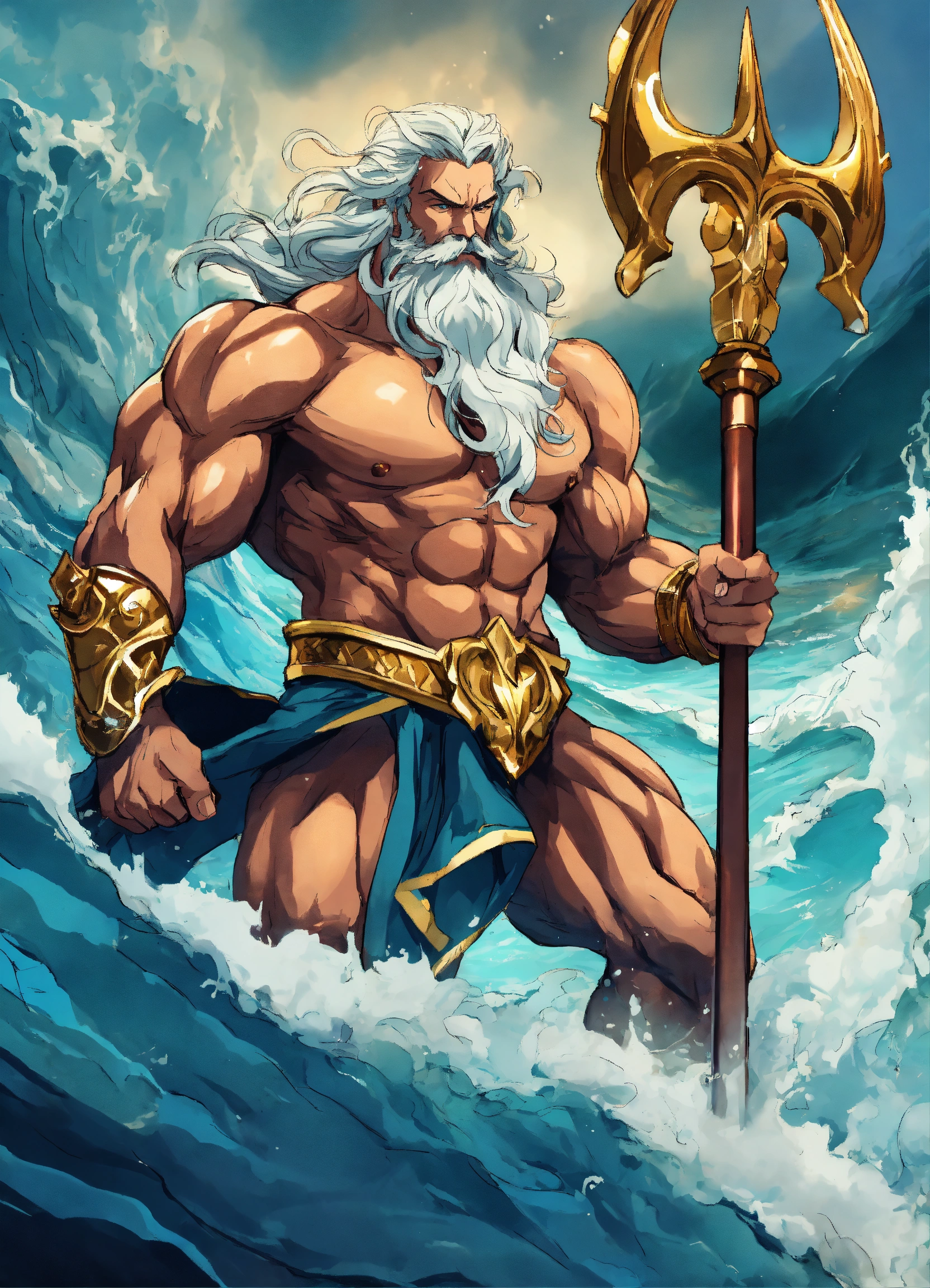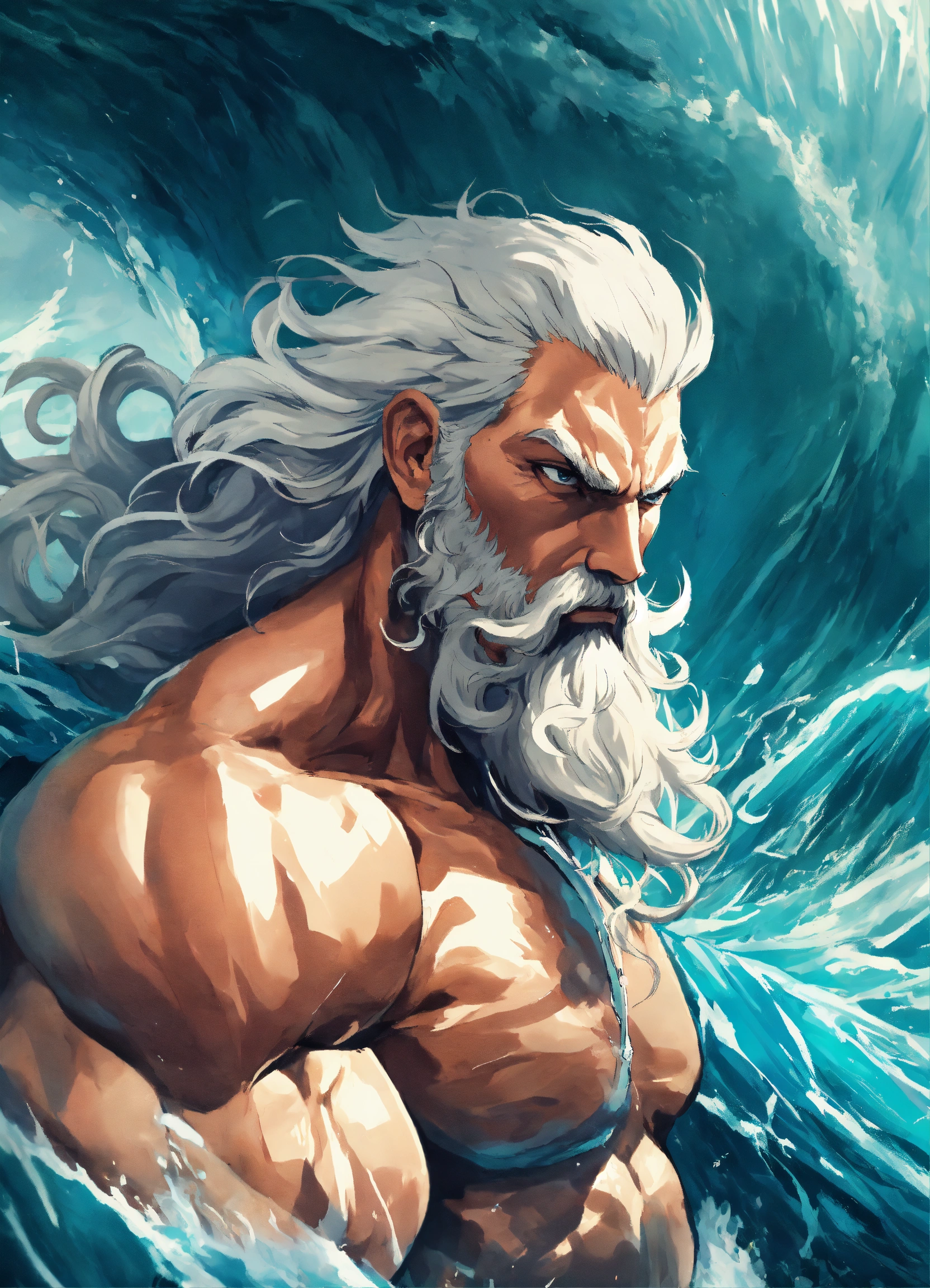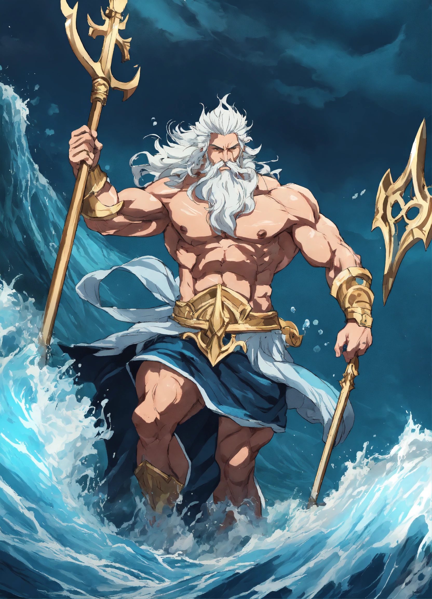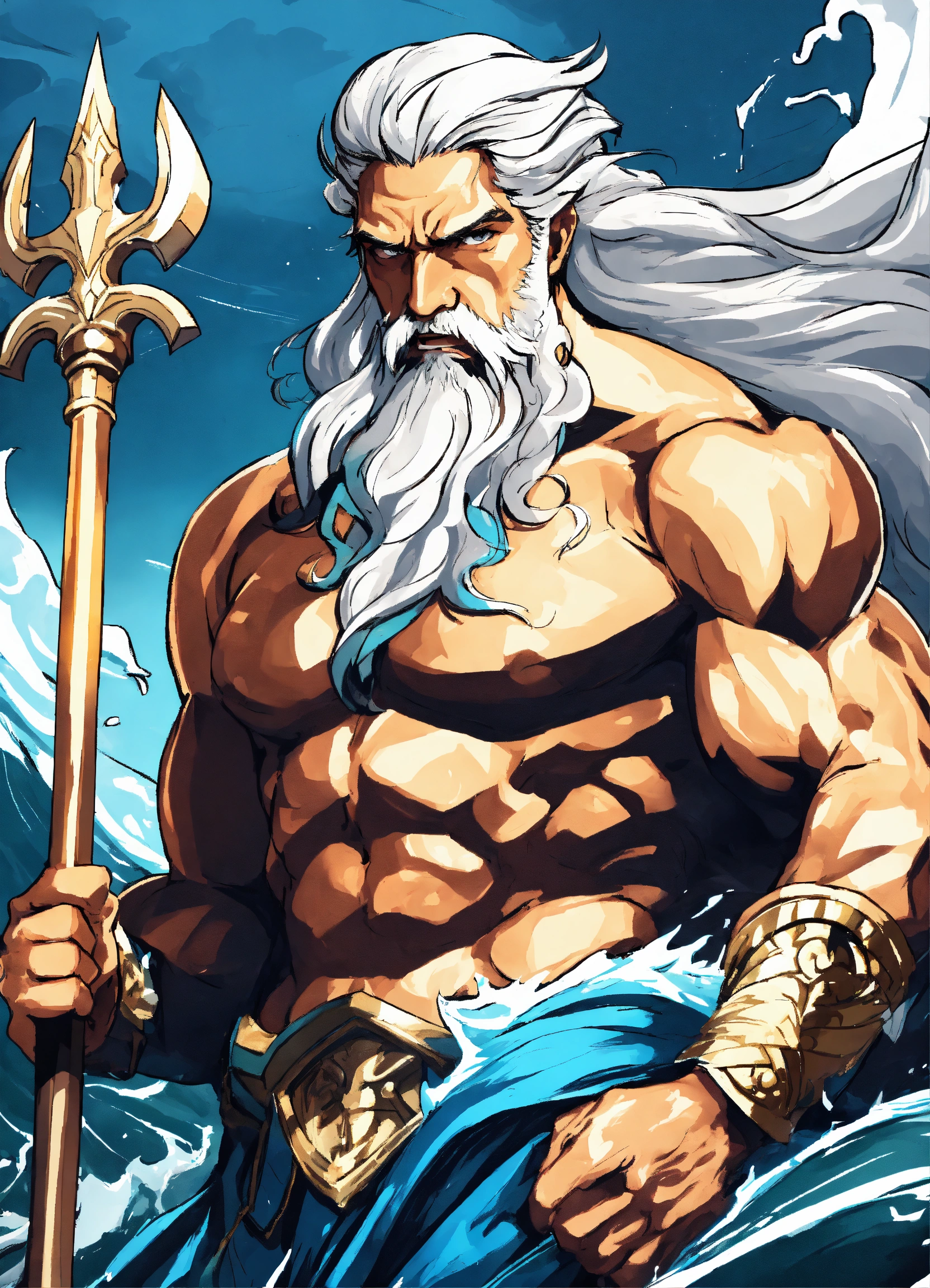 God poseidon in the raging sea with a trident in his hand, ready to fight, drawing style, anime, white beard and long white hair, muscle, hd