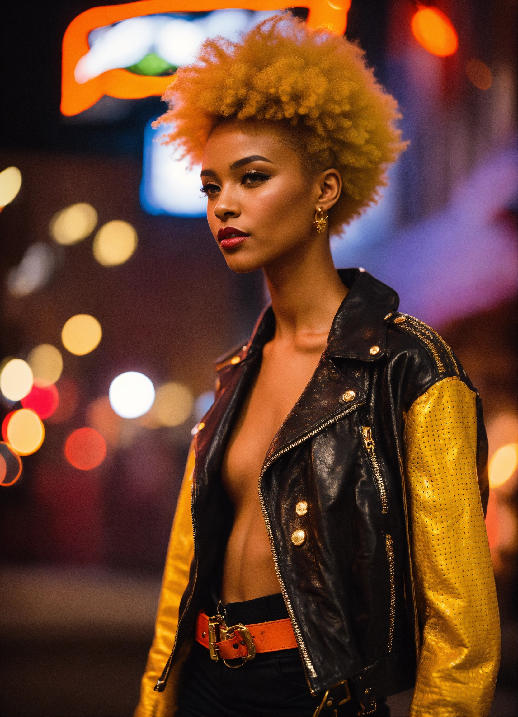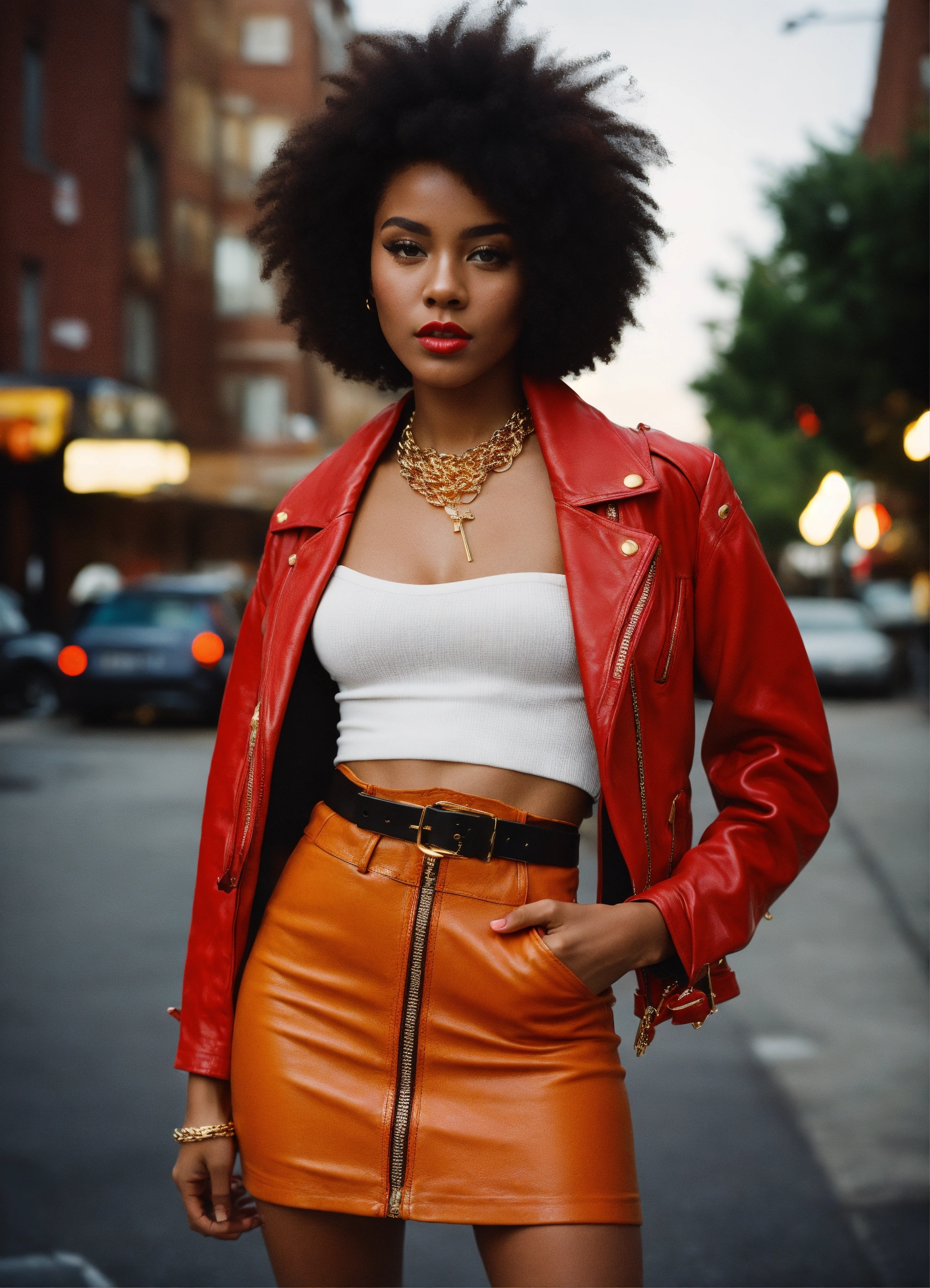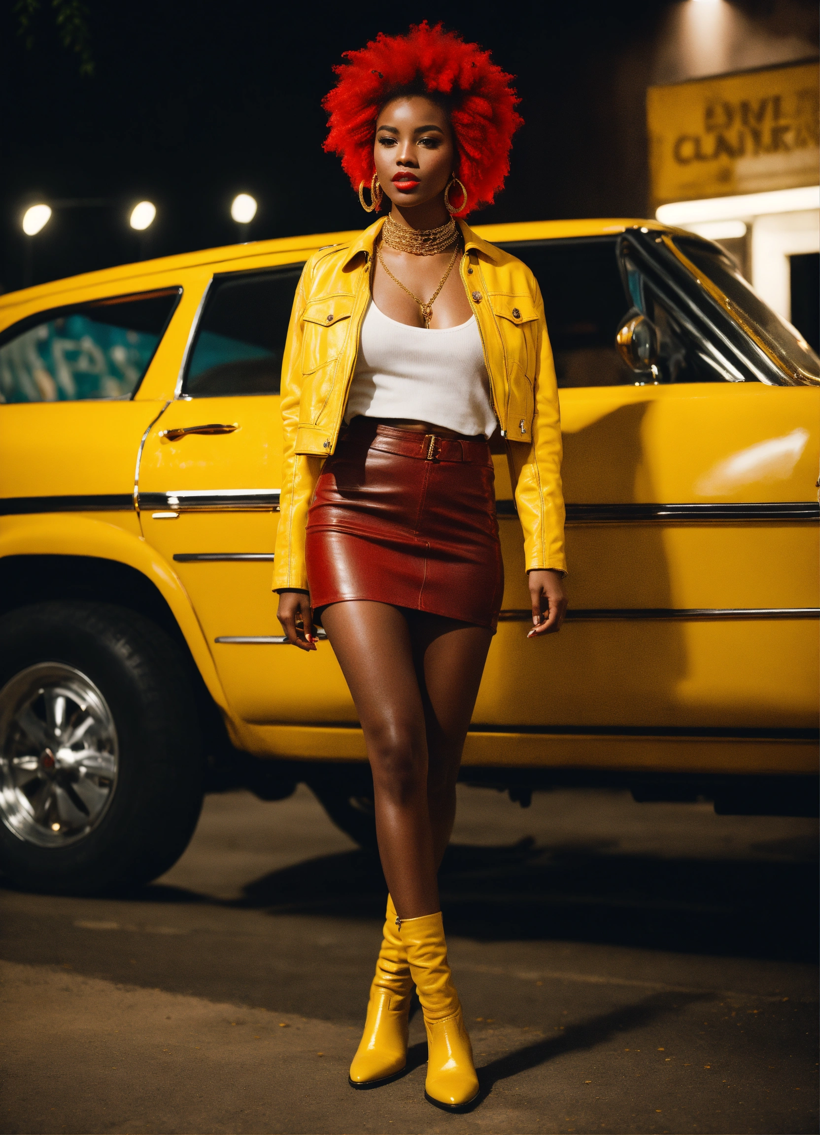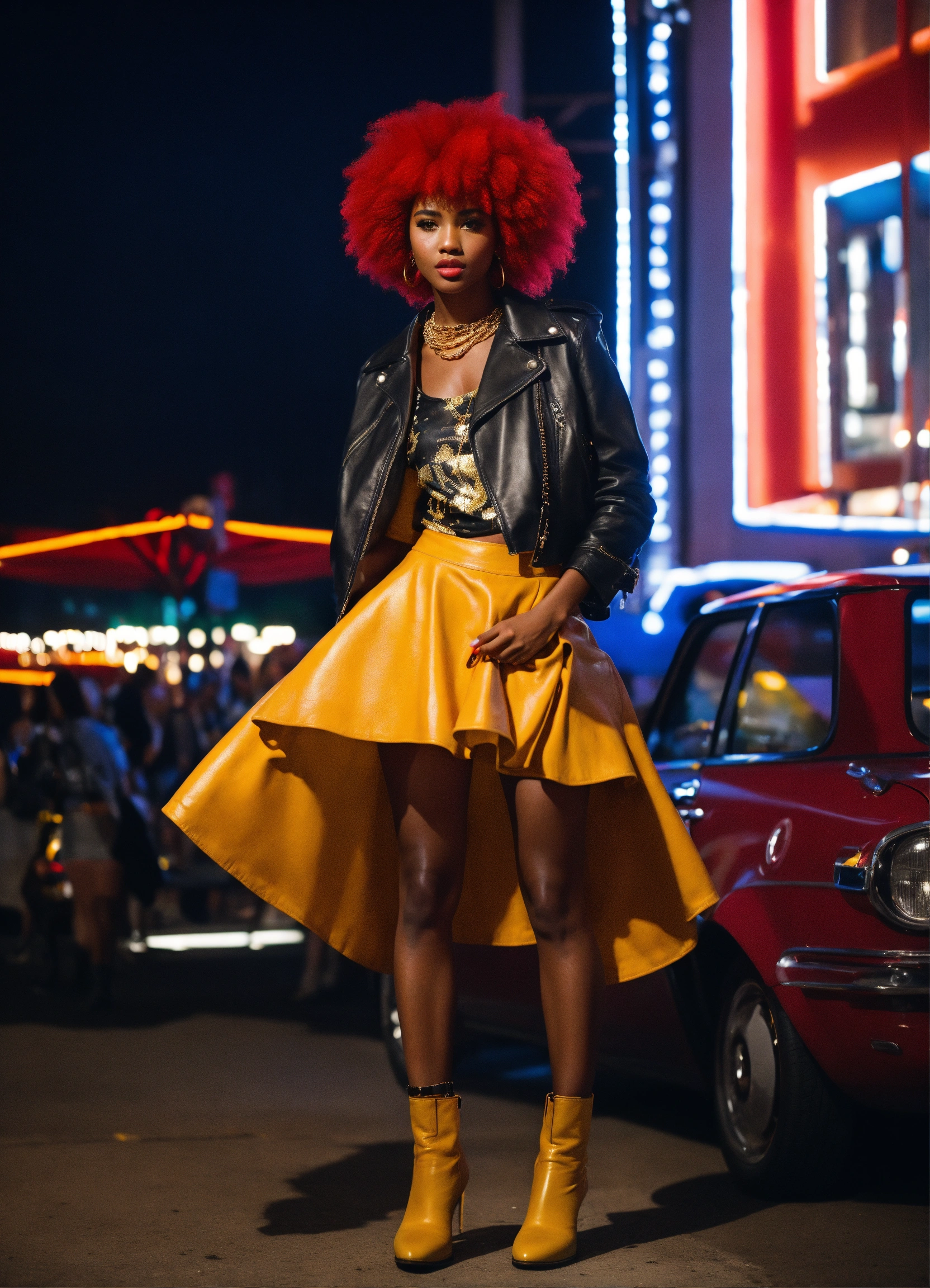 In the midst of the night, under dim parking lot lights outside a vibrant party, stands a striking light-skinned girl. her fashion radiates forward-thinking style, showcasing a daring ensemble. a fiery red mini skirt and a white ripped tank top capture attention, accentuated by a small gold chain and a sleek leather jacket. completing the look, she dons tall black leather boots with vibrant yellow accents. her standout feature, a bold orange afro, adds a splash of exuberance, and a beauty mark graces her left cheek. this captivating moment, captured in a vintage film camera style, embodies a blend of contemporary fashion and timeless flair.