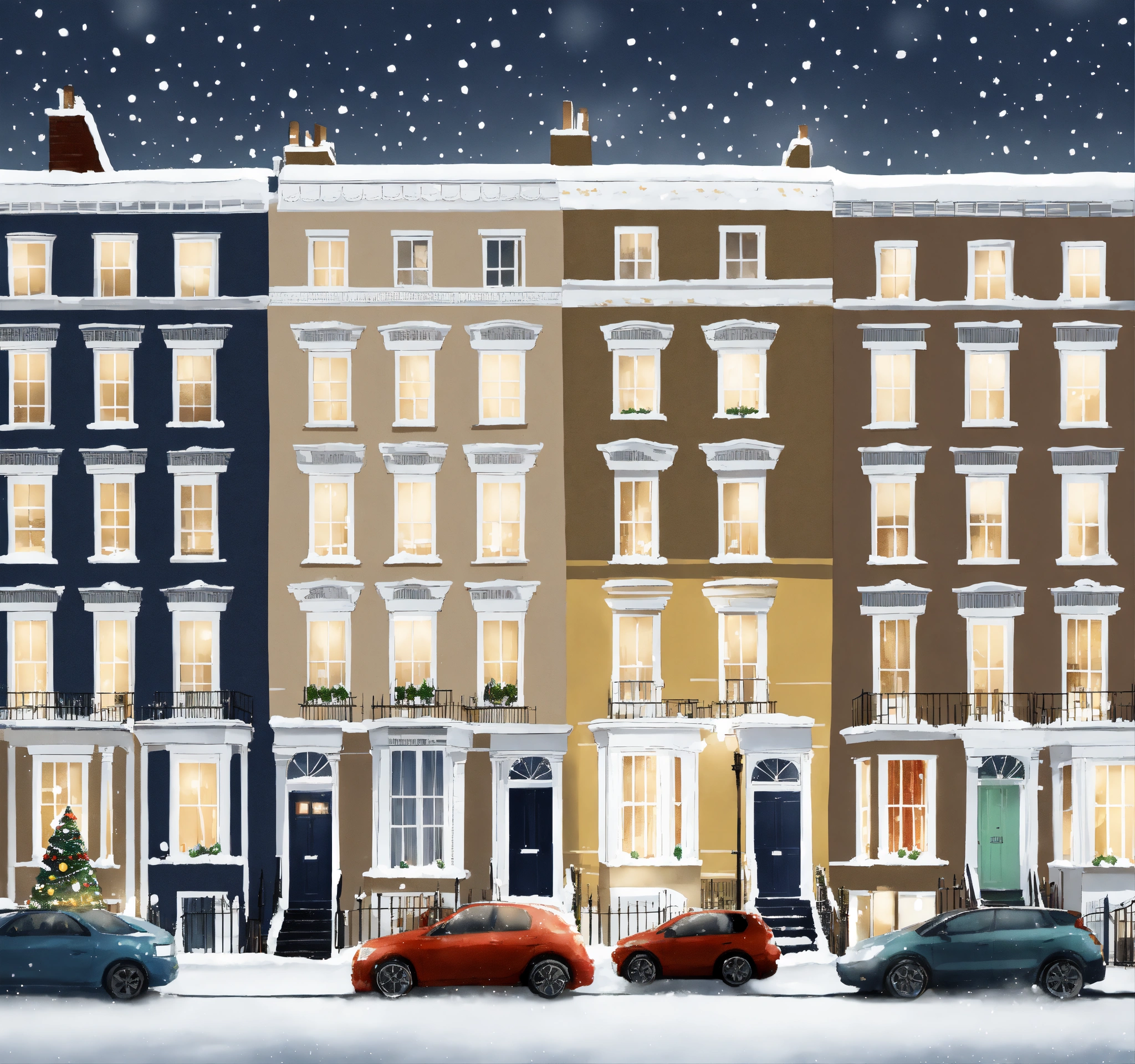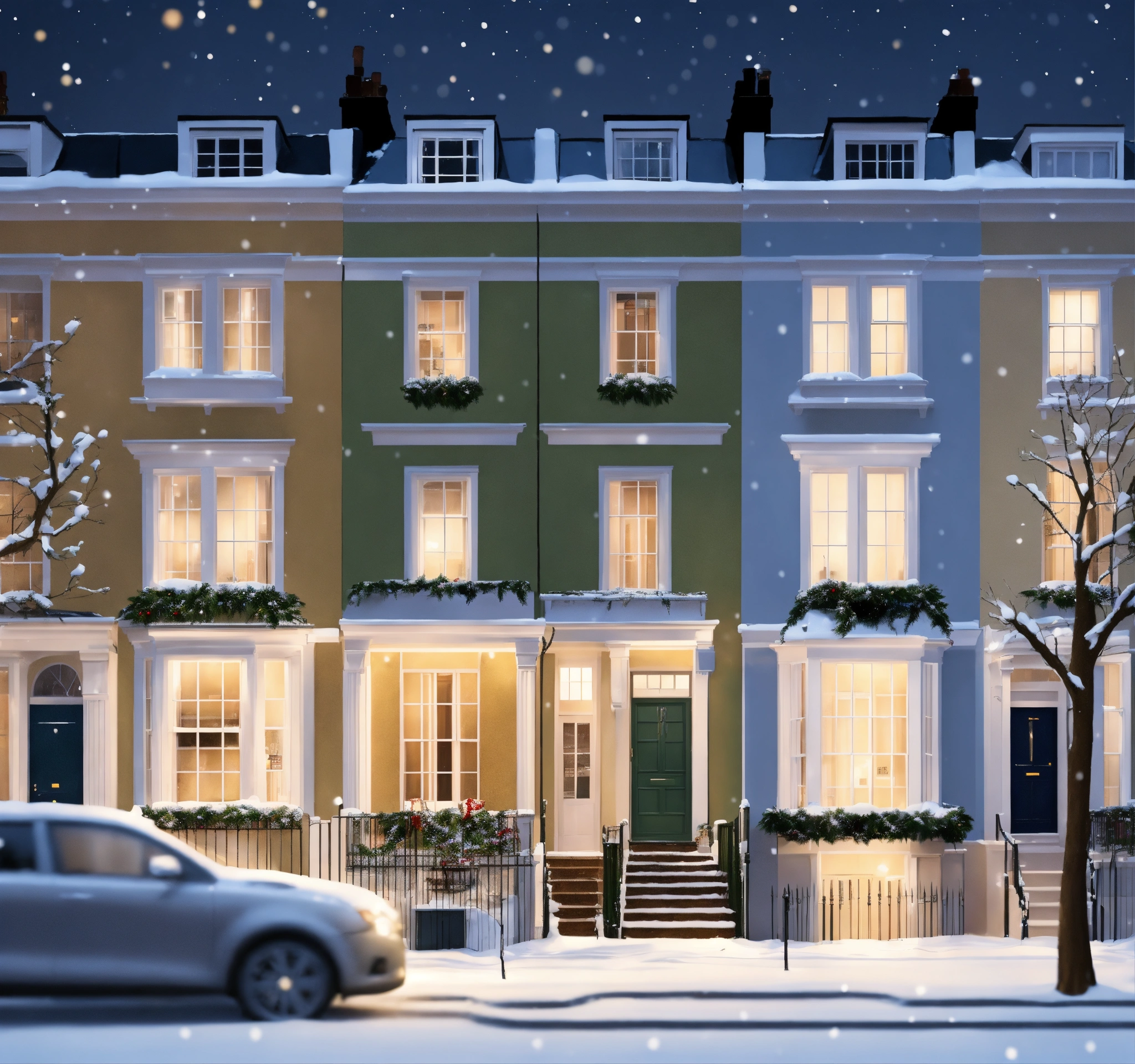 Realistic illustration of five houses on a notting hill type street in light colors on a snowy christmas night. all the houses look complete. no cars. there is bokeh. all the houses are seen from the front, and completever detalles