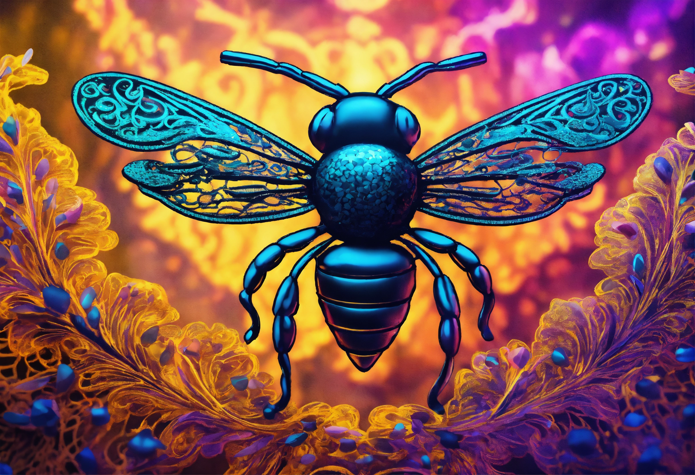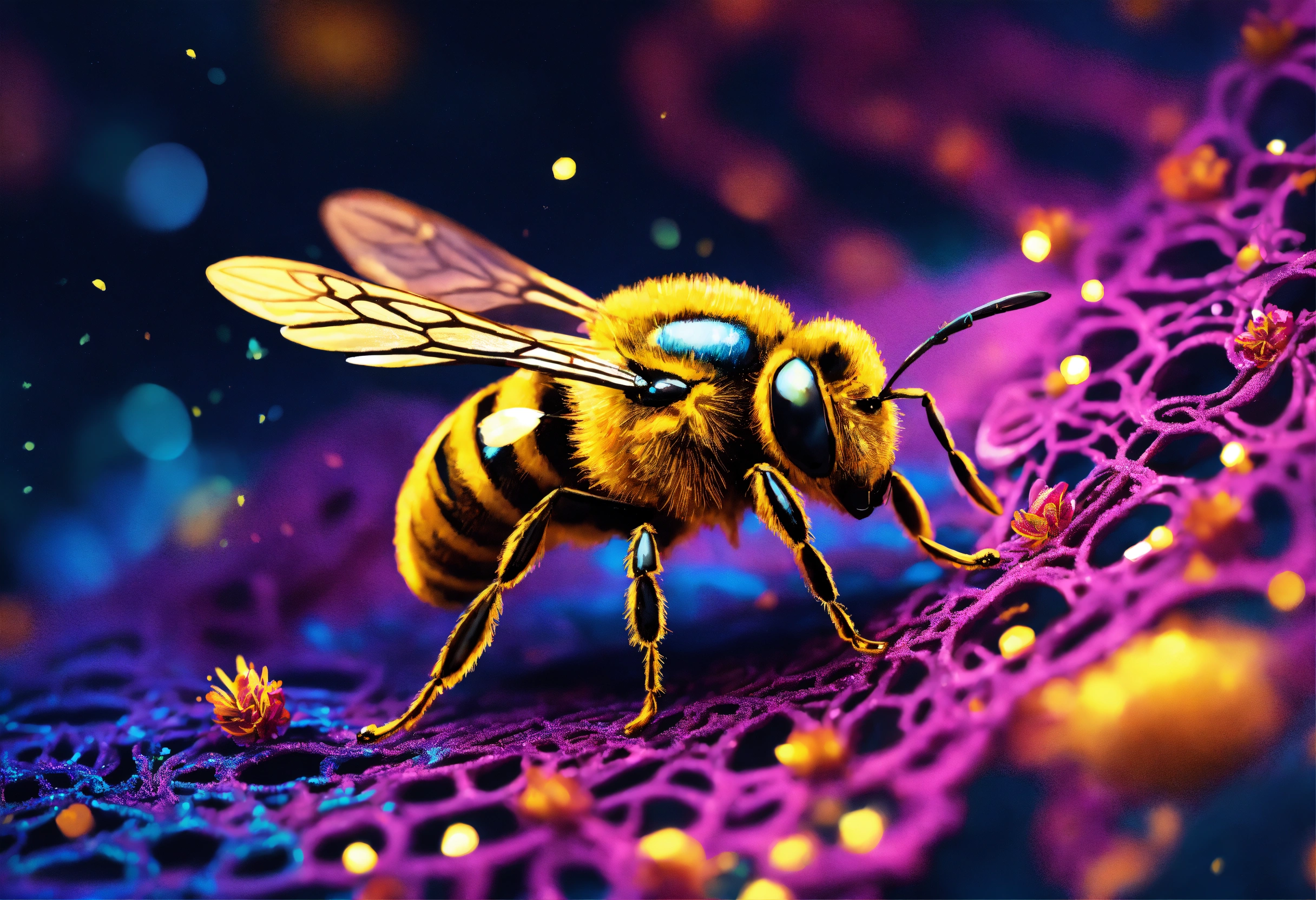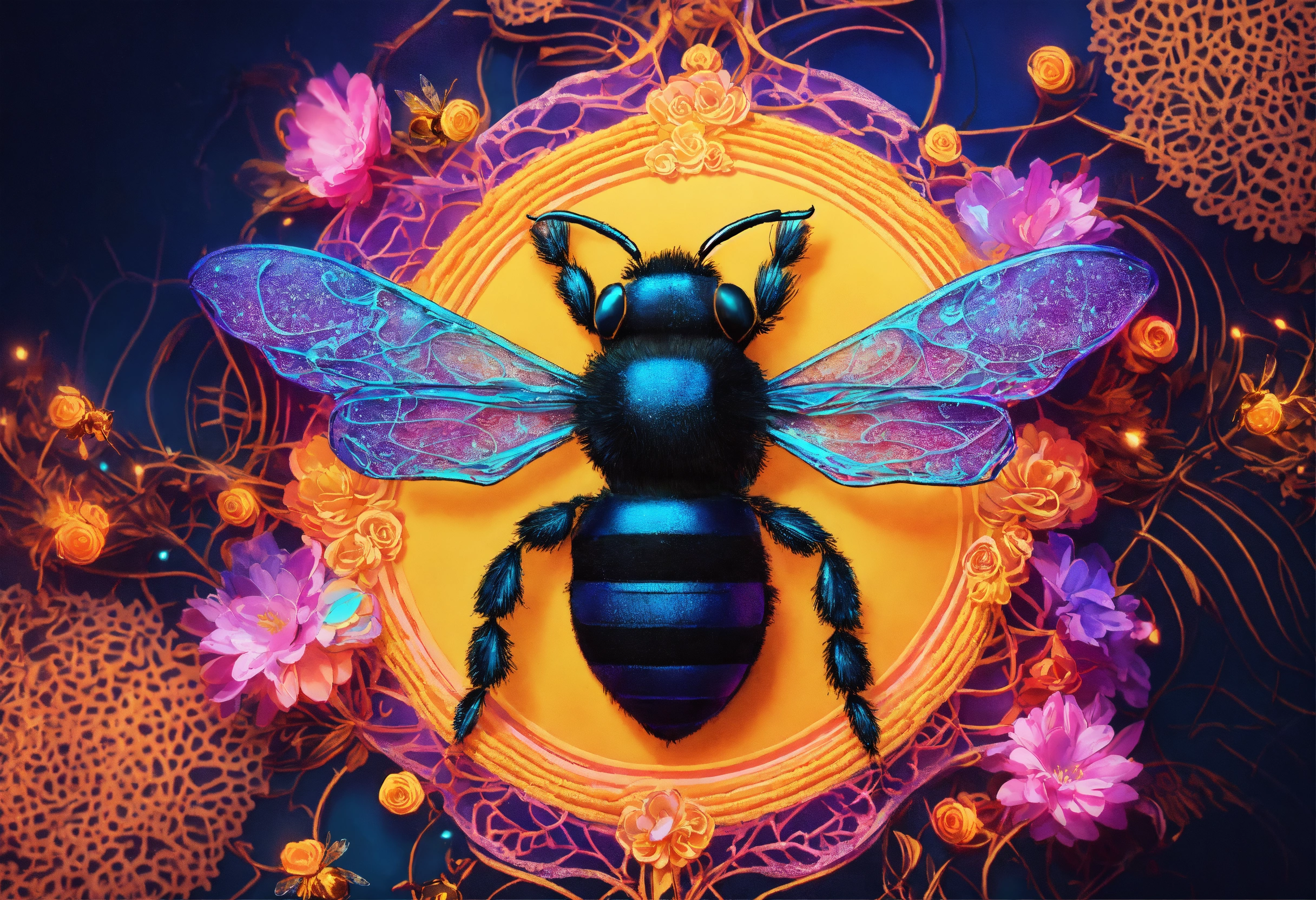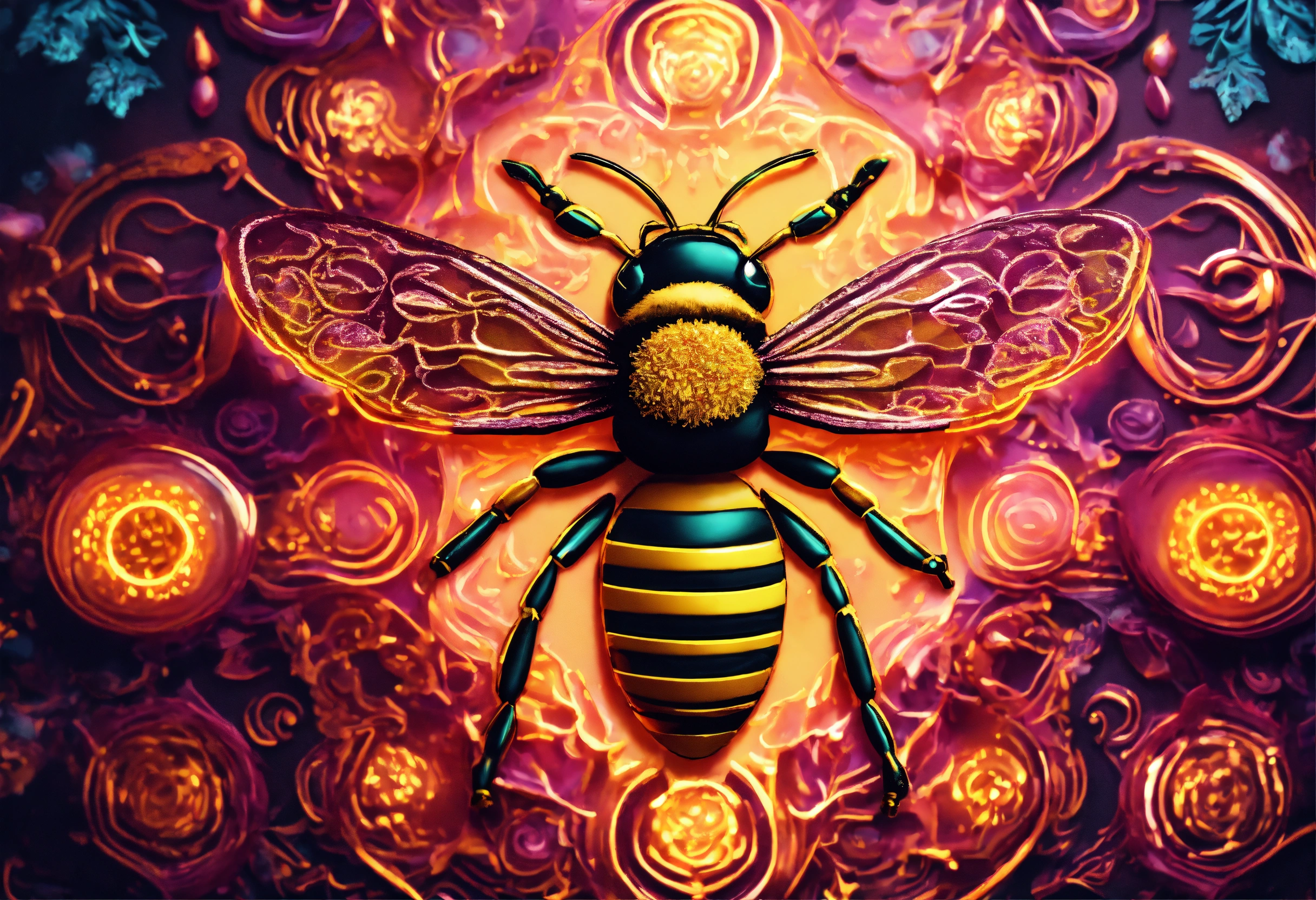 Sharp focus realistic illustration swirly lace decorative background with realistic bee swirling around glowing neon tones detailed, 16k, hyper realistic, intricate detail, illustration, glitter