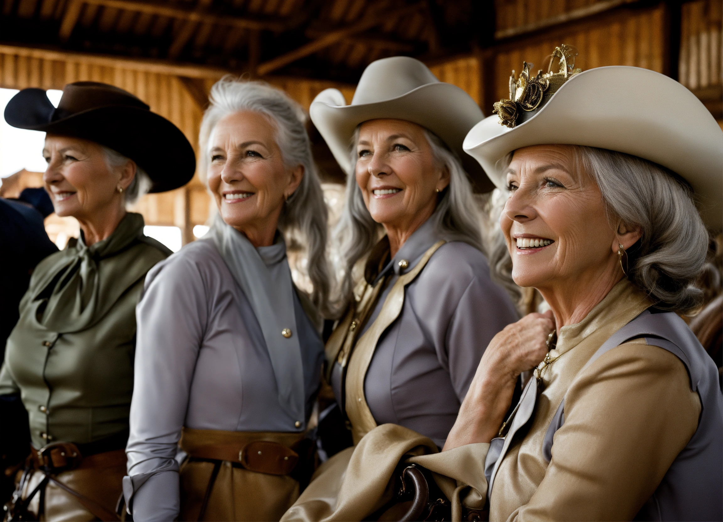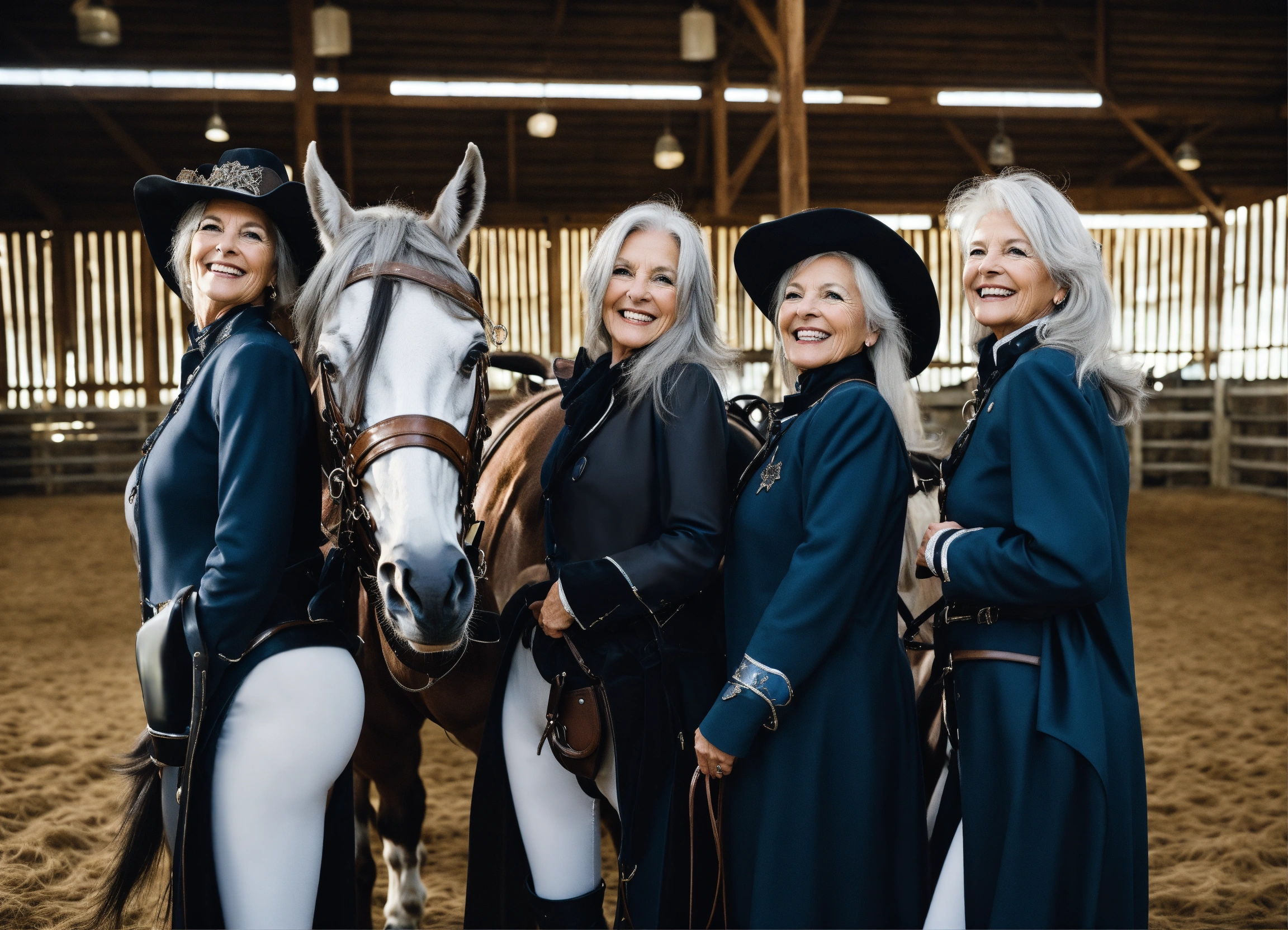 Group of chic older women, 65, female, long flowing gray hair, shiny rubber equestrienne costumes, standing, from a low angle, mischievous grins, elegant horse barn, low angle shot looking up at women as they look down at us, carrying a saddle