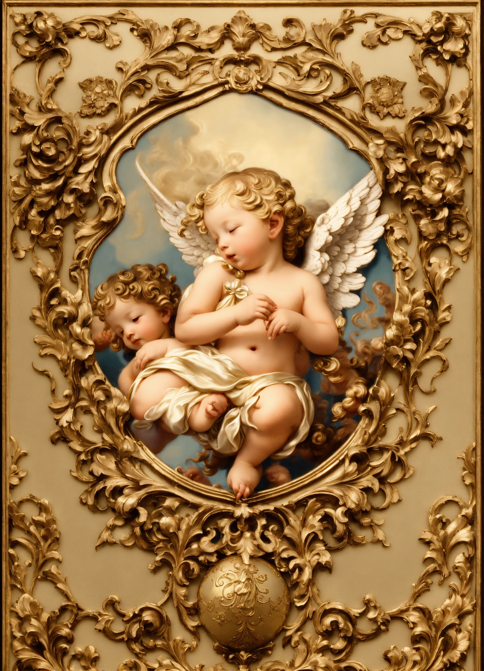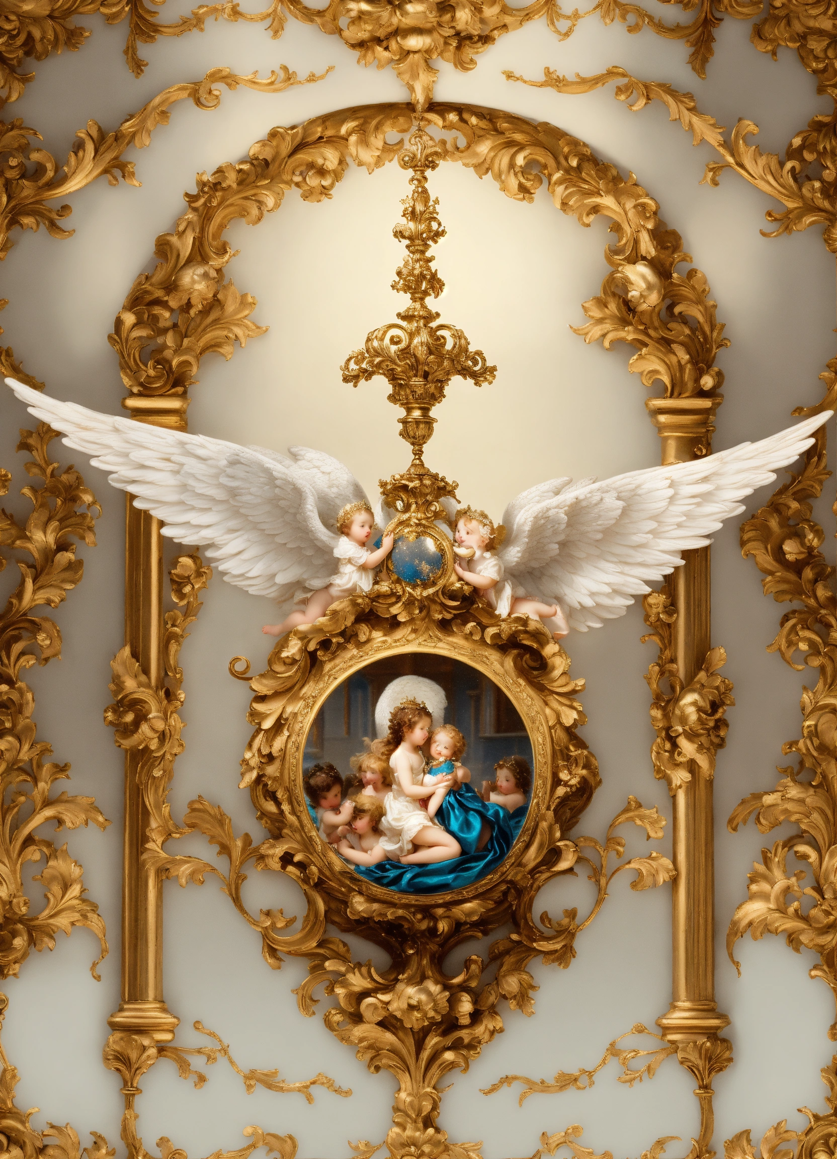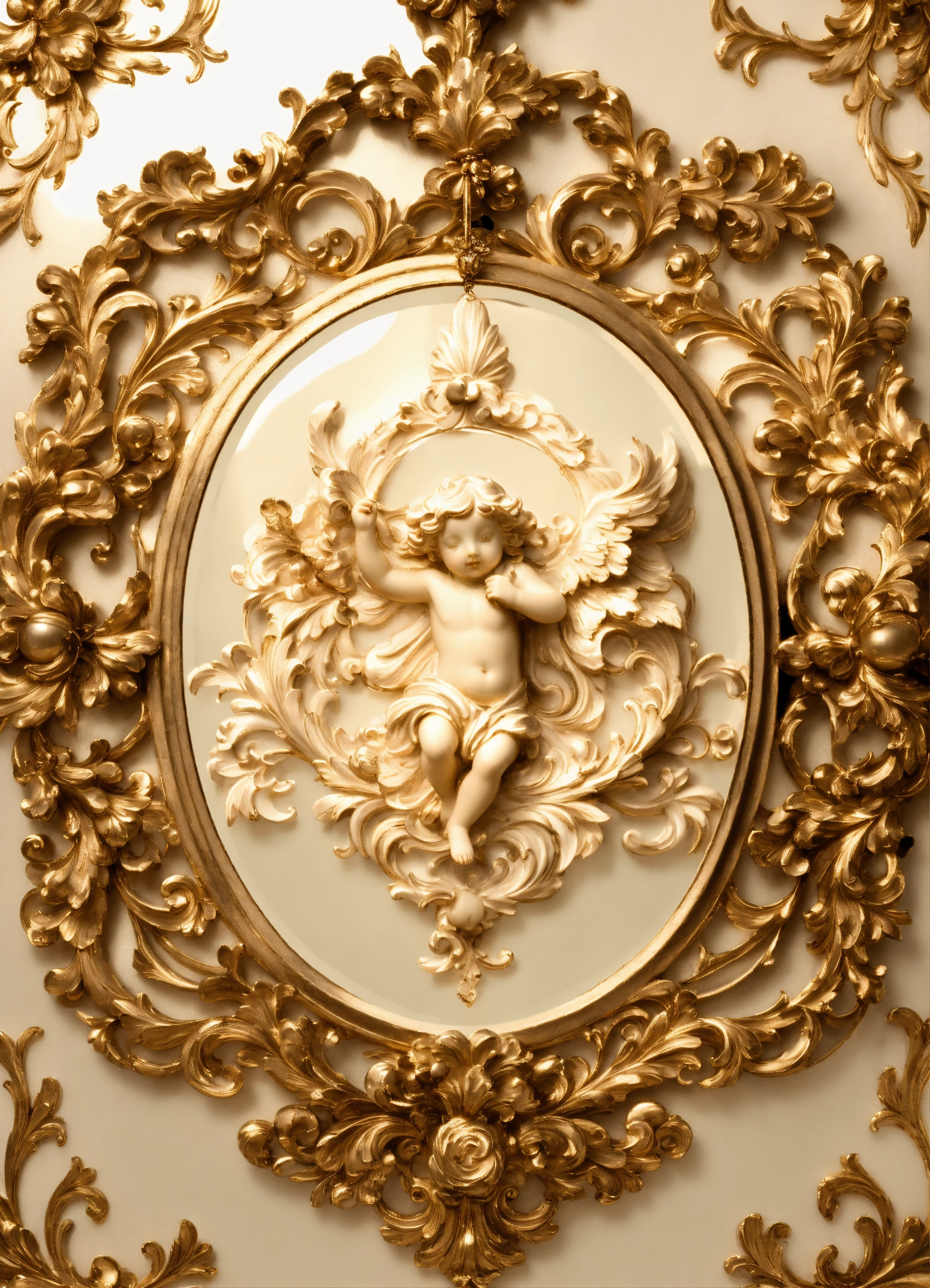 Logo is bold, mirrored, baroque, versailles, rococo style. i’d like the calligraphy of this logo to be ornate, and match the design, pearlescent satin glittering ivory white background. angel cherubs flying around the norman style spires, beautiful, di como designs limited, christmas ornament