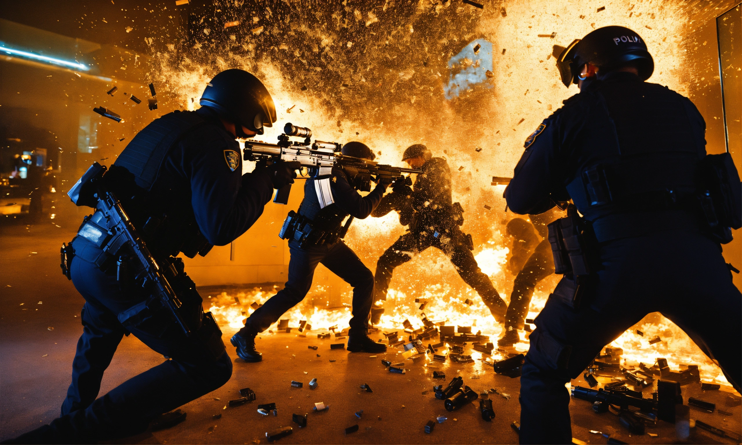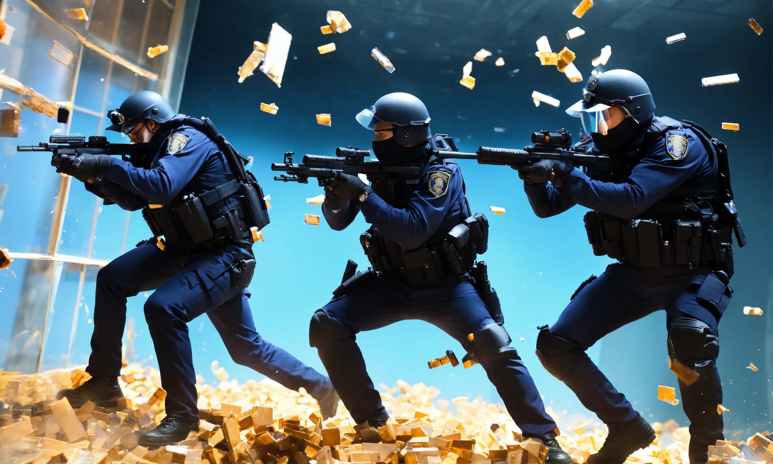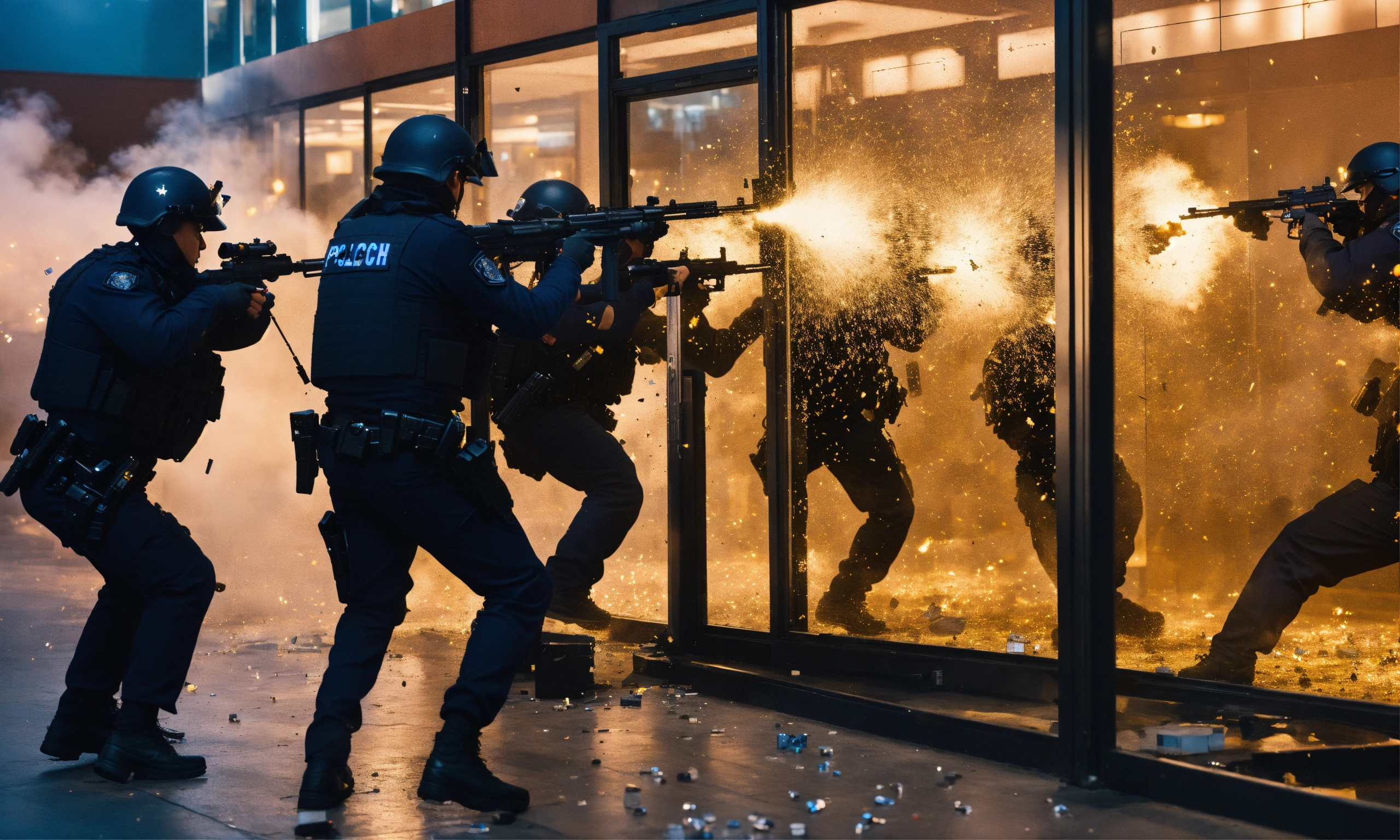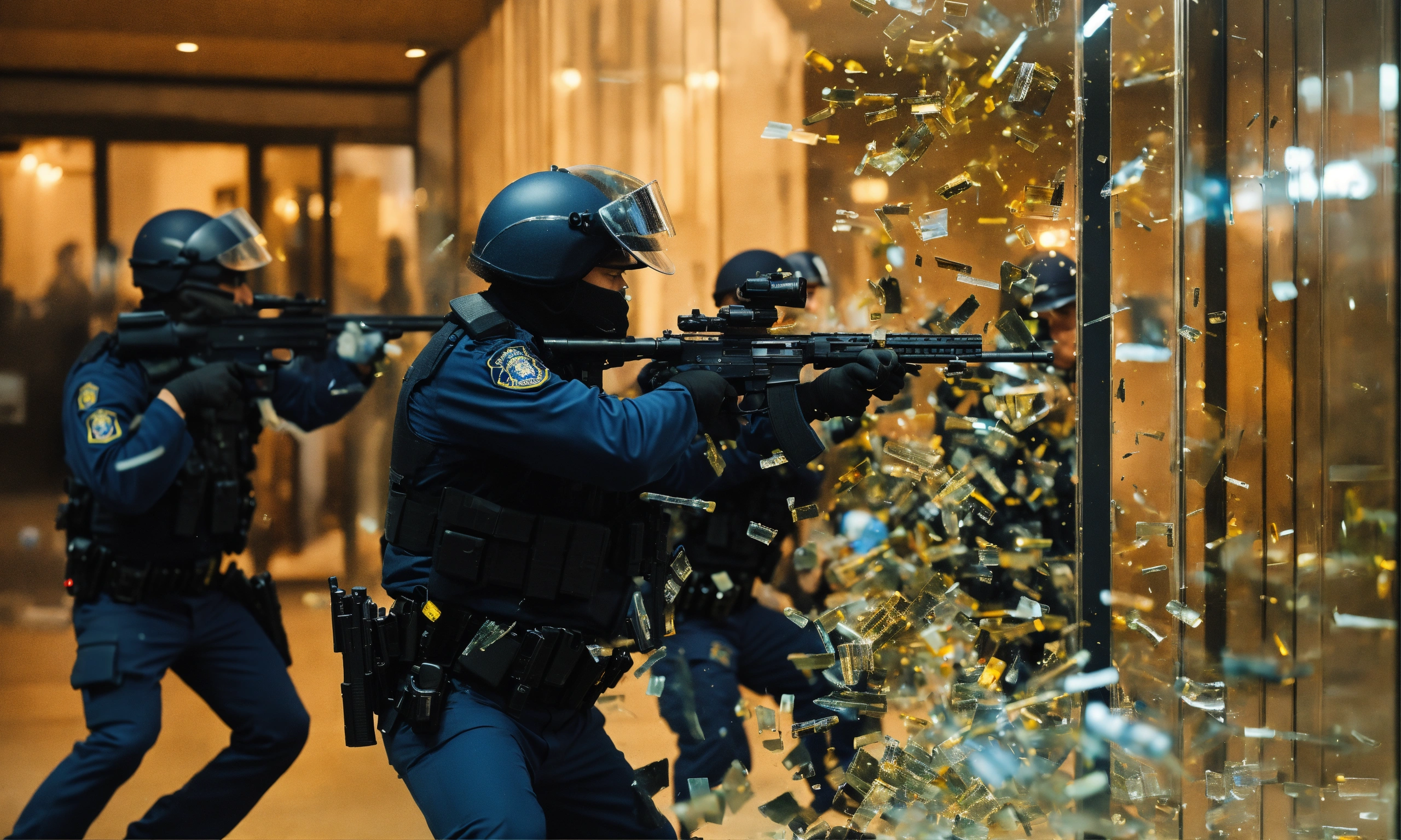A group of policeman armed of guns are shooting trough a glass wich breaks into a lot of pieces