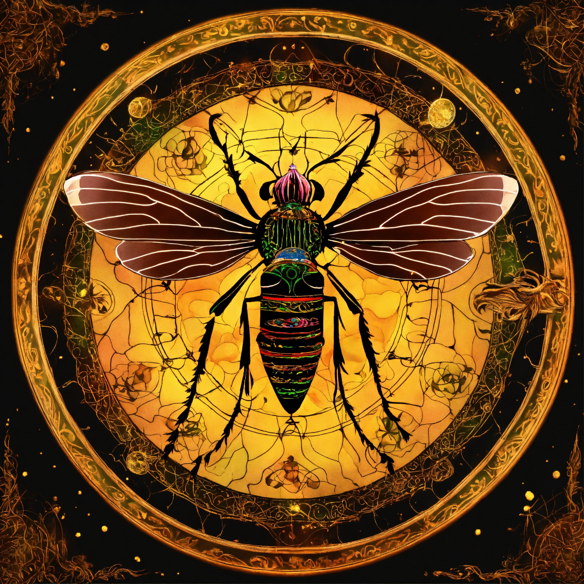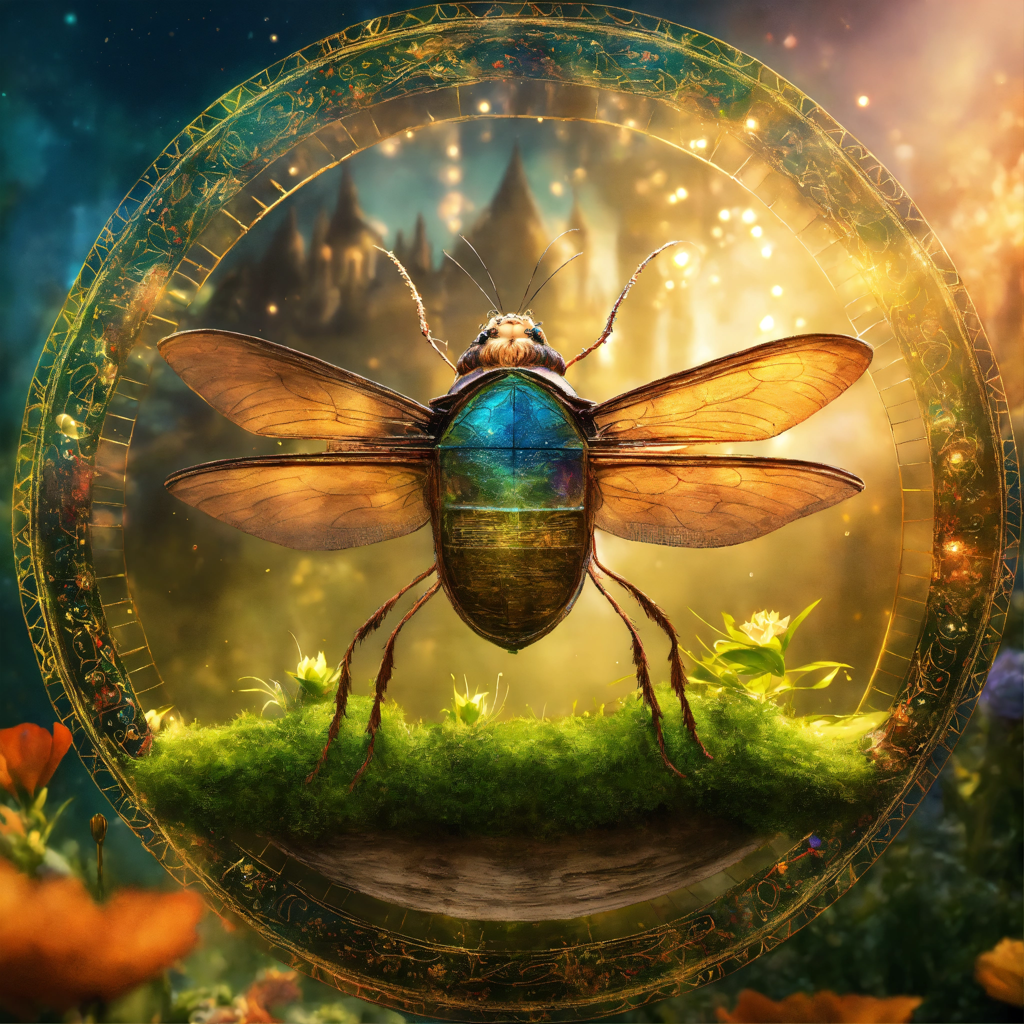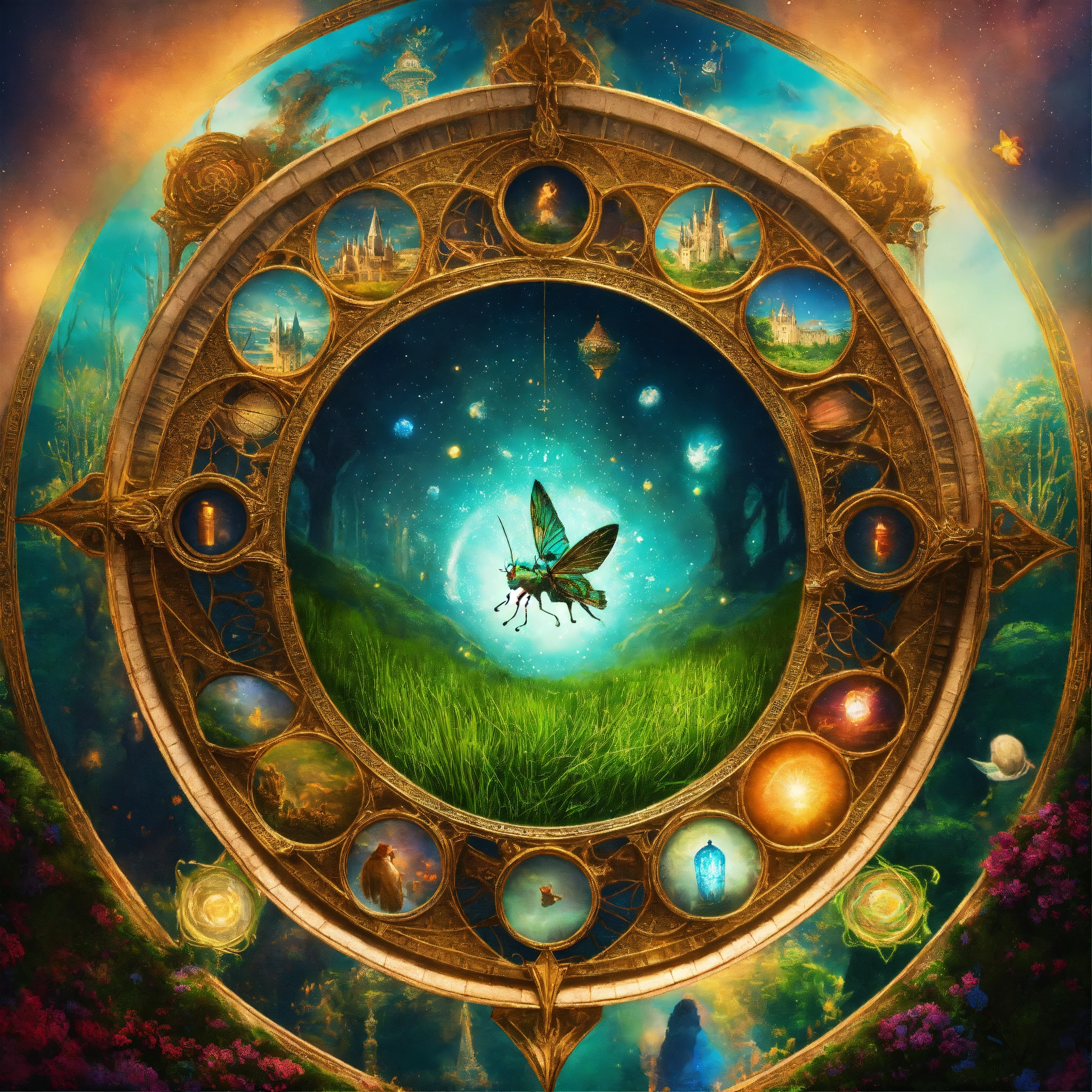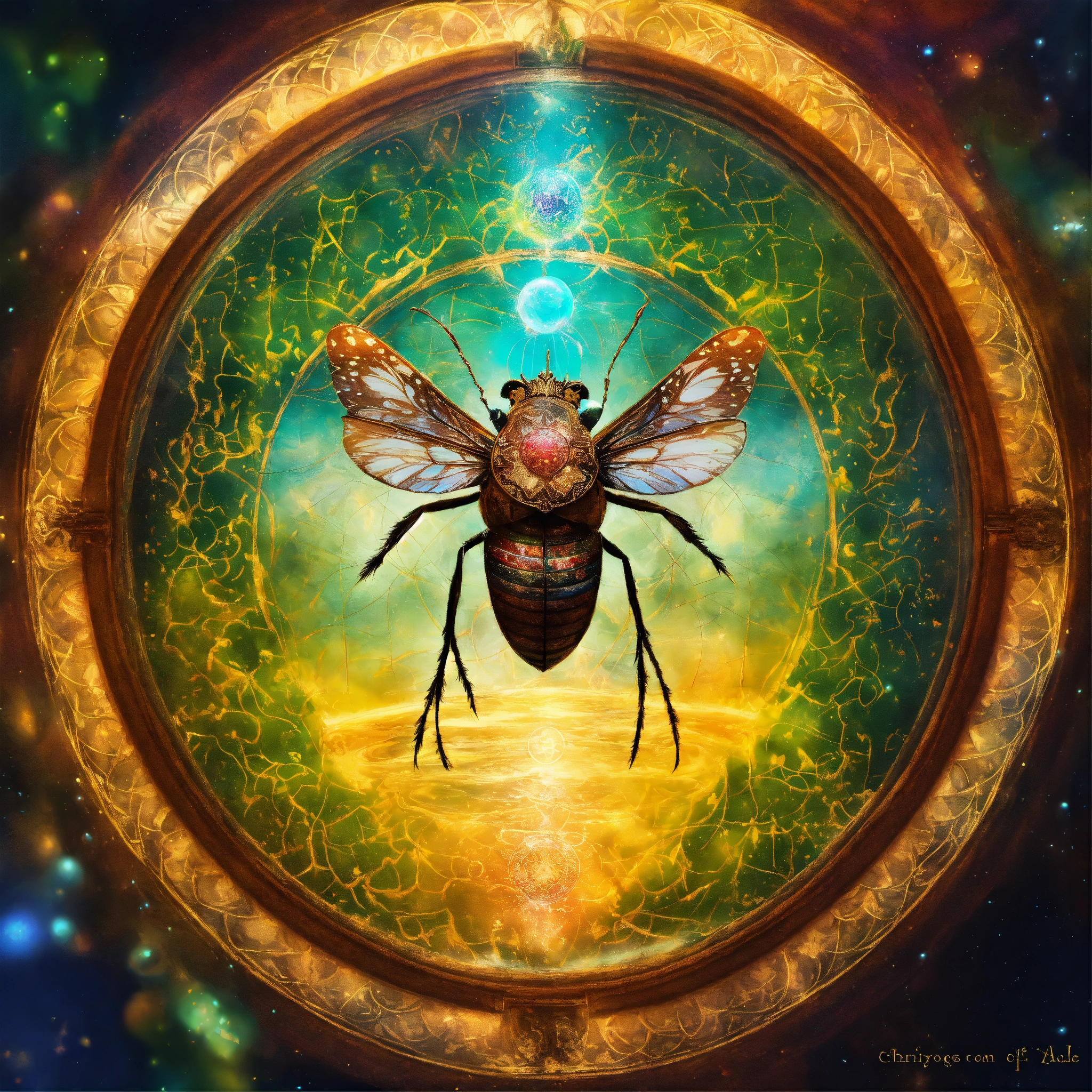 Underwater long exposure photography, a giant grass hopper flying in a mandala in the cosmos in the daytime with orbs and portals, x-ray style, in the style of tim burton, harry potter, game of thrones, lion king, the chronicles of narnia, beauty and the beast, and peter pan. with sacred geometric patterns on the body. enchanting aura. the chronicles of narnia, wizard of oz, and alice in wonderland, harry potter background