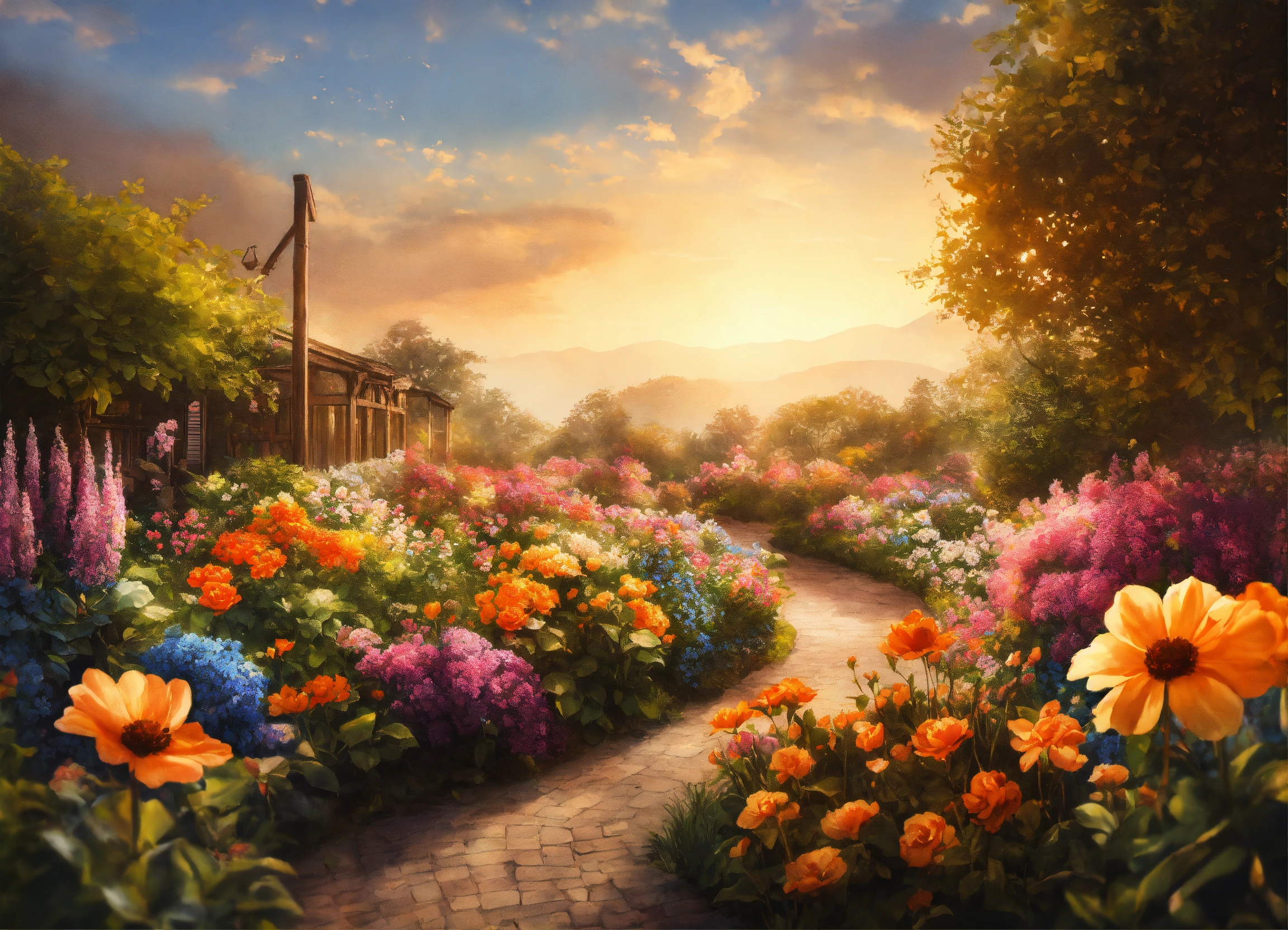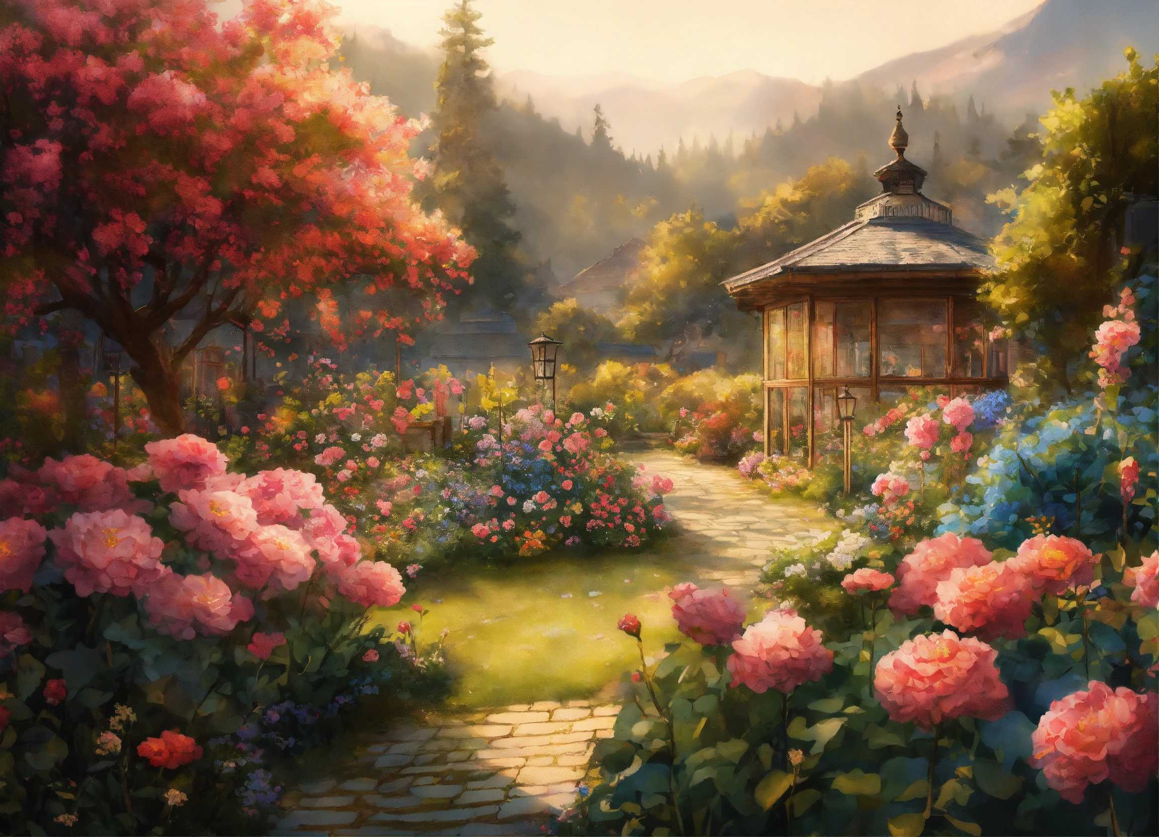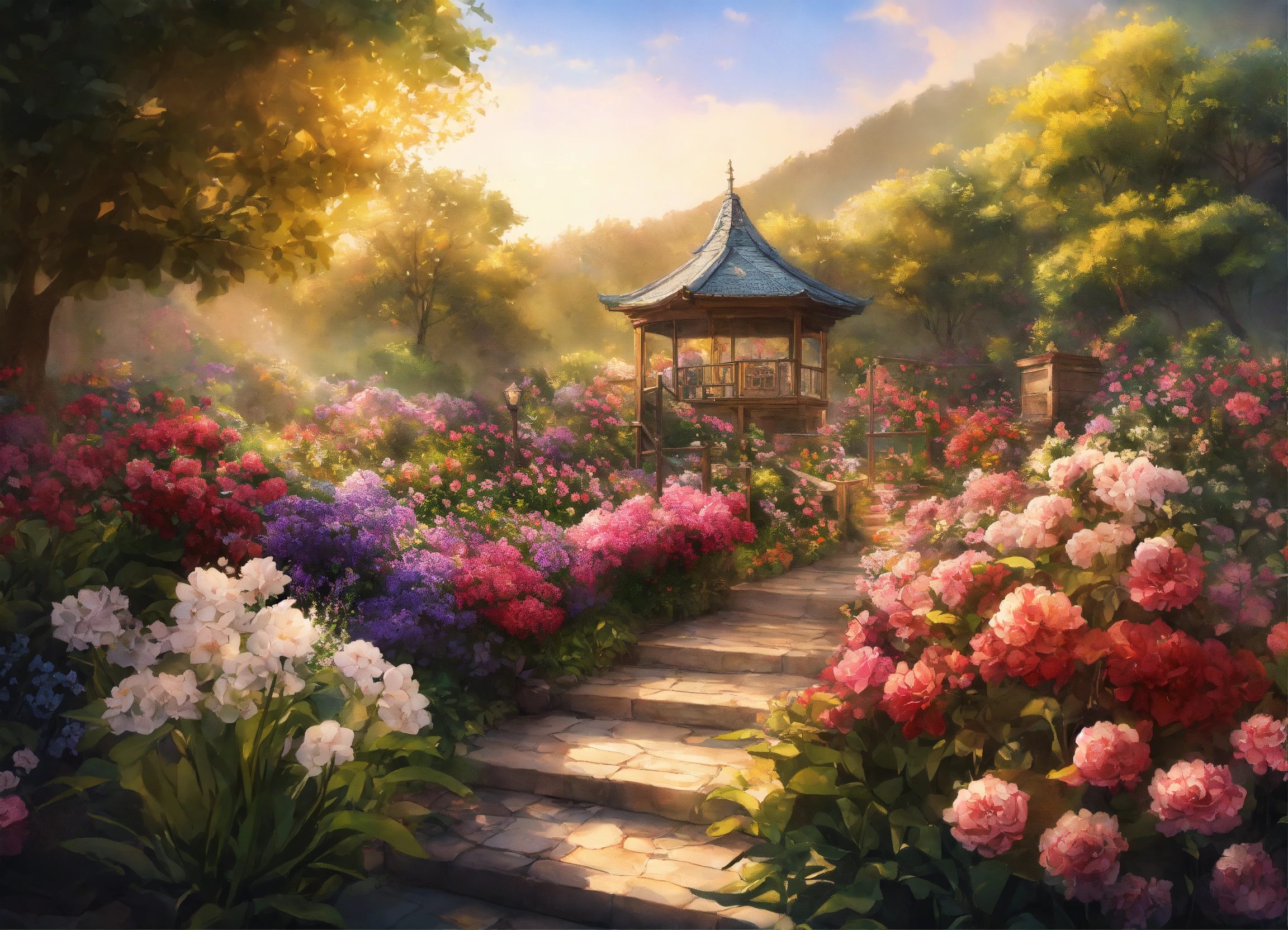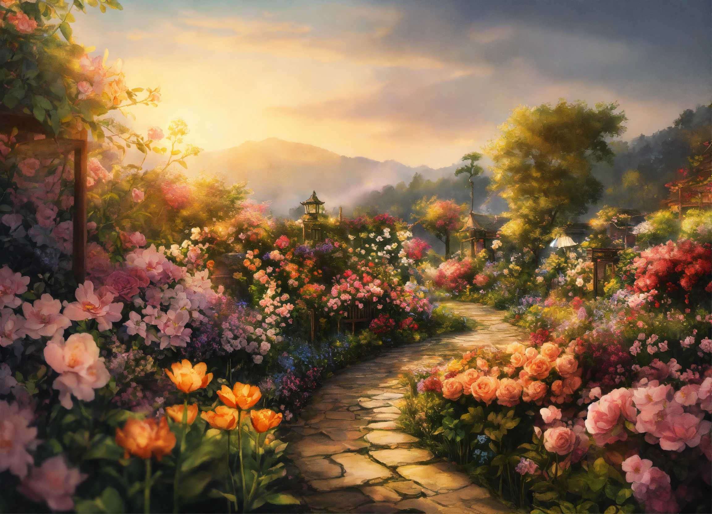Ink painting, beautiful flower garden, warm light, intricate and detailed, 8k, ultra-detailed, sharp focus