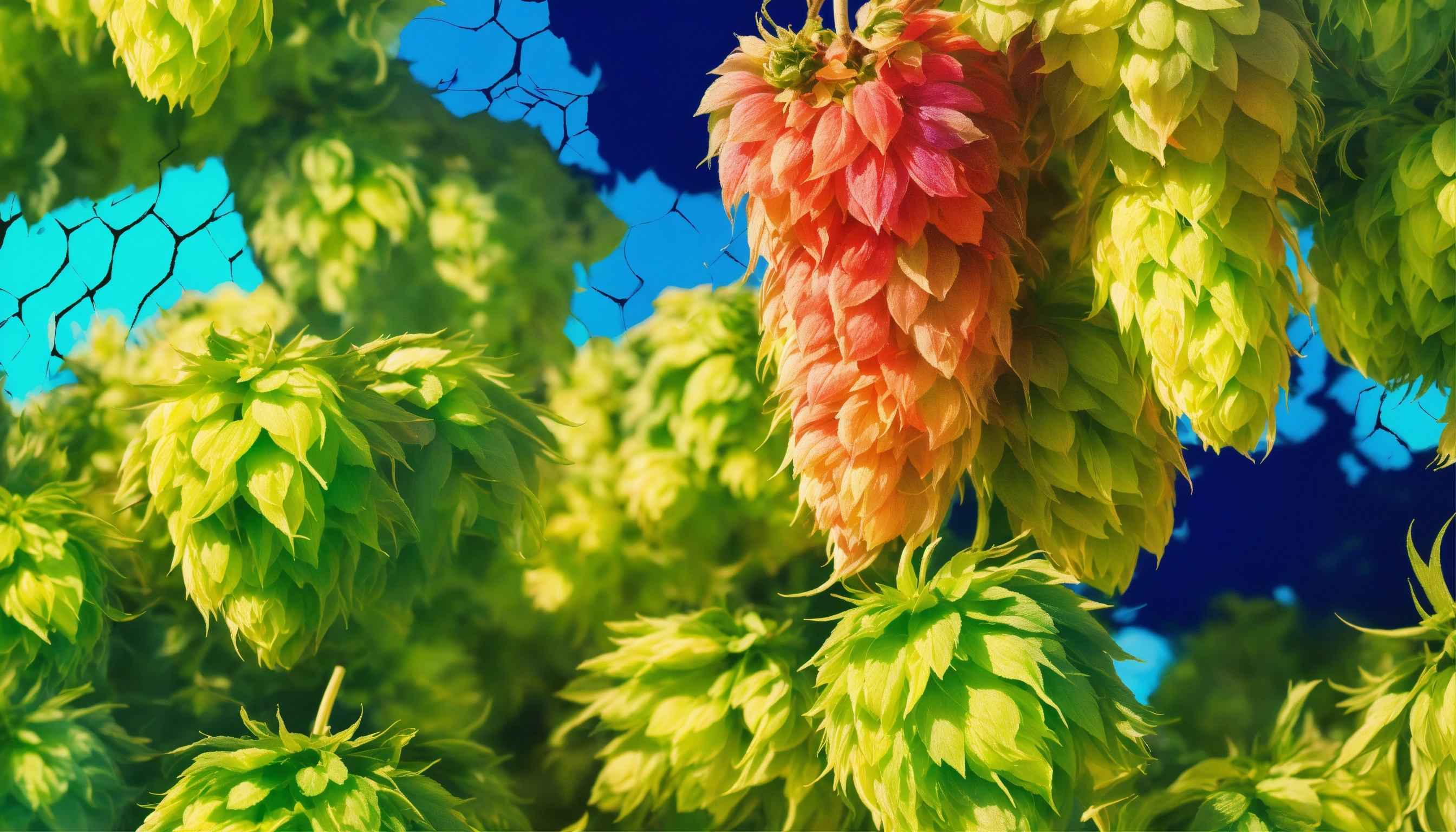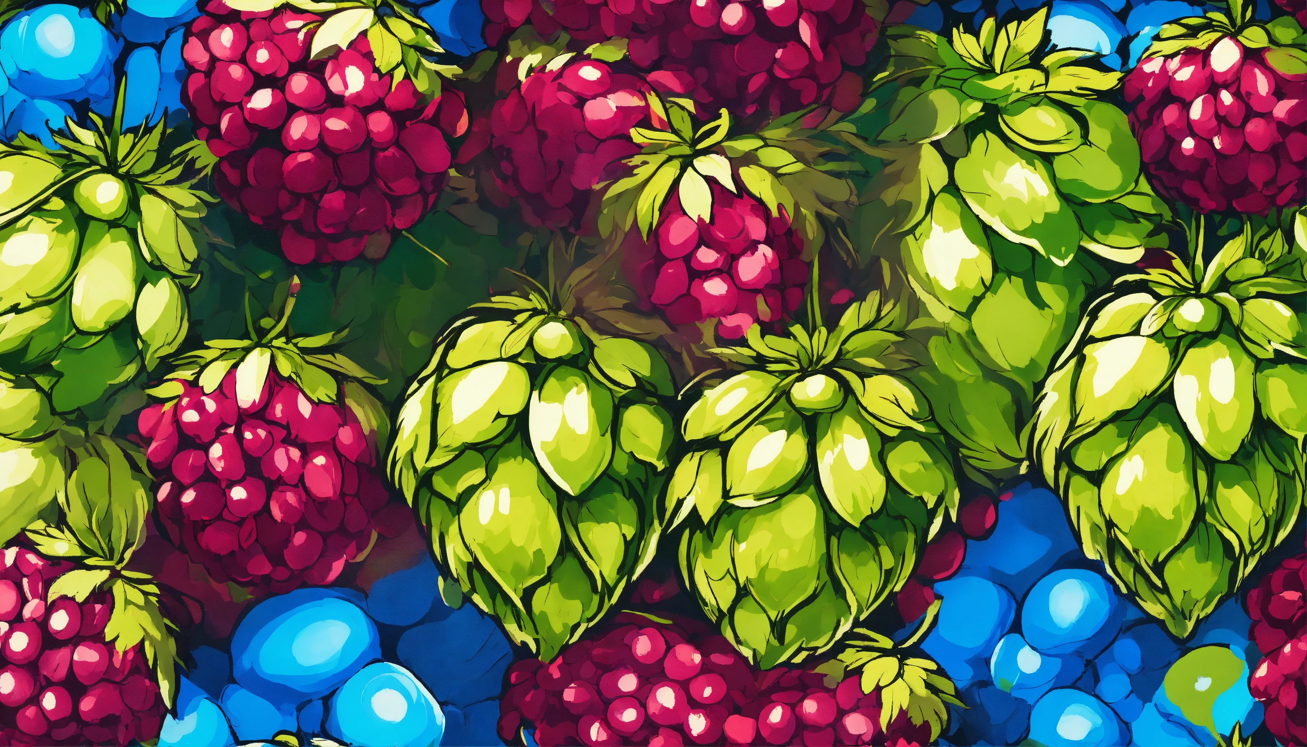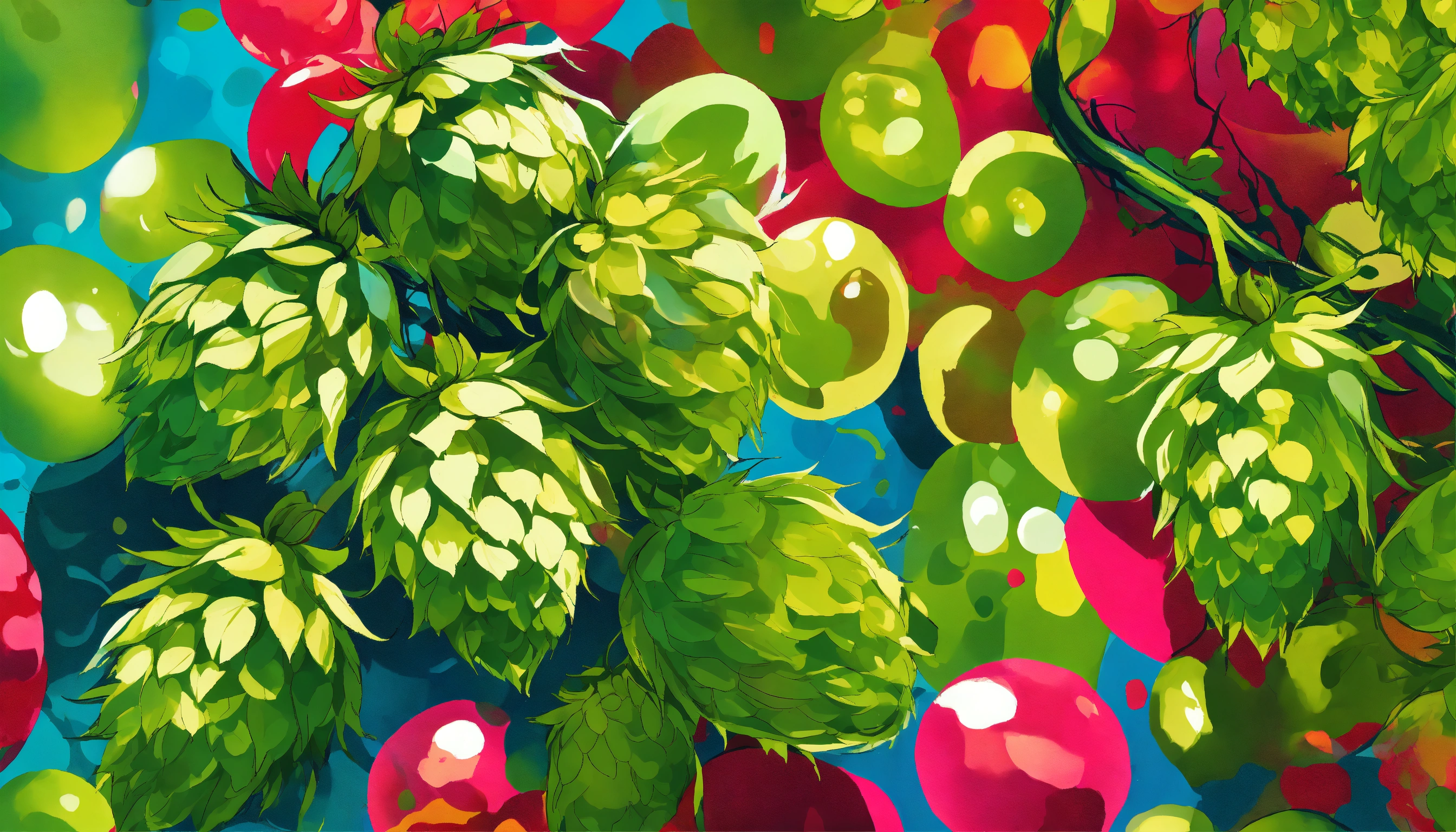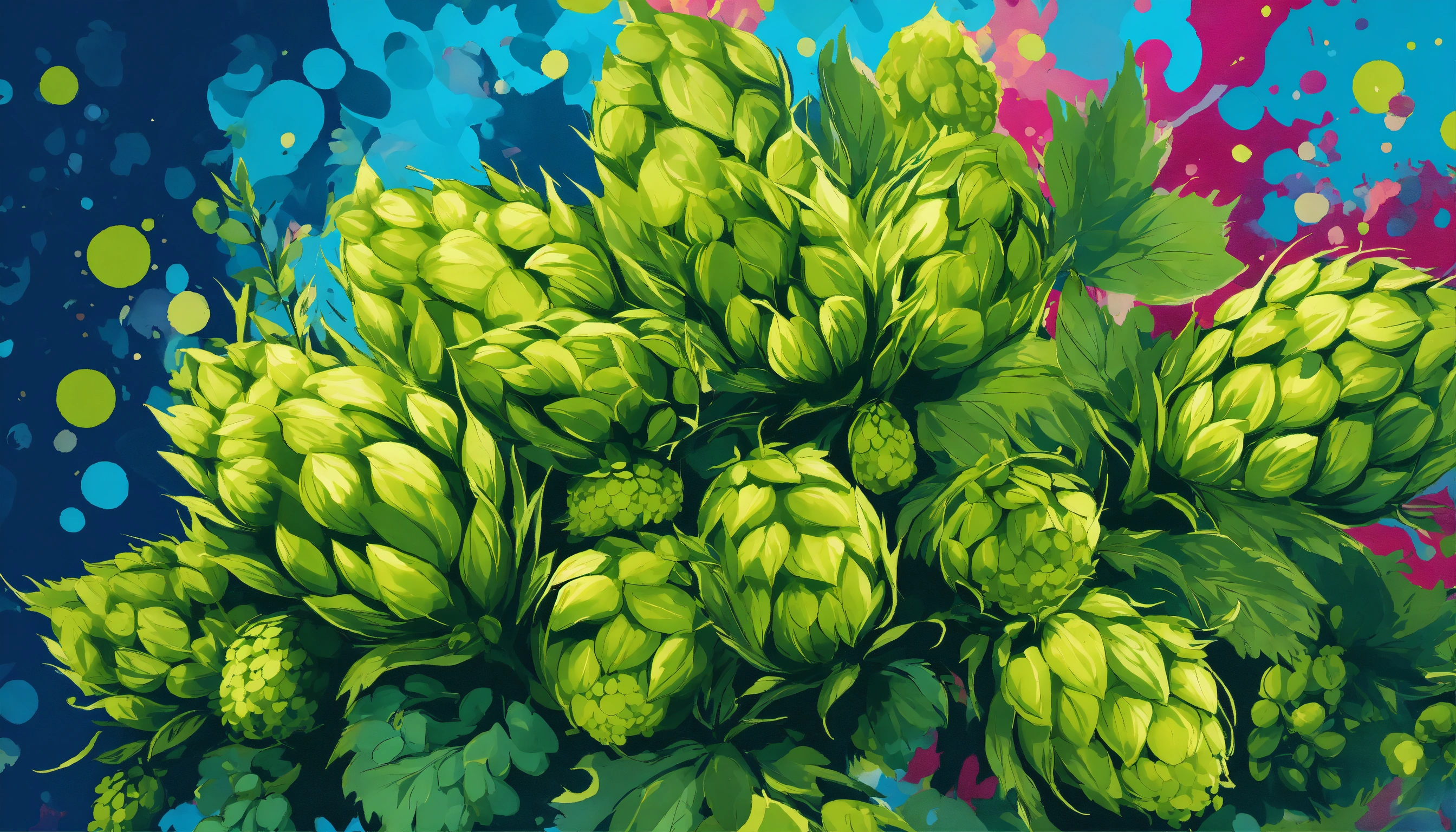 Composition of bunches of hops with an explosion of colored spots, generating a graphic pattern, range of colors from blue to green, with a pop art style, graffiti and handmade illustration with ink strokes, light and shadow, form and counterform
