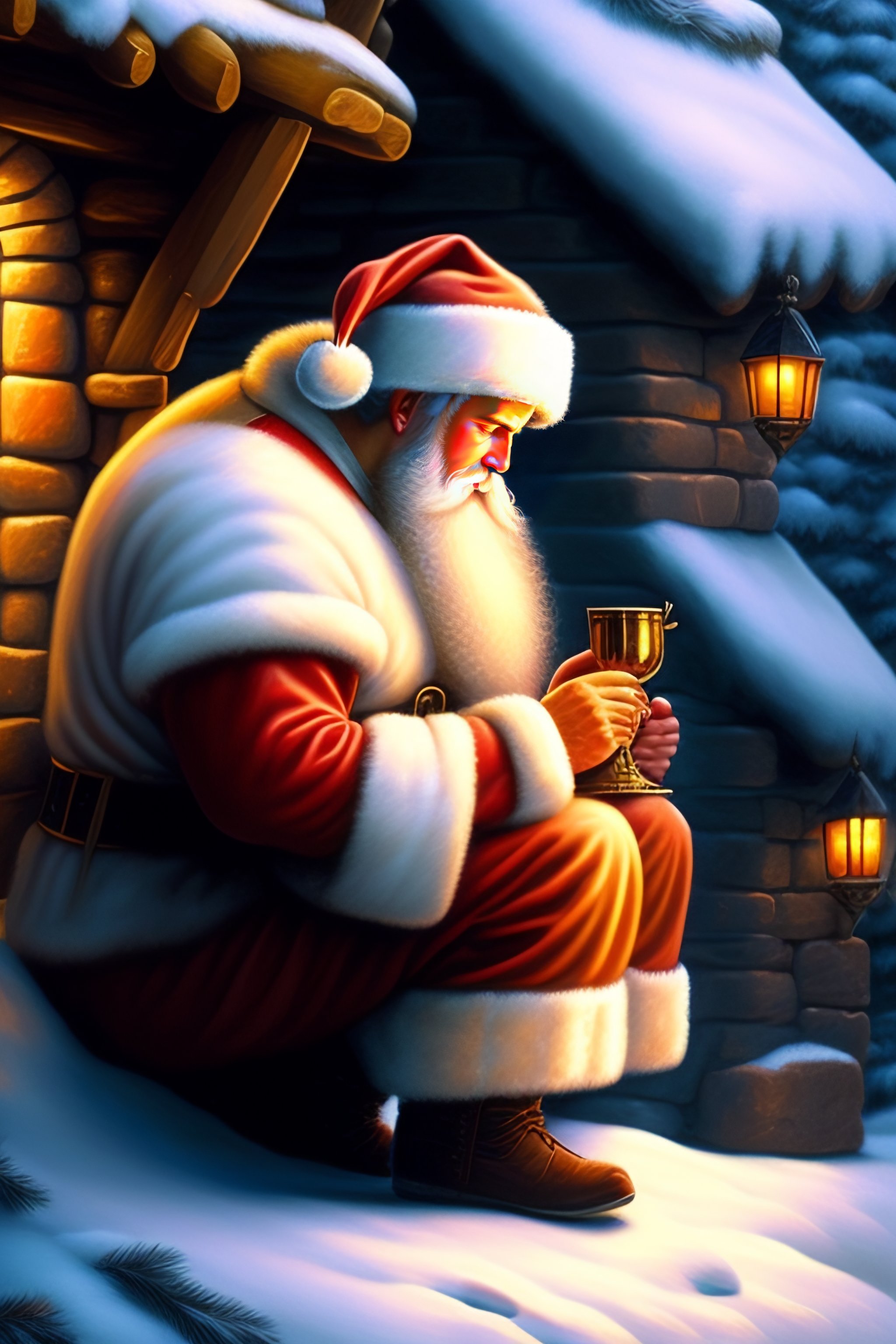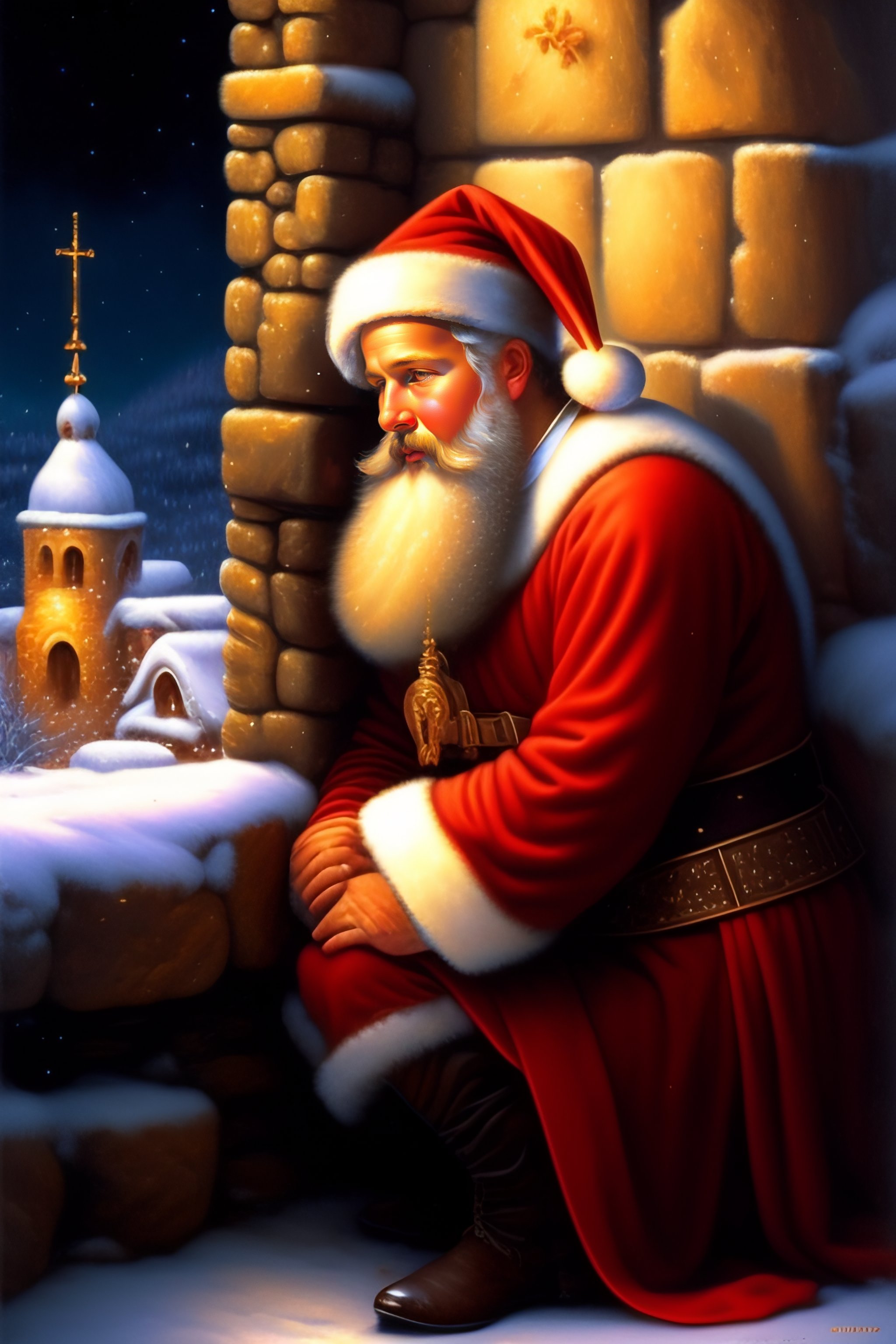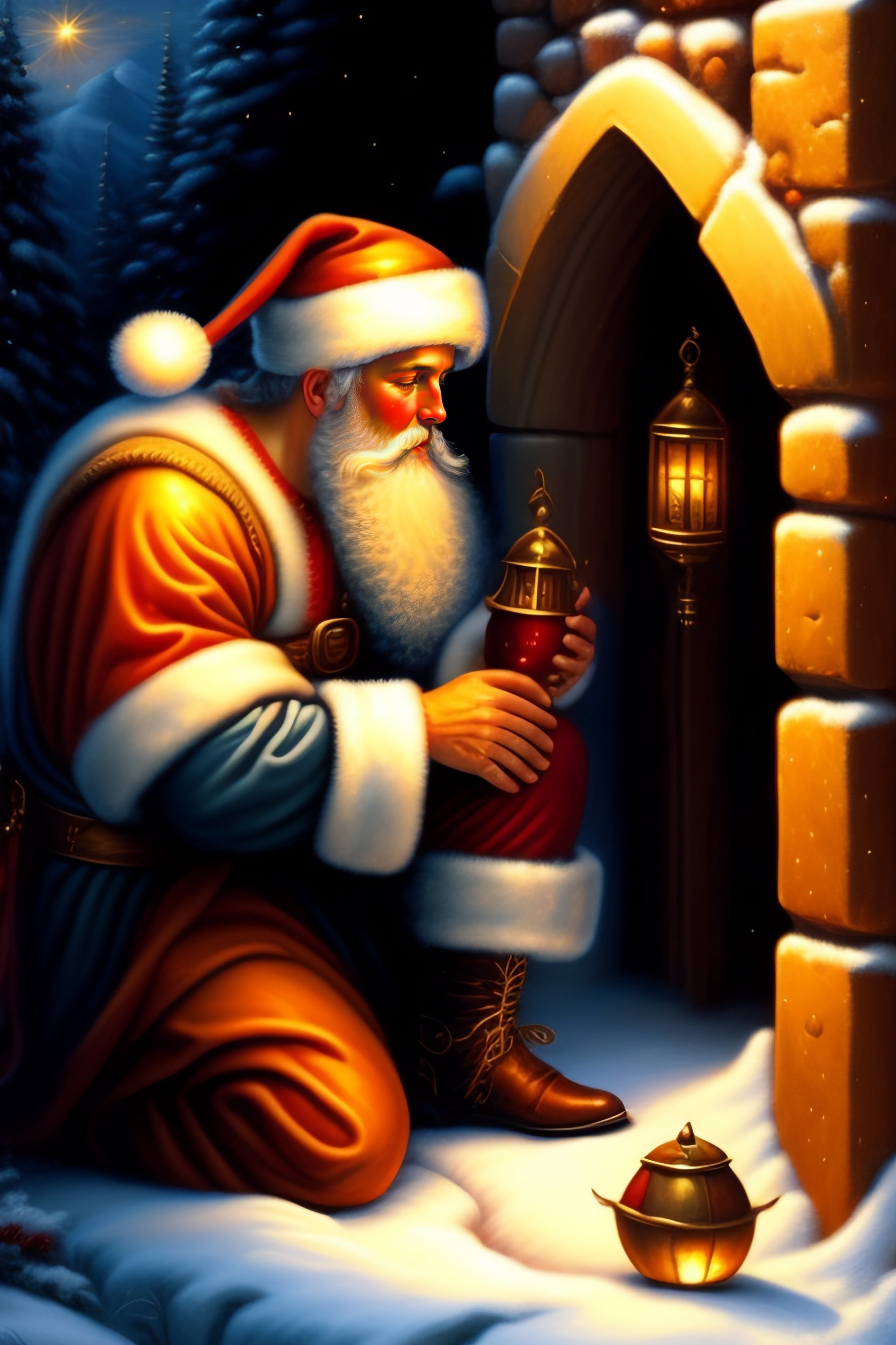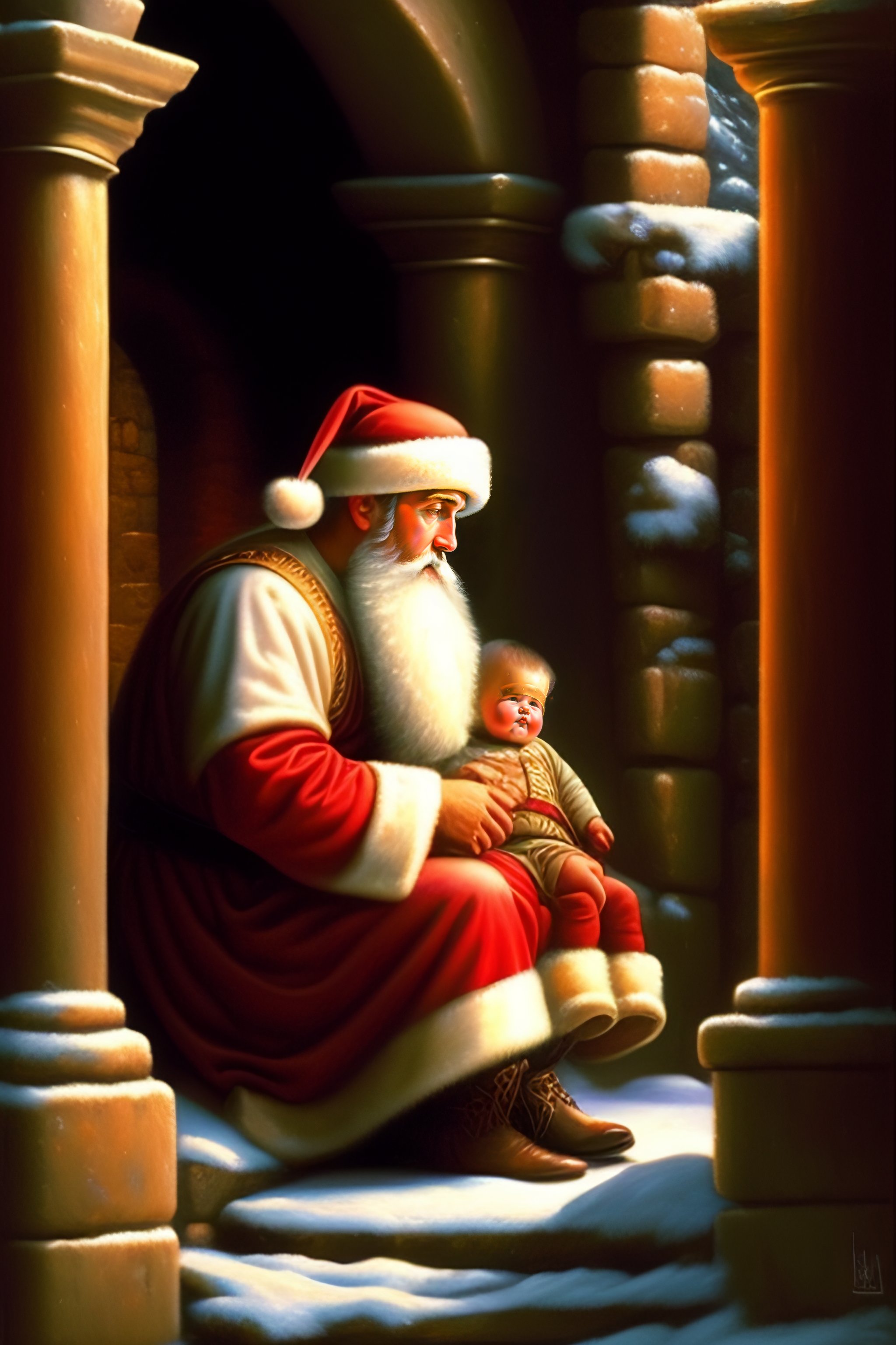 Santa kneeling by the manger of baby jesus in bethlehem, holding his cap, style of thomas kinkade, oil painting