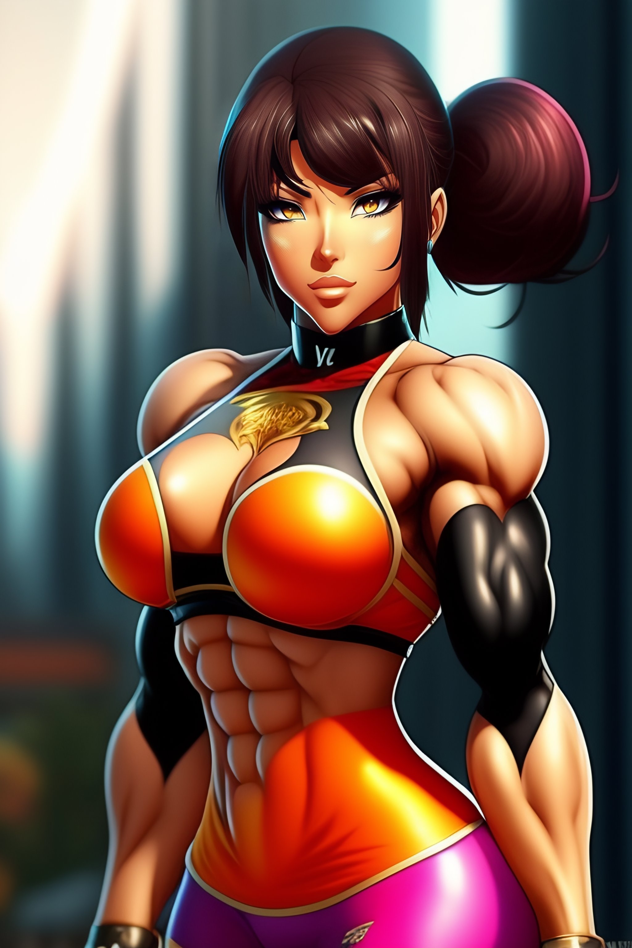 Muscular cartoon anime woman with large waist and huge legs in tight yoga pants:: ::black