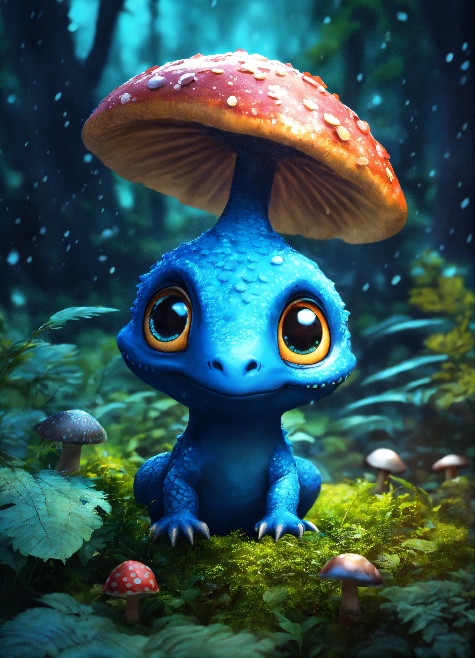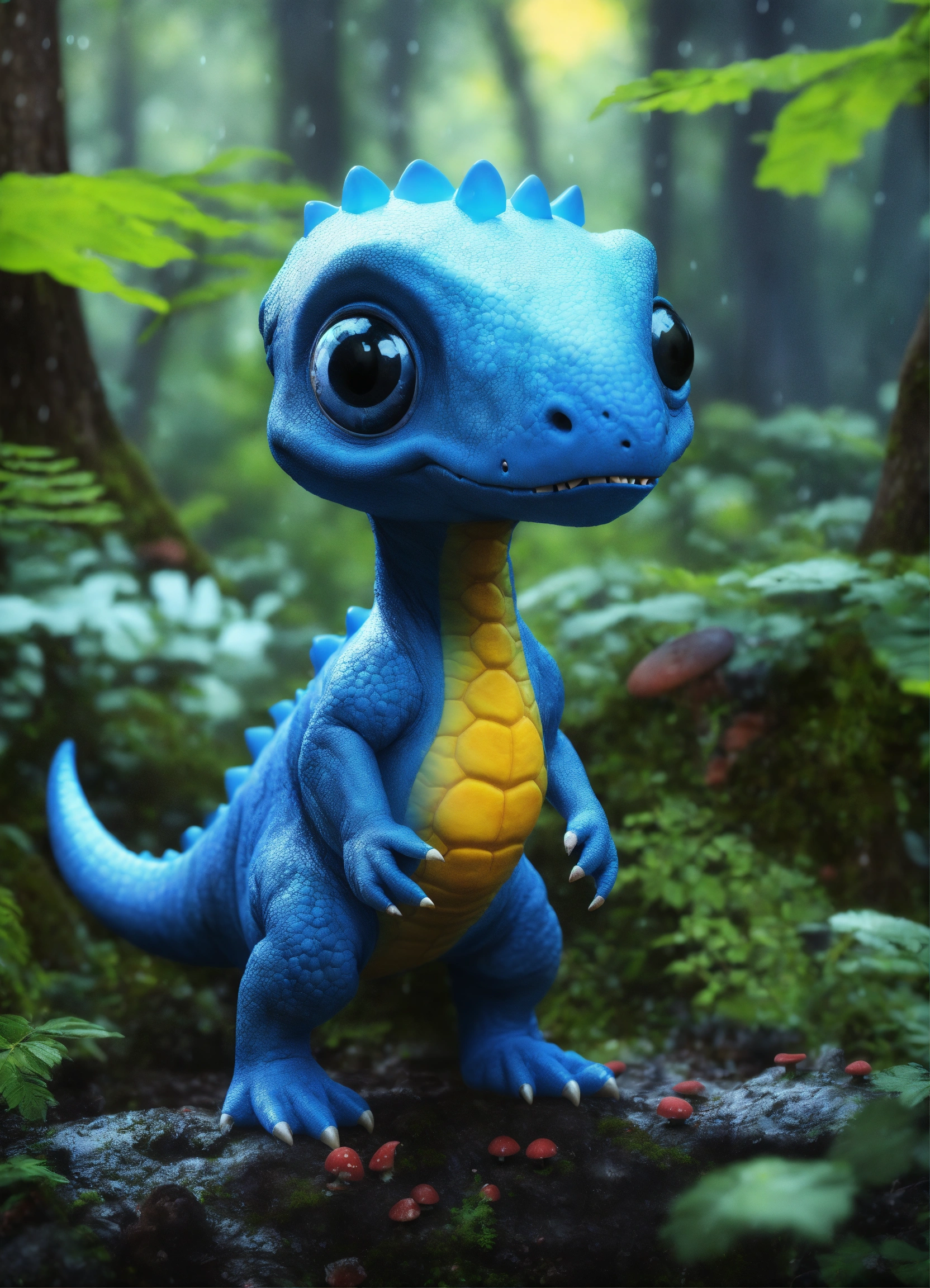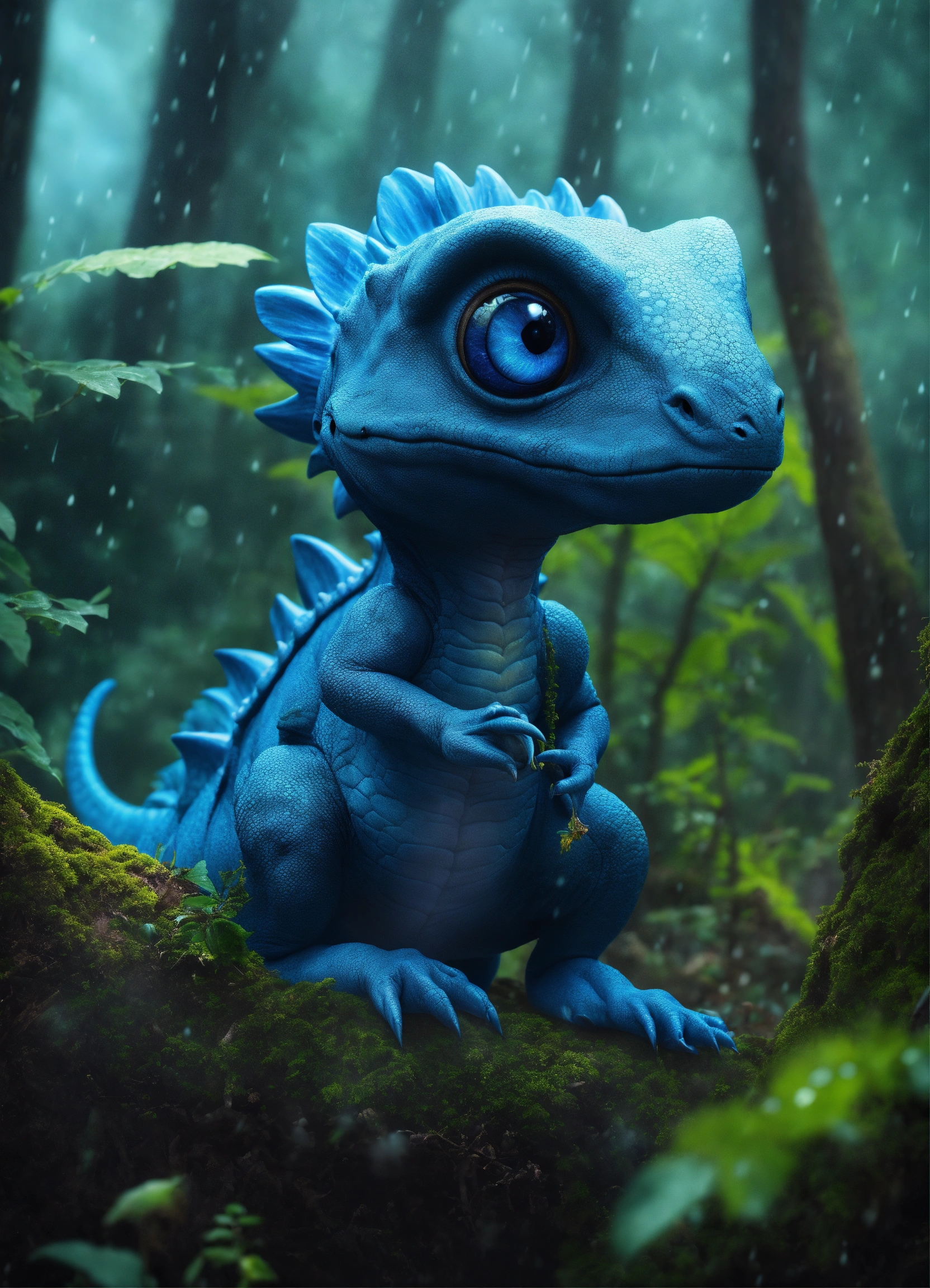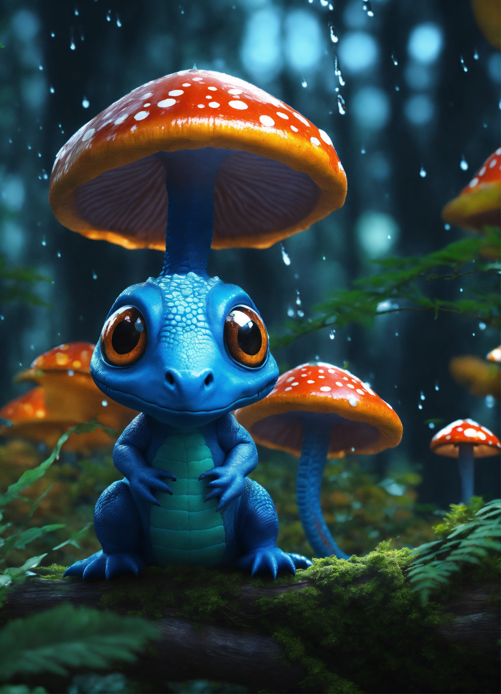 A realiste blue cute dinosaur alien, big eyes blacks, mushrooms in trees, nigth, forest rain, hyperrealist, detailed, digital photo 4k --s 50