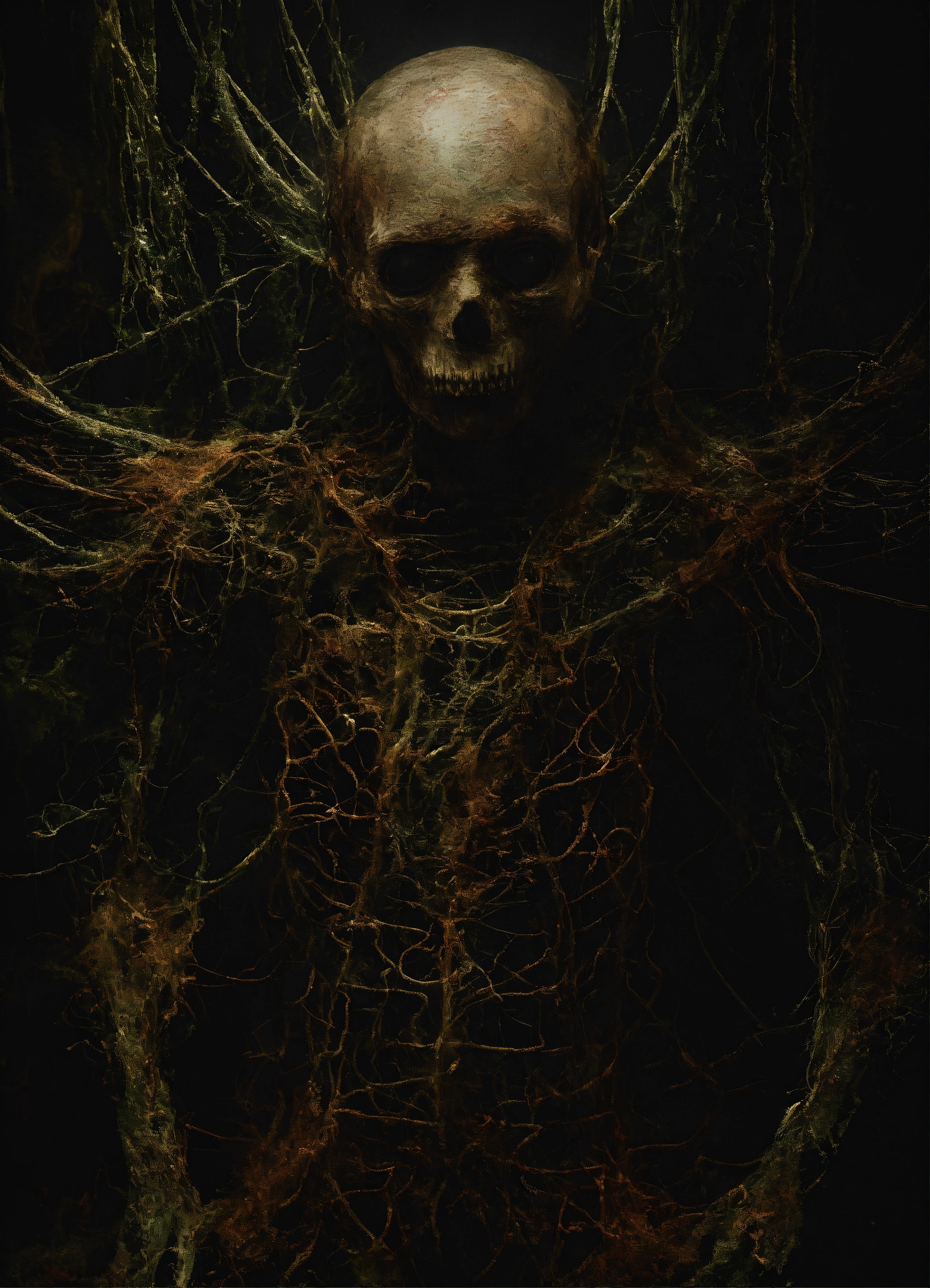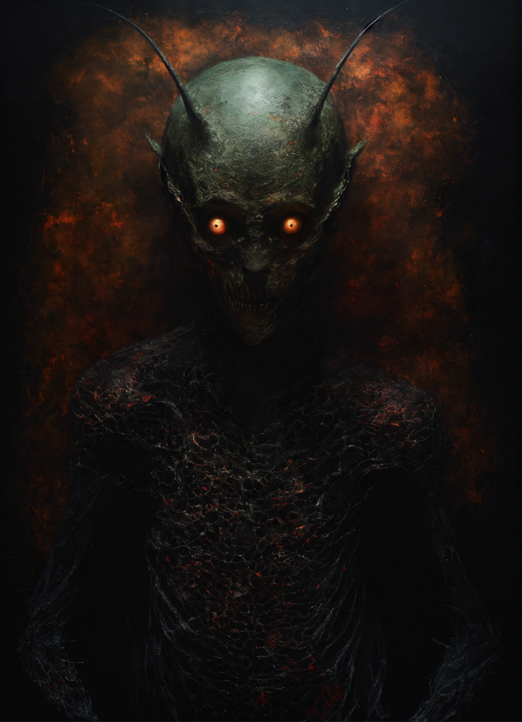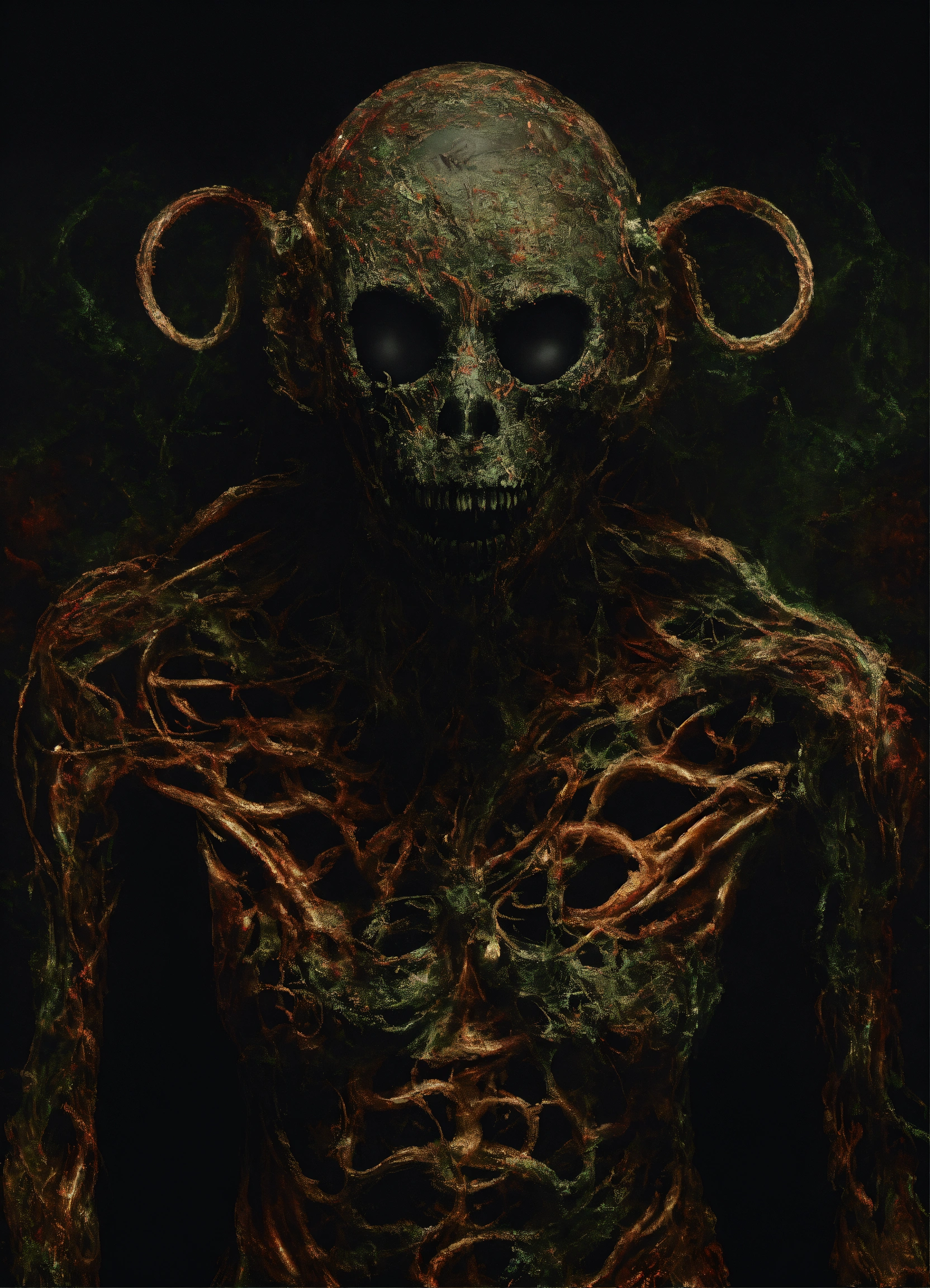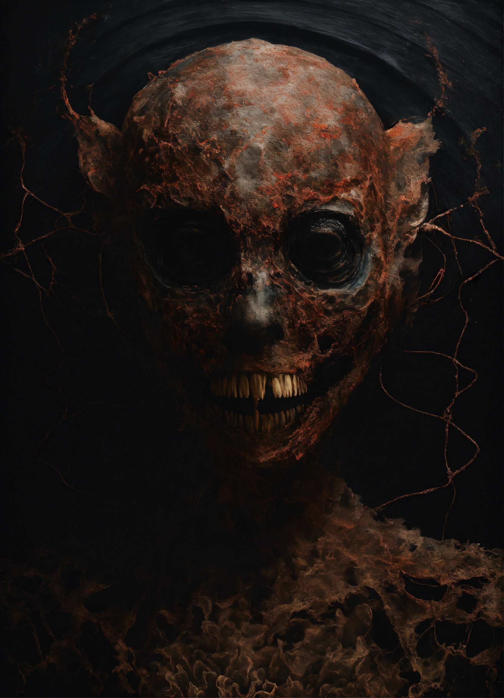 A disturbingly eerie, unrealistic picture of a creepy creature on black canvas, with overlapping elements.