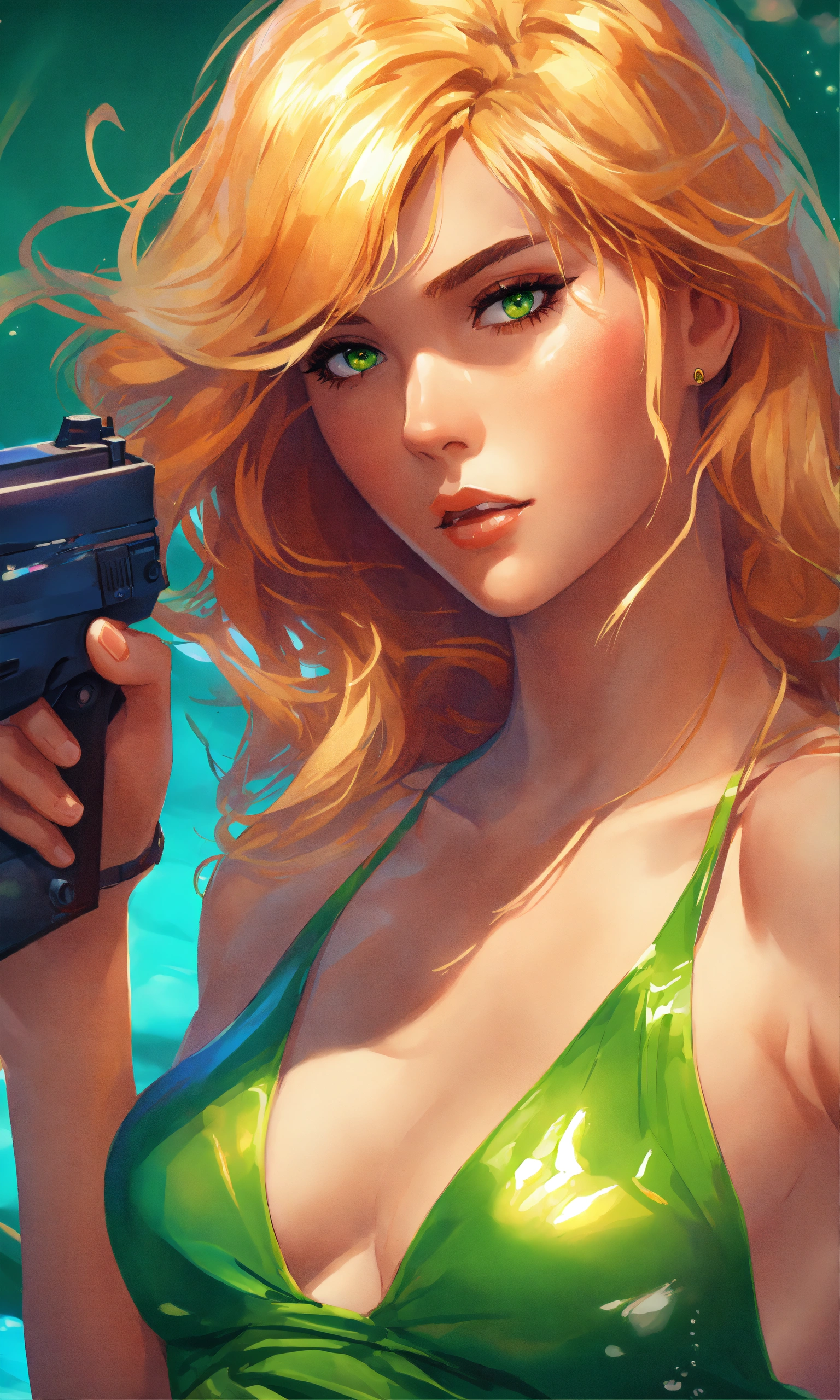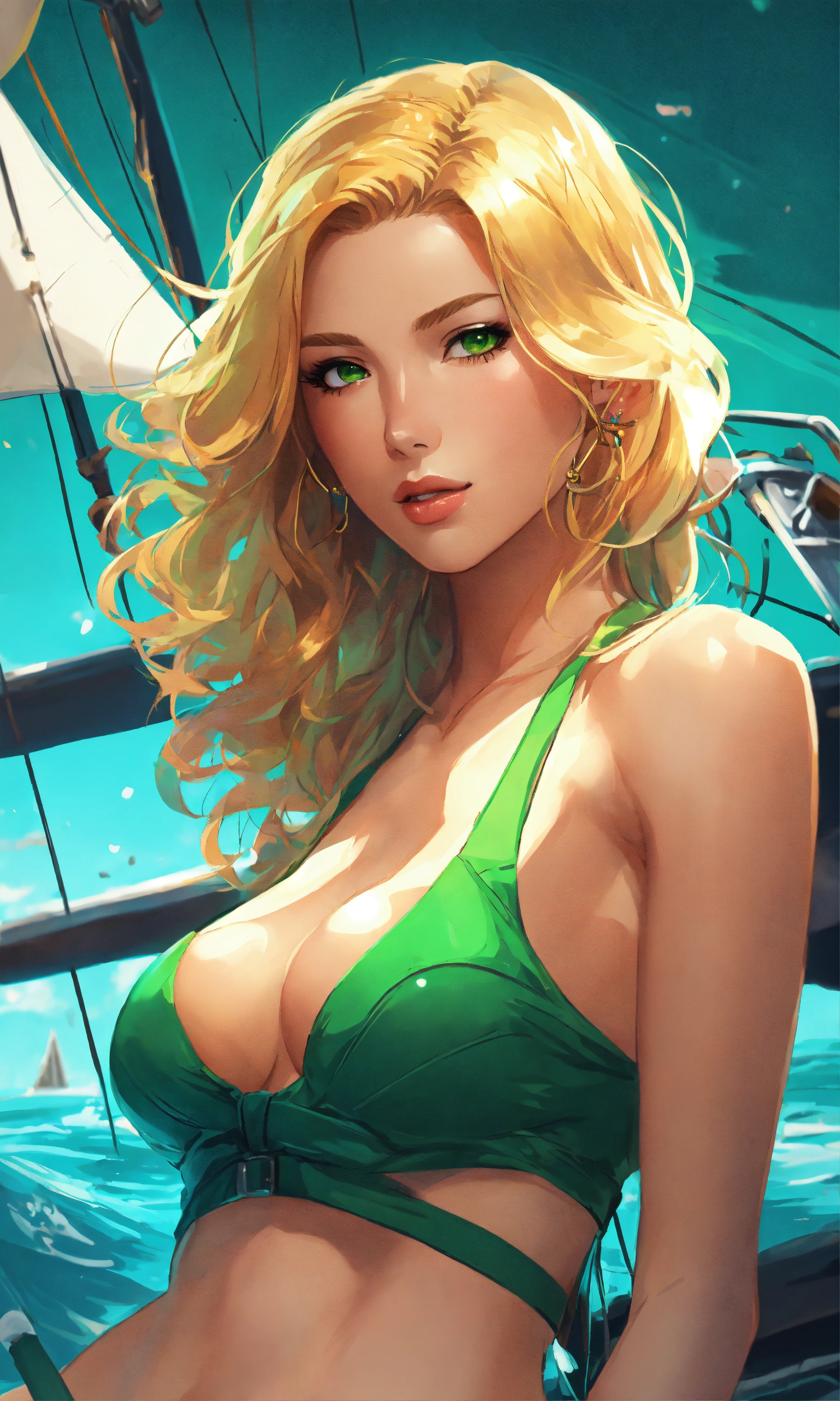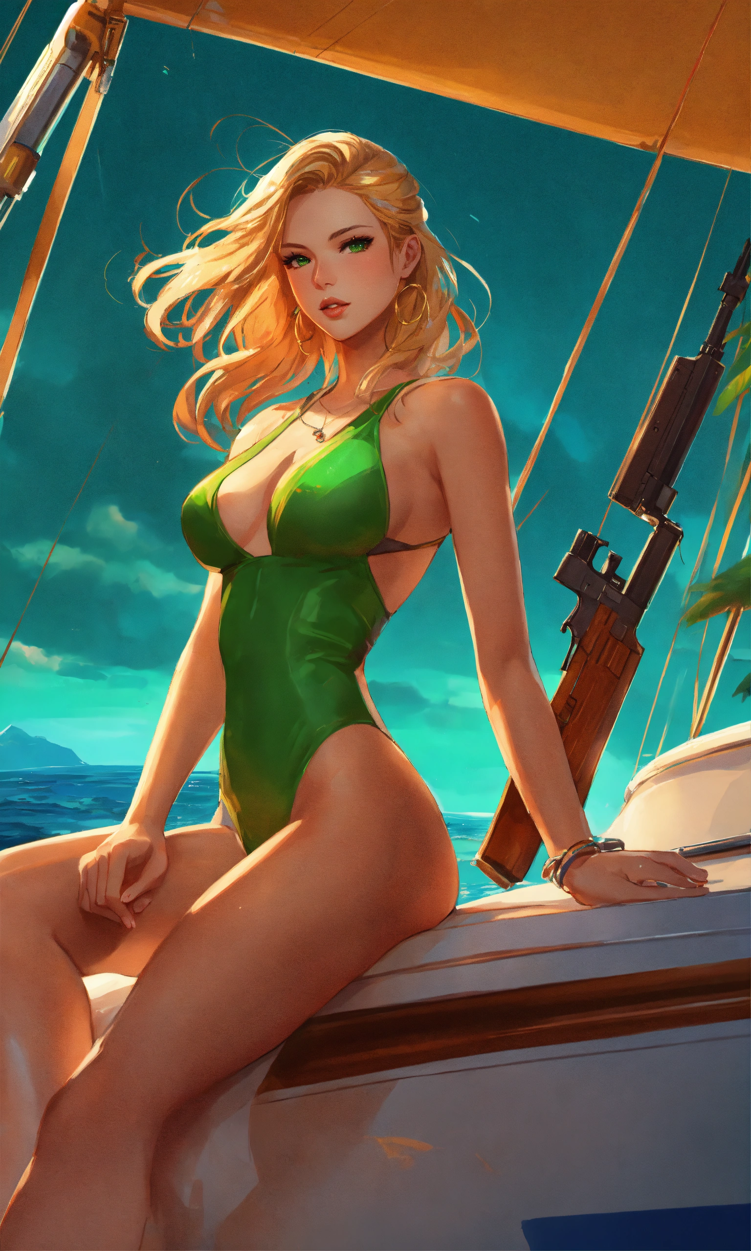 Illustration of a yacht, vibrant colors, golden hair, green eyes, woman in swimwear, holding a gun, 8k photo, animestyle, by artgerm, trending on artstation