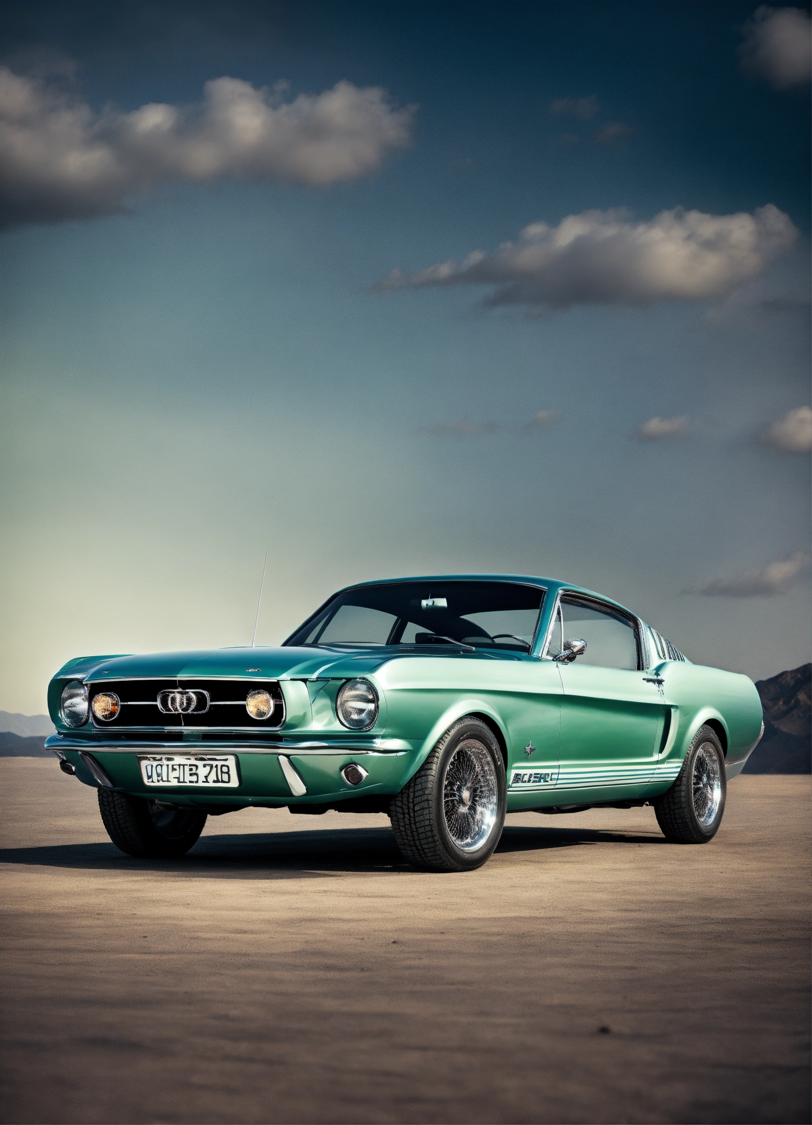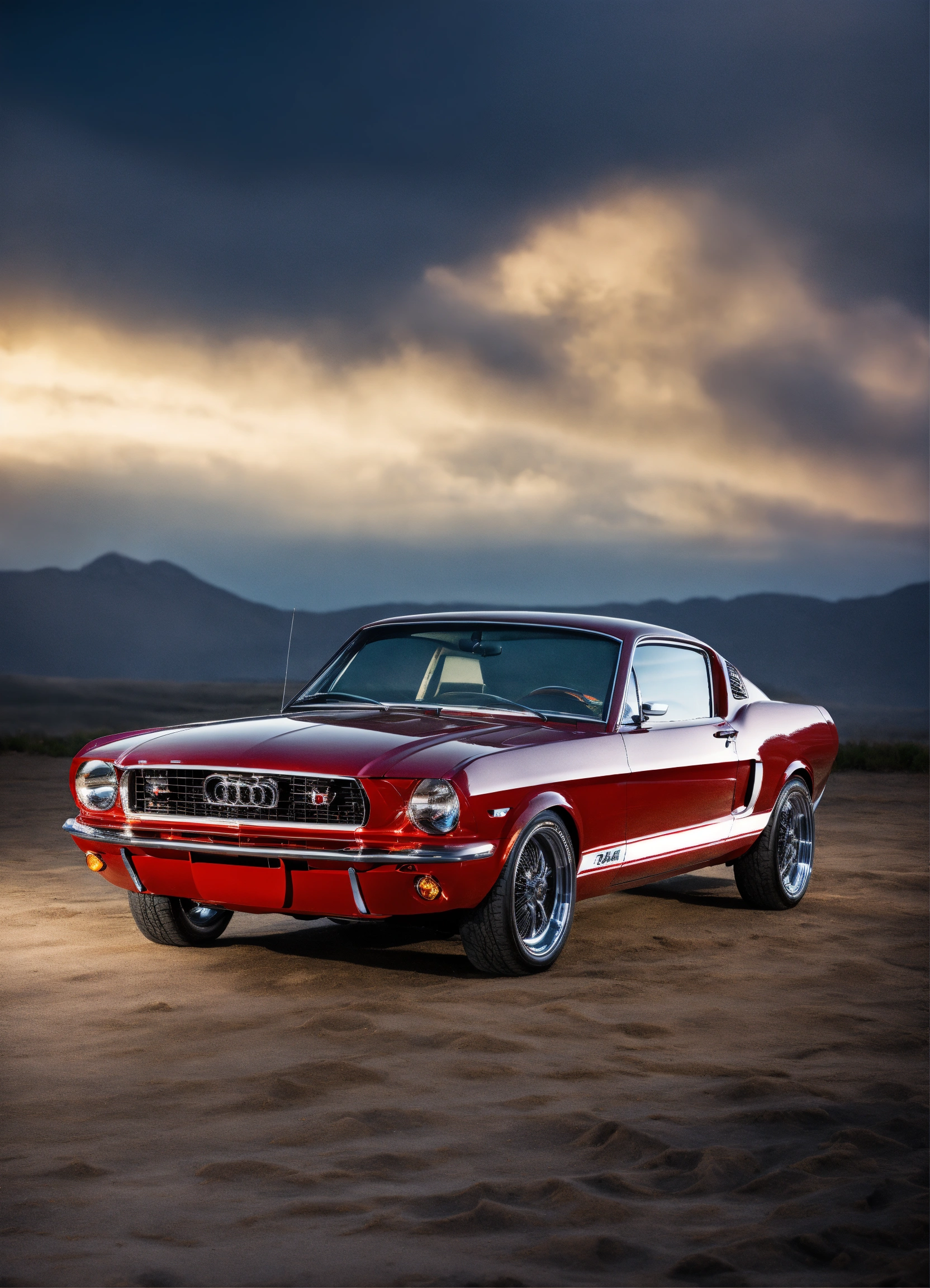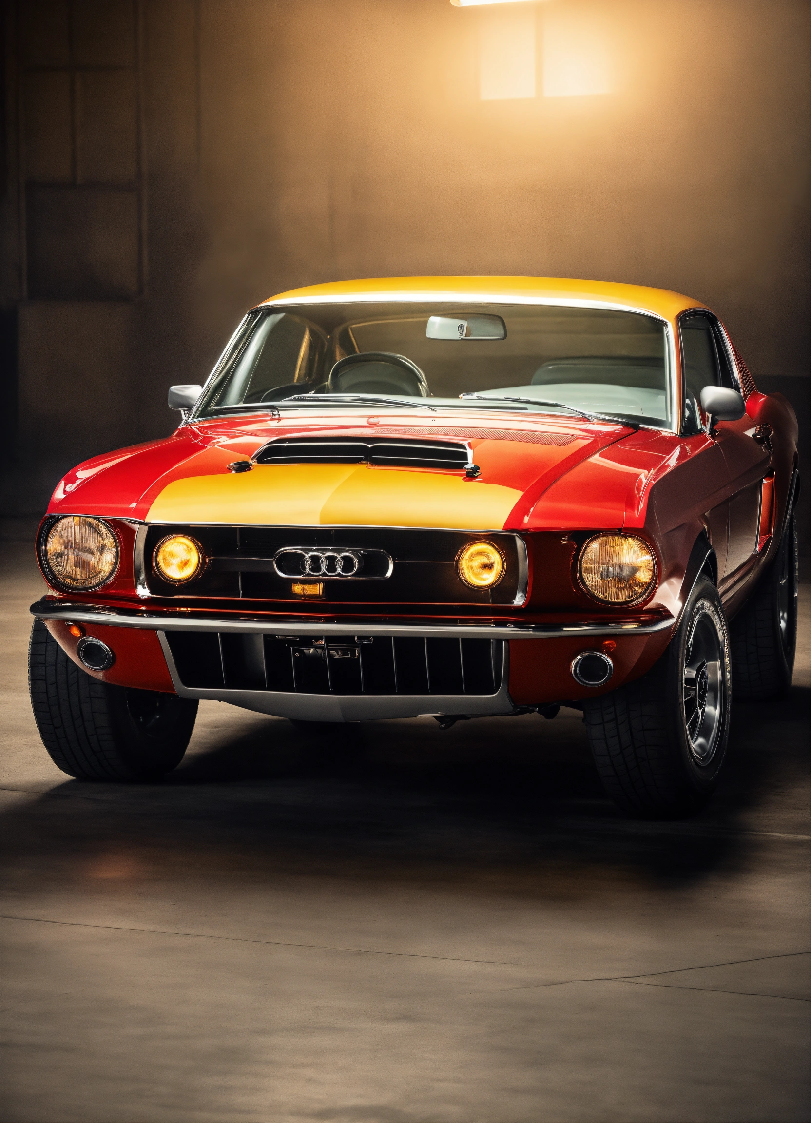 Mustang-audi hybrid concept, seamlessly blended vintage vehicles, canon eos-1d x, studio lighting, conceptual.