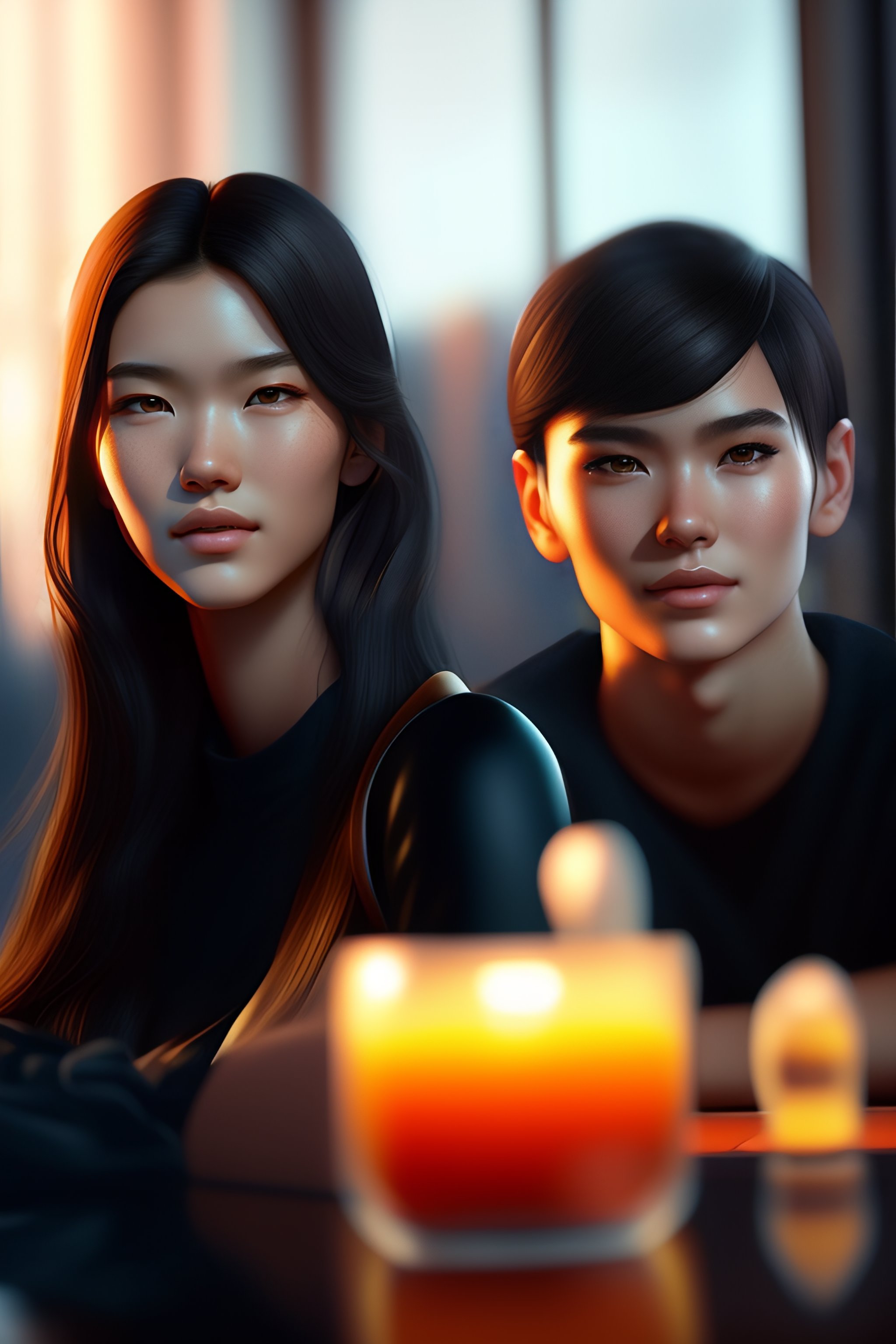 Photo of a tall young 16 years old beautiful cute girl sitting in front of a tiny 18 years old thin boy on a table, the girl have long black hair, the girl is fully clothed. 16 k, ultra realistic, octane render, volumetric lighting, shadow effect, insanely detailed and intricate, photorealistic, highly detailed, artstation by wlop, by artgerm