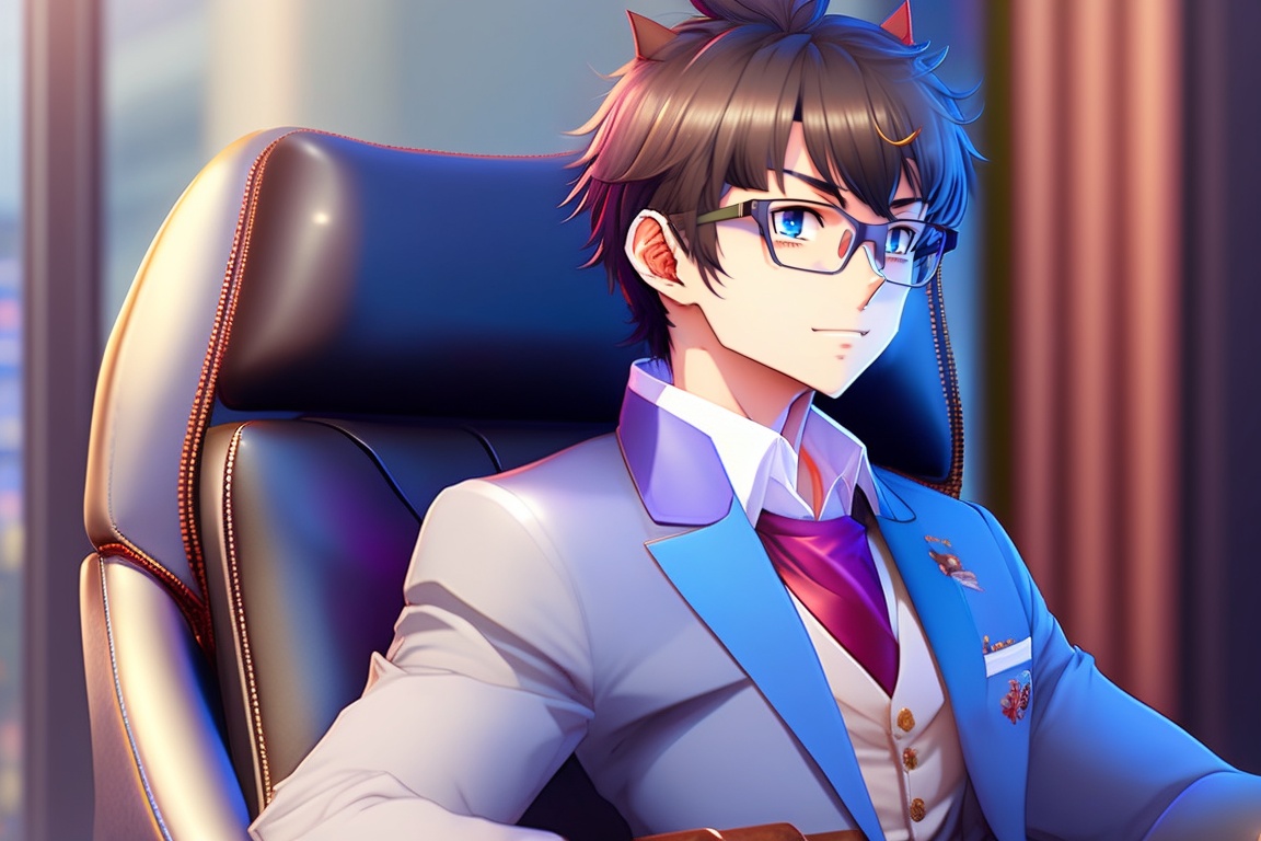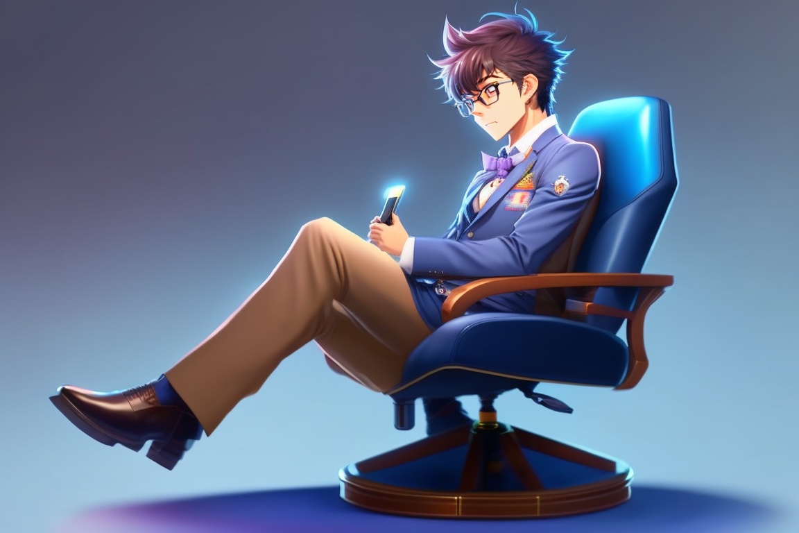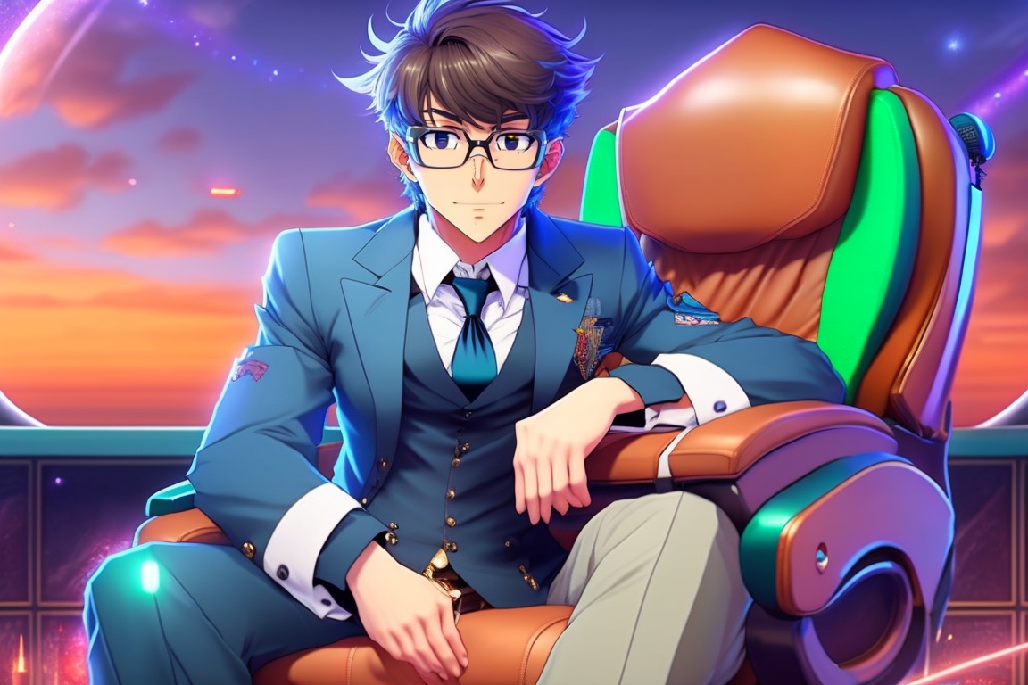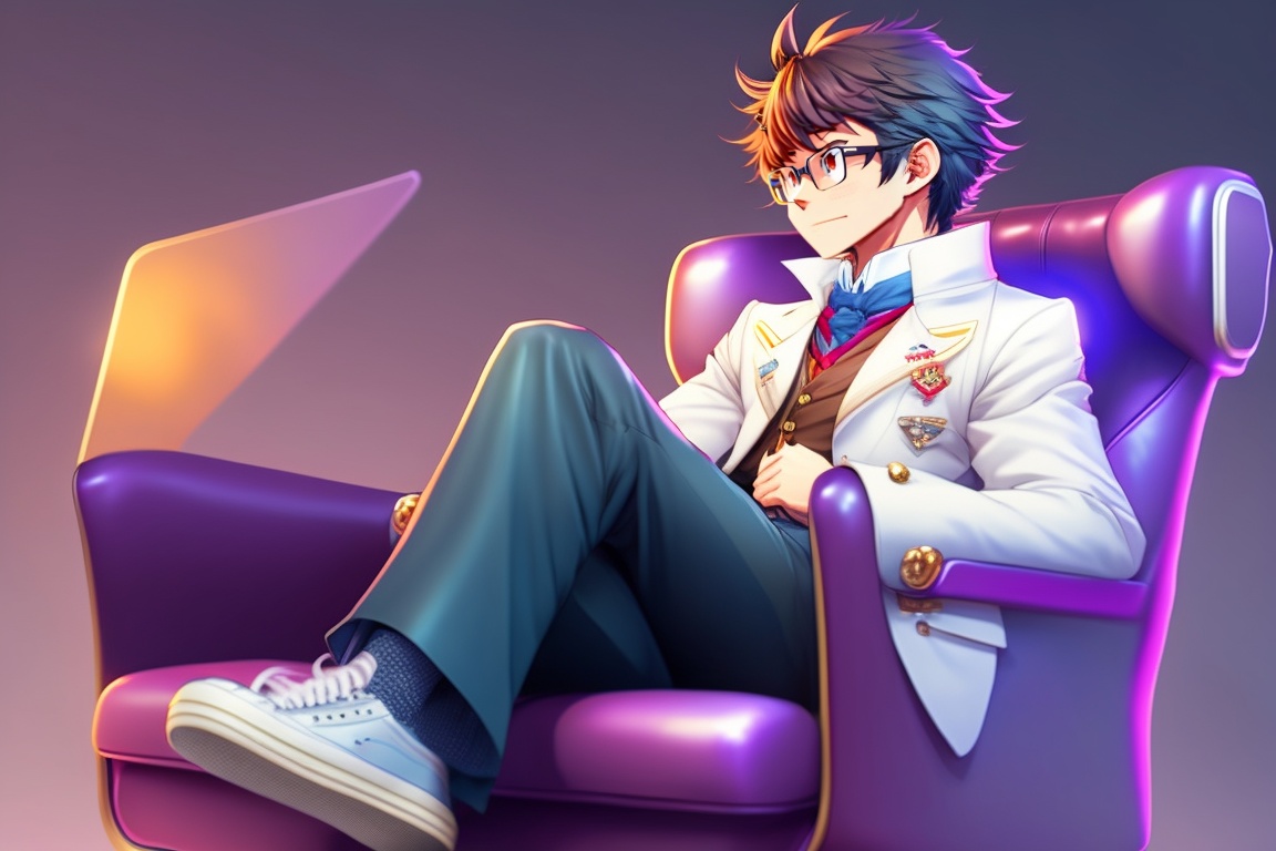 Shinichi kudo from the movie detective conan wearing glasses and sitting on a gaming chair and he wears beautiful clothes, youtuber and sit on gamer chair