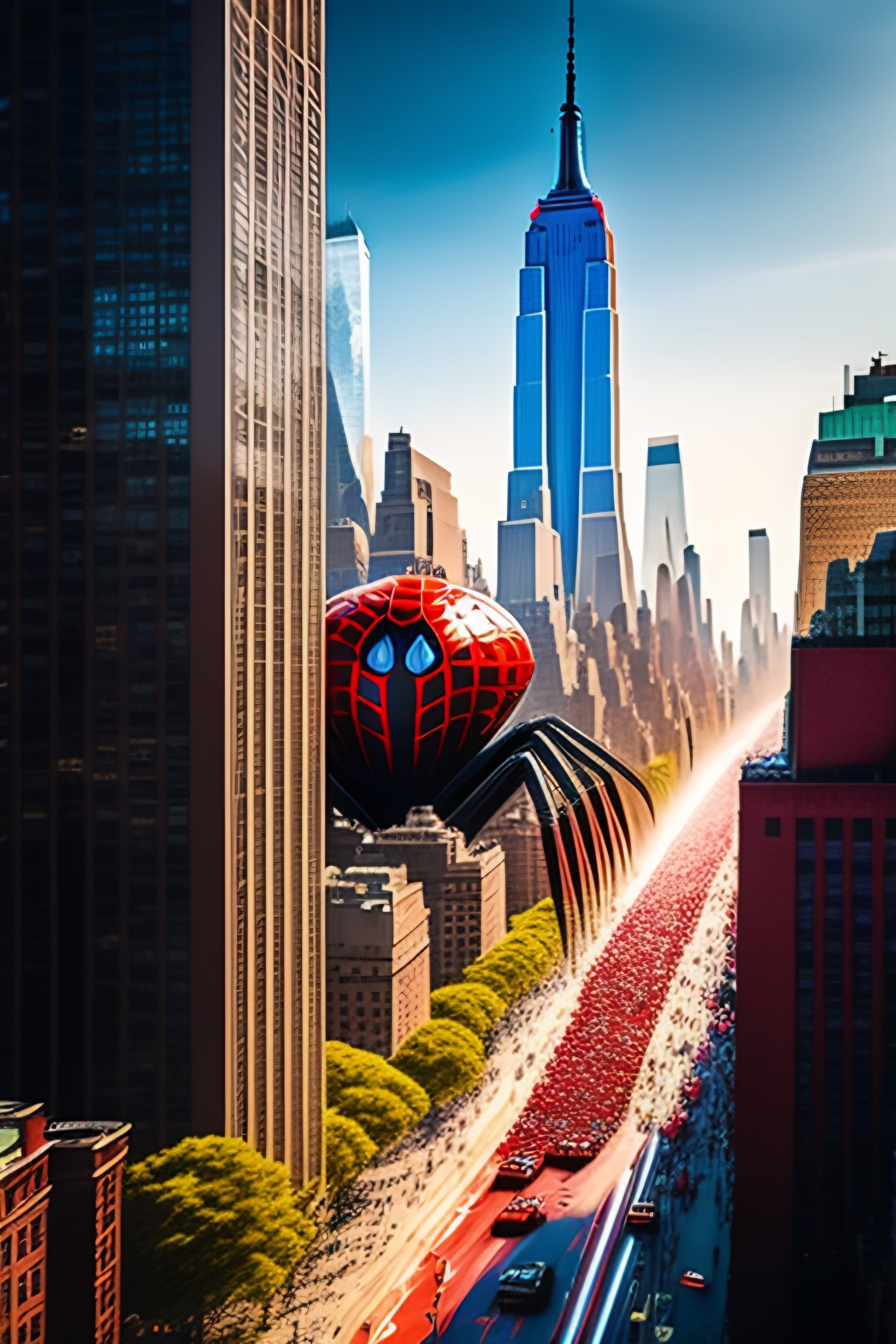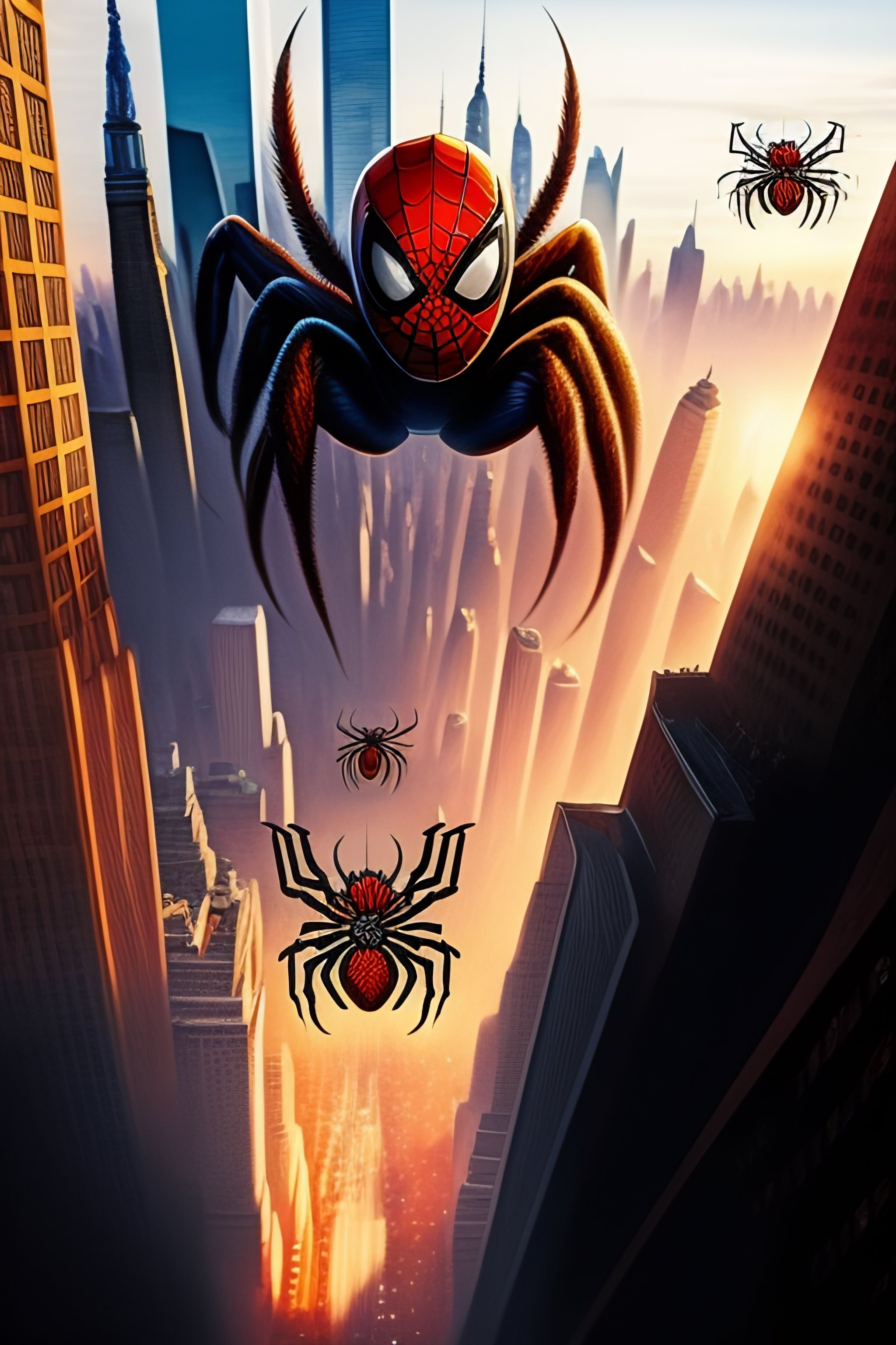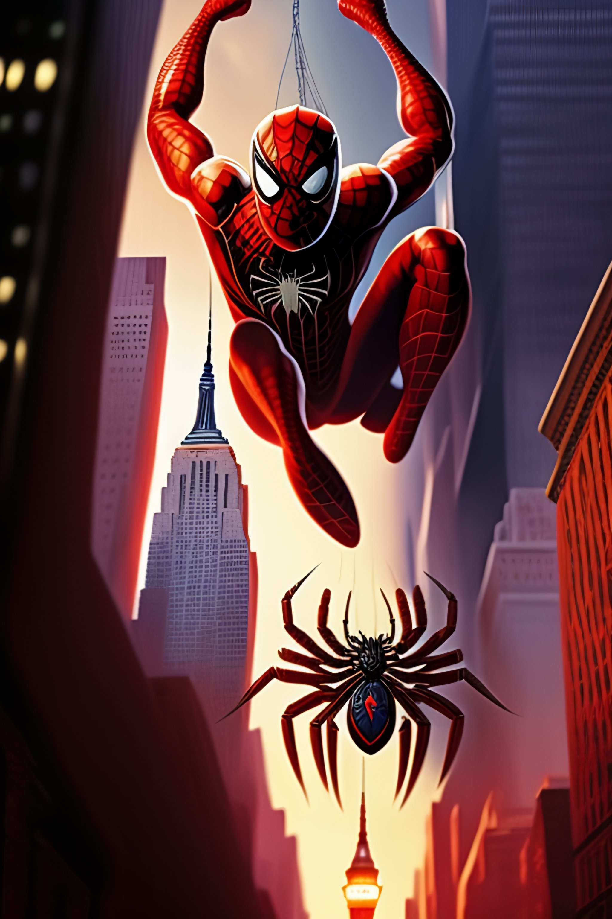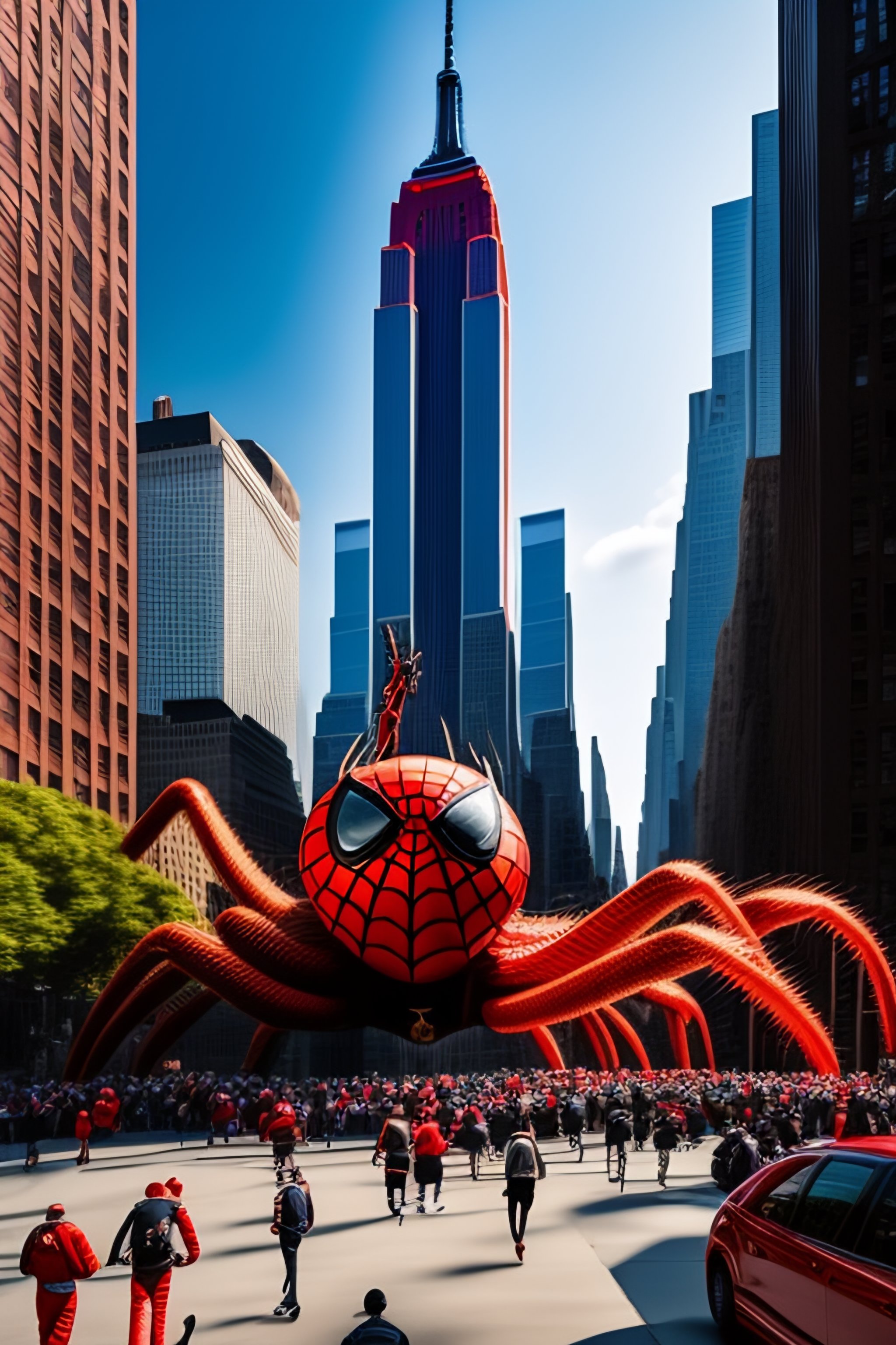 Giant spider fighting spiderman, red and hairy, crawling around, in new york city, empire state building, people running away from the spider, spiderman swinging past, holding onto the giant spider