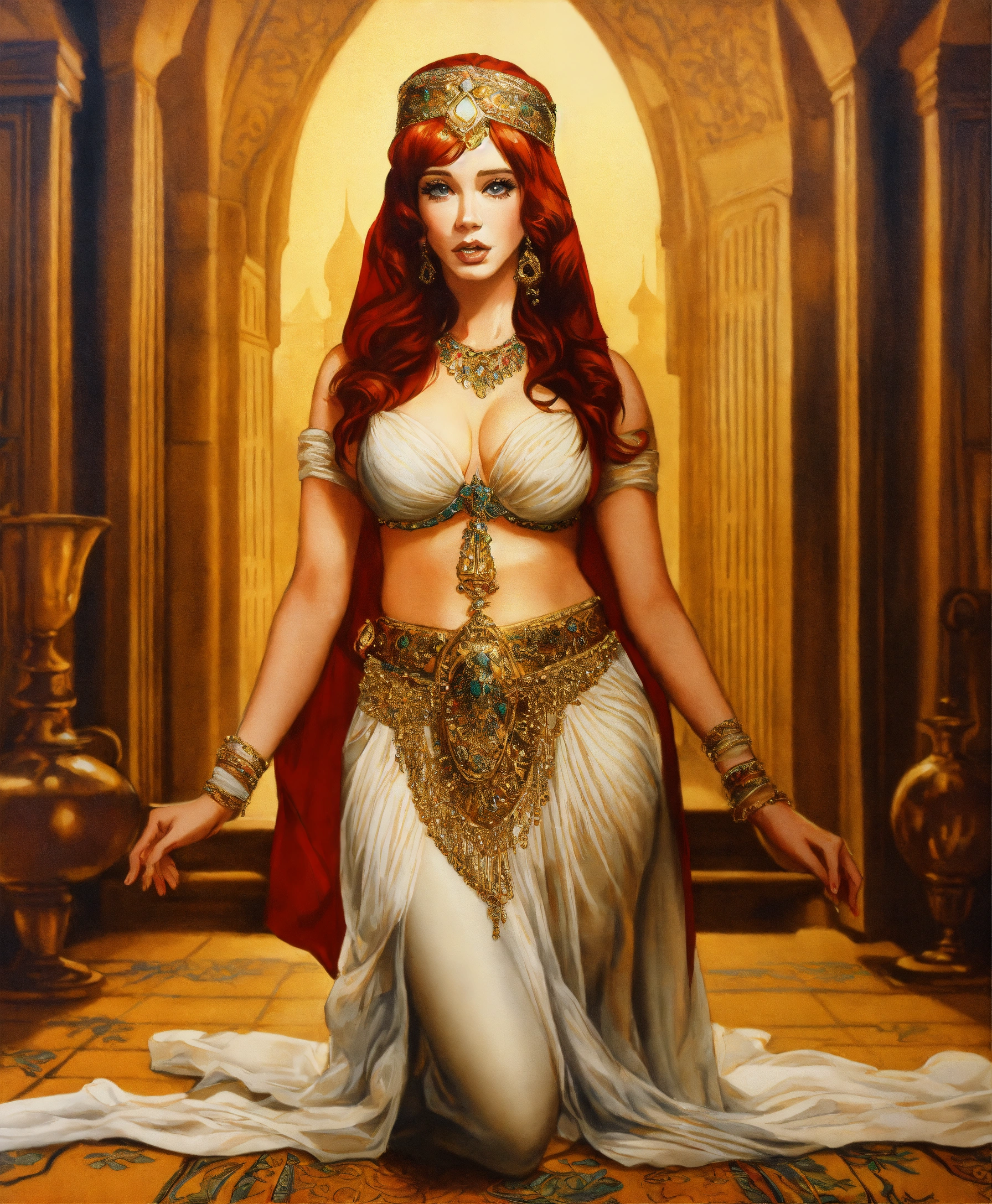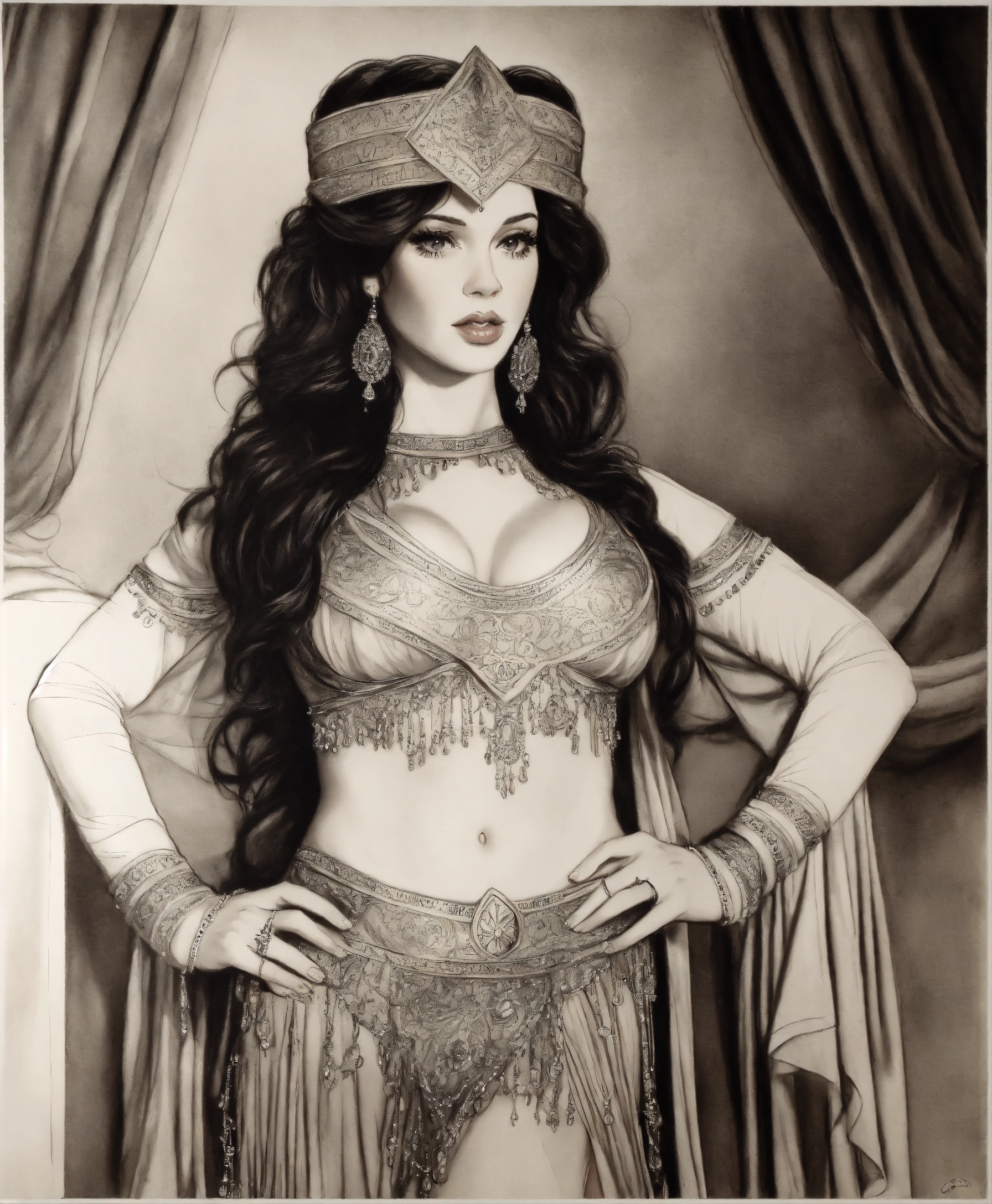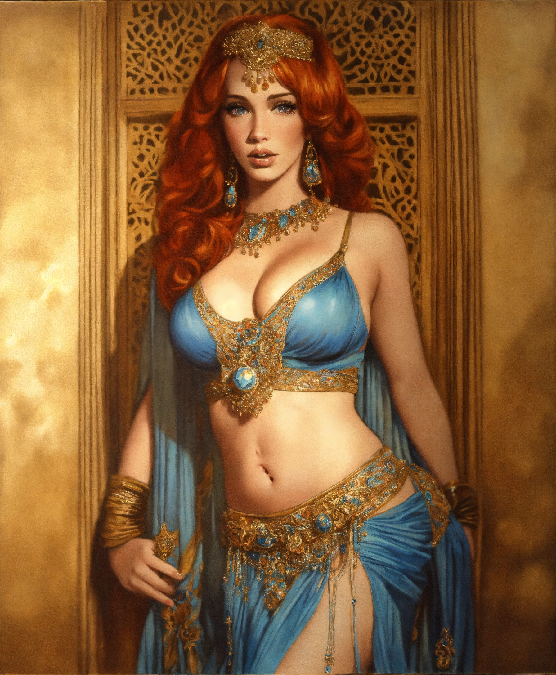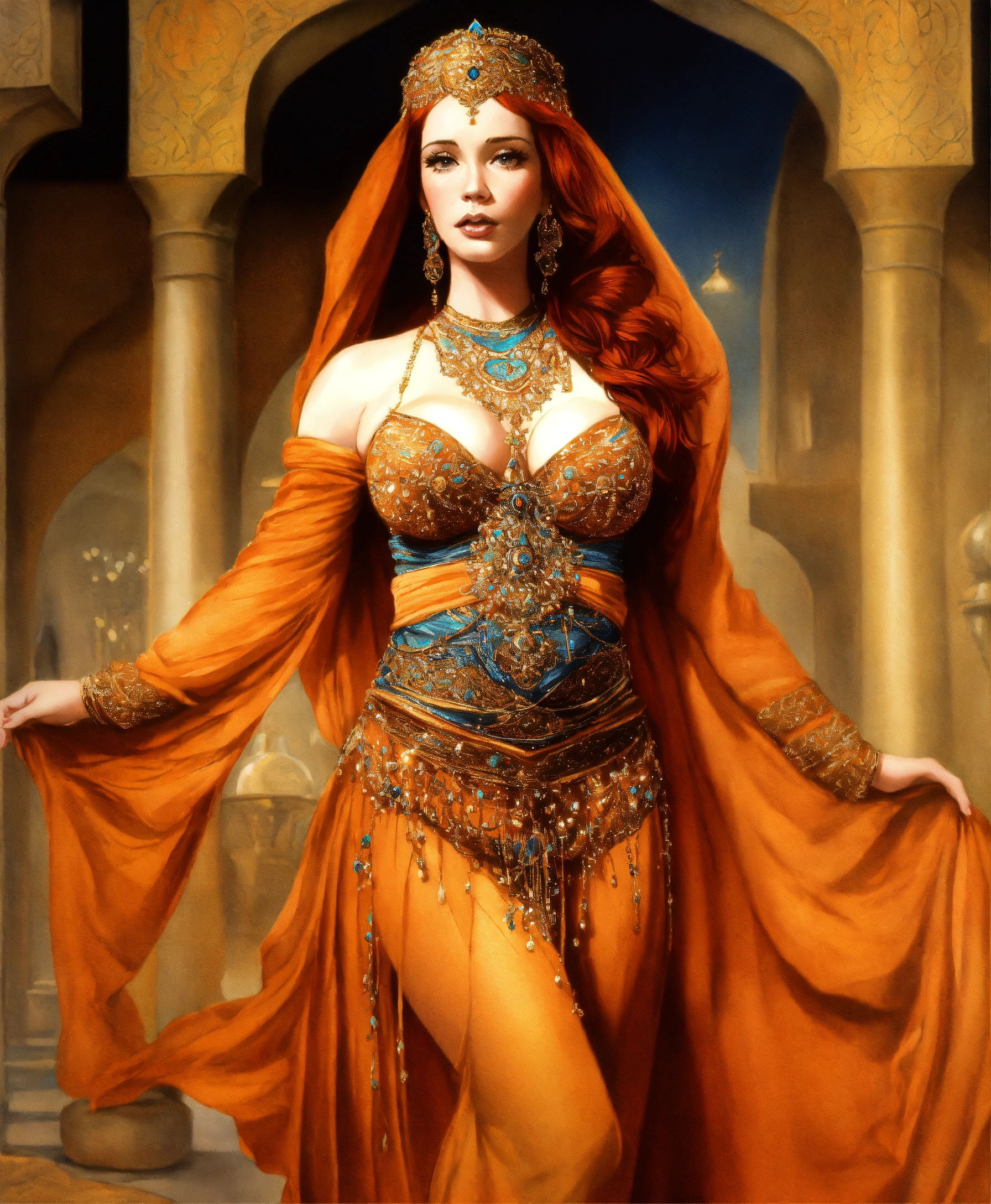 Medieval christina hendricks as belly dancer in arabian nights, 1980's, paper drawing of beautiful christina hendricks with minimalist far perspective, transparent, style by boris vallejo, barefoot, 8k, highly detailed, ultra-realism, hyperrealism