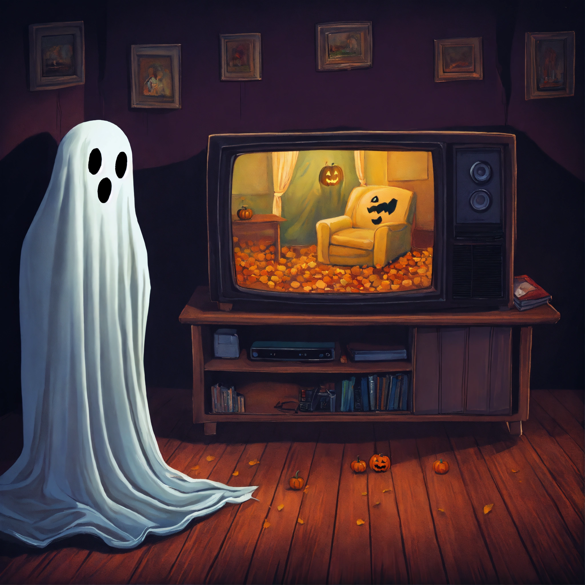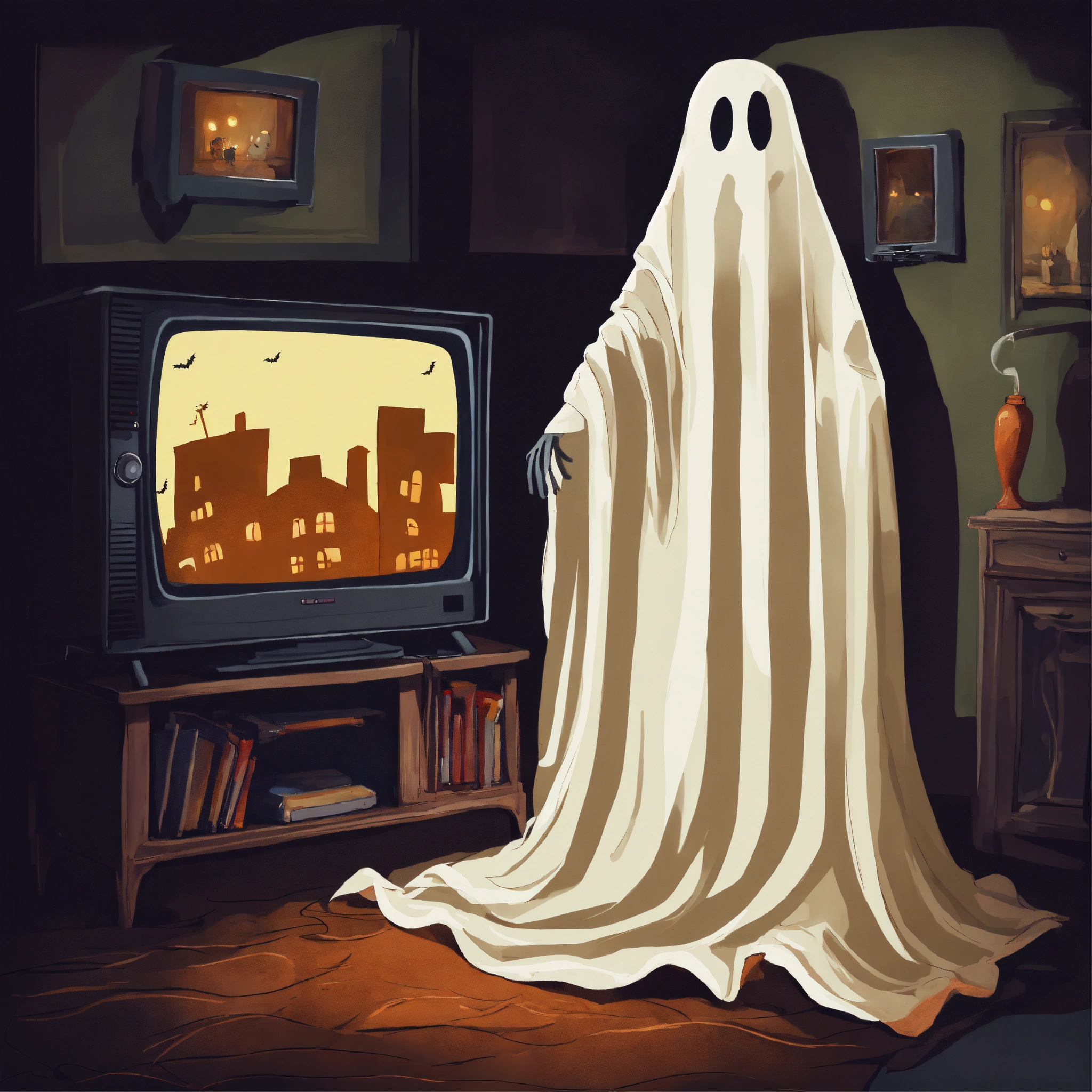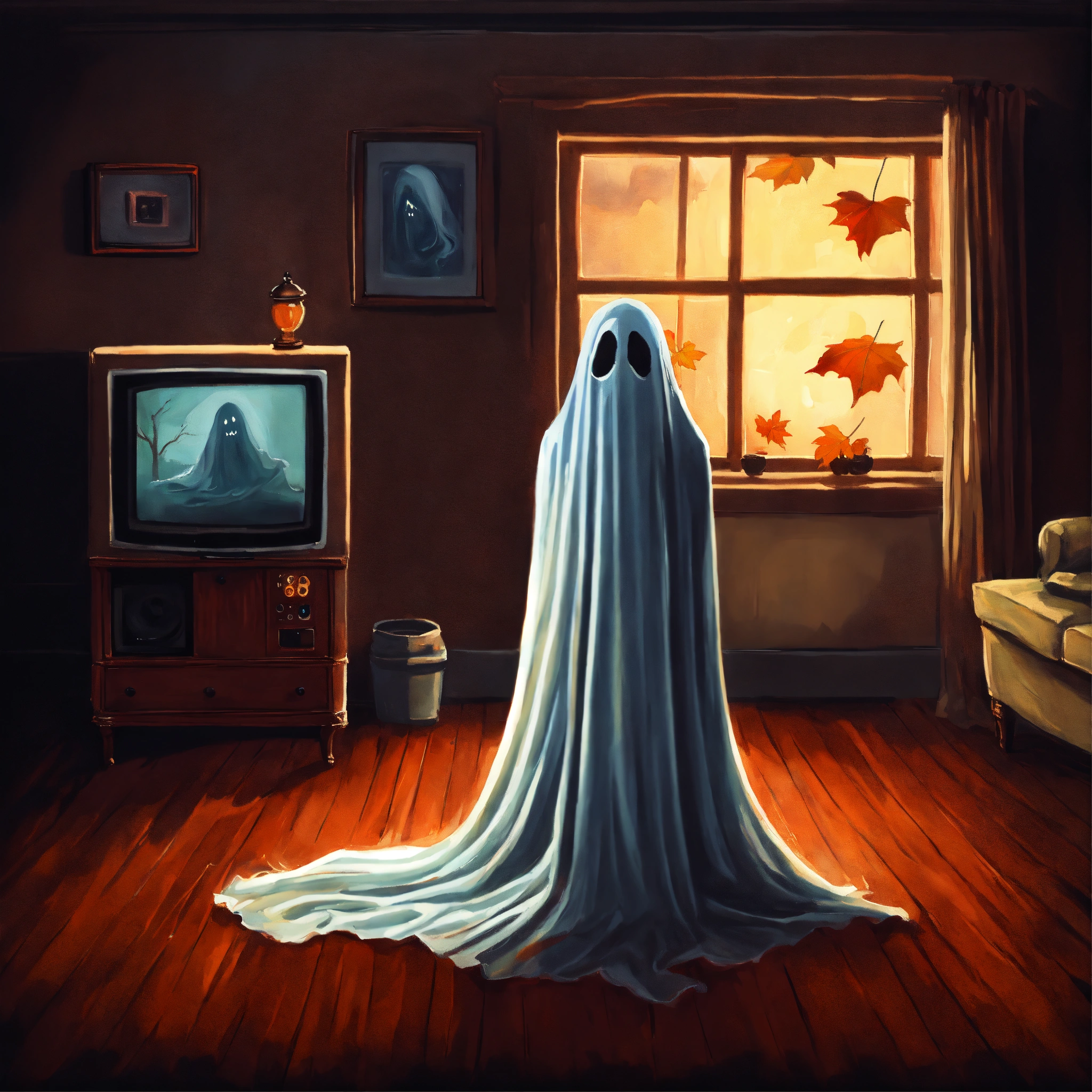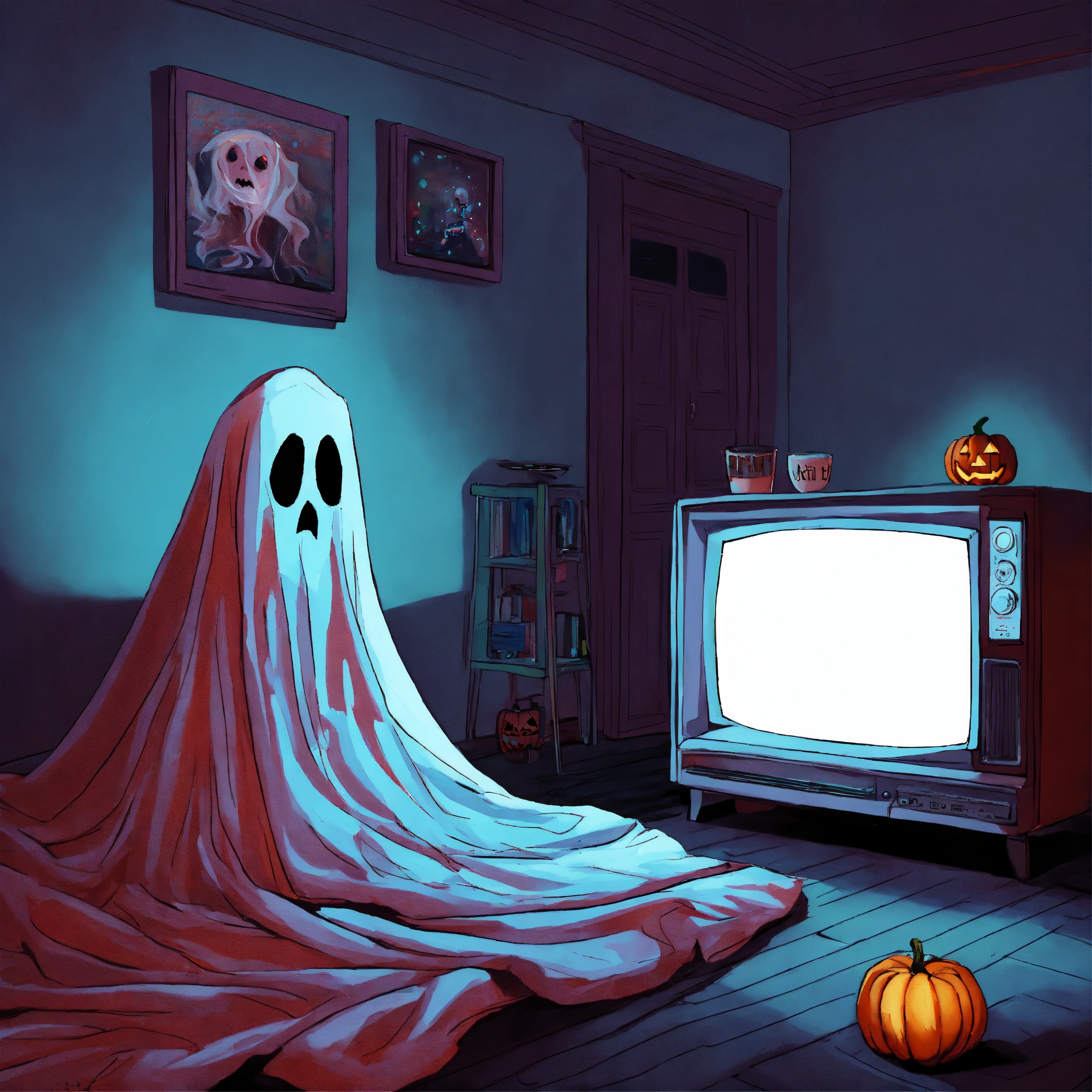 A painting of a bedsheet ghost watching scary movies on a television in a dark room. halloween, spooky, scary, haunted, dark room, keletonautumn, eerie