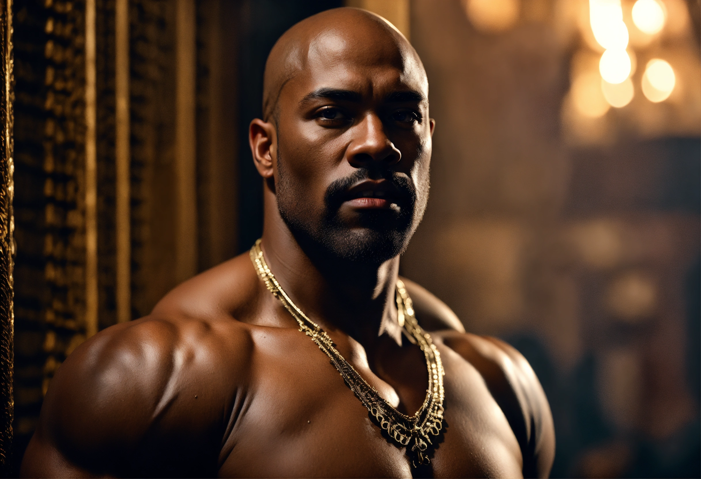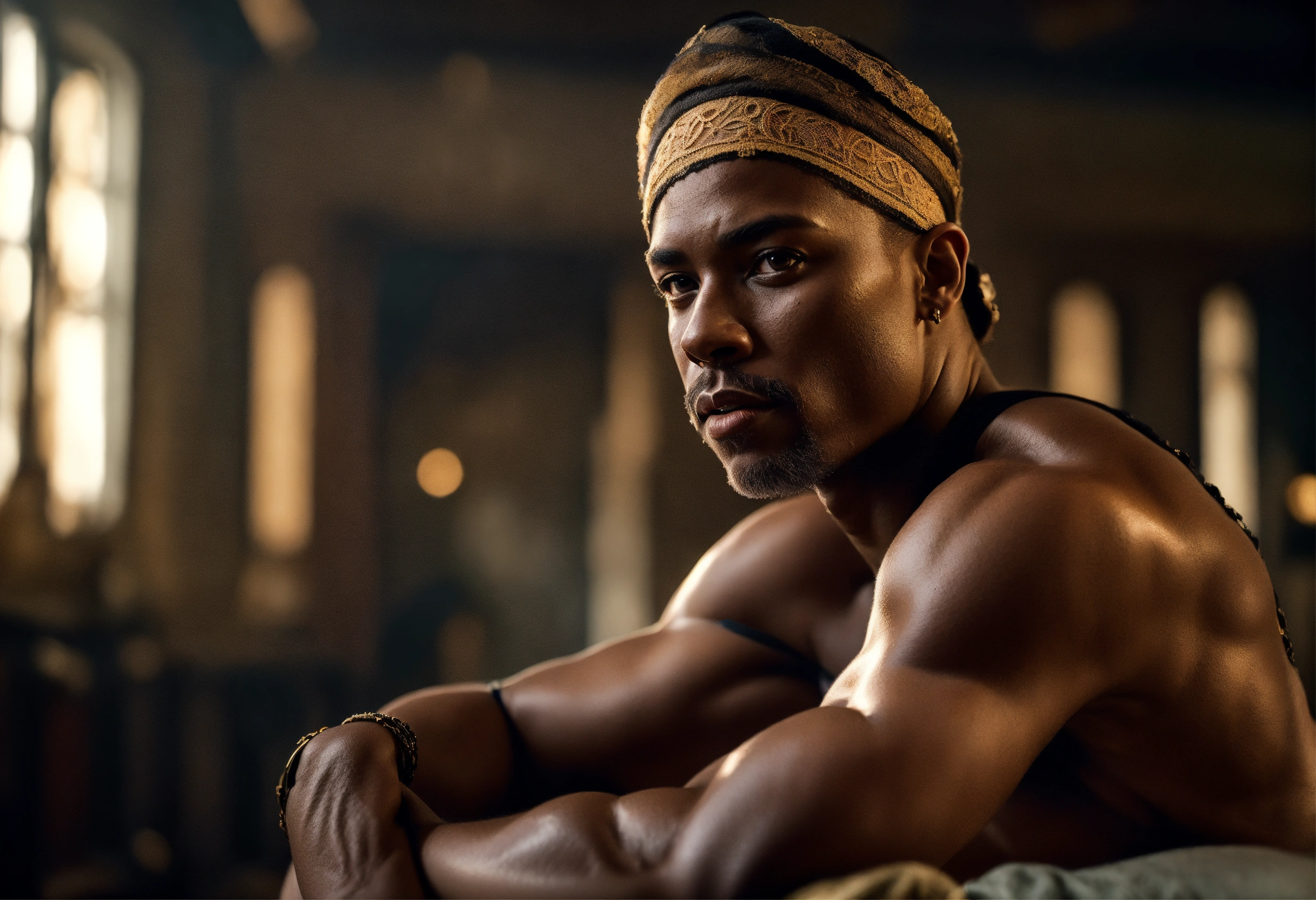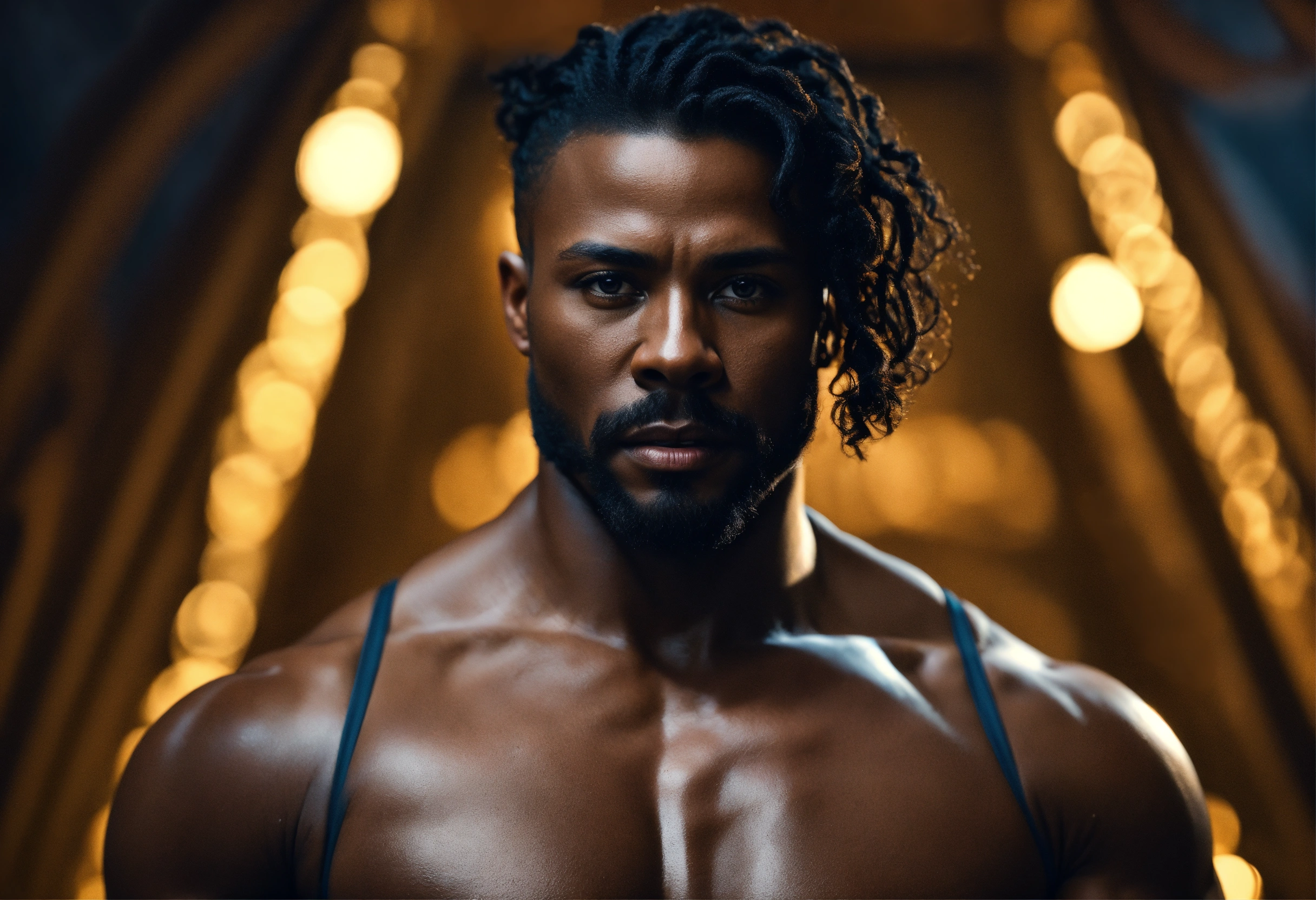 Portrait of a stunningly beautiful middle age black warrior in soft light, mister olympia anatomy, broad muscle legs, big delts, ripped, intricate, elegant, depth of field, zeiss lens, detailed, symmetrical, centered, fashion photoshoot, by annie leibovitz and steve mccurry, david lazar, jimmy nelsson, breathtaking, 8 k resolution, extremely detailed, beautiful, establishing shot, artistic, hyperrealistic, beautiful face, octane render, dressed in a lace leotard