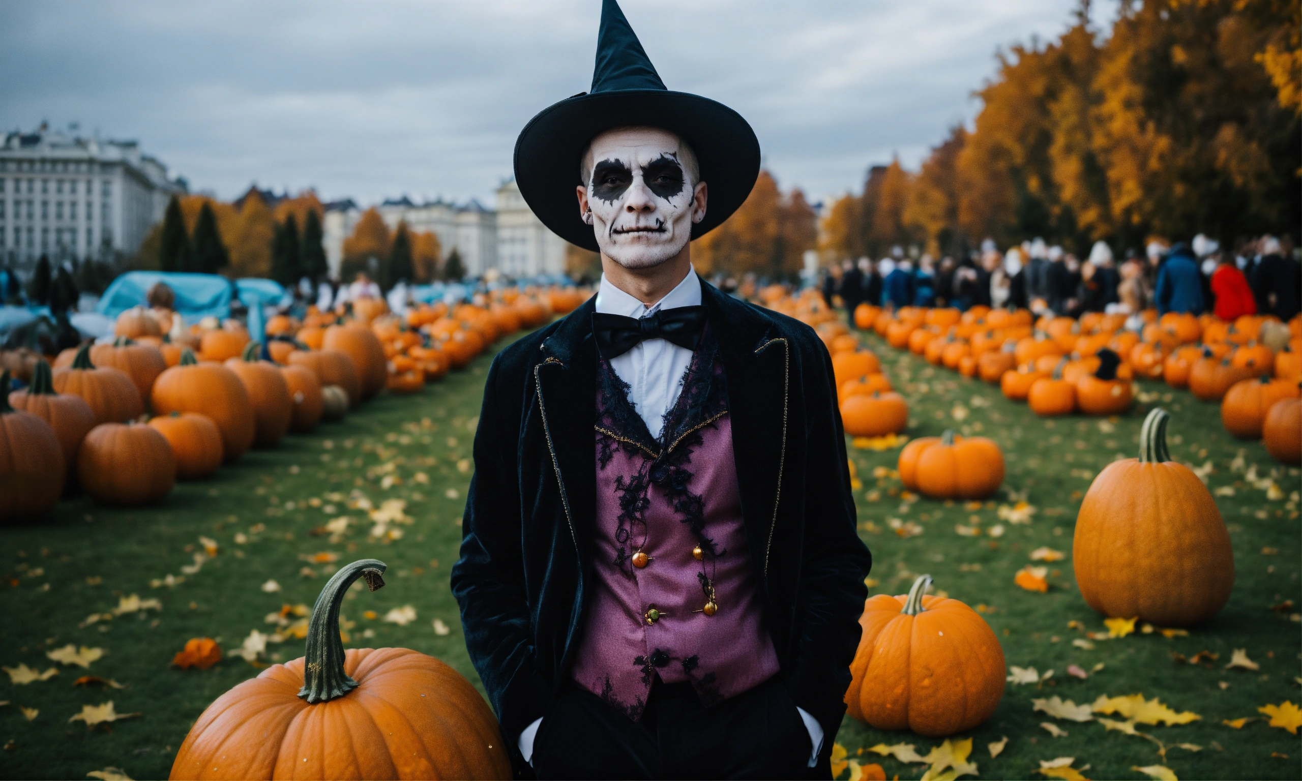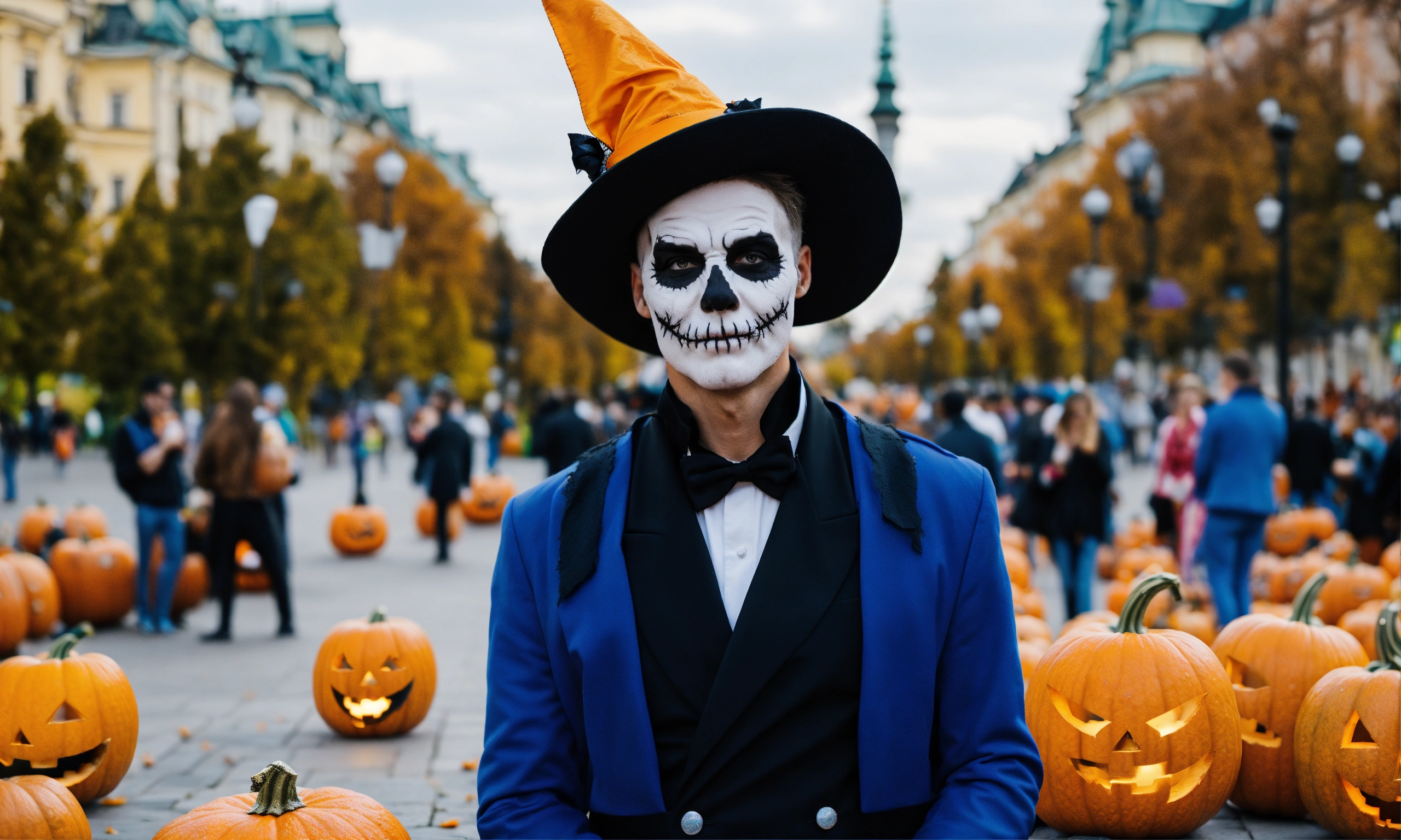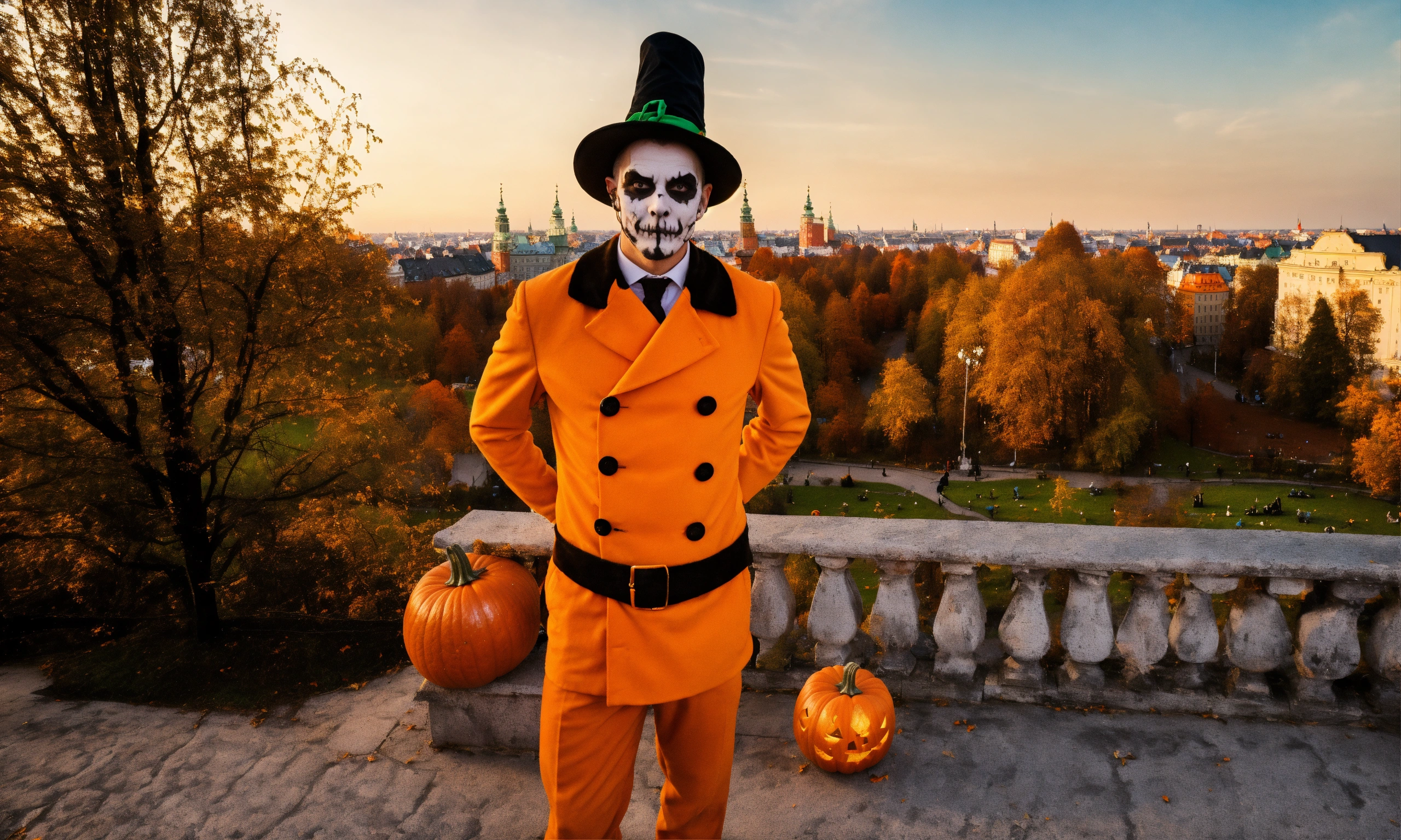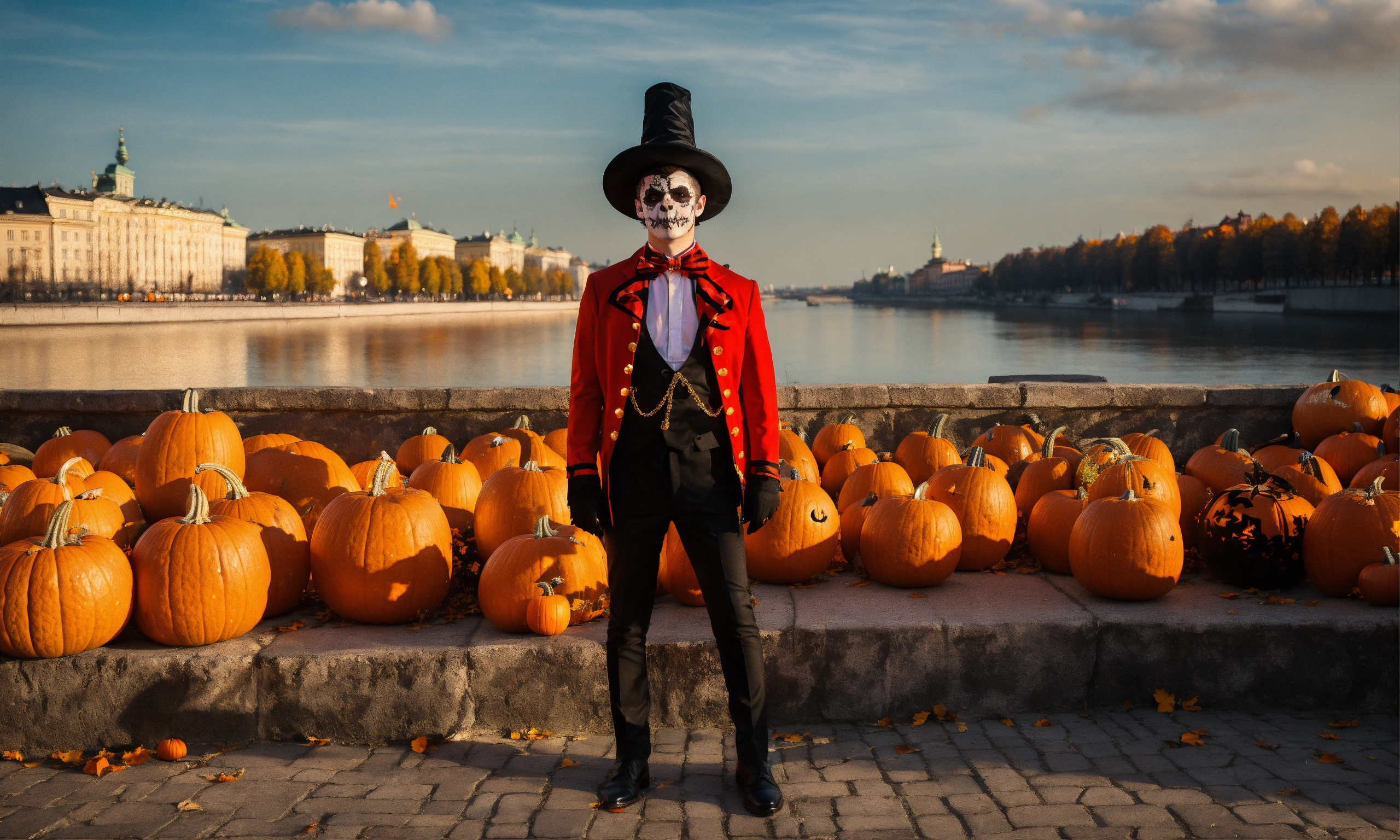 Halloween style, warsaw, poland. cute man dressed in halloween costume at the top of the riviera looking at the camera at half height, focus on the face, halloween style, pumpkins