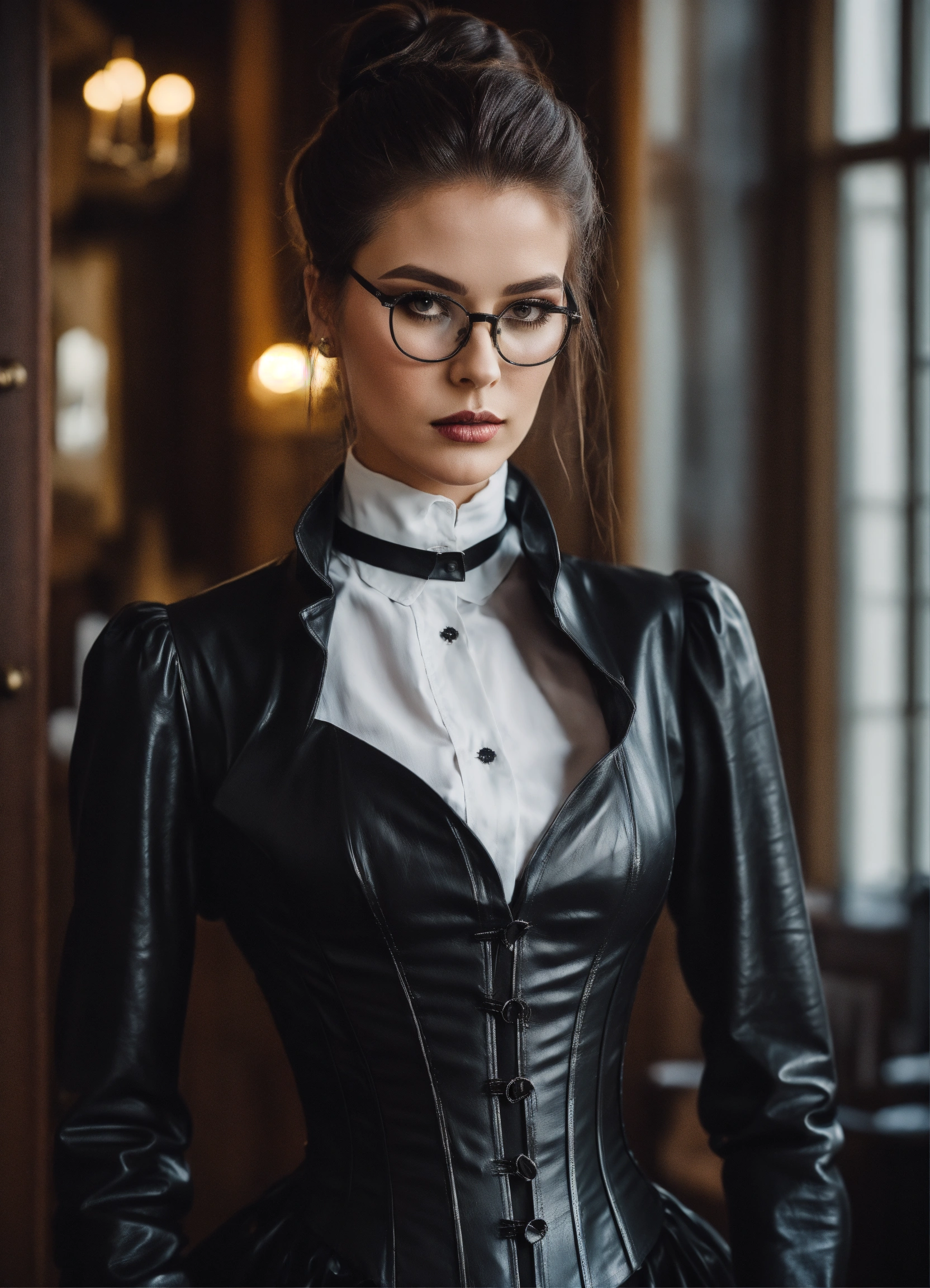 Stunning french seductress woman fashion model, brunette straight high ponytail, glasses, black leather corset, long strict victorian governess wide black long leather dress with big buttons, white governess shirt with long big puff sleeves, mansion room, white office shirt, eyeliner makeup