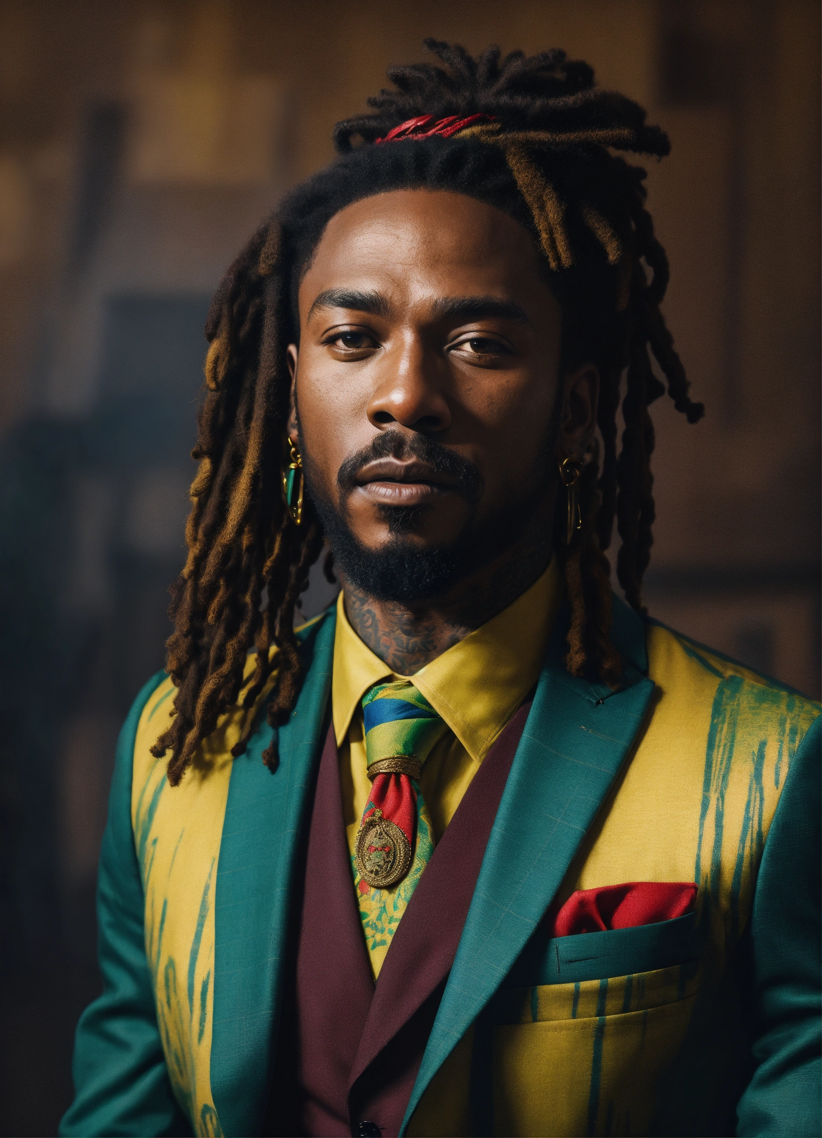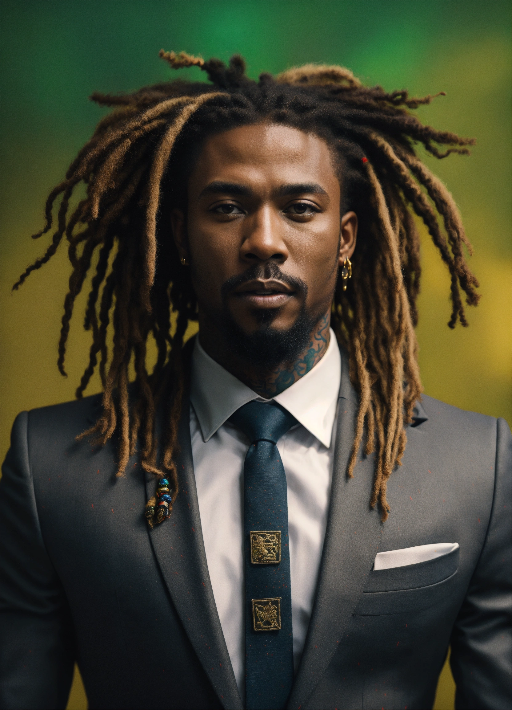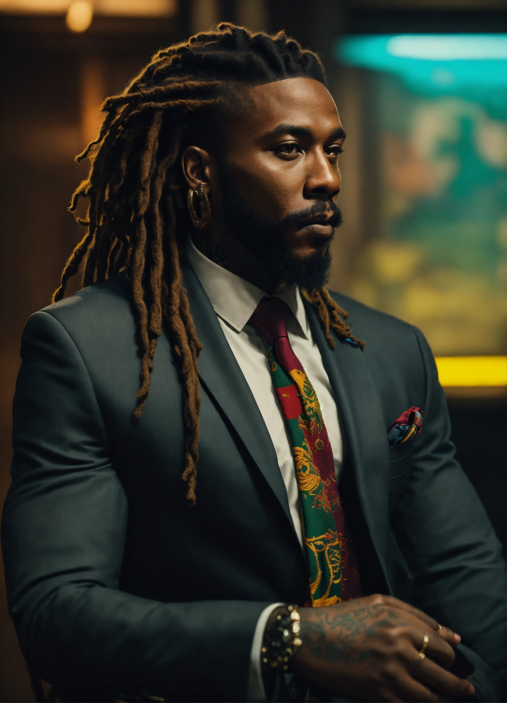 Black rasta man, dreads, tattoos, 8k portrait, highly detailed, beautiful, model pose, full body shot, business suit, cinematic, movie still, by greg rutkowski and mandy jurgens and diegokoi