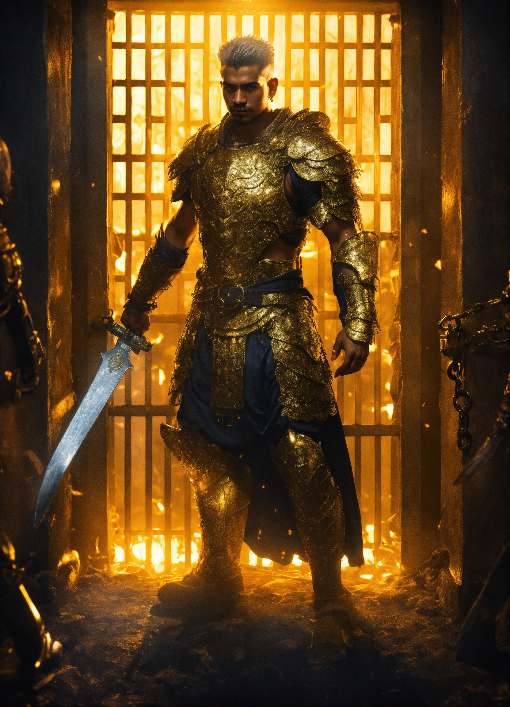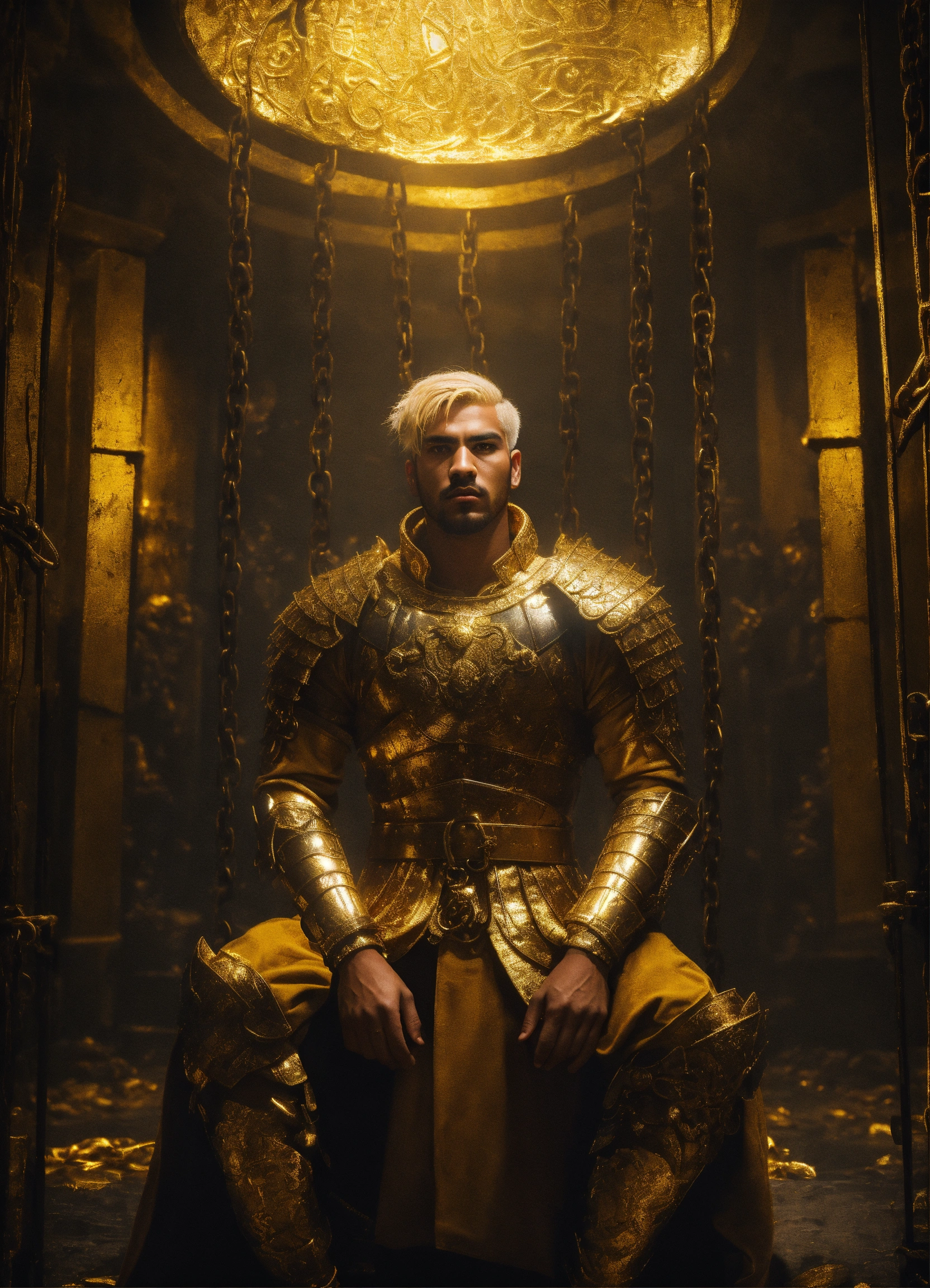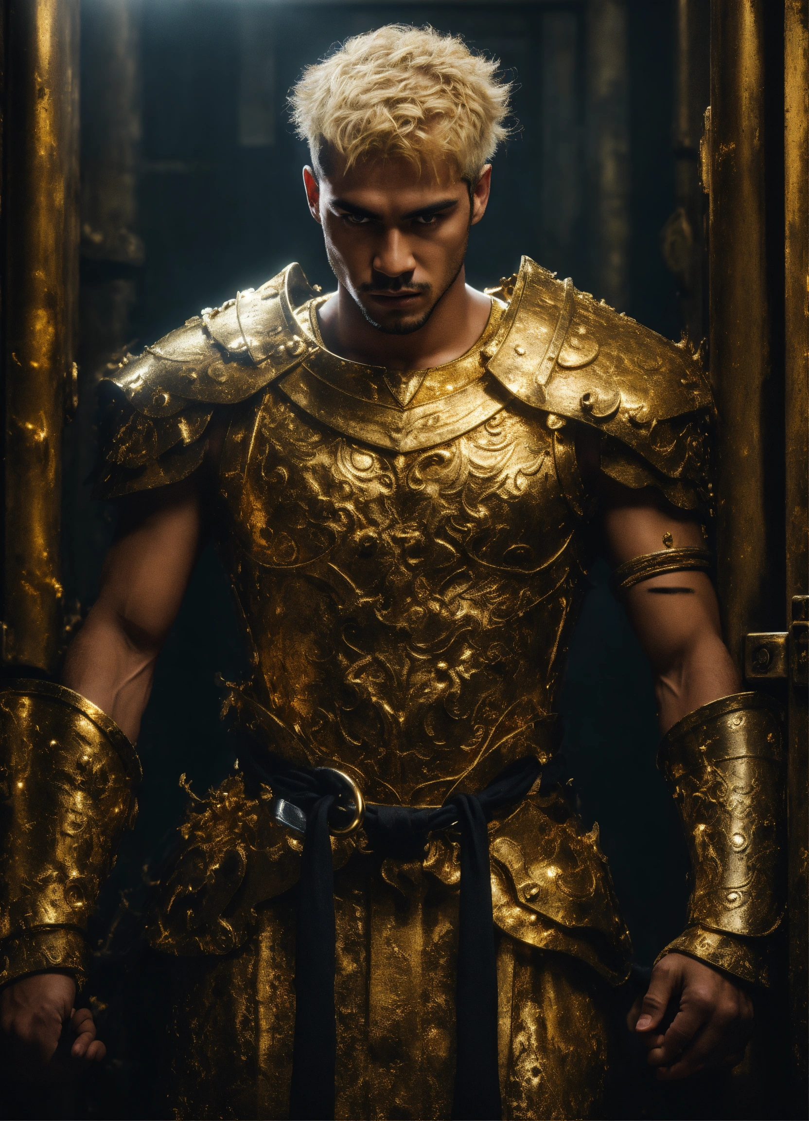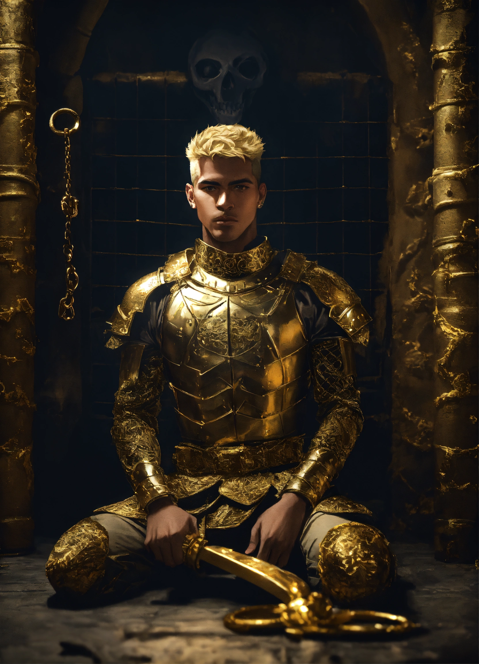 Handcuffed, a handsome ethnic male god, a strong prisoner with short blonde hair, wearing the remains of gold armor, held captive in a spooky dark cell with monstrous guards in the backgroundl, resolution 8k, insanely detailed