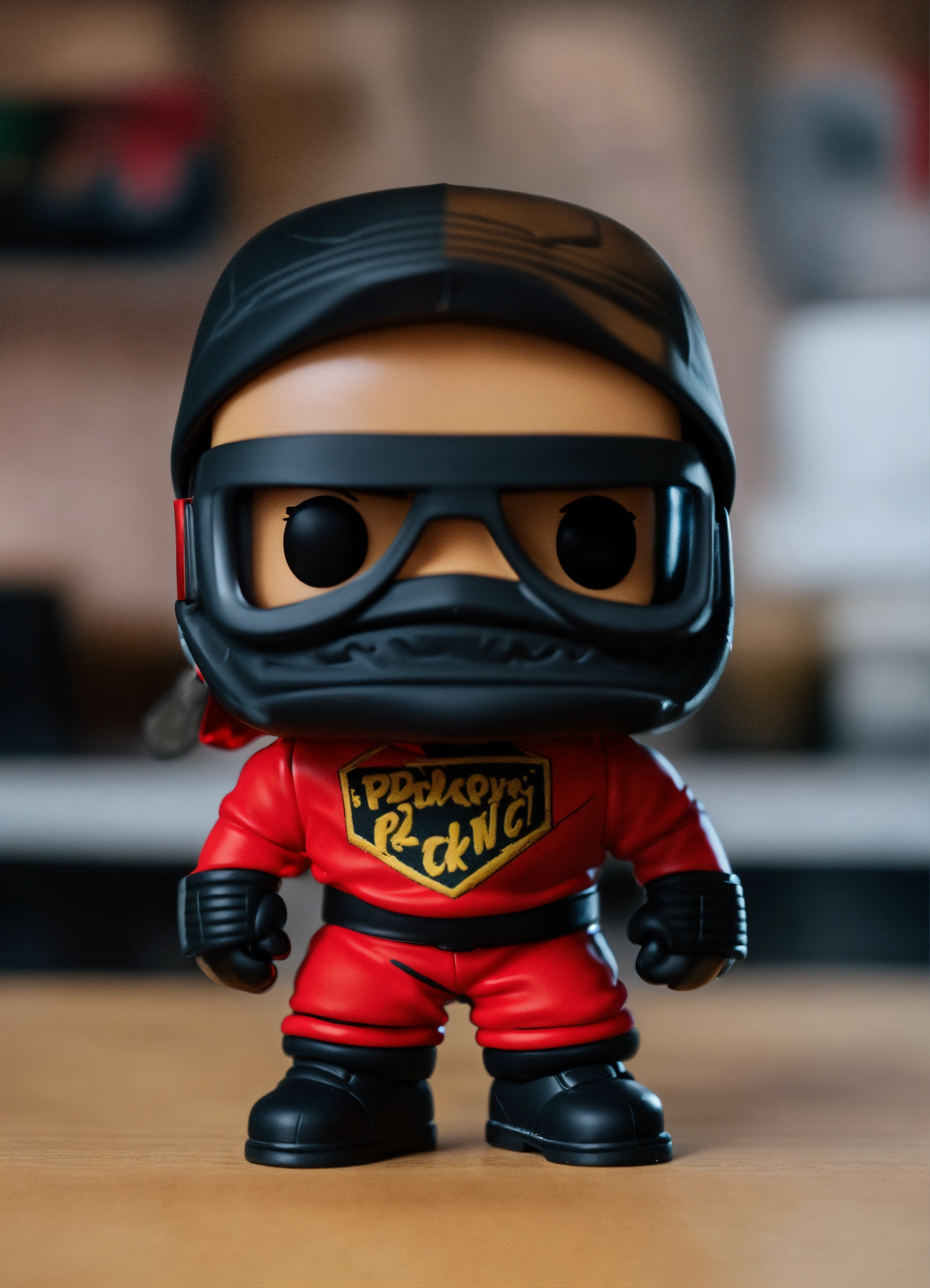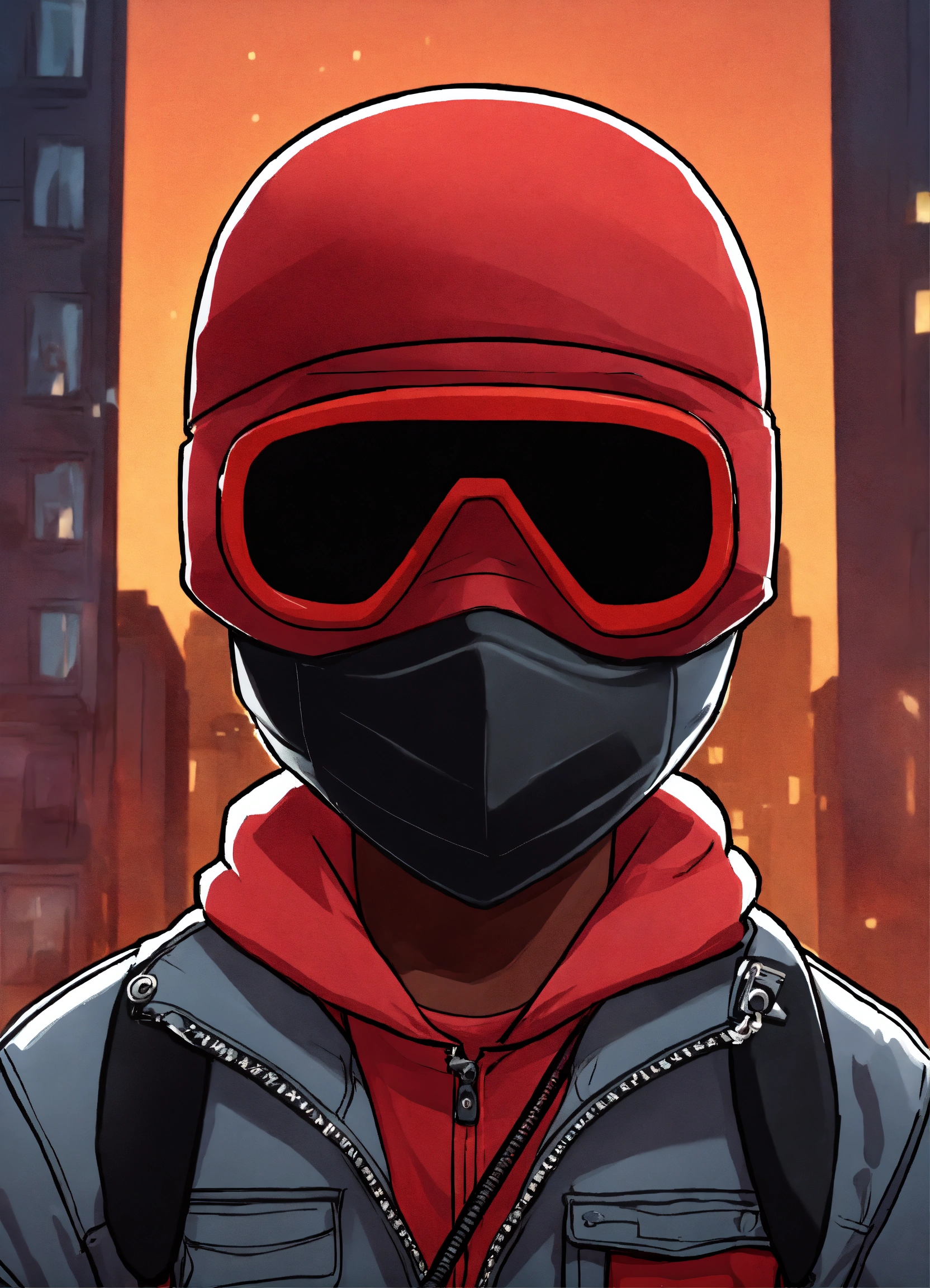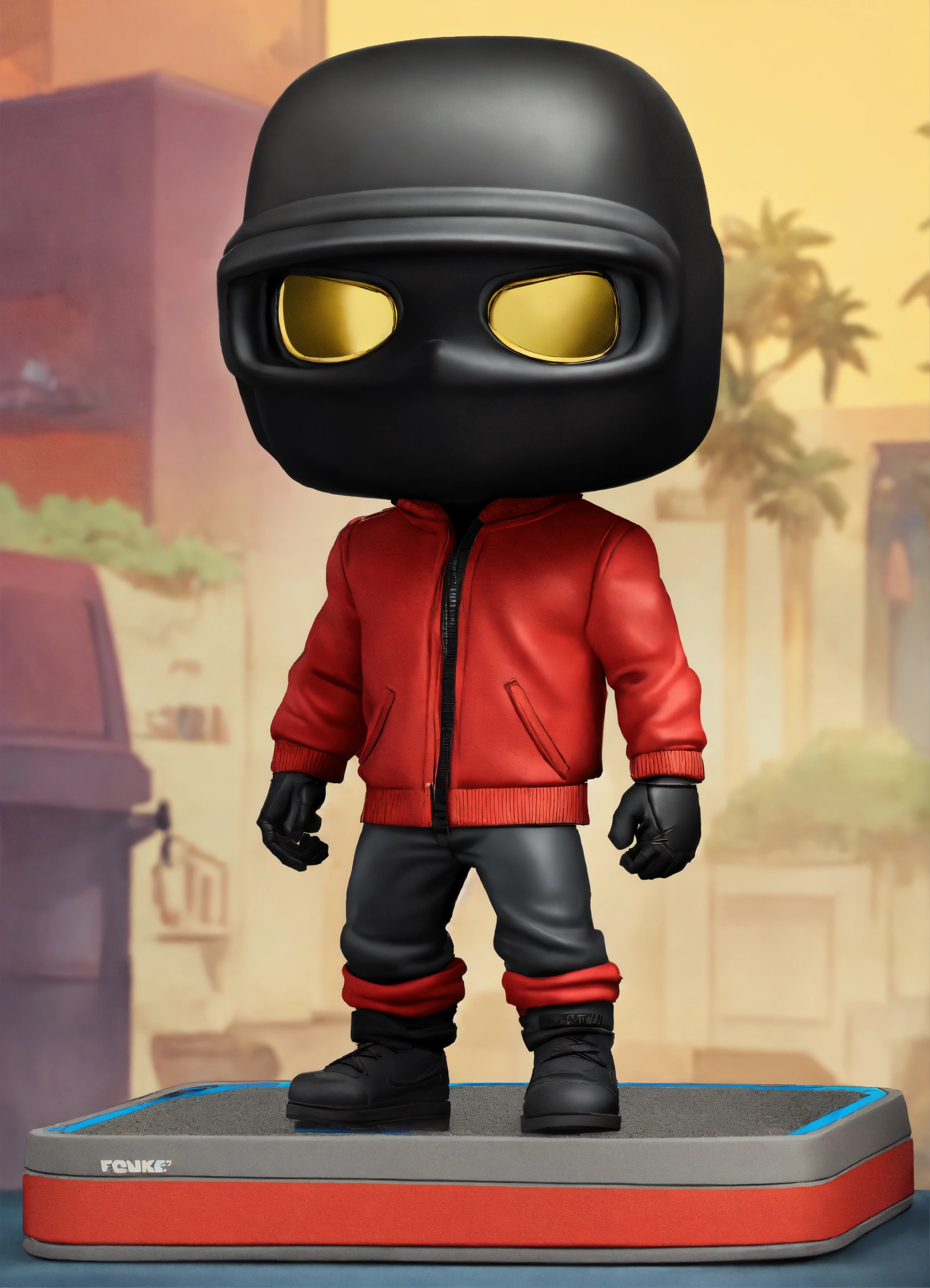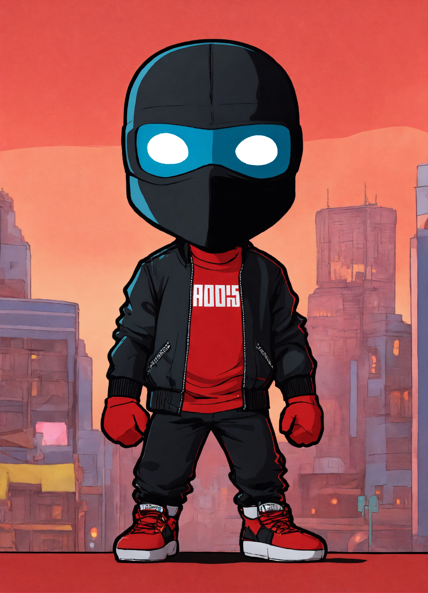 Animated cartoon with a black ski mask, funko pop style, red shirt, no glasses, are able to see his eyes