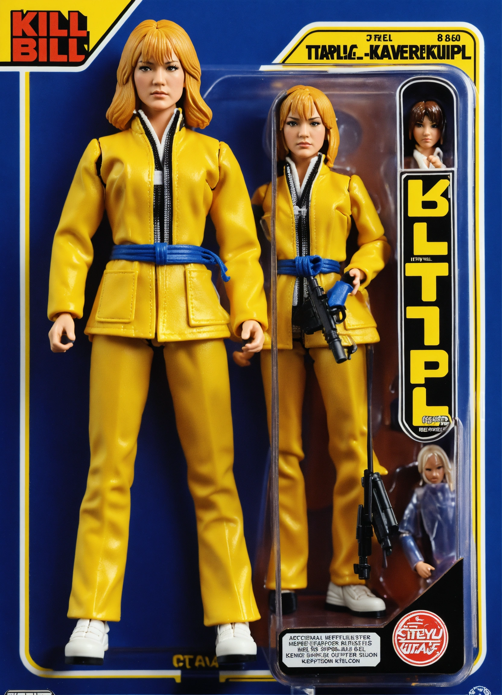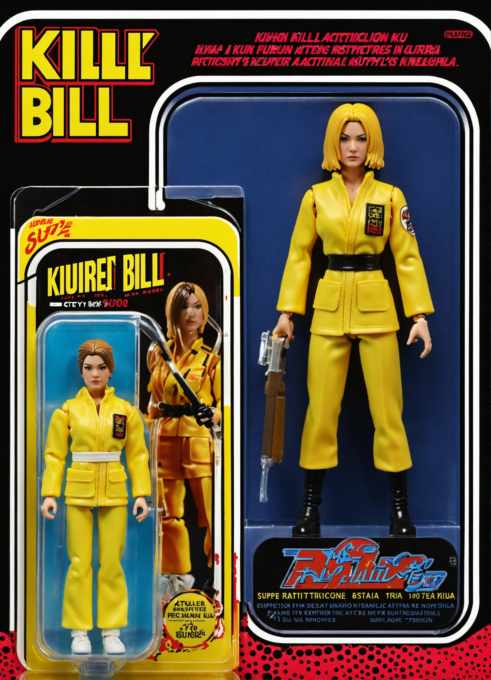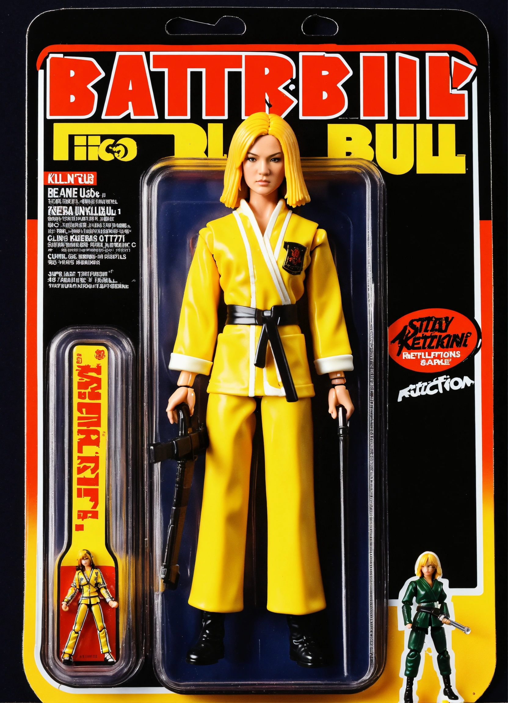 Create a kenner-style action figure or a super 7 reaction figure of beatrix kiddo from the movie kill bill. the figure should capture the retro aesthetic reminiscent of classic '70s and '80s kenner action figures, with meticulous attention to fine details such as her attire, yellow kung fu suit and distinctive features. stay true to the high-quality craftsmanship and attention to detail characteristic of kenner's action figures from the '70s and '80s. additionally, design packaging in the style of either kenner or super 7 reaction packaging.