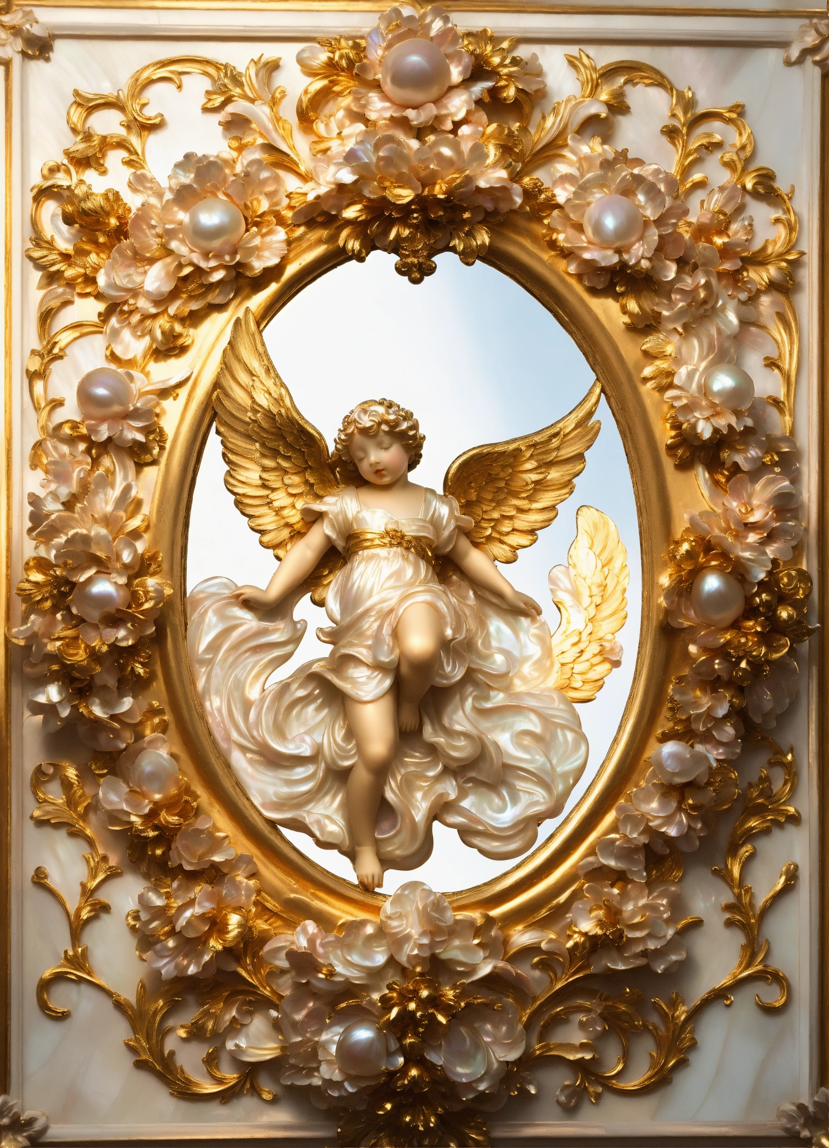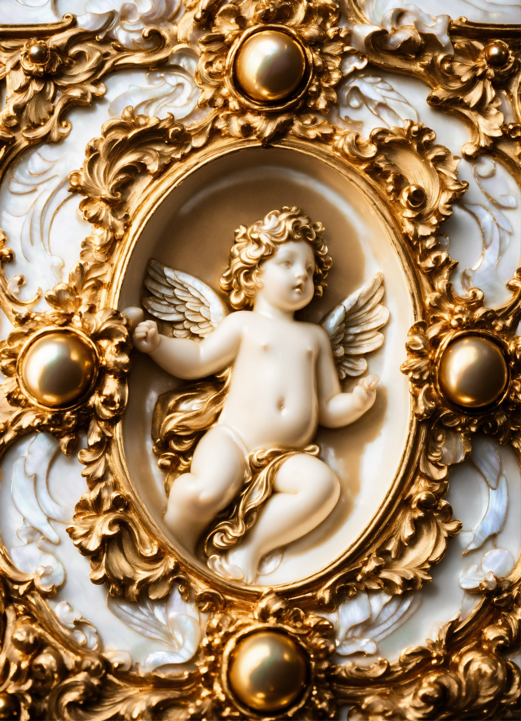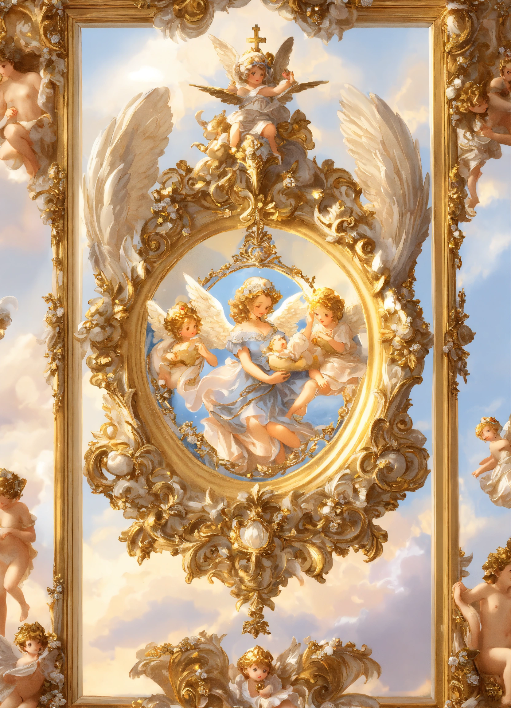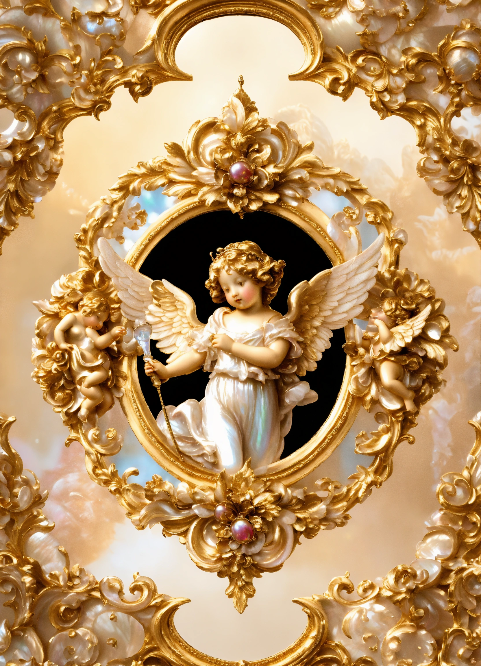 Logo is bold, mirrored, renaissance style. pearlescent satin glittering ivory white background. angel cherubs flying around the spires, beautiful, christmas ornament, luxury, catholic, mother of pearl, champagne gold and bright gold, rococo frame, mother of pearl rococo frame, white plaster angels, gold rings