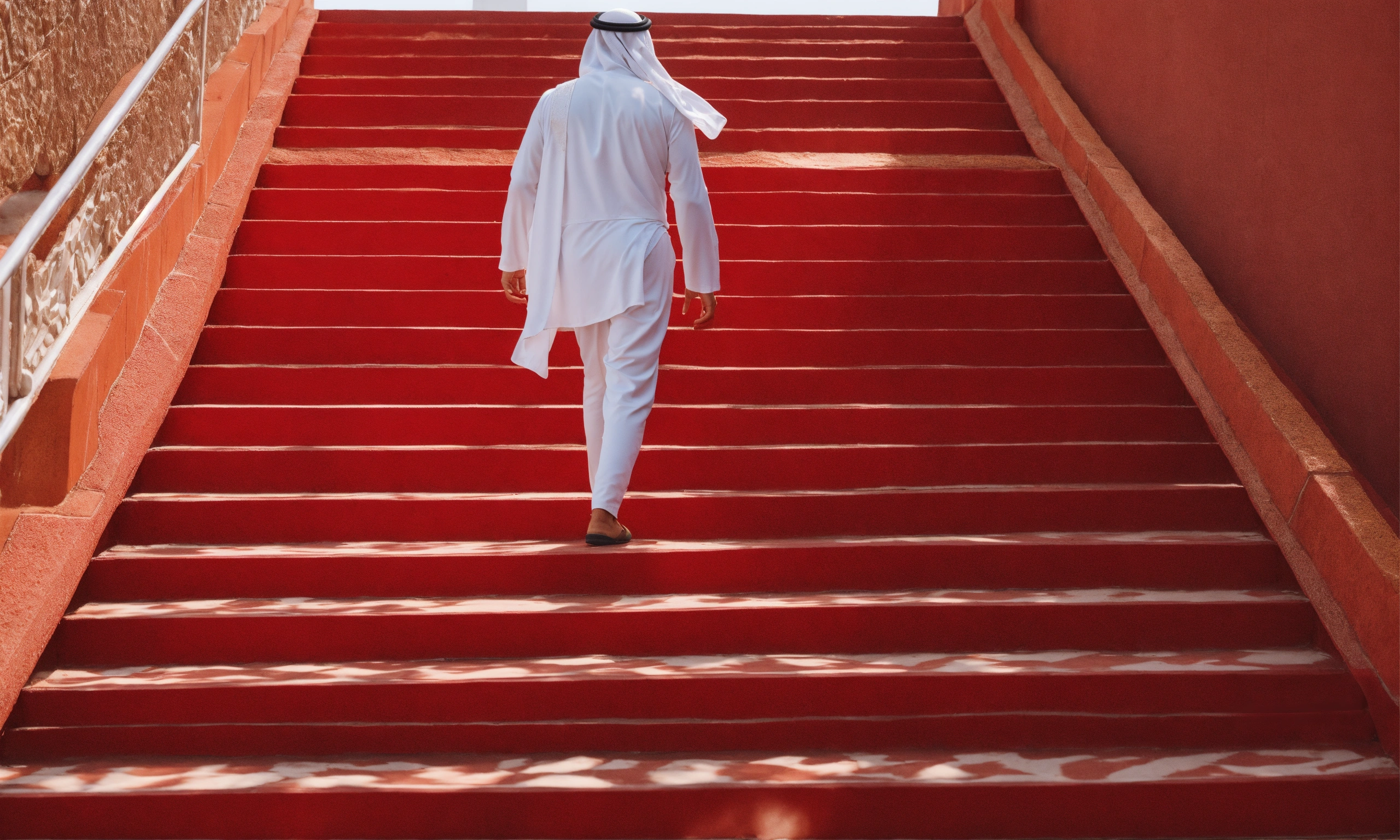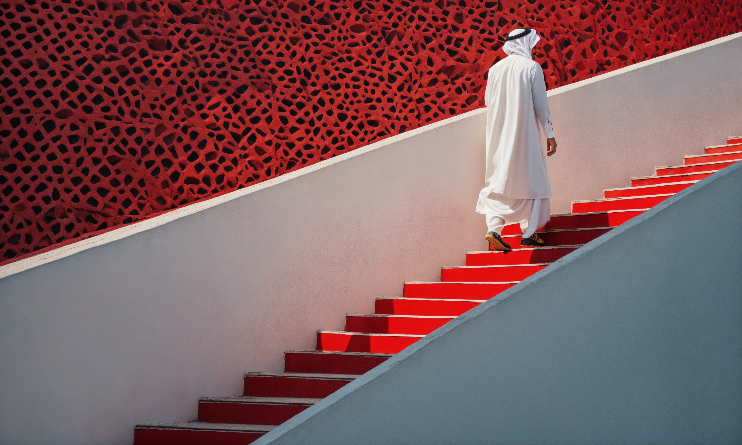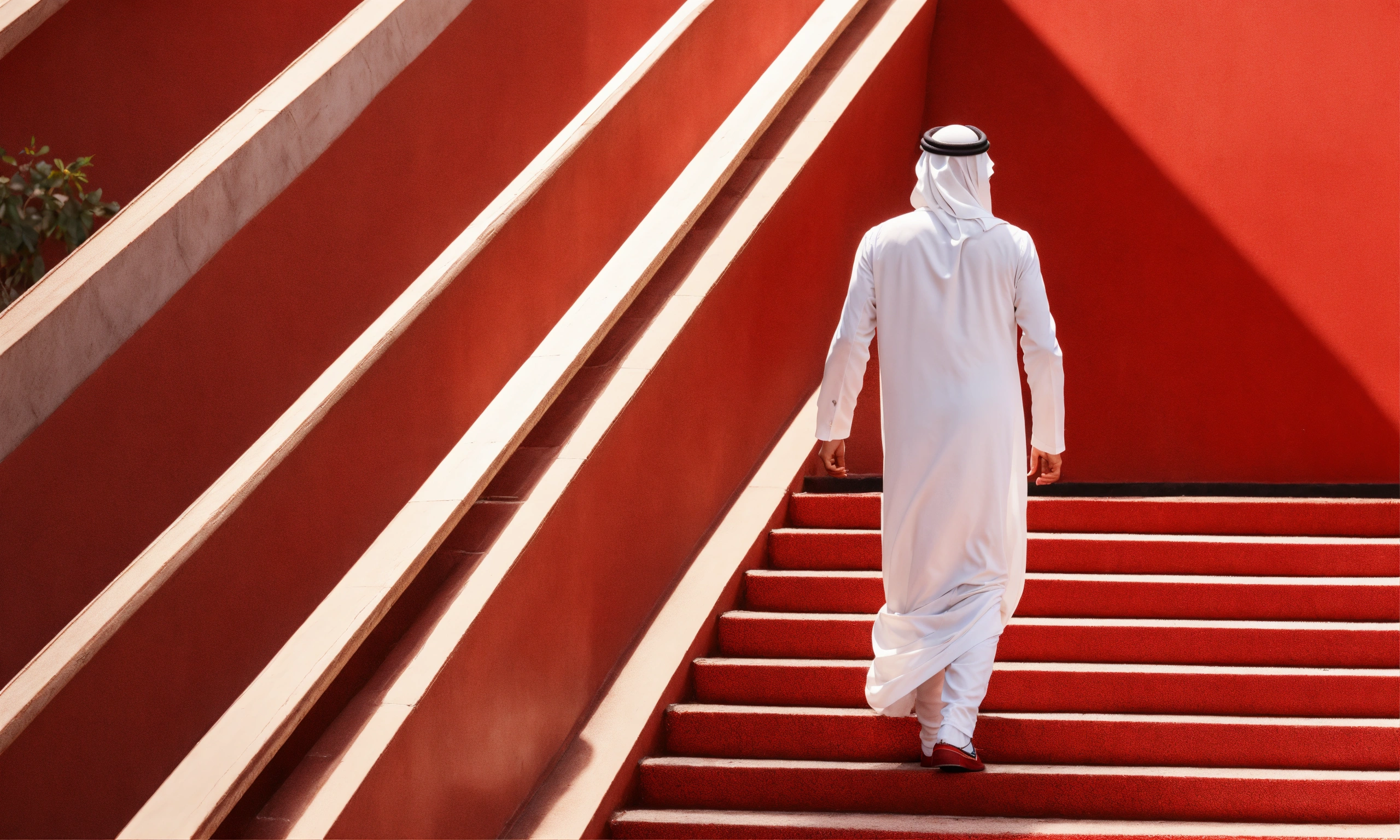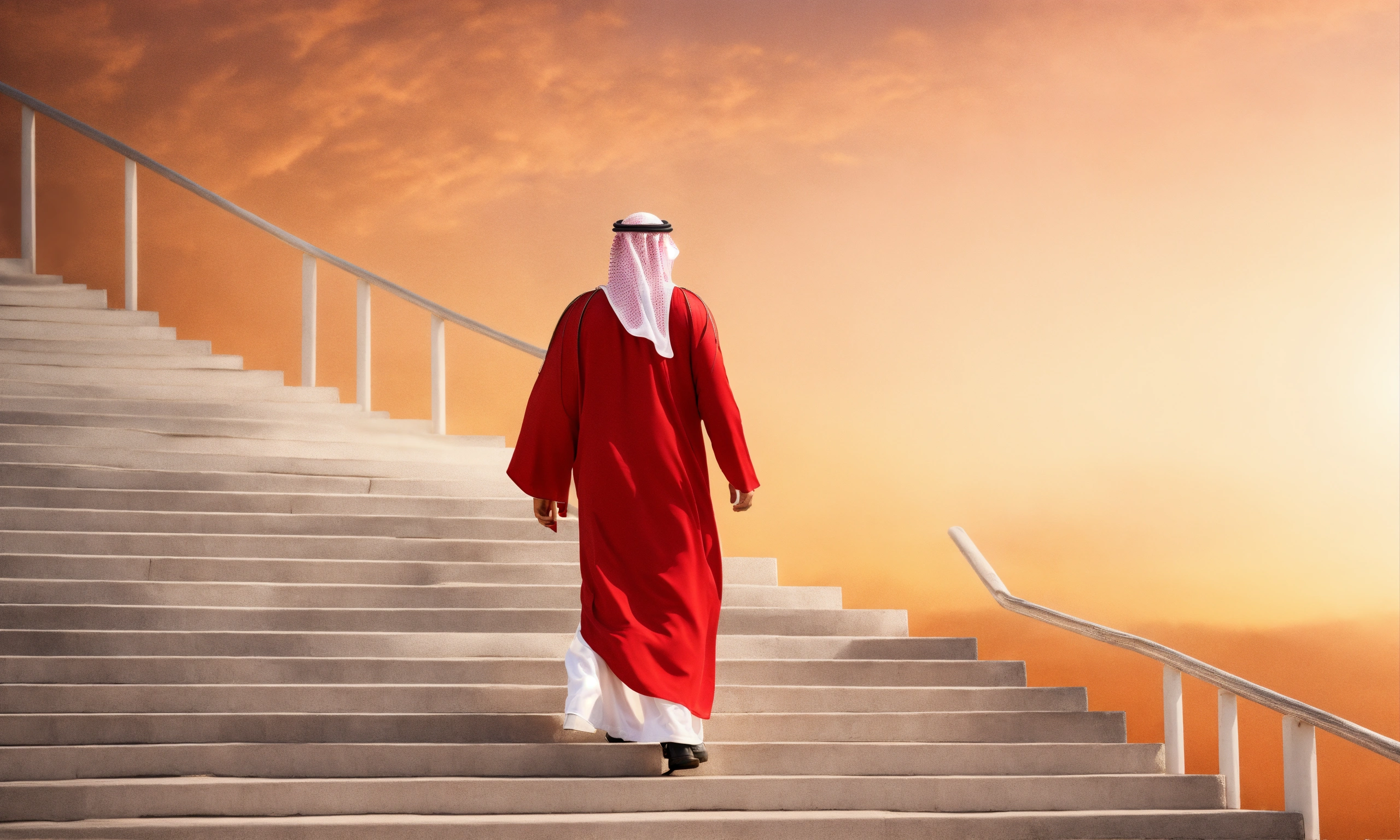 Saudi man climbing up steps, looking right, side-way, climbing up, white costume, saudi head cover, red pattern, close up, natural light, warm, photo-realistic, 8k, high definition
