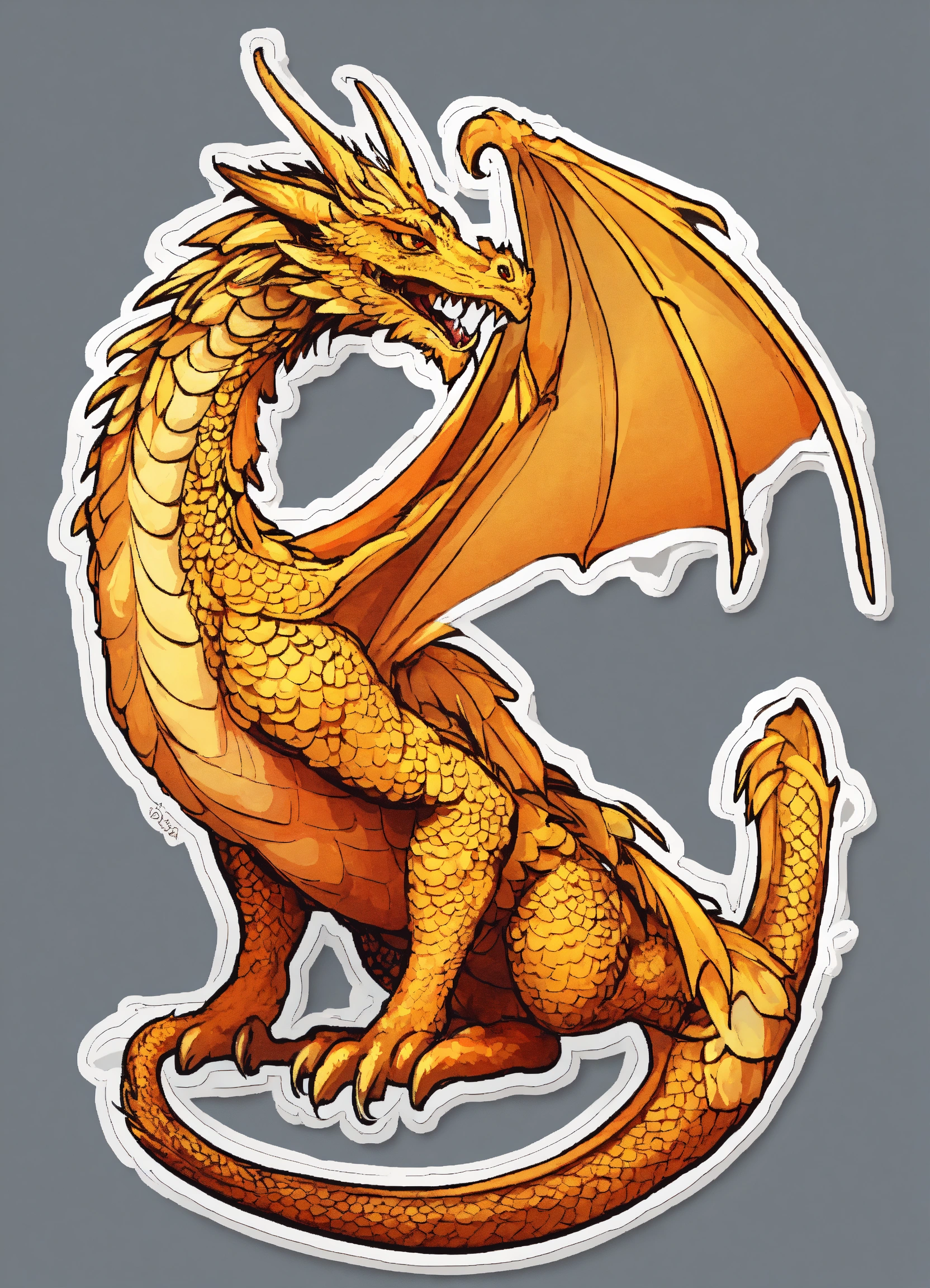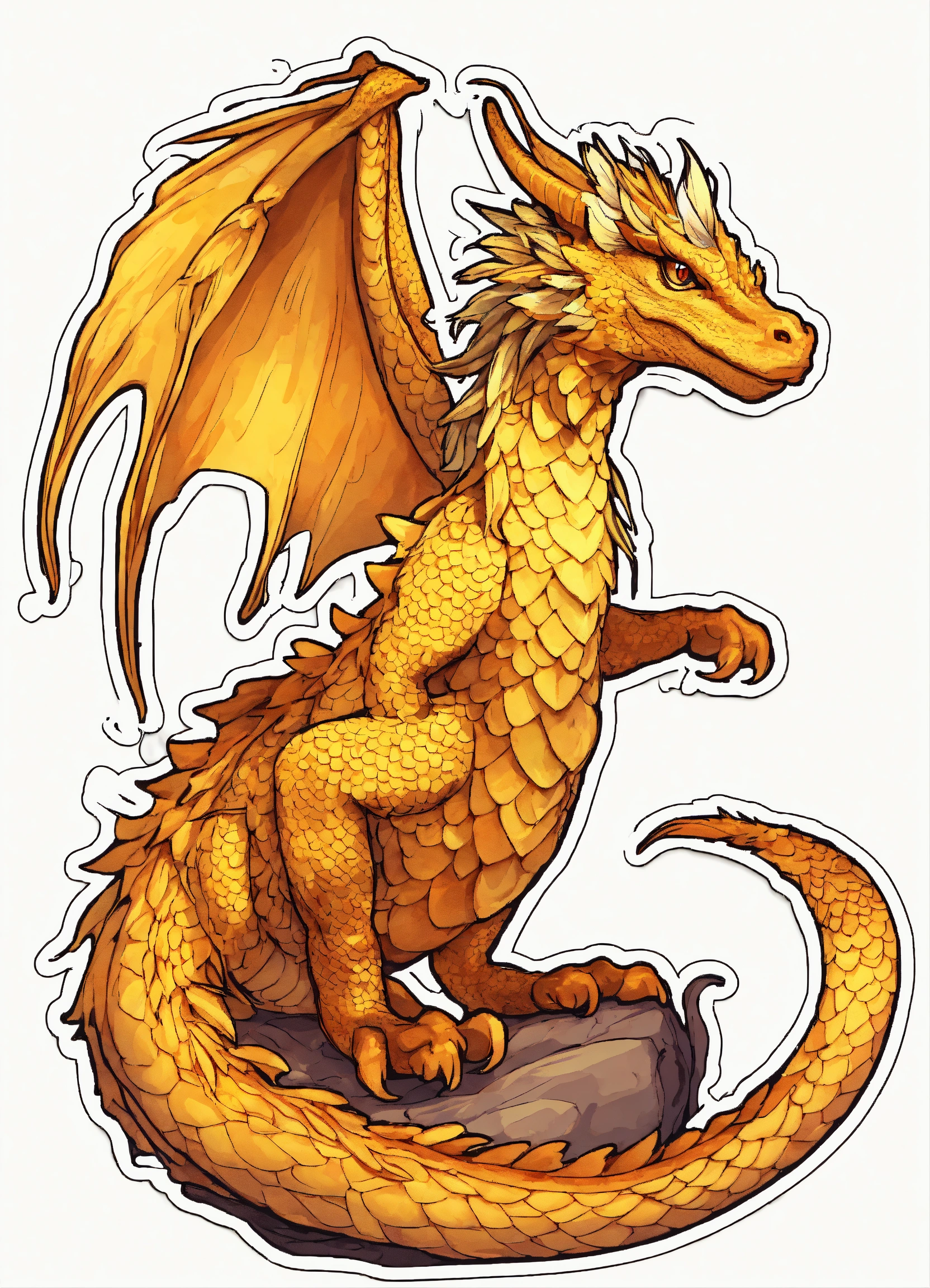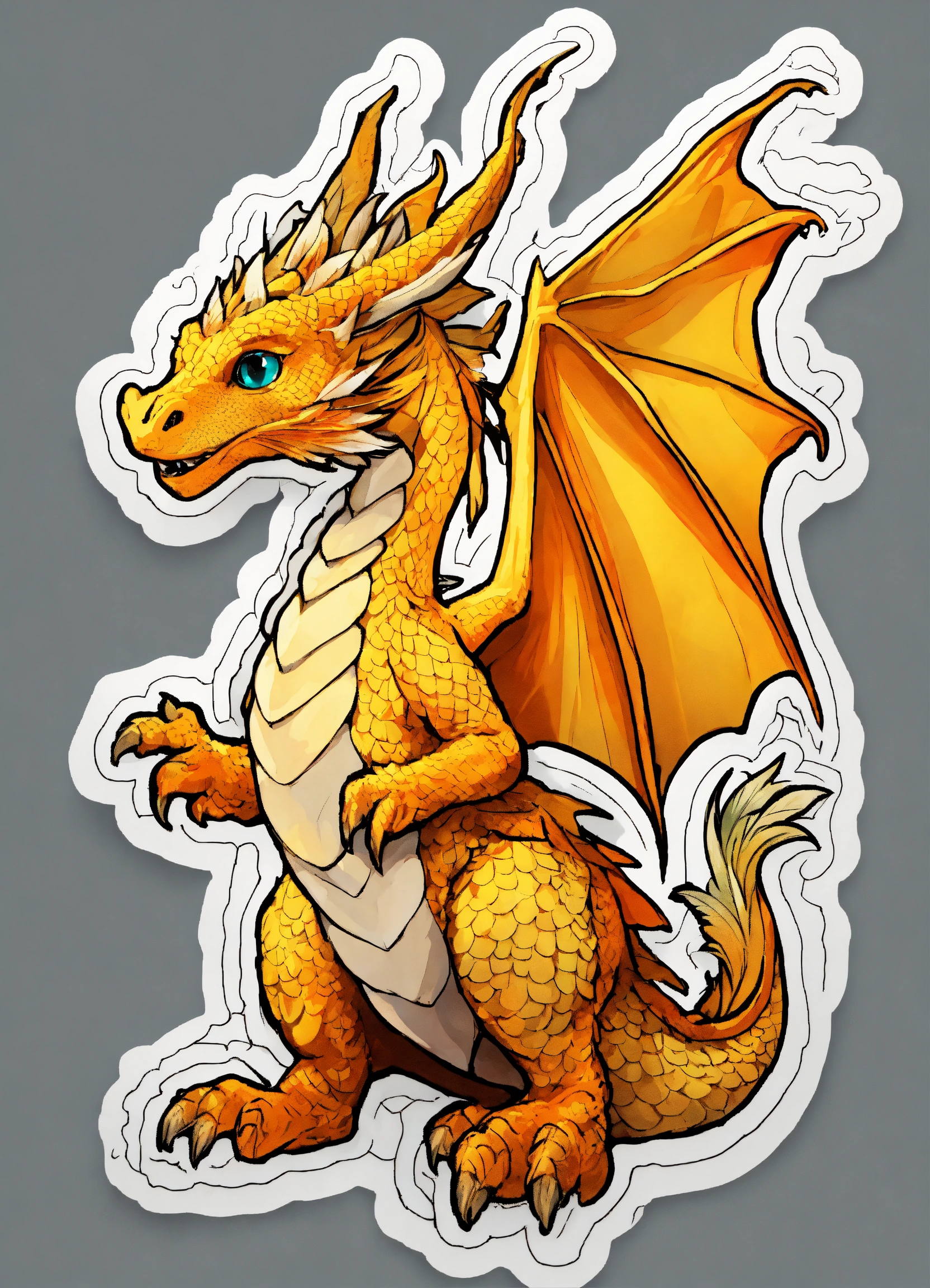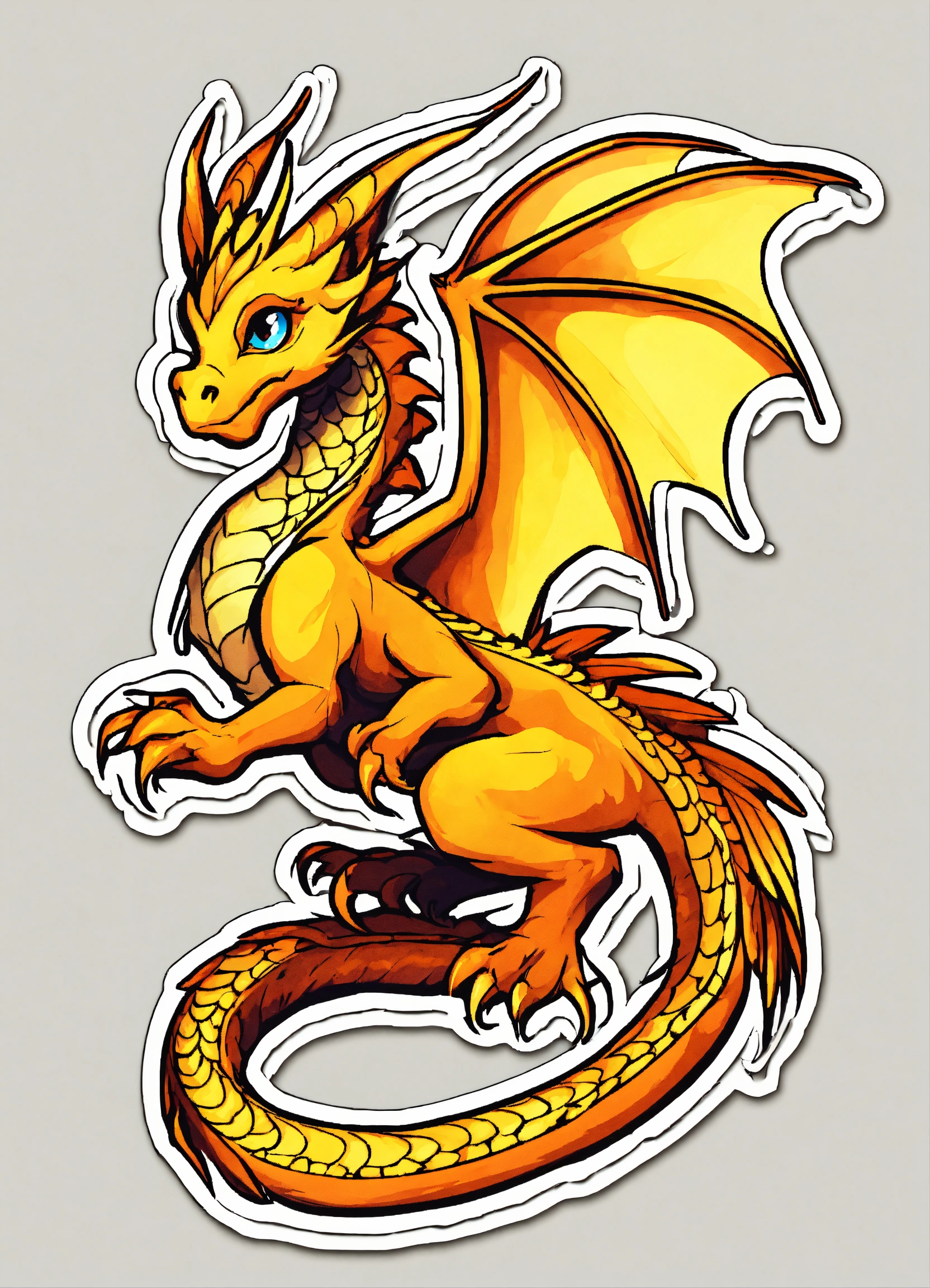Sticker, young dragon, full body, yellow and orange, beautiful eyes, with feather like scales on its tail, flying, detailed, beautifuly rendered, vector, contour, white background