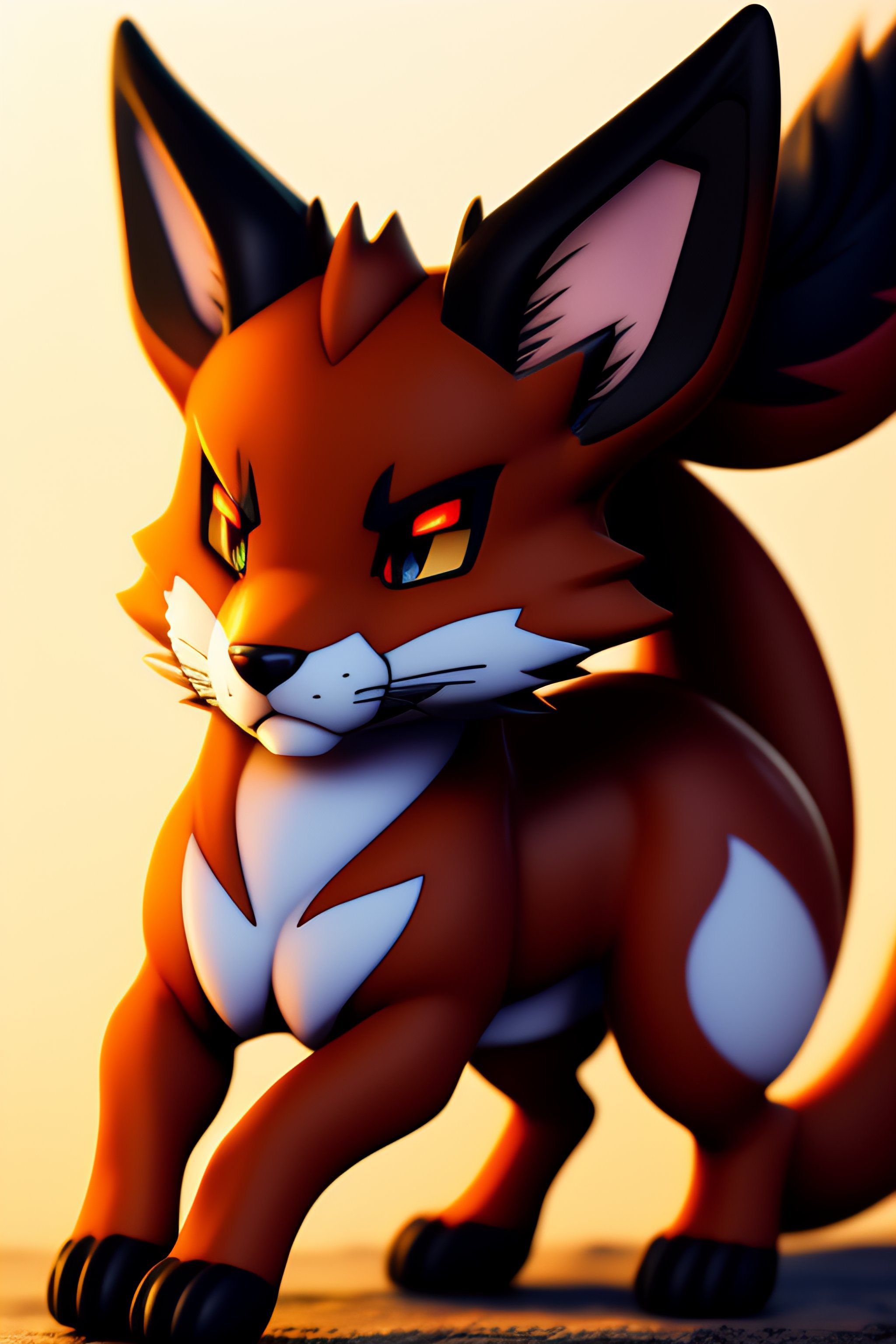 A dark type legendary pokémon resembling a cunning, ferocious fox with sharp swords orbiting it’s head, award winning manga pokemon