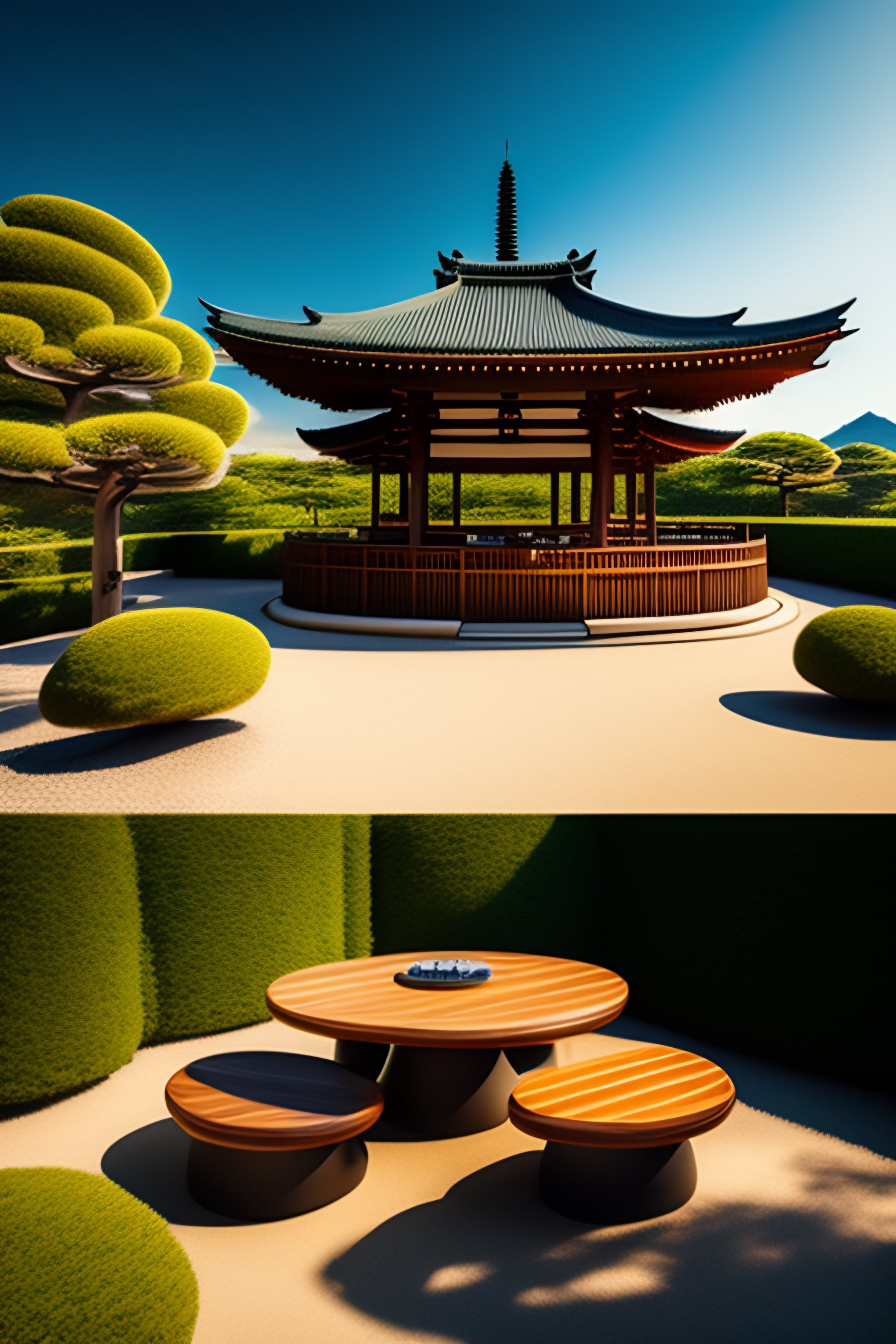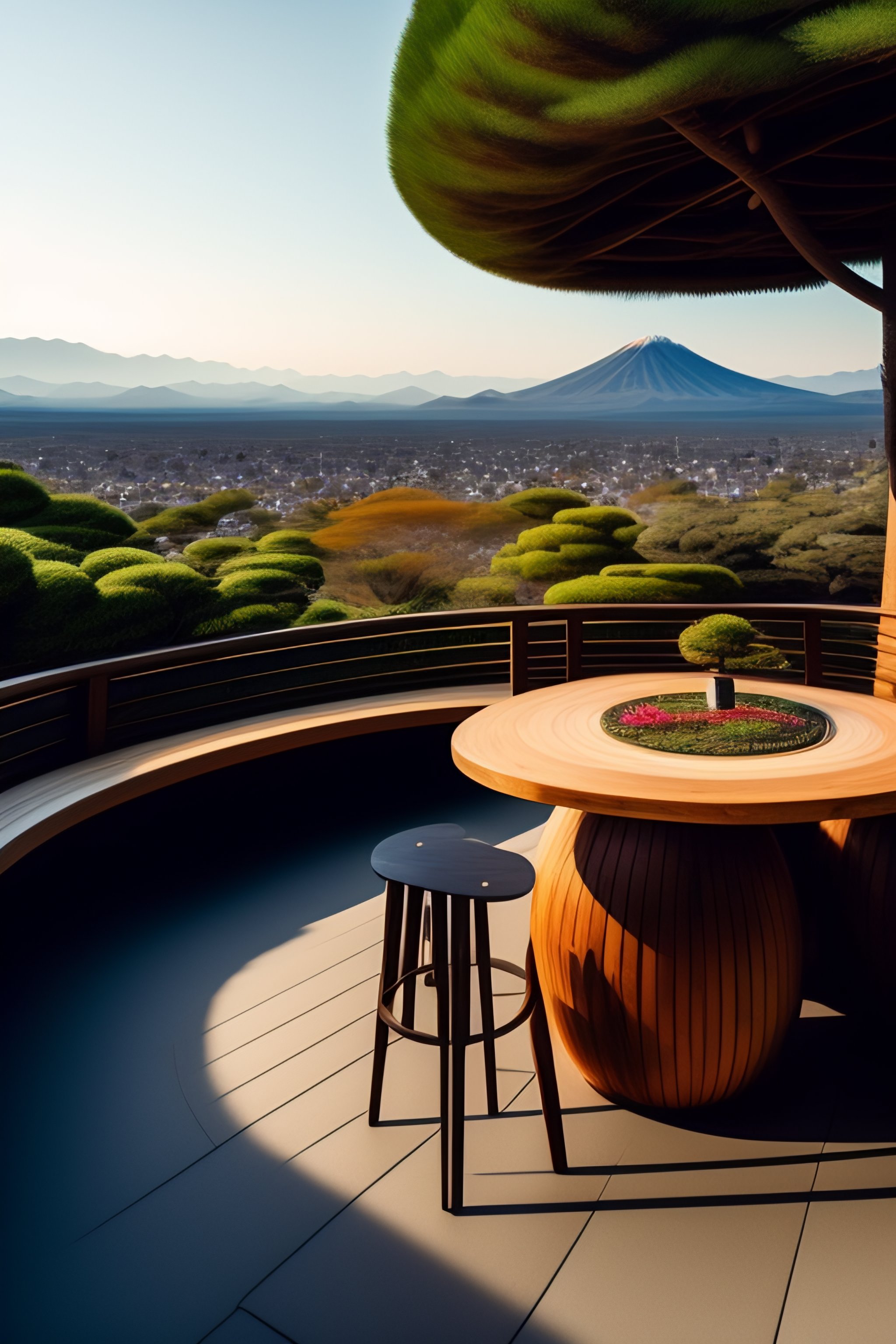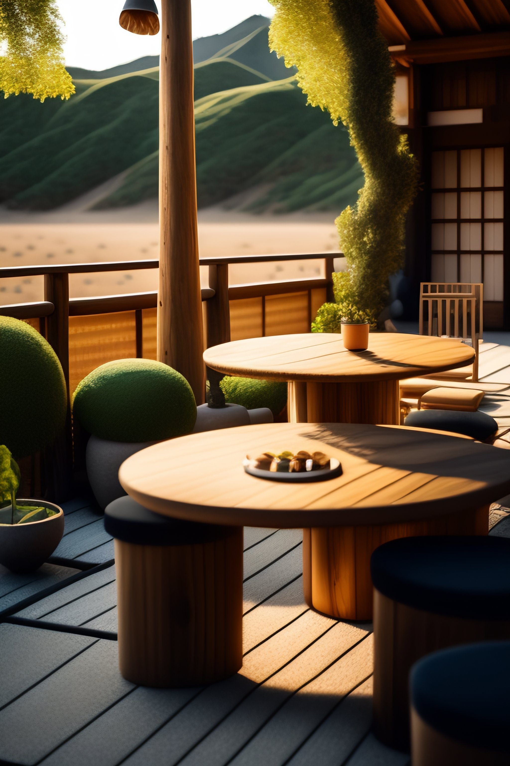Japan, terrace, food, desert, teahouse plant eating and drinking space outside the store, trees, round table, wooden round table around trees