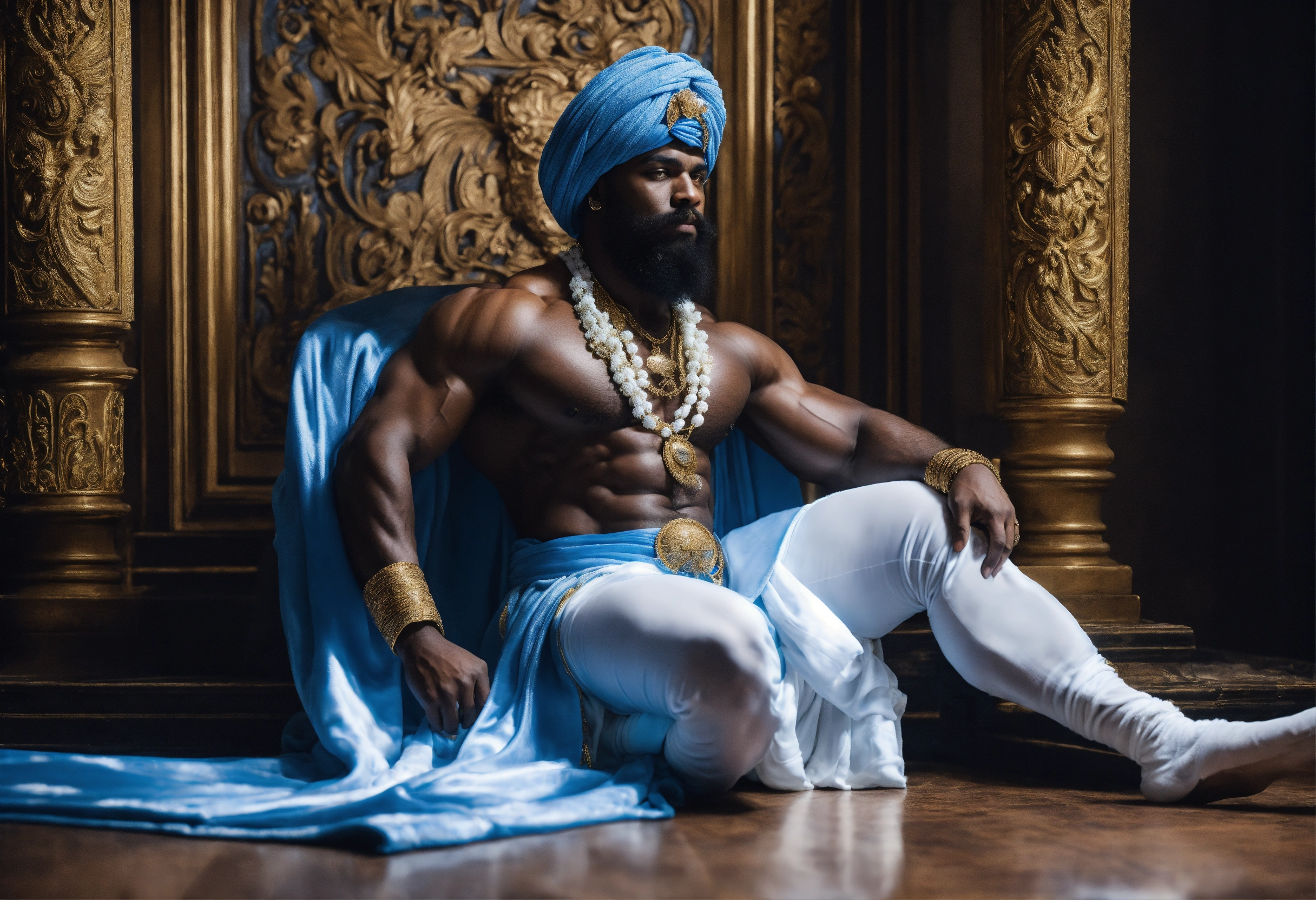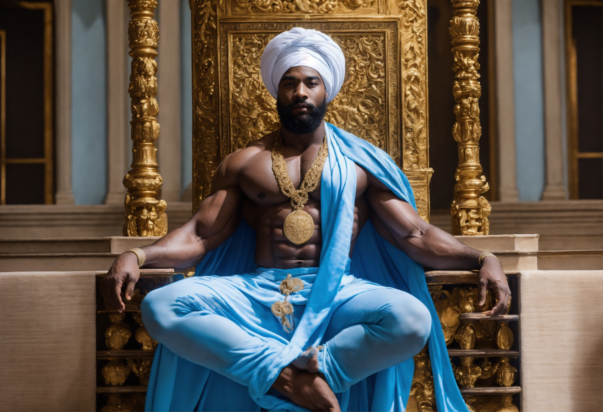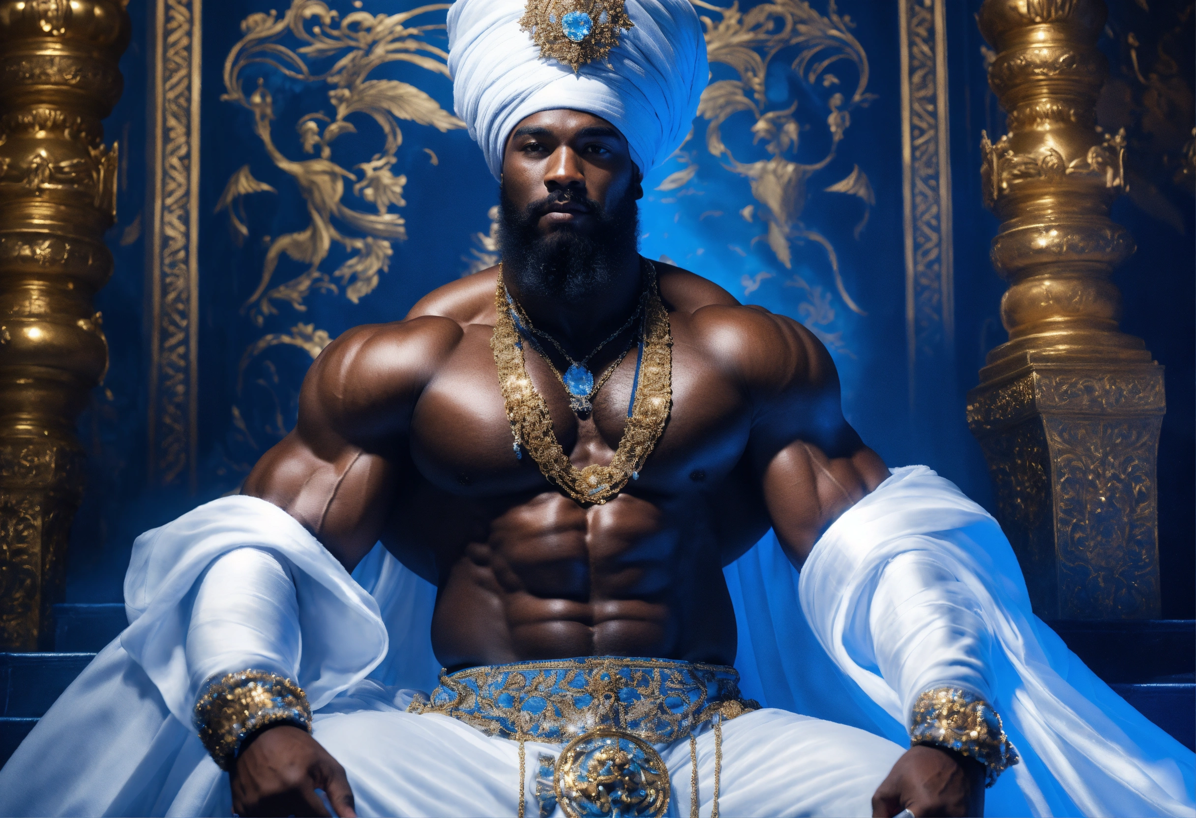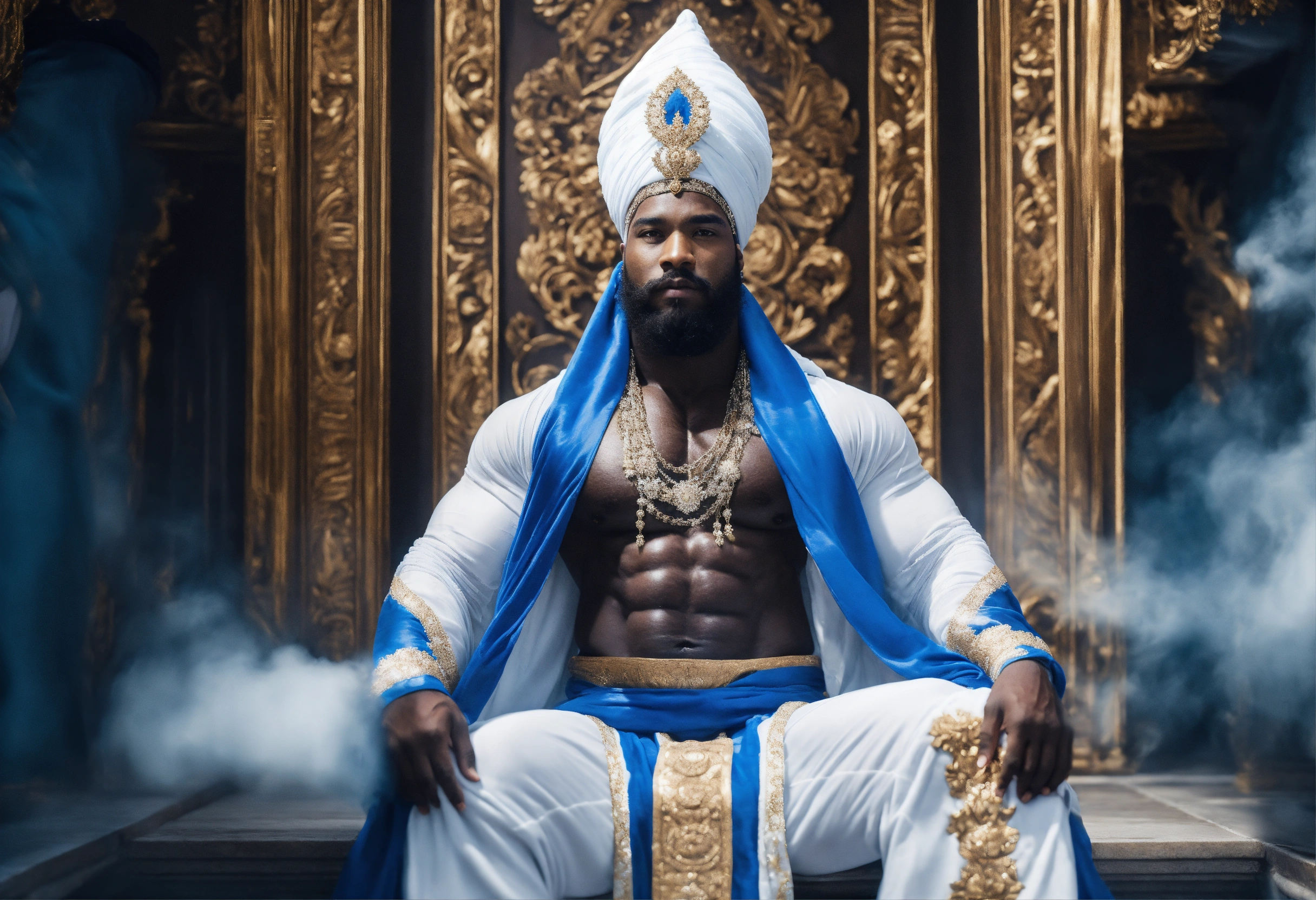 A black god king in white turban, in beautiful sheer blue and white robe, bodybuilder, beard, black magic, strong legs, palace