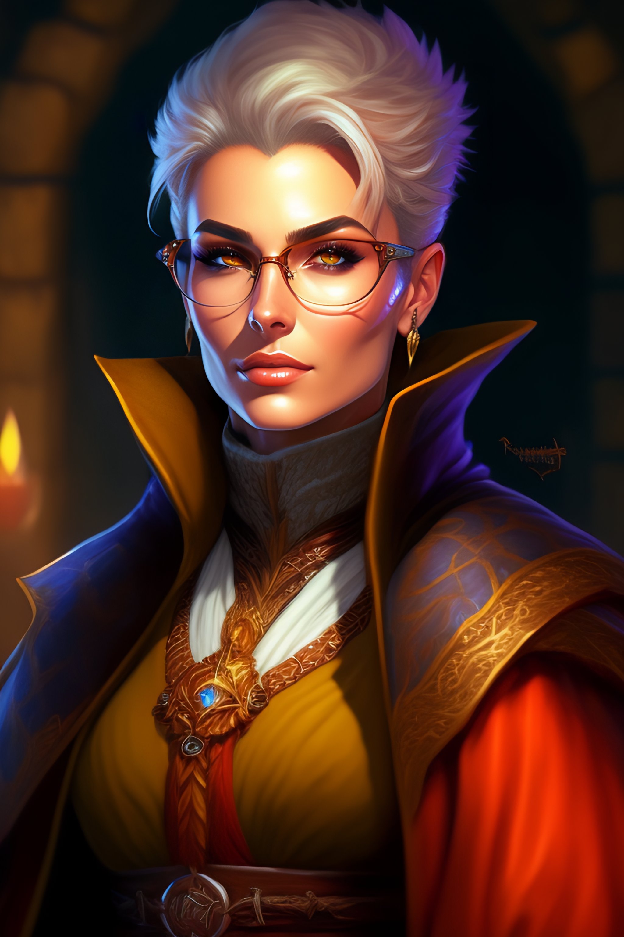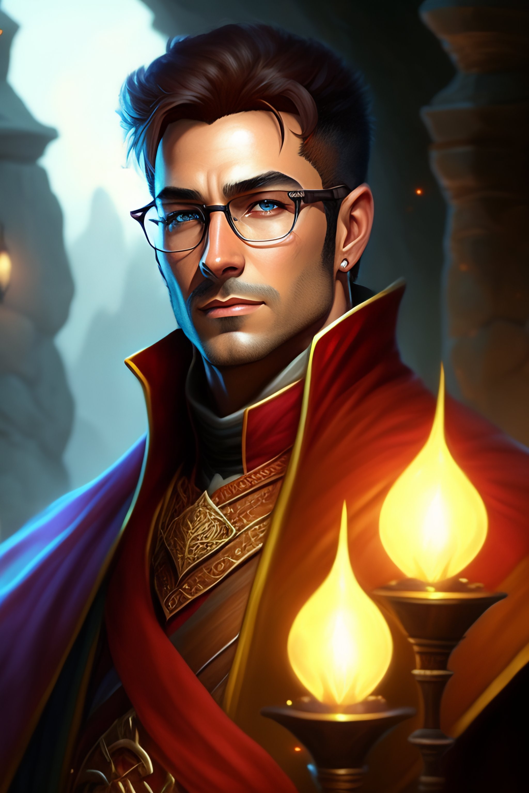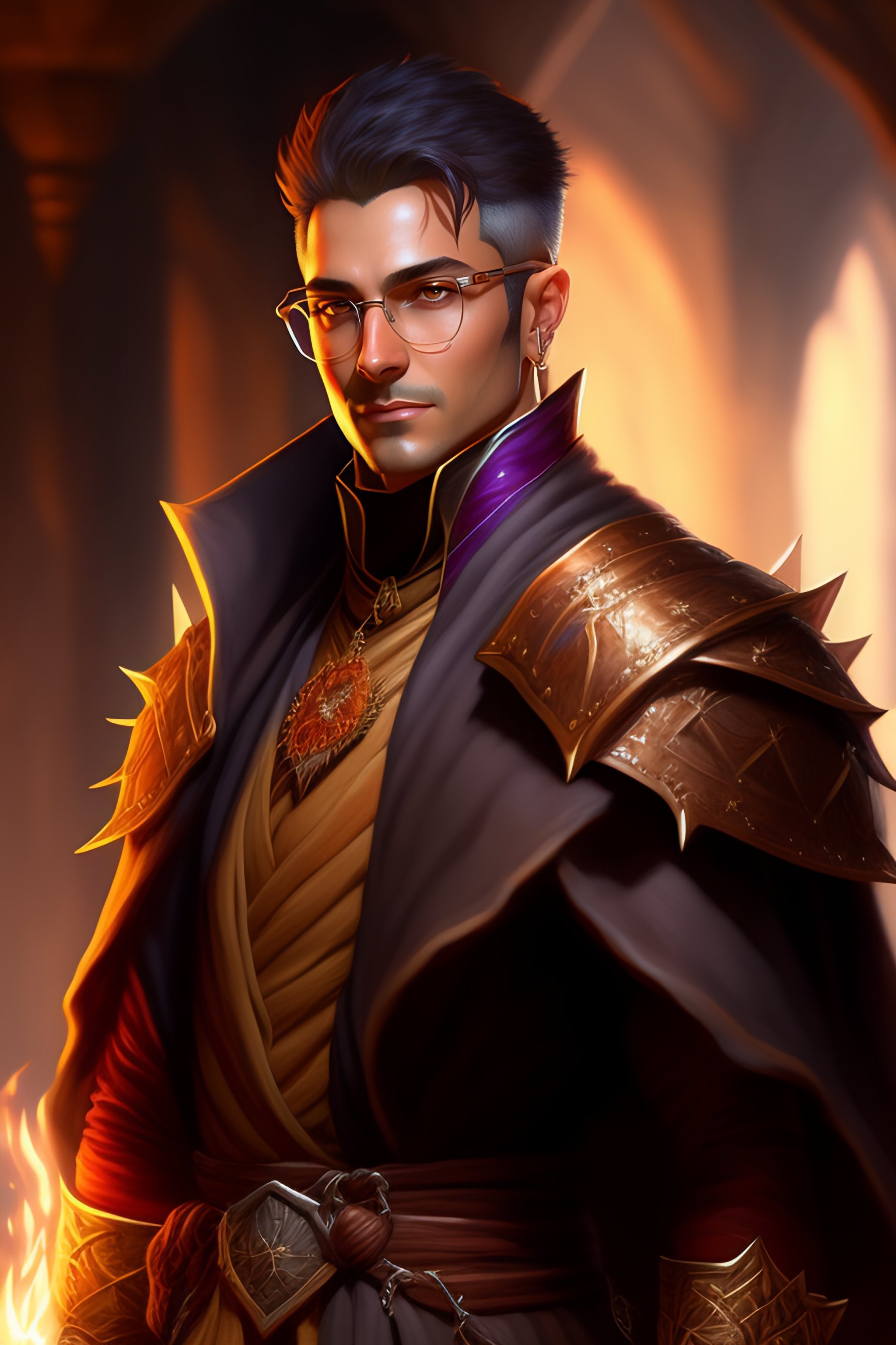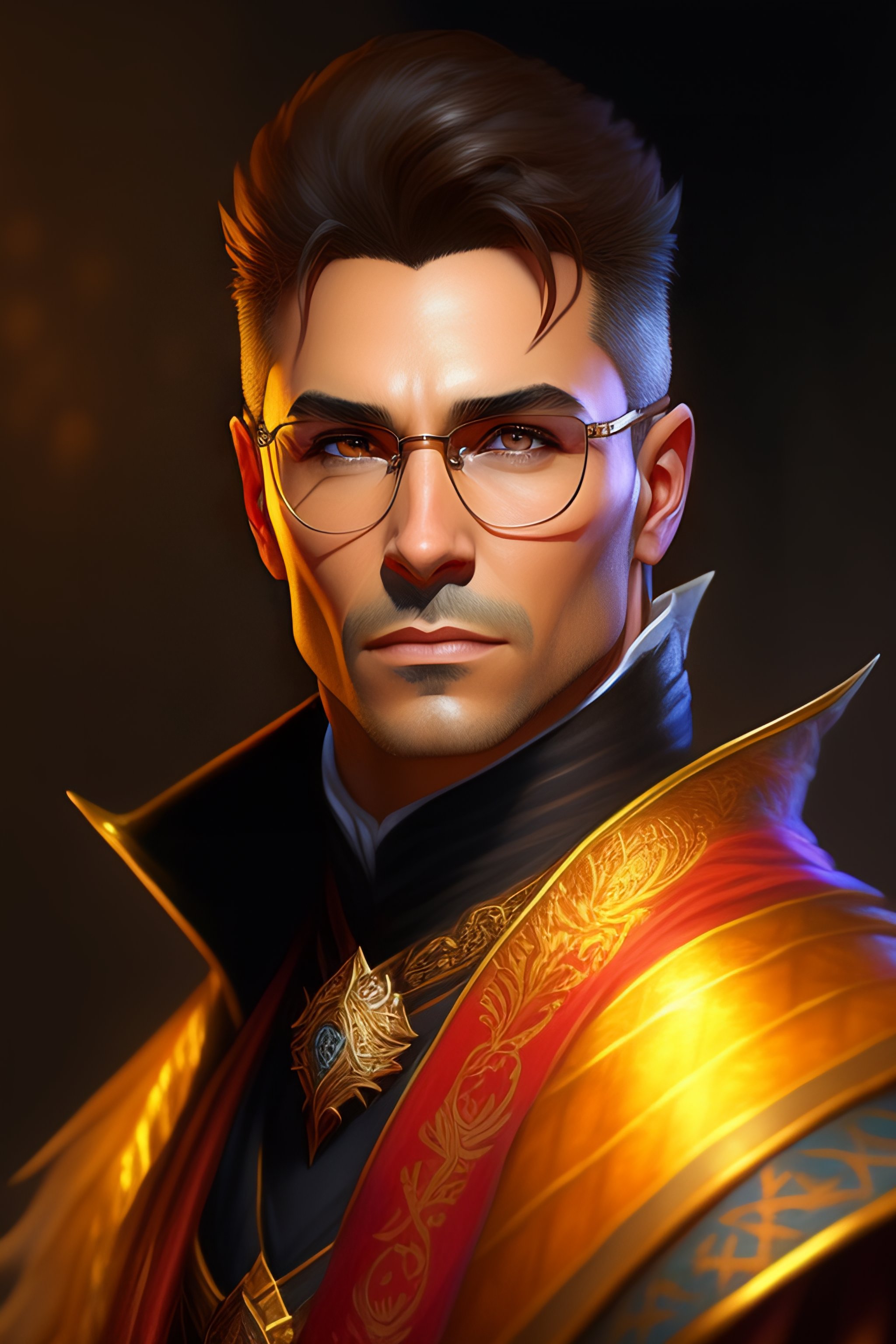 Spiky brown very short hair and glasses mage wearing robe, dndbeyond, bright, colourful, realistic, dnd character portrait, full body, pathfinder, pinterest, art by ralph horsley, dnd, rpg, lotr game design fanart by concept art, behance hd, artstation, deviantart, hdr render in unreal engine 5