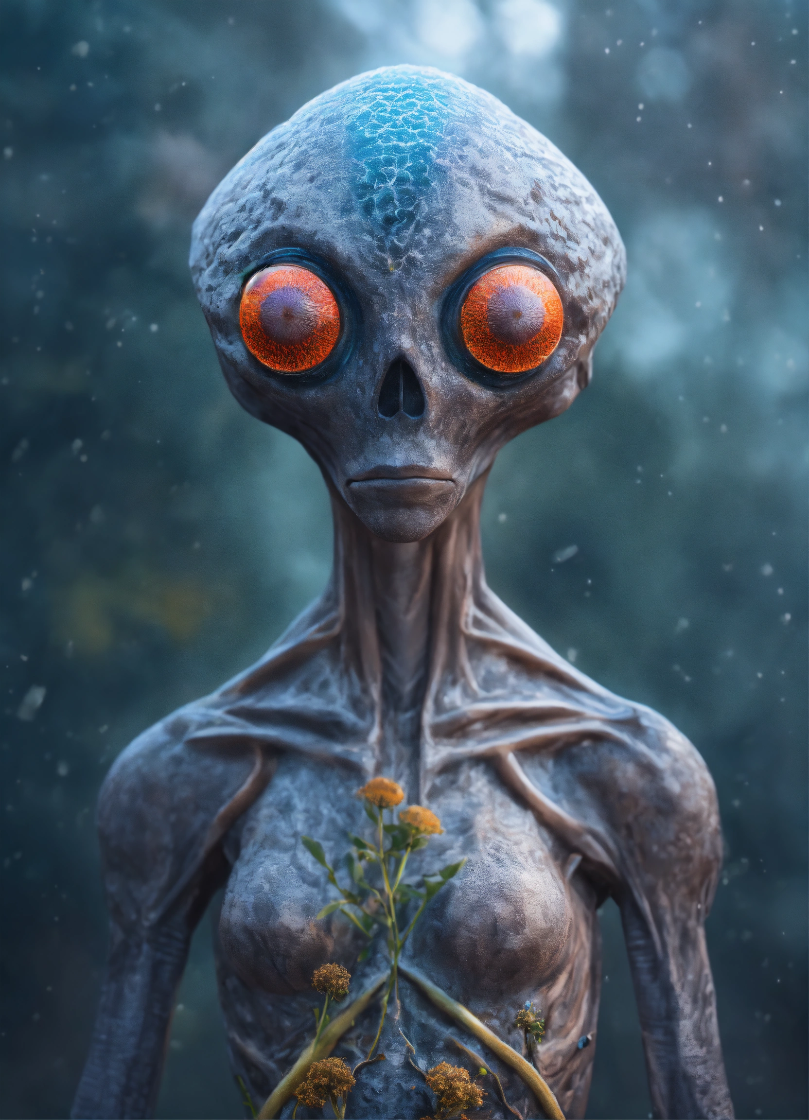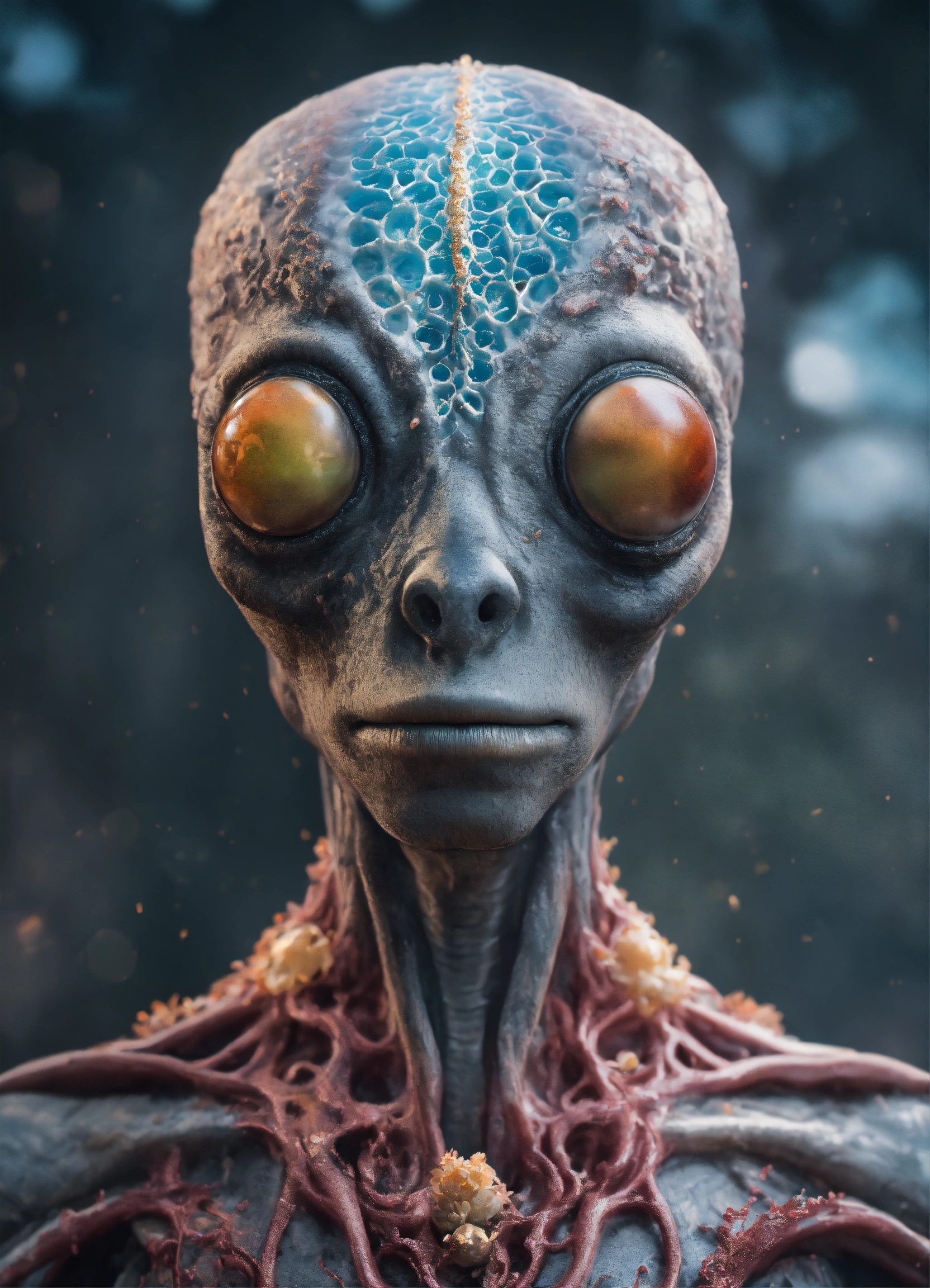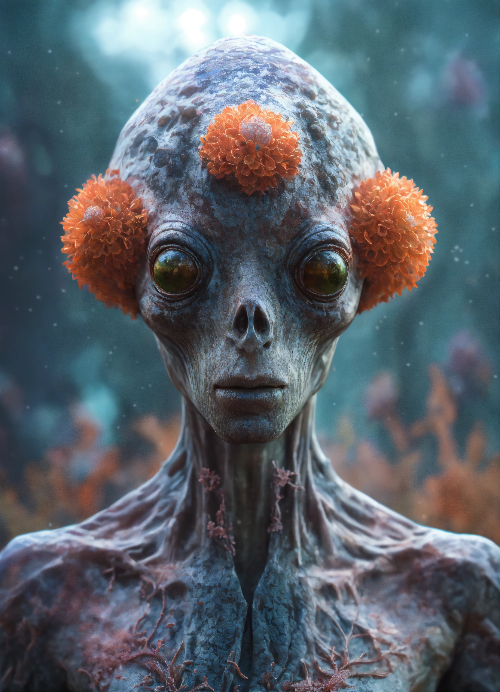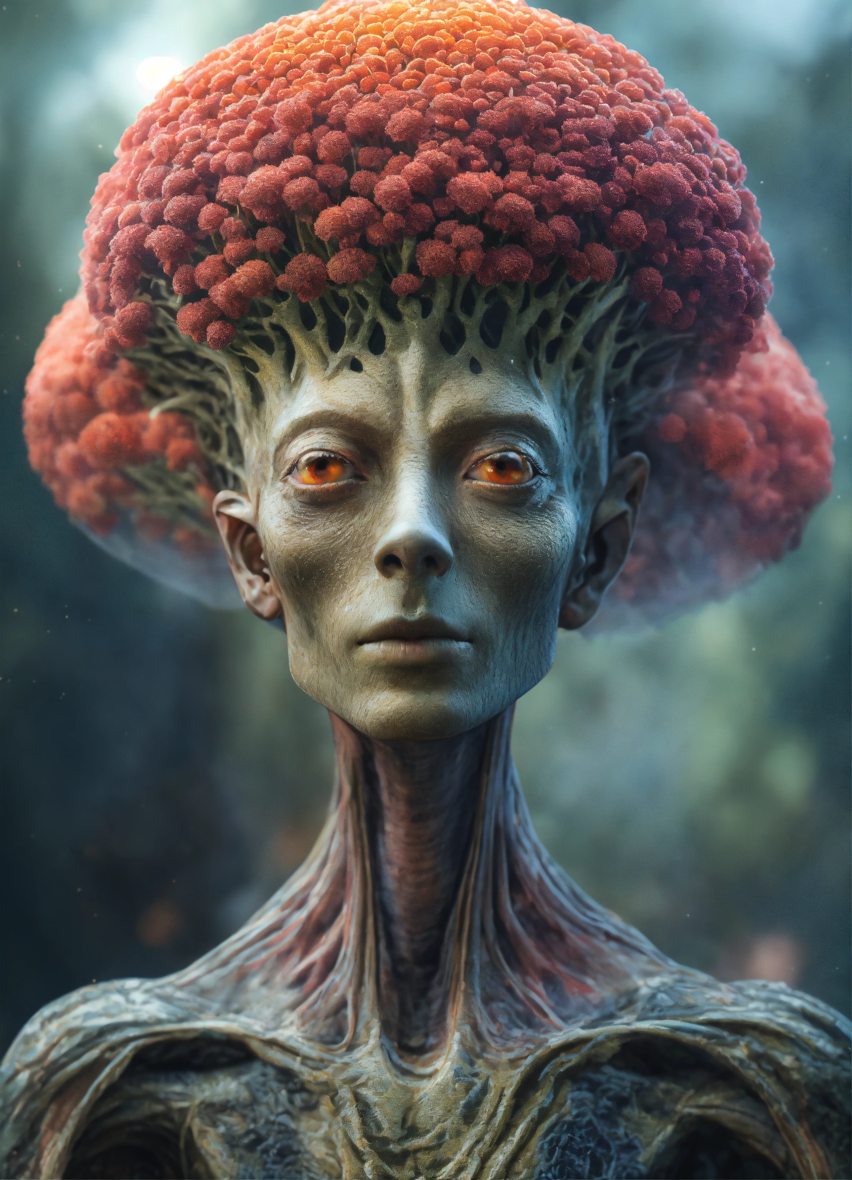 High detailed realistic portrait of gray tall alien with mushrom growing from head, godly being, colorful, 8k resolution, 8k 3d, hdr, made of mist, hyperrealism, henry moore, unsplash contest winner, 8k resolution