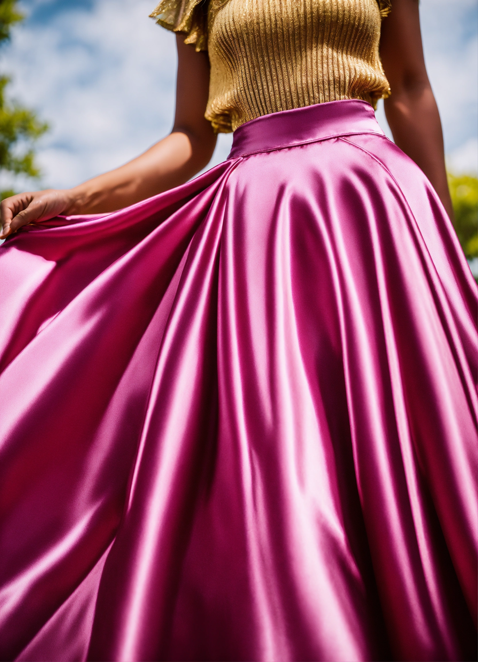 Shot looking up at man wearing tight pink satin skirt, shiny, figure-hugging, clingy, pencil maxi skirt, pulled tight, close up