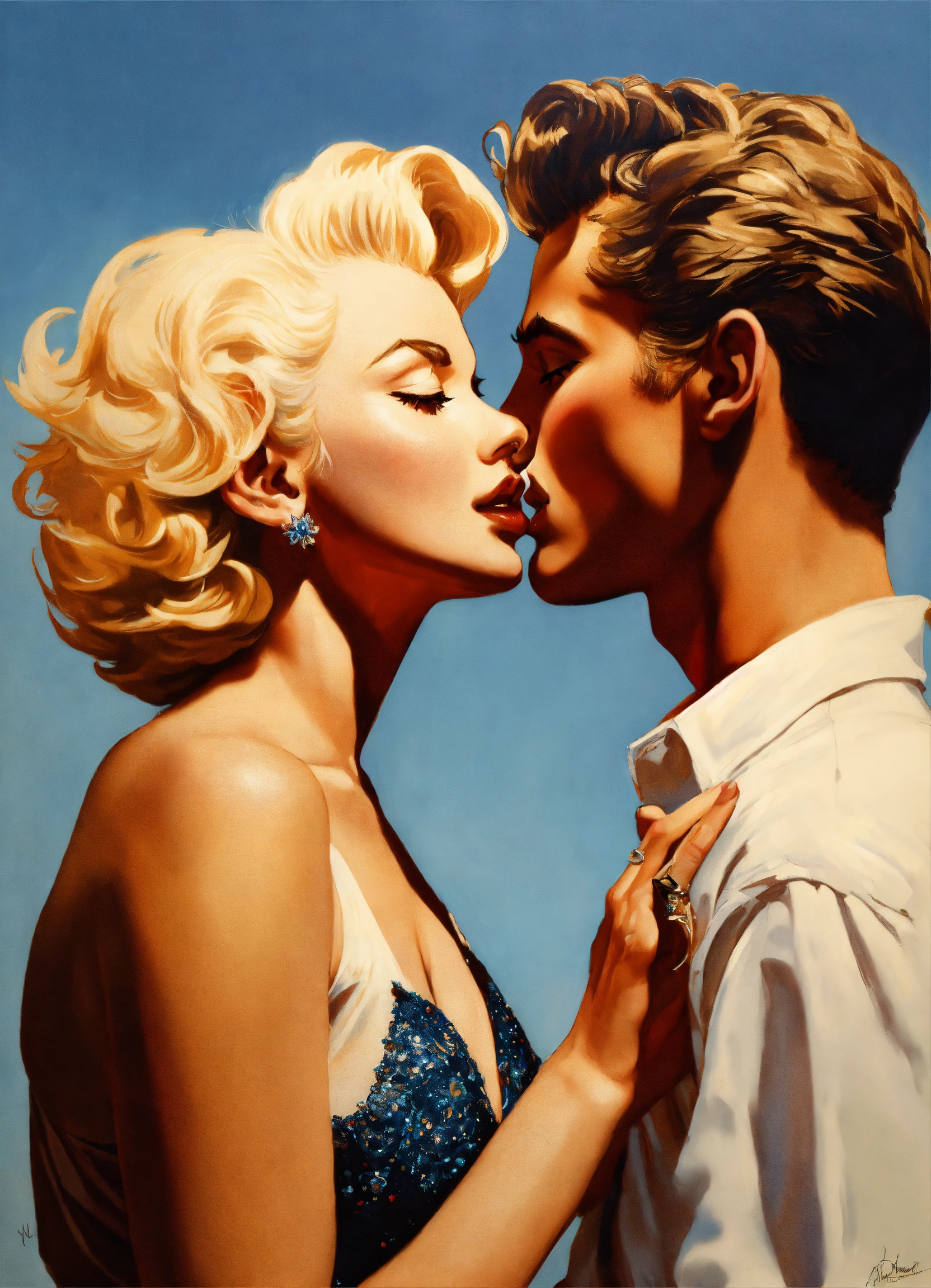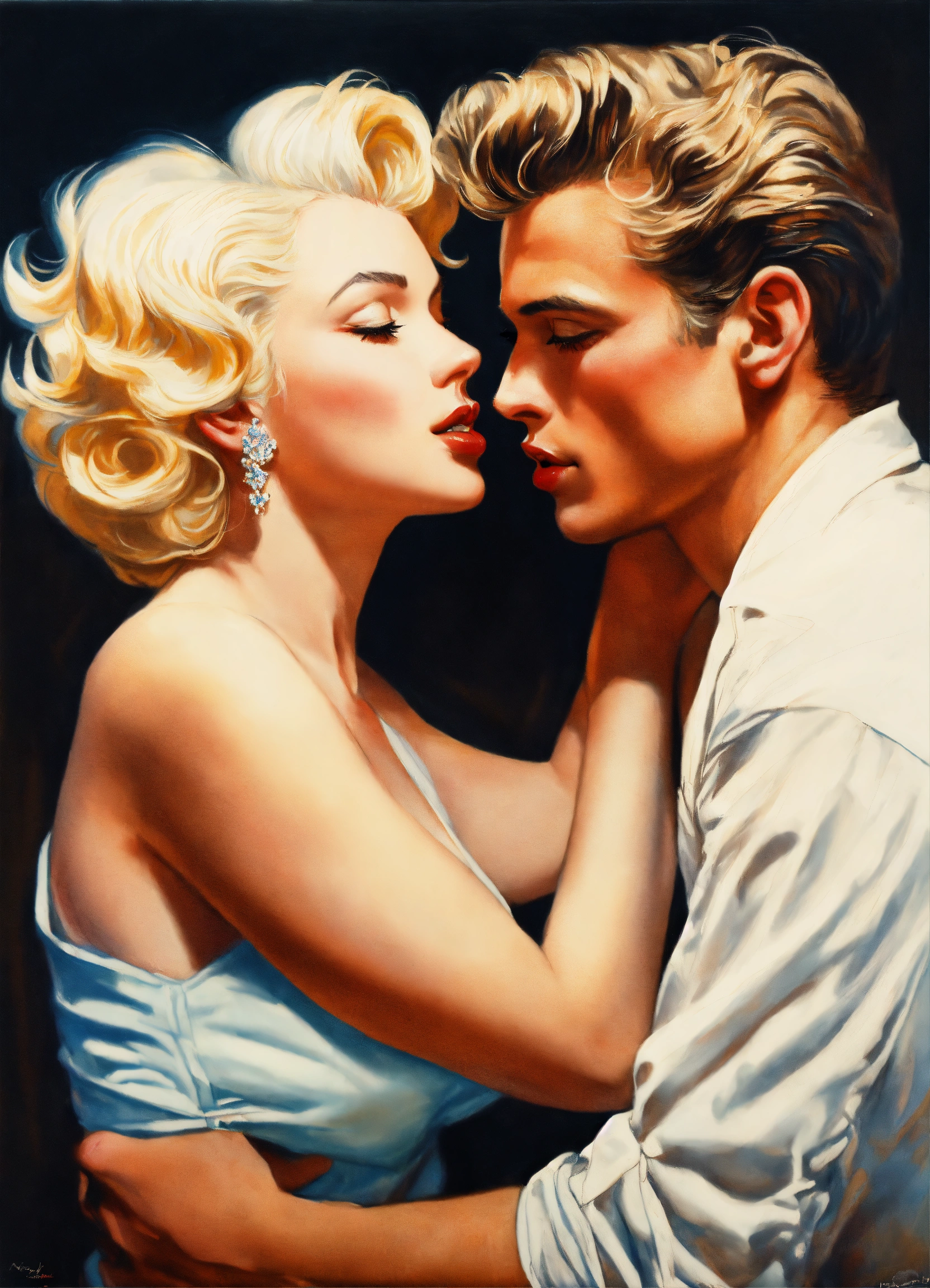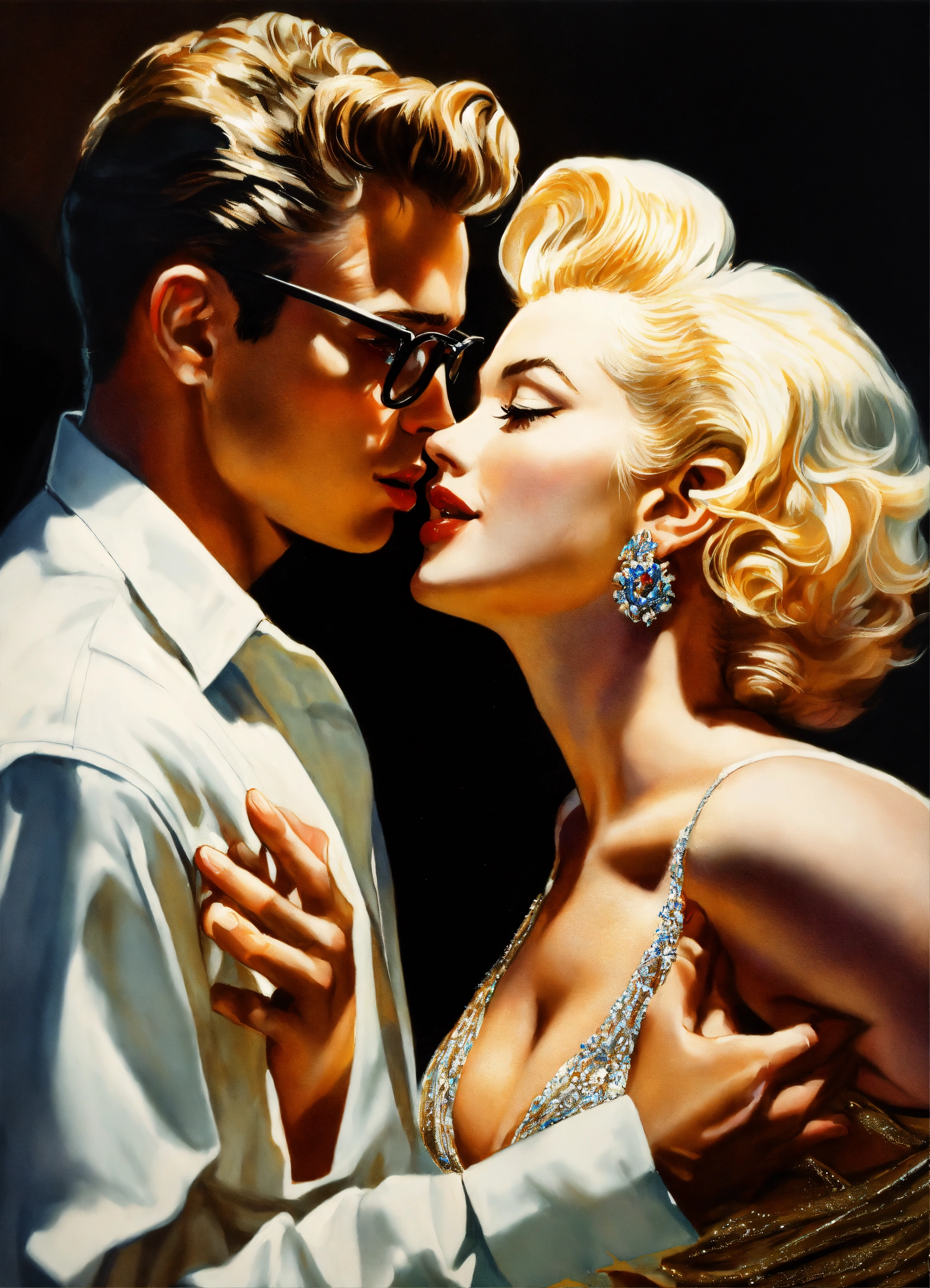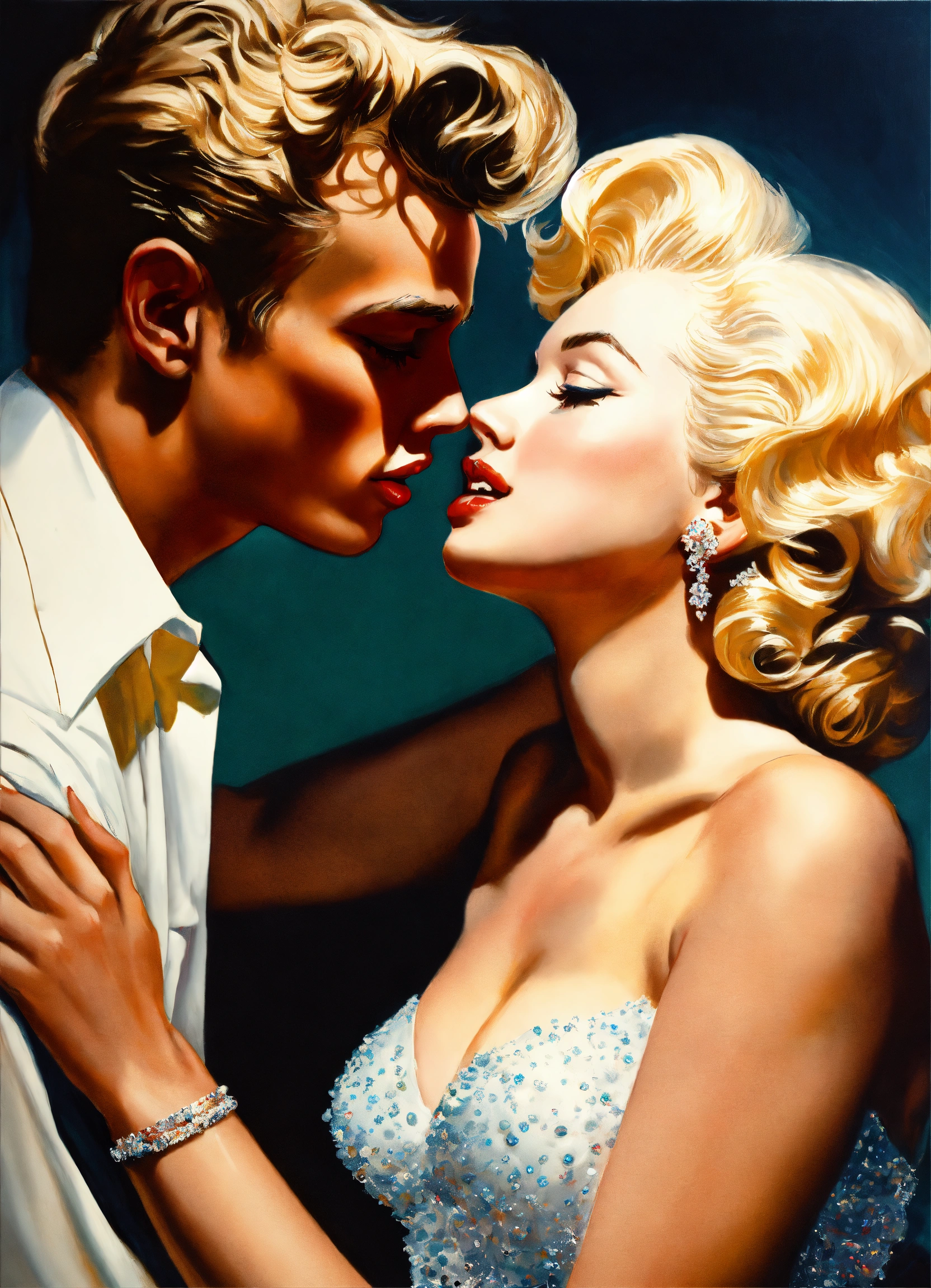 "the first kiss dancing cheek to cheek, perfect, accurate representation of marilyn monroe and james dean" " art by normanr rockwell, hyperrealistic, concept art, long shot, intricately detailed, color depth, dramatic, 2/3 face angle, side light, white background, plain white solid background, white background"