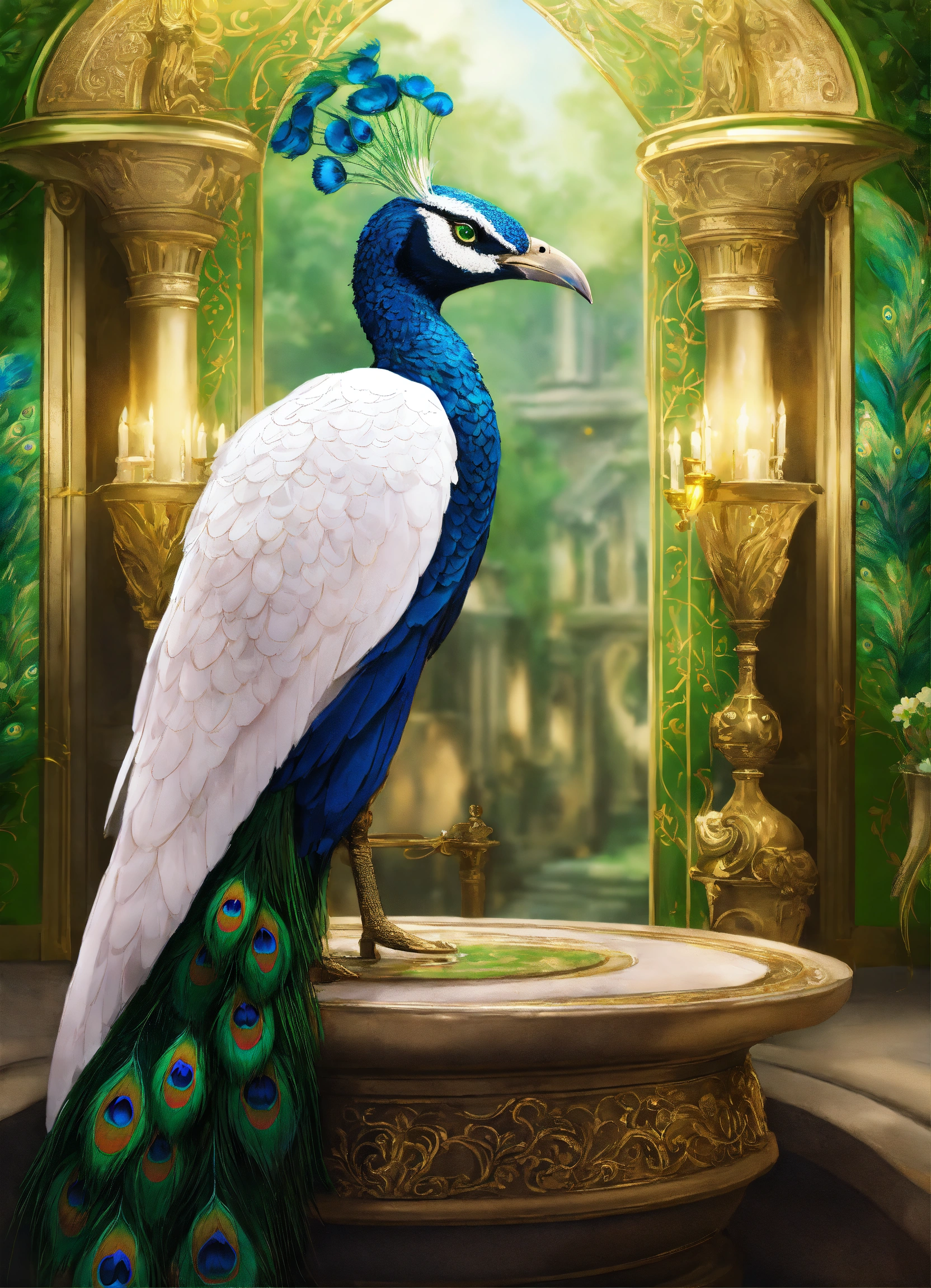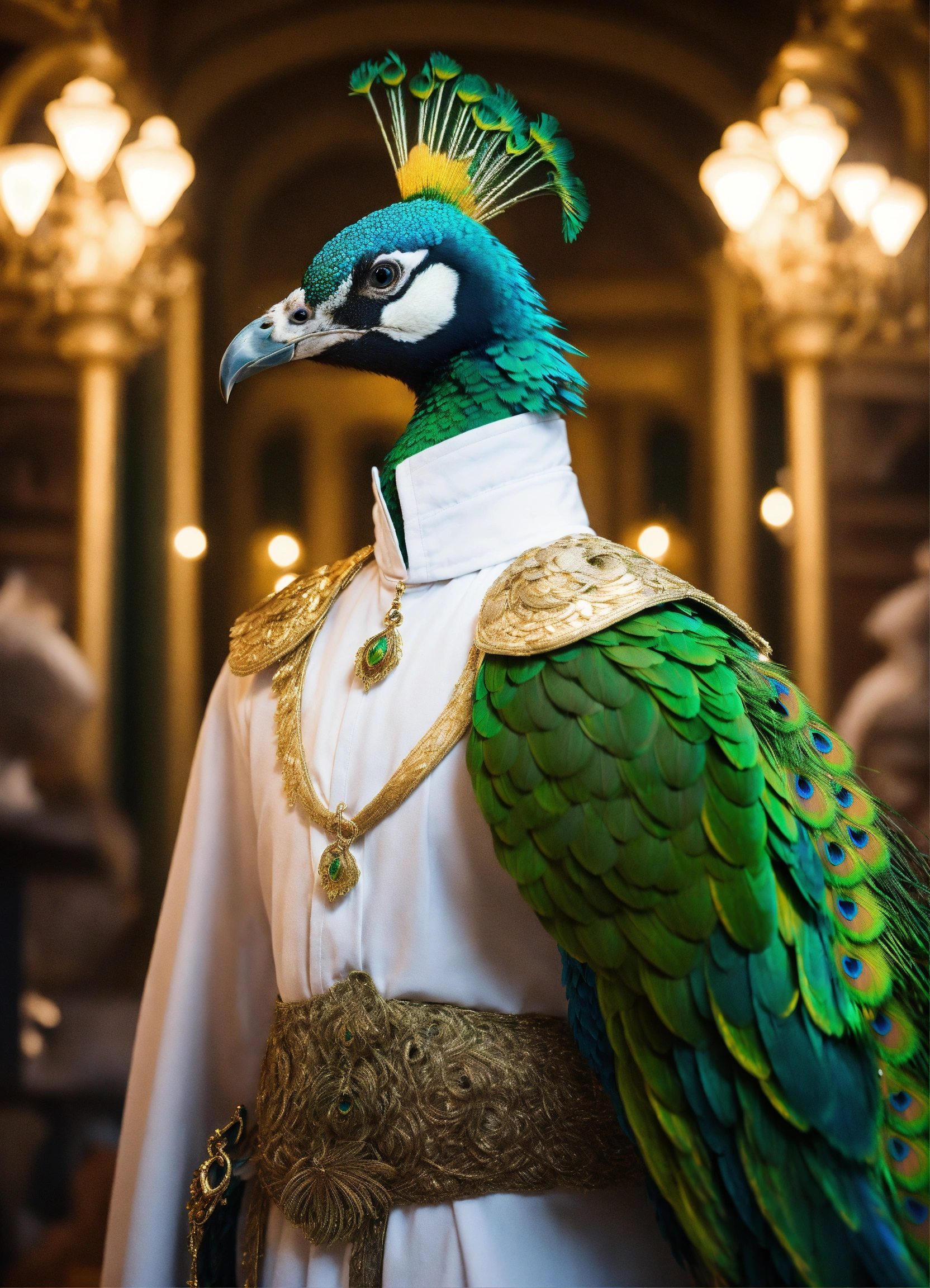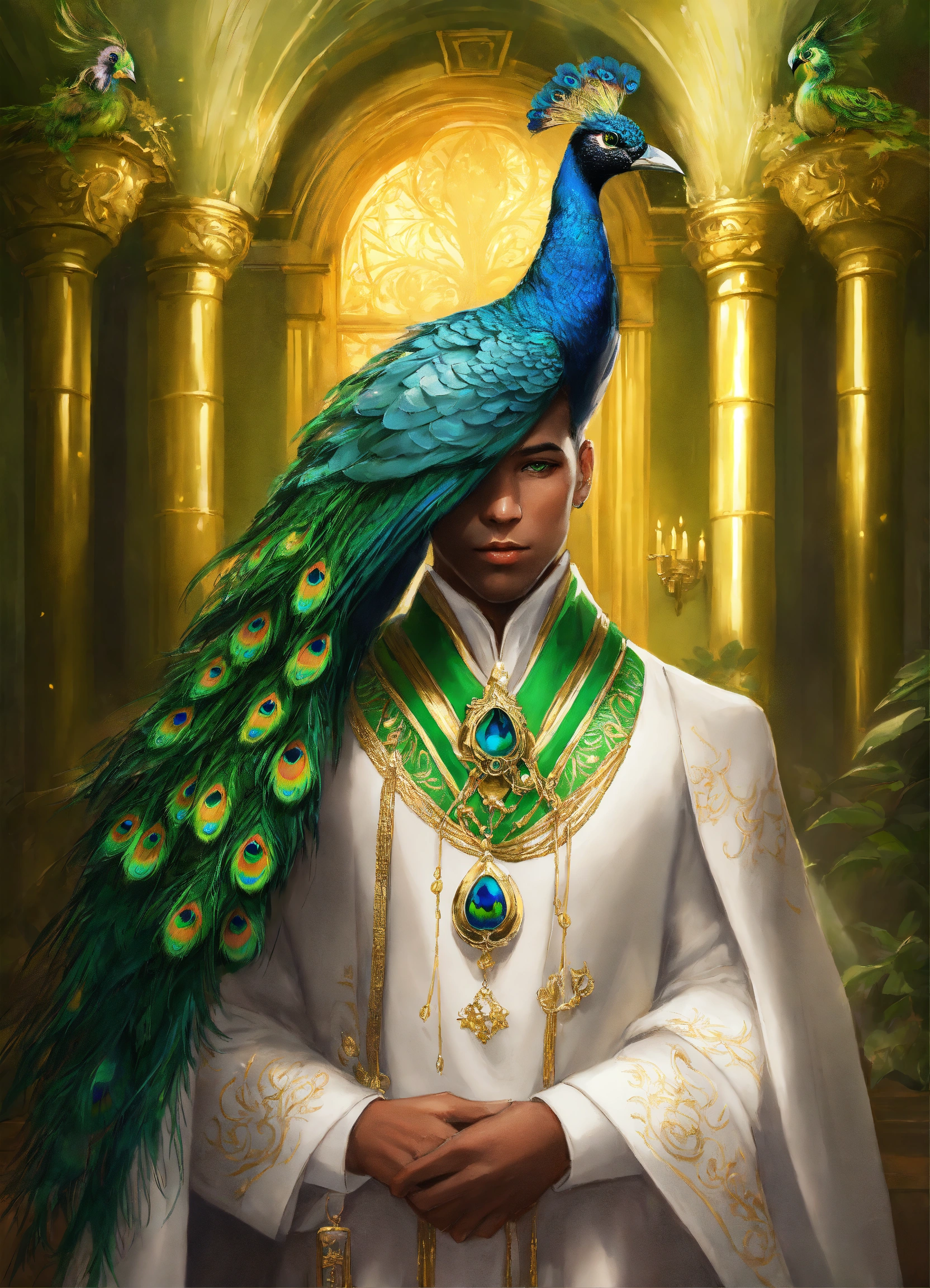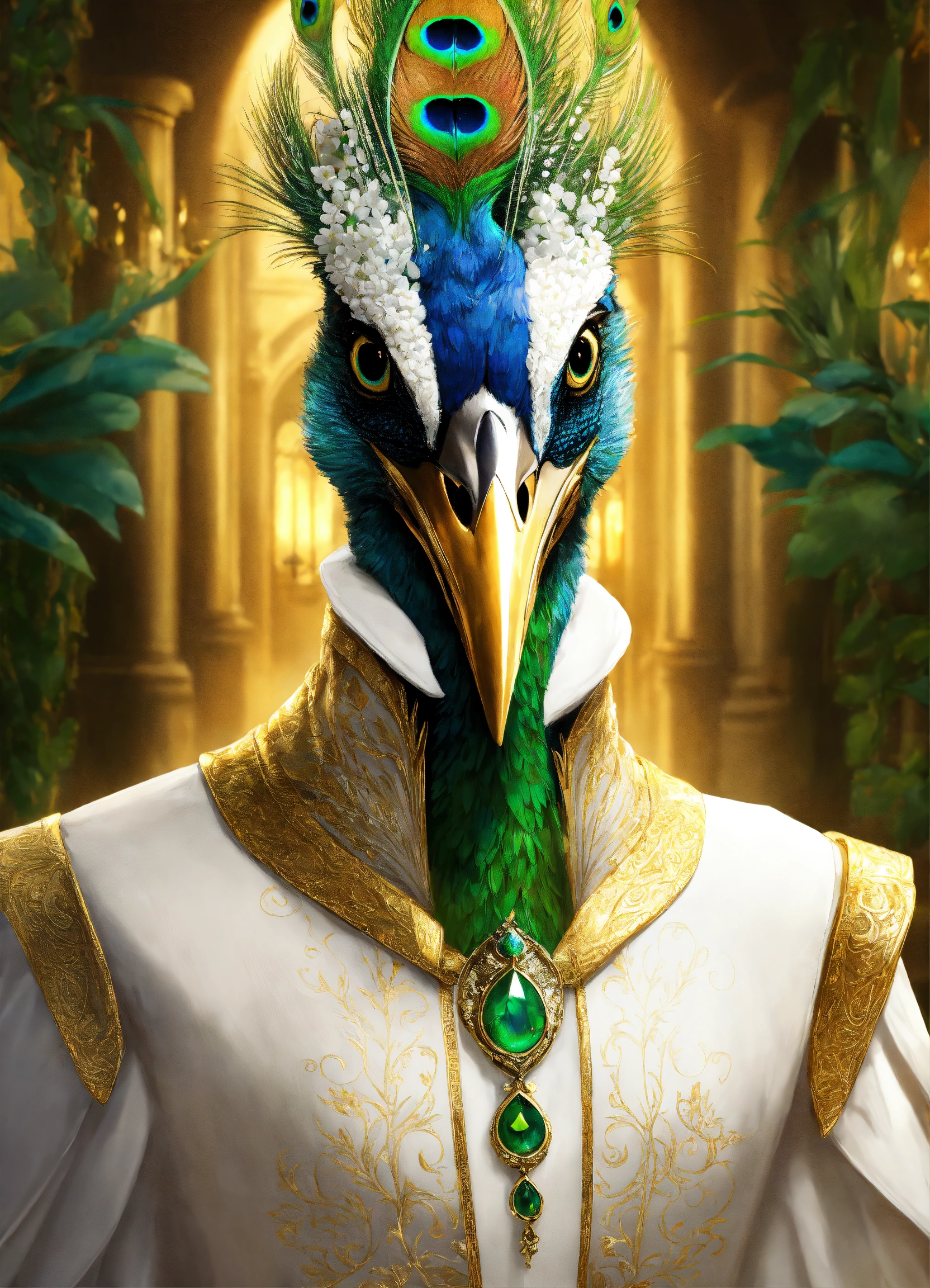 Fantasy portrait of an aarakocra, short beak, green eyes, white robes, peacock train, gold and green magic, rich mansion background